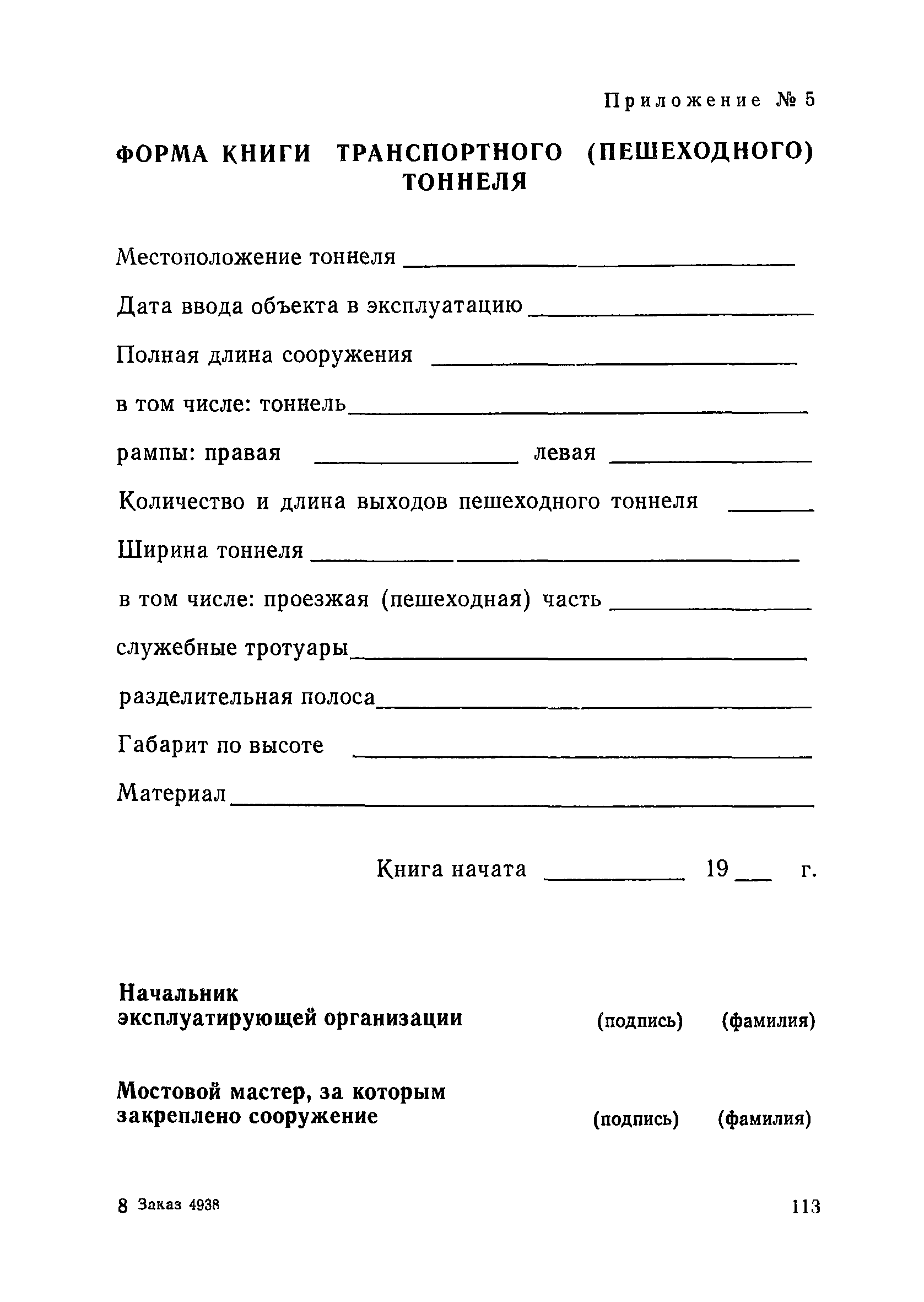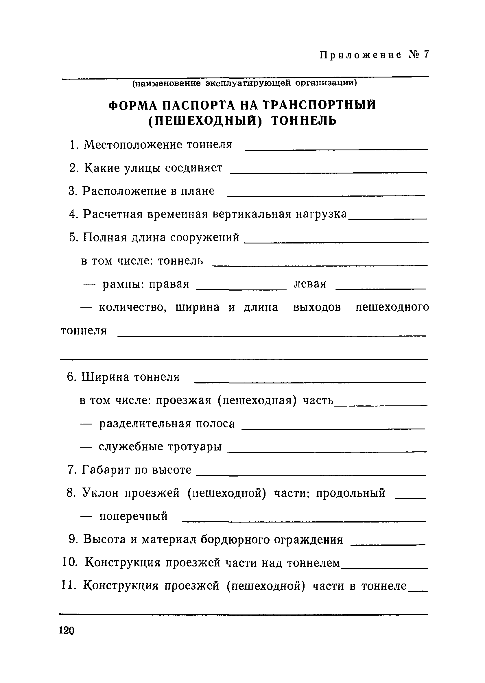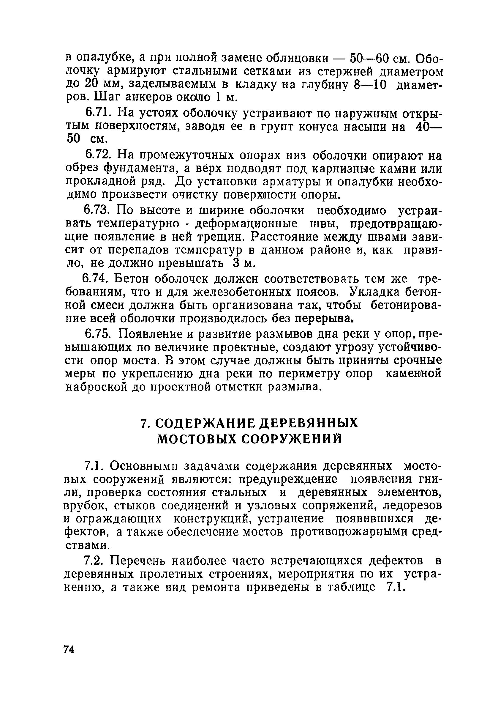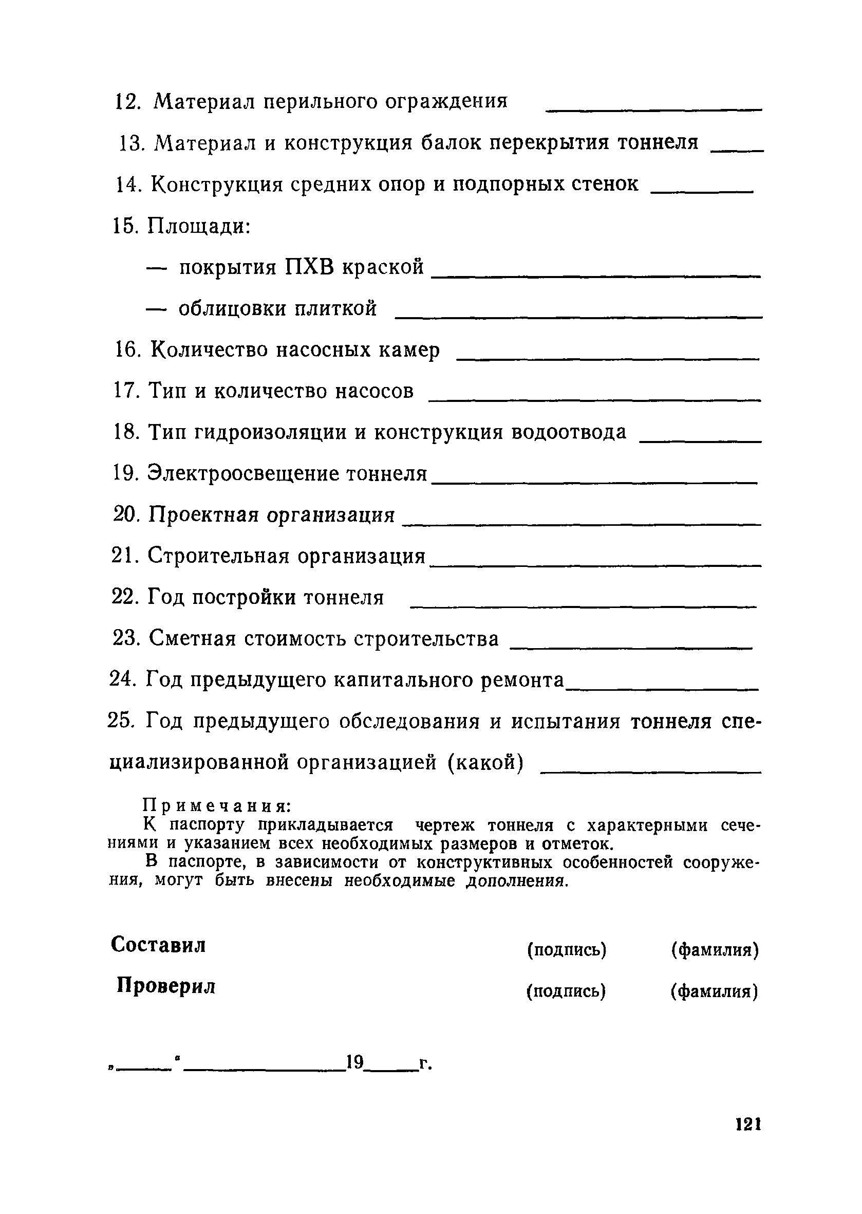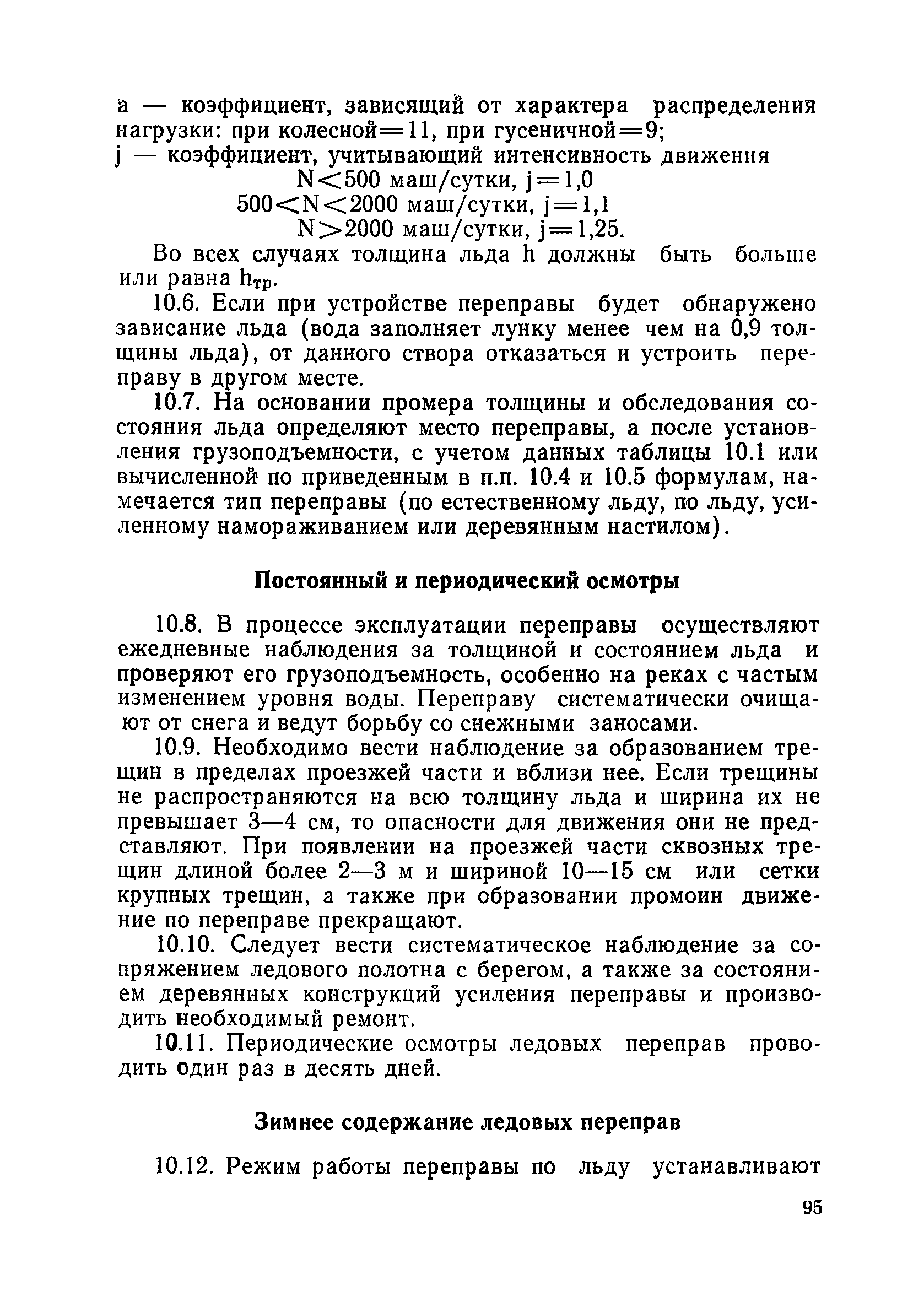 Правила эксплуатации городских искусственных сооружений| Статус: | действует | | Название рус.: | Правила эксплуатации городских искусственных сооружений | | Дата добавления в базу: | 01.09.2013 | | Дата актуализации: | 01.01.2021 | | Область применения: | Правила содержат классификацию работ и основные положения по организации содержания и ремонта городских искусственных сооружений: мостов и путепроводов с подходами к ним, труб, транспортных и пешеходных тоннелей, наплавных мостов, паромных и ледовых переправ. | | Оглавление: | 1. Общие положения 2. Содержание подмостового пространства, регуляционных сооружений и насыпей подходов 3. Содержание мостового полотна 4. Содержание железобетонных, бетонных и каменных пролетных строений мостовых сооружений 5. Содержание металлических пролетных строений мостовых сооружений 6. Содержание опор мостов и путепроводов 7. Содержание деревянных мостовых сооружений 8. Содержание наплавных мостов и паромных переправ 9. Содержание транспортных и пешеходных тоннелей, подпорных стенок 10. Устройство и содержание ледовых переправ 11. Обеспечение безопасности движения транспортных средств и пешеходов 12. Основные требования безопасности при ремонте и эксплуатации городских искусственных сооружений Приложения: 1. Структура работ по эксплуатации искусственных сооружений 2. Ориентировочные объемы ежегодных работ при текущем ремонте элементов мостовых сооружений 3. Перечень основных работ по планово-предупредительному ремонту городских капитальных мостов и путепроводов 4. Форма книги моста (путепровода) 5. Форма книги транспортного (пешеходного) тоннеля 6. Форма паспорта на мост 7. Форма паспорта на транспортный (пешеходный) тоннель 8. Журнал промеров толщины льда и определения грузоподъемности ледяного покрова Литература | | Разработан: | Саратовский институт Проектмостреконструкция