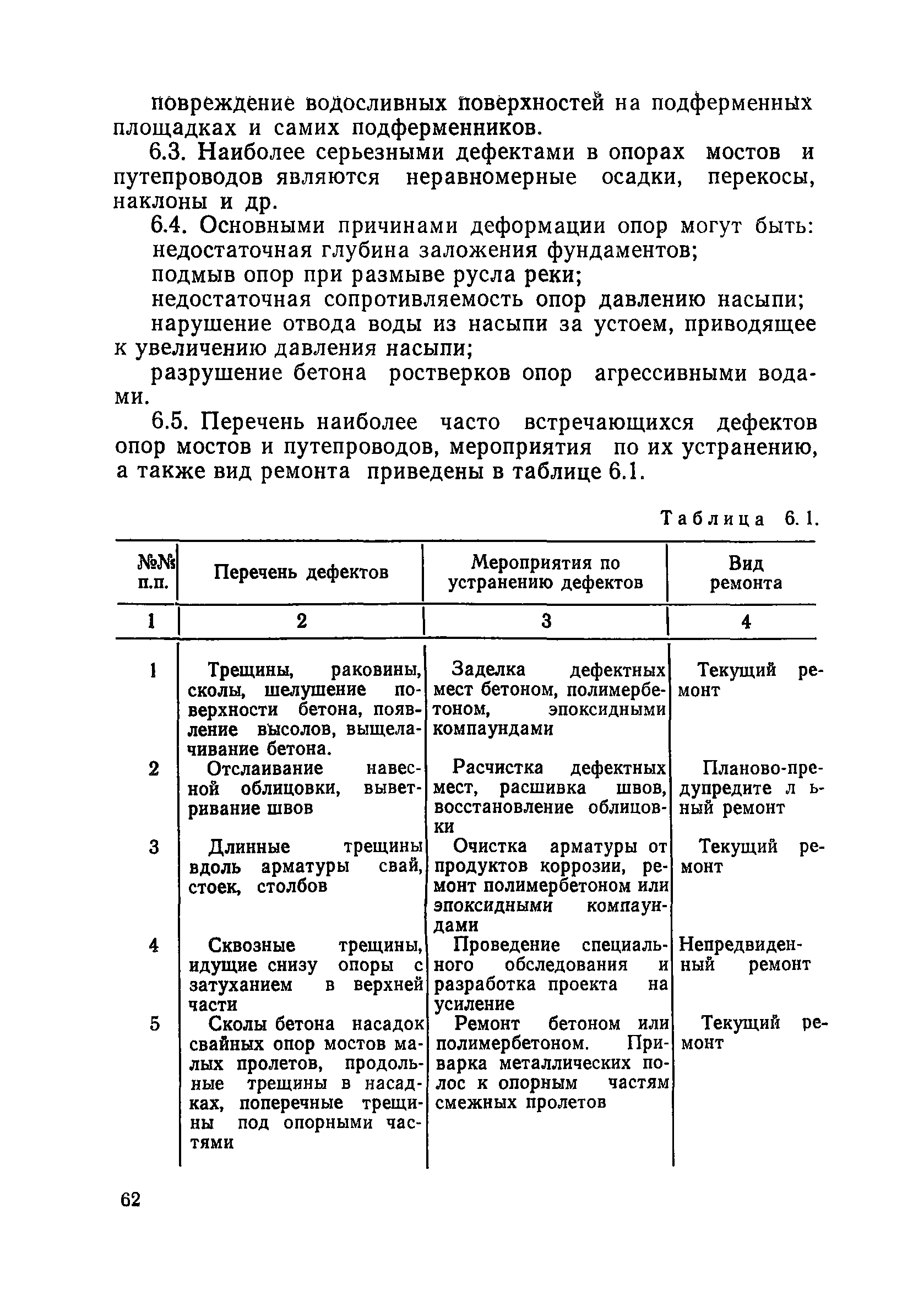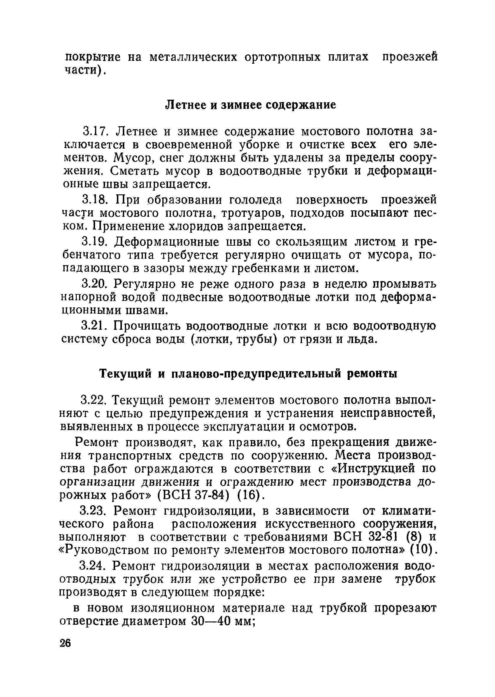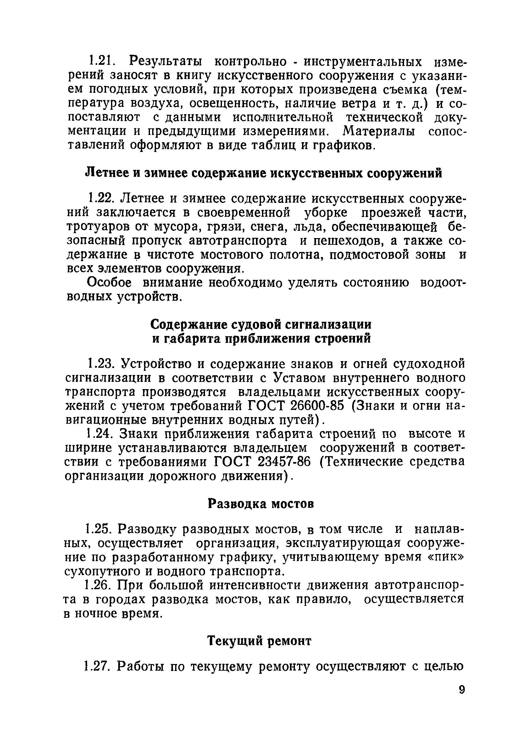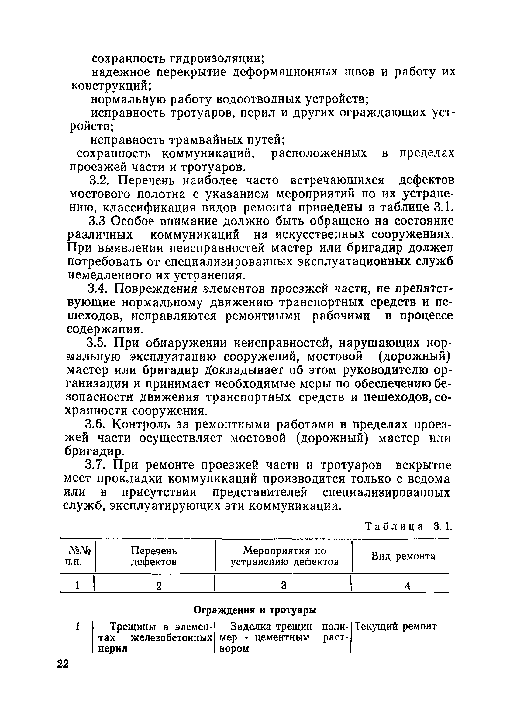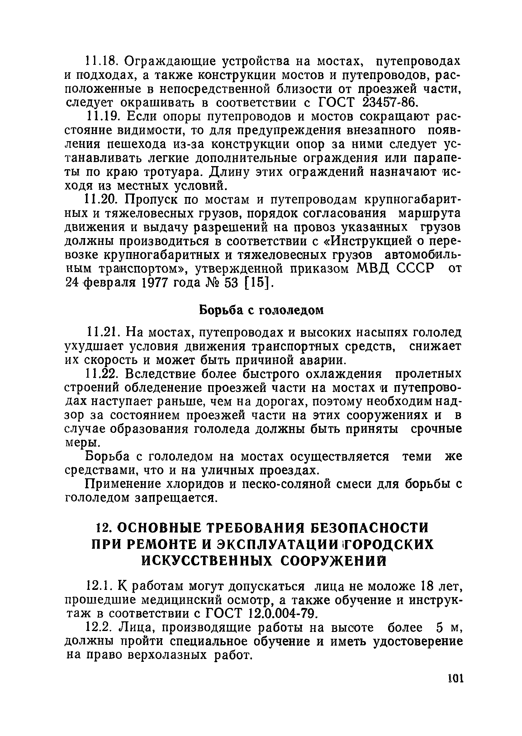 | | Нормативные ссылки: |  СНиП III-4-80* «Техника безопасности в строительстве»  СНиП 2.03.11-85 «Защита строительных конструкций от коррозии»  СНиП 2.05.03-84* «Мосты и трубы»  СНиП 3.06.04-91 «Мосты и трубы»  СНиП 3.06.07-86 «Мосты и трубы. Правила обследований и испытаний»  «Руководство по ремонту элементов мостового полотна автодорожных мостов»  ВСН 32-81 «Инструкция по устройству гидроизоляции конструкций мостов и труб на железных, автомобильных и городских дорогах»  ВСН 24-88 «Технические правила ремонта и содержания автомобильных дорог»  ВСН 37-84 «Инструкция по организации движения и ограждению мест производства дорожных работ»  ГОСТ 23457-86 «Технические средства организации дорожного движения. Правила применения»  Инструкция «Инструкция по перевозке крупногабаритных и тяжеловесных грузов автомобильным транспортом по дорогам Российской Федерации» Инструкция «Инструкция по окраске металлических конструкций, эксплуатируемых на автомобильных дорогах РСФСР, мостов, путепроводов, паромных переправ, ограждений и дорожных знаков» «Рекомендации по ремонту железобетонных мостов. (Конструктивные и технологические решения)» СНиП II-4-79 «Естественное и искусственное освещение»  ПТЭ «Правила технической эксплуатации электроустановок потребителей» ГОСТ 12.0.004-79 «Система стандартов безопасности труда. Организация обучения работающих безопасности труда. Общие положения» ГОСТ 12.1.005-76 «Система стандартов безопасности труда. Воздух рабочей зоны. Общие санитарно-гигиенические требования»  ГОСТ 9109-81 «Грунтовки ФЛ-03К и ФЛ-03Ж. Технические условия» ГОСТ 1003-73 «Сиккативы нафтенатные жидкие. Технические условия»  ГОСТ 10144-89 «Эмали ХВ-124. Технические условия» ГОСТ 10779-78 «Спирт поливиниловый. Технические условия»  ГОСТ 10834-76 «Жидкость гидрофобизирующая 136-41. Технические условия» ГОСТ 11539-83 «Фанера бакелизированная. Технические условия» ГОСТ 12.4.111-82 «Система стандартов безопасности труда. Костюмы мужские для защиты от нефти и нефтепродуктов. Технические условия» ГОСТ 12.4.112-82 «Система стандартов безопасности труда. Костюмы женские для защиты от нефти и нефтепродуктов. Технические условия»  ГОСТ 12.4.137-84 «Обувь специальная кожаная для защиты от нефти, нефтепродуктов, кислот, щелочей, нетоксичной и взрывоопасной пыли. Технические условия»  ГОСТ 12.4.059-89 «Система стандартов безопасности труда. Строительство. Ограждения предохранительные инвентарные. Общие технические условия»  ГОСТ 18188-72 «Растворители марок 645, 646, 647, 648 для лакокрасочных материалов. Технические условия» ГОСТ 19151-73 «Сурик свинцовый. Технические условия» ГОСТ 19347-84 «Купорос медный. Технические условия» ГОСТ 23143-83 «Эмали ЭП-773. Технические условия»  ГОСТ 23732-79 «Вода для бетонов и растворов. Технические условия» ГОСТ 23787.8-80 «Растворы антисептического препарата ХМ-11. Технические требования, требования безопасности и методы анализа»  ГОСТ 24258-88 «Средства подмащивания. Общие технические условия» ГОСТ 2651-78 «Натрия бихромат технический. Технические условия» ГОСТ 26600-85 «Знаки и огни навигационных внутренних водных путей. Общие технические условия»  ГОСТ 2768-84 «Ацетон технический. Технические условия»  ГОСТ 27772-88 «Прокат для строительных стальных конструкций. Общие технические условия» ГОСТ 4641-80 «Дегти каменноугольные для дорожного строительства. Технические условия» ГОСТ 5375-79 «Сапоги резиновые формовые. Техни