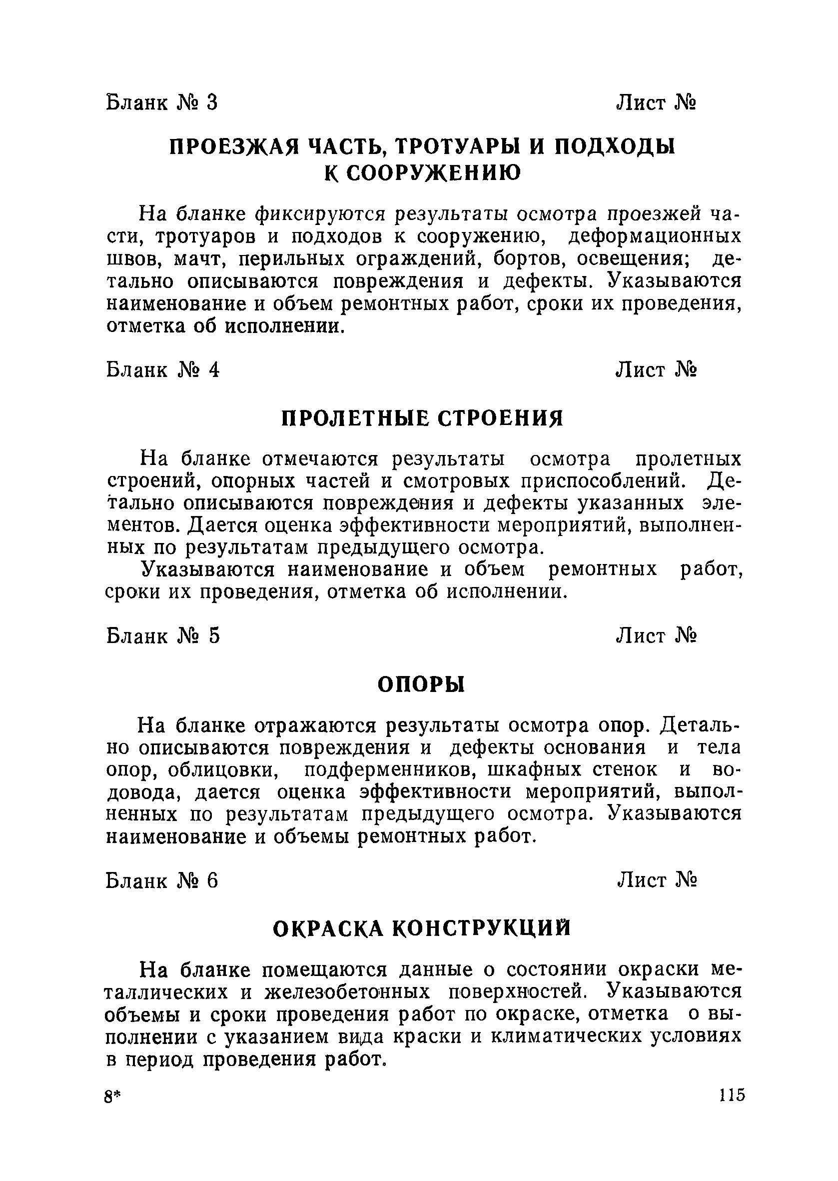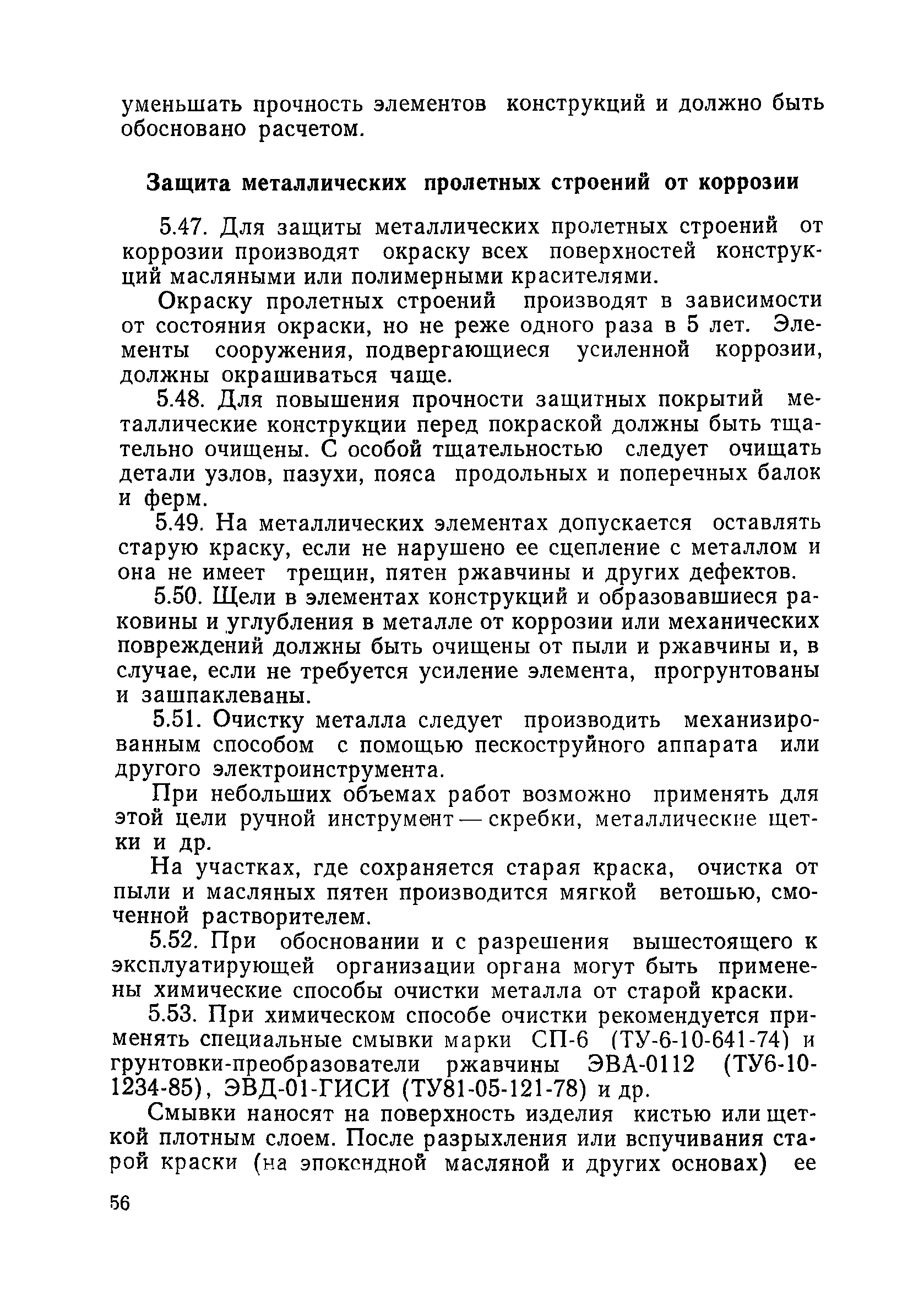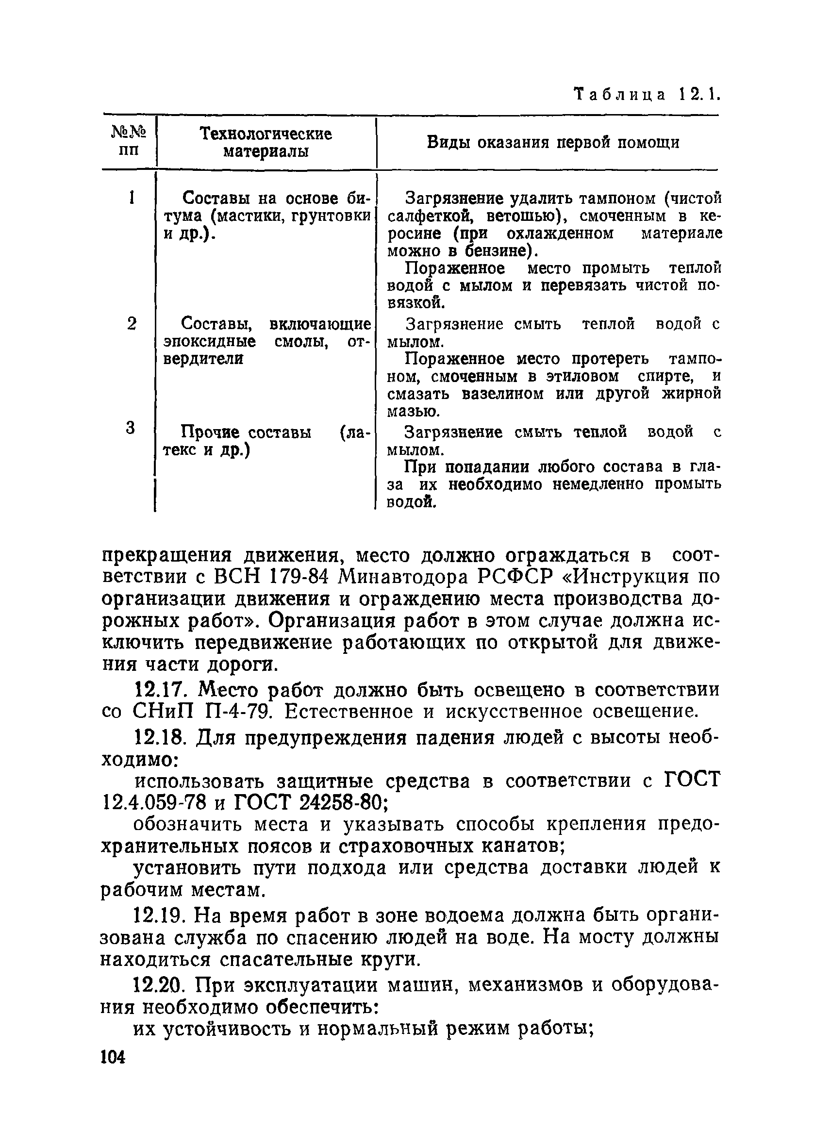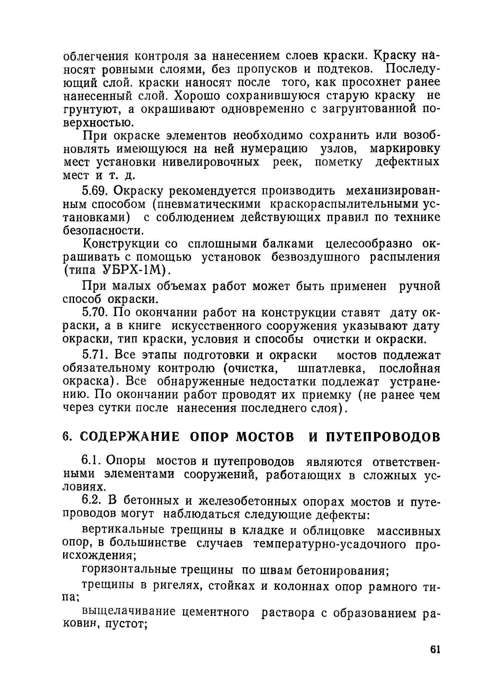 | | Нормативные ссылки: |  СНиП III-4-80* «Техника безопасности в строительстве»  СНиП 2.03.11-85 «Защита строительных конструкций от коррозии»  СНиП 2.05.03-84* «Мосты и трубы»  СНиП 3.06.04-91 «Мосты и трубы»  СНиП 3.06.07-86 «Мосты и трубы. Правила обследований и испытаний»  «Руководство по ремонту элементов мостового полотна автодорожных мостов»  ВСН 32-81 «Инструкция по устройству гидроизоляции конструкций мостов и труб на железных, автомобильных и городских дорогах»  ВСН 24-88 «Технические правила ремонта и содержания автомобильных дорог»  ВСН 37-84 «Инструкция по организации движения и ограждению мест производства дорожных работ»  ГОСТ 23457-86 «Технические средства организации дорожного движения. Правила применения»  Инструкция «Инструкция по перевозке крупногабаритных и тяжеловесных грузов автомобильным транспортом по дорогам Российской Федерации» Инструкция «Инструкция по окраске металлических конструкций, эксплуатируемых на автомобильных дорогах РСФСР, мостов, путепроводов, паромных переправ, ограждений и дорожных знаков» «Рекомендации по ремонту железобетонных мостов. (Конструктивные и технологические решения)» СНиП II-4-79 «Естественное и искусственное освещение»  ПТЭ «Правила технической эксплуатации электроустановок потребителей» ГОСТ 12.0.004-79 «Система стандартов безопасности труда. Организация обучения работающих безопасности труда. Общие положения» ГОСТ 12.1.005-76 «Система стандартов безопасности труда. Воздух рабочей зоны. Общие санитарно-гигиенические требования»  ГОСТ 9109-81 «Грунтовки ФЛ-03К и ФЛ-03Ж. Технические условия» ГОСТ 1003-73 «Сиккативы нафтенатные жидкие. Технические условия»  ГОСТ 10144-89 «Эмали ХВ-124. Технические условия» ГОСТ 10779-78 «Спирт поливиниловый. Технические условия»  ГОСТ 10834-76 «Жидкость гидрофобизирующая 136-41. Технические условия» ГОСТ 11539-83 «Фанера бакелизированная. Технические условия» ГОСТ 12.4.111-82 «Система стандартов безопасности труда. Костюмы мужские для защиты от нефти и нефтепродуктов. Технические условия» ГОСТ 12.4.112-82 «Система стандартов безопасности труда. Костюмы женские для защиты от нефти и нефтепродуктов. Технические условия»  ГОСТ 12.4.137-84 «Обувь специальная кожаная для защиты от нефти, нефтепродуктов, кислот, щелочей, нетоксичной и взрывоопасной пыли. Технические условия»  ГОСТ 12.4.059-89 «Система стандартов безопасности труда. Строительство. Ограждения предохранительные инвентарные. Общие технические условия»  ГОСТ 18188-72 «Растворители марок 645, 646, 647, 648 для лакокрасочных материалов. Технические условия» ГОСТ 19151-73 «Сурик свинцовый. Технические условия» ГОСТ 19347-84 «Купорос медный. Технические условия» ГОСТ 23143-83 «Эмали ЭП-773. Технические условия»  ГОСТ 23732-79 «Вода для бетонов и растворов. Технические условия» ГОСТ 23787.8-80 «Растворы антисептического препарата ХМ-11. Технические требования, требования безопасности и методы анализа»  ГОСТ 24258-88 «Средства подмащивания. Общие технические условия» ГОСТ 2651-78 «Натрия бихромат технический. Технические условия» ГОСТ 26600-85 «Знаки и огни навигационных внутренних водных путей. Общие технические условия»  ГОСТ 2768-84 «Ацетон технический. Технические условия»  ГОСТ 27772-88 «Прокат для строительных стальных конструкций. Общие технические условия» ГОСТ 4641-80 «Дегти каменноугольные для дорожного строительства. Технические условия» ГОСТ 5375-79 «Сапоги резиновые формовые. Техни