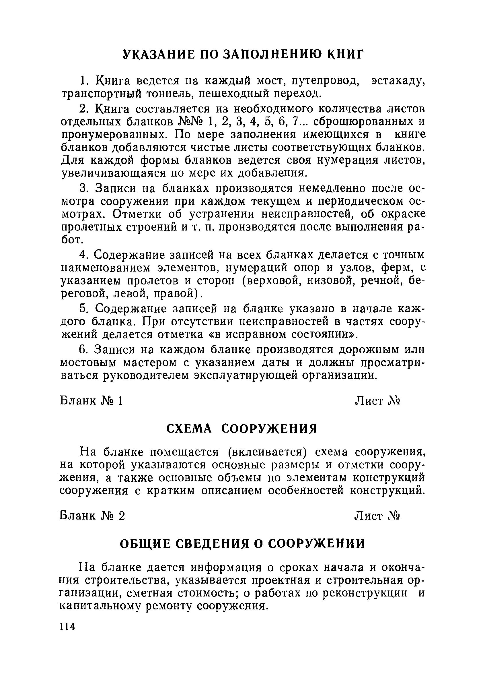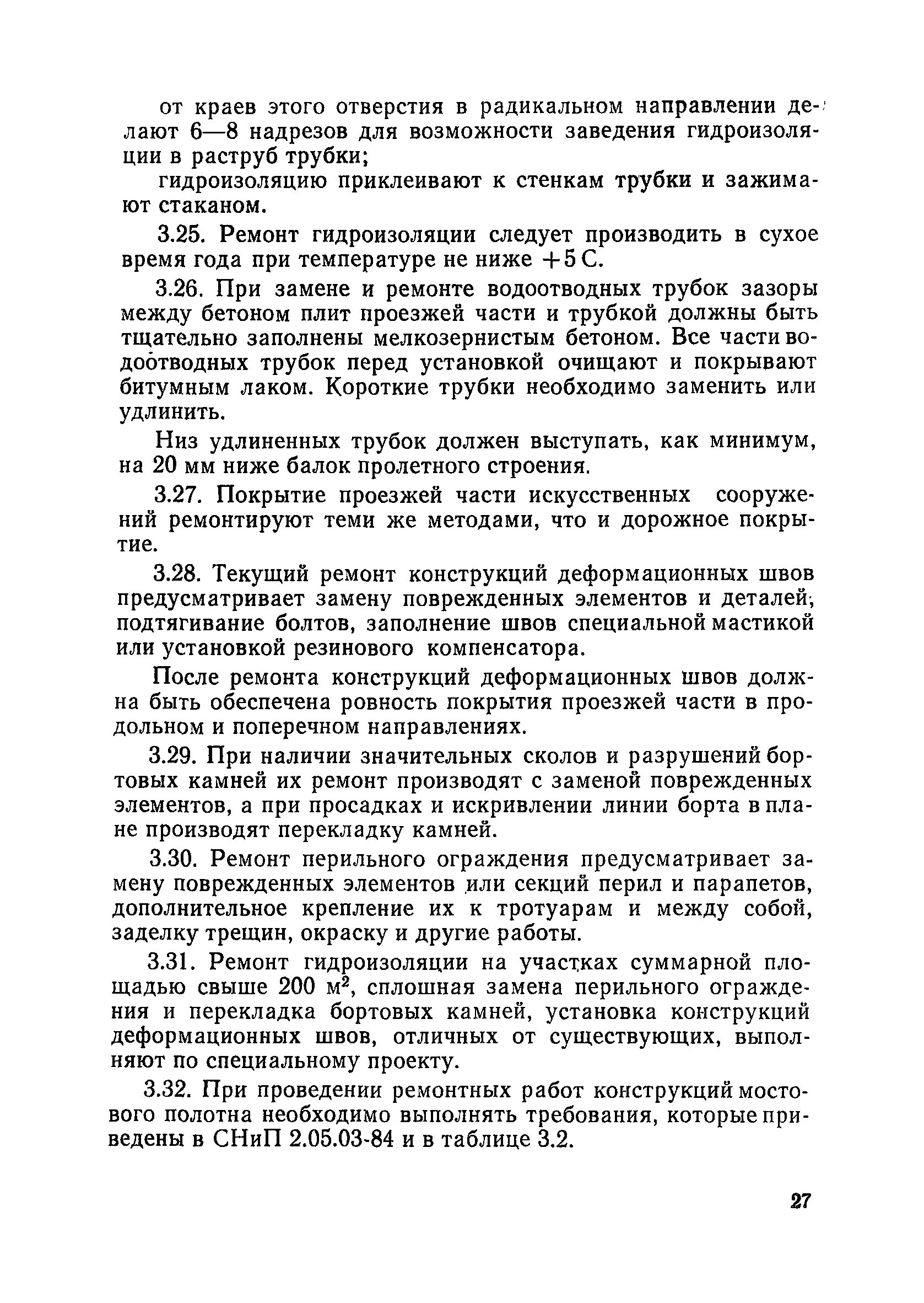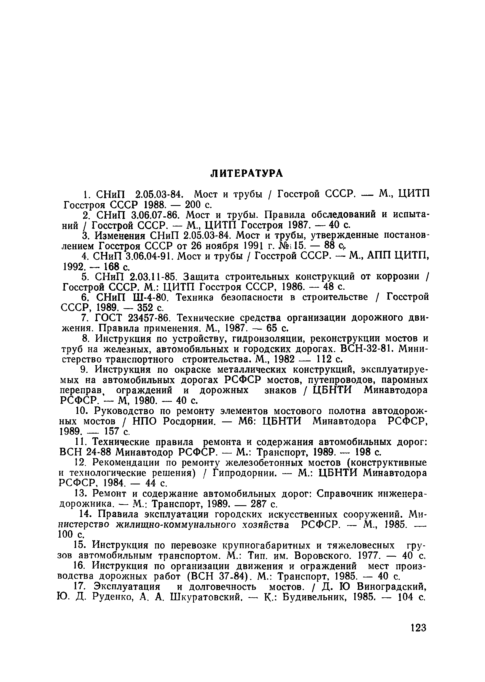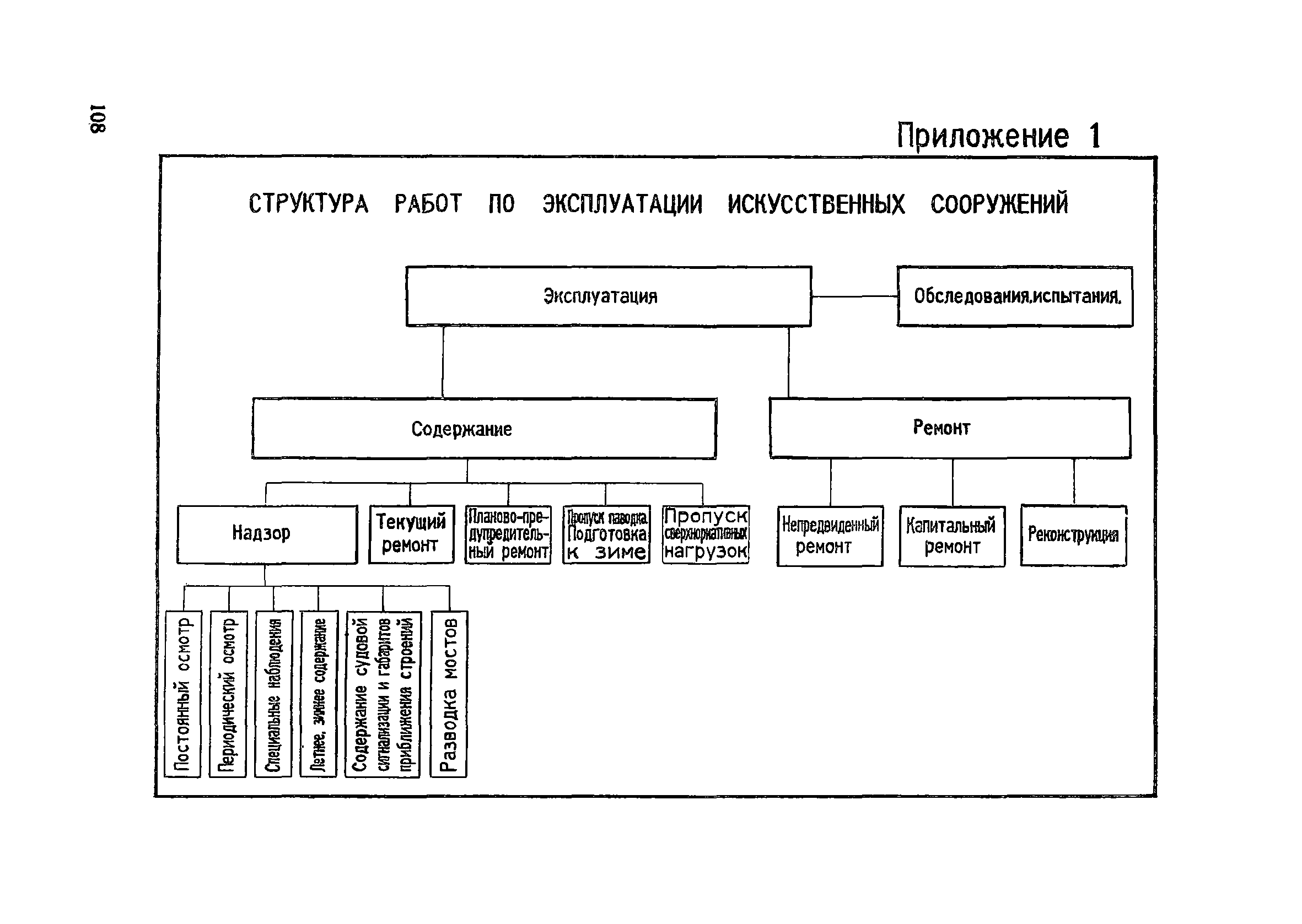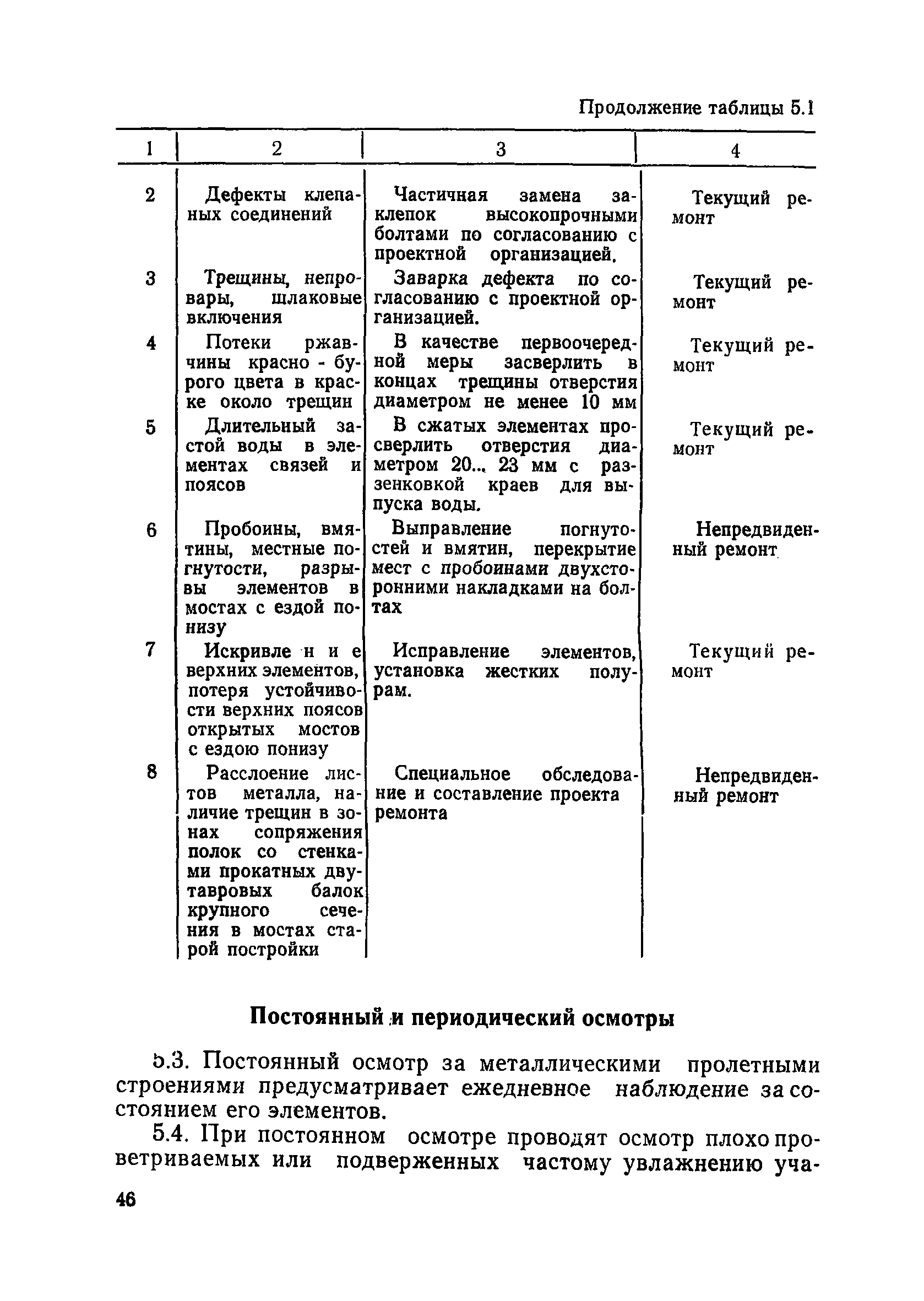 | | Нормативные ссылки: |  СНиП III-4-80* «Техника безопасности в строительстве»  СНиП 2.03.11-85 «Защита строительных конструкций от коррозии»  СНиП 2.05.03-84* «Мосты и трубы»  СНиП 3.06.04-91 «Мосты и трубы»  СНиП 3.06.07-86 «Мосты и трубы. Правила обследований и испытаний»  «Руководство по ремонту элементов мостового полотна автодорожных мостов»  ВСН 32-81 «Инструкция по устройству гидроизоляции конструкций мостов и труб на железных, автомобильных и городских дорогах»  ВСН 24-88 «Технические правила ремонта и содержания автомобильных дорог»  ВСН 37-84 «Инструкция по организации движения и ограждению мест производства дорожных работ»  ГОСТ 23457-86 «Технические средства организации дорожного движения. Правила применения»  Инструкция «Инструкция по перевозке крупногабаритных и тяжеловесных грузов автомобильным транспортом по дорогам Российской Федерации» Инструкция «Инструкция по окраске металлических конструкций, эксплуатируемых на автомобильных дорогах РСФСР, мостов, путепроводов, паромных переправ, ограждений и дорожных знаков» «Рекомендации по ремонту железобетонных мостов. (Конструктивные и технологические решения)» СНиП II-4-79 «Естественное и искусственное освещение»  ПТЭ «Правила технической эксплуатации электроустановок потребителей» ГОСТ 12.0.004-79 «Система стандартов безопасности труда. Организация обучения работающих безопасности труда. Общие положения» ГОСТ 12.1.005-76 «Система стандартов безопасности труда. Воздух рабочей зоны. Общие санитарно-гигиенические требования»  ГОСТ 9109-81 «Грунтовки ФЛ-03К и ФЛ-03Ж. Технические условия» ГОСТ 1003-73 «Сиккативы нафтенатные жидкие. Технические условия»  ГОСТ 10144-89 «Эмали ХВ-124. Технические условия» ГОСТ 10779-78 «Спирт поливиниловый. Технические условия»  ГОСТ 10834-76 «Жидкость гидрофобизирующая 136-41. Технические условия» ГОСТ 11539-83 «Фанера бакелизированная. Технические условия» ГОСТ 12.4.111-82 «Система стандартов безопасности труда. Костюмы мужские для защиты от нефти и нефтепродуктов. Технические условия» ГОСТ 12.4.112-82 «Система стандартов безопасности труда. Костюмы женские для защиты от нефти и нефтепродуктов. Технические условия»  ГОСТ 12.4.137-84 «Обувь специальная кожаная для защиты от нефти, нефтепродуктов, кислот, щелочей, нетоксичной и взрывоопасной пыли. Технические условия»  ГОСТ 12.4.059-89 «Система стандартов безопасности труда. Строительство. Ограждения предохранительные инвентарные. Общие технические условия»  ГОСТ 18188-72 «Растворители марок 645, 646, 647, 648 для лакокрасочных материалов. Технические условия» ГОСТ 19151-73 «Сурик свинцовый. Технические условия» ГОСТ 19347-84 «Купорос медный. Технические условия» ГОСТ 23143-83 «Эмали ЭП-773. Технические условия»  ГОСТ 23732-79 «Вода для бетонов и растворов. Технические условия» ГОСТ 23787.8-80 «Растворы антисептического препарата ХМ-11. Технические требования, требования безопасности и методы анализа»  ГОСТ 24258-88 «Средства подмащивания. Общие технические условия» ГОСТ 2651-78 «Натрия бихромат технический. Технические условия» ГОСТ 26600-85 «Знаки и огни навигационных внутренних водных путей. Общие технические условия»  ГОСТ 2768-84 «Ацетон технический. Технические условия»  ГОСТ 27772-88 «Прокат для строительных стальных конструкций. Общие технические условия» ГОСТ 4641-80 «Дегти каменноугольные для дорожного строительства. Технические условия» ГОСТ 5375-79 «Сапоги резиновые формовые. Техни