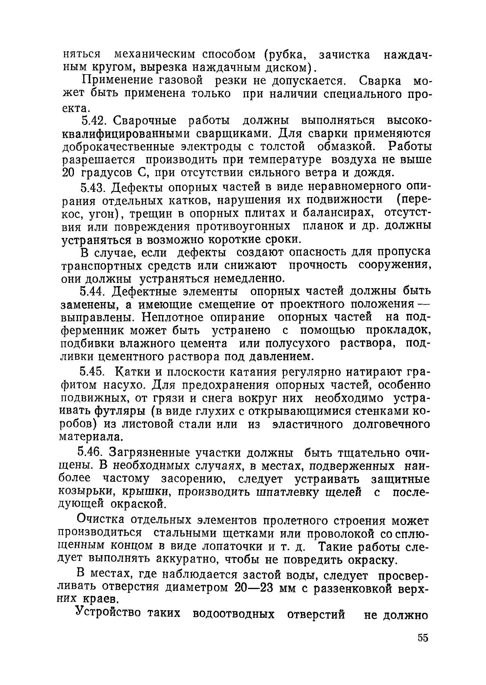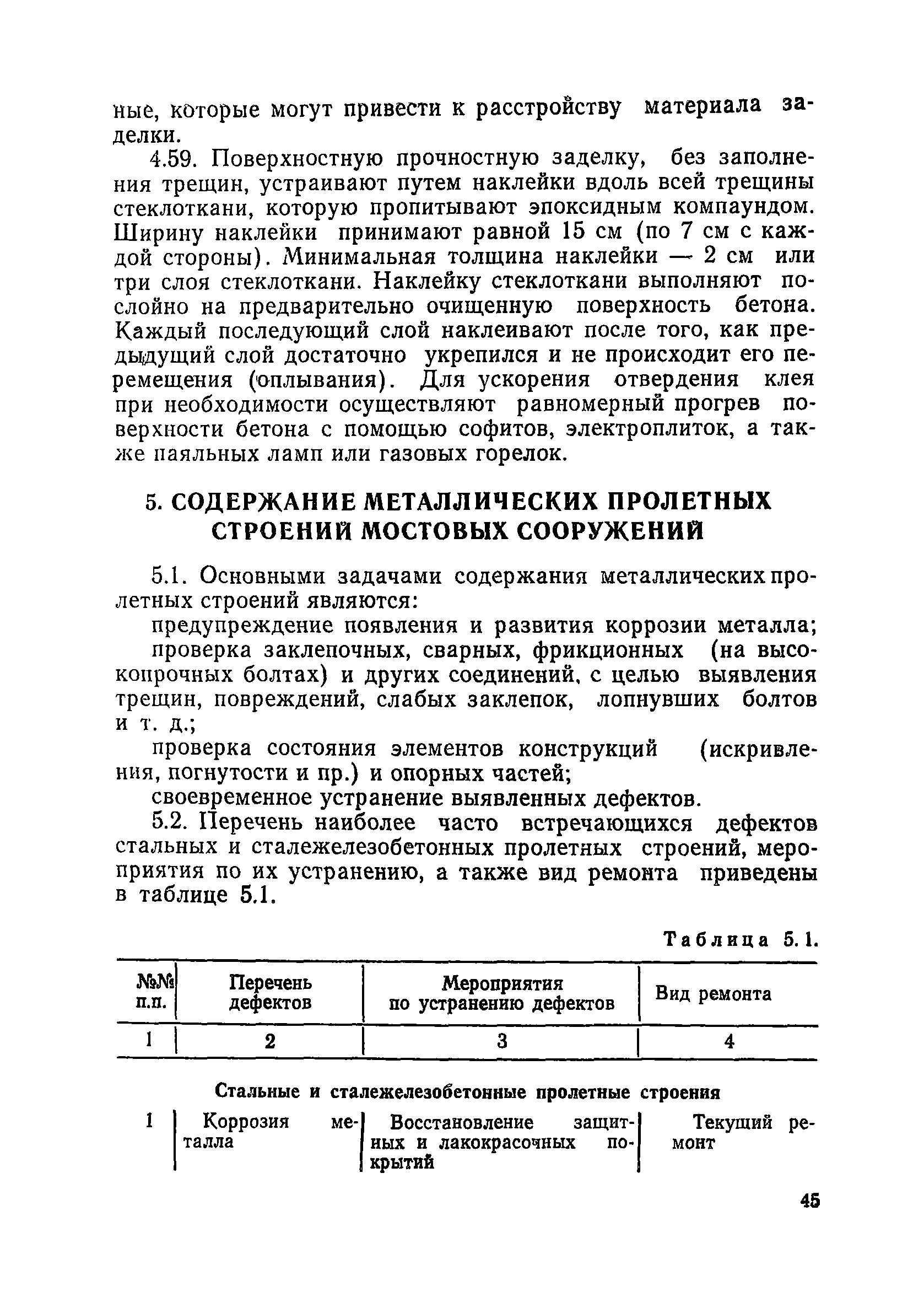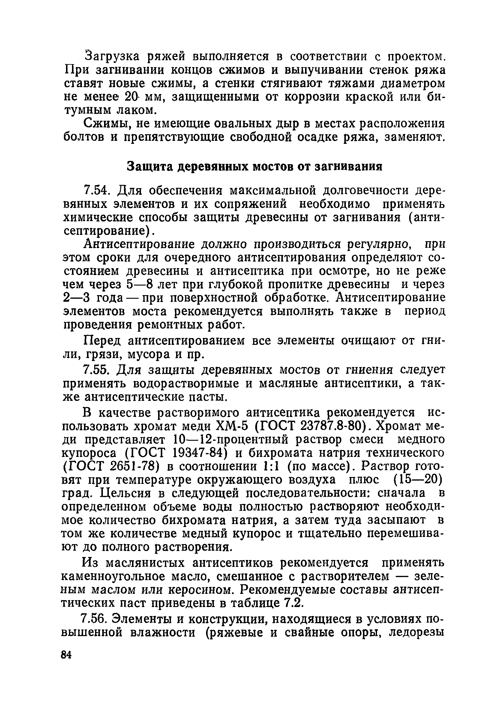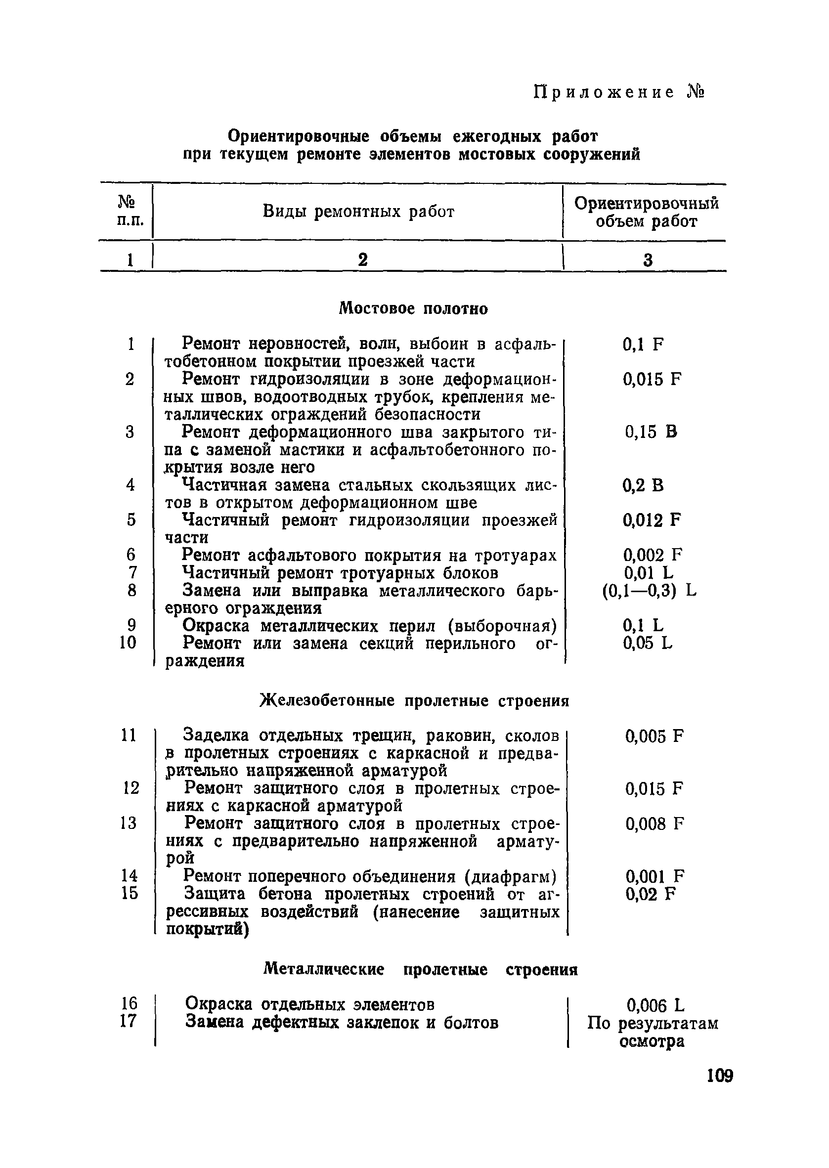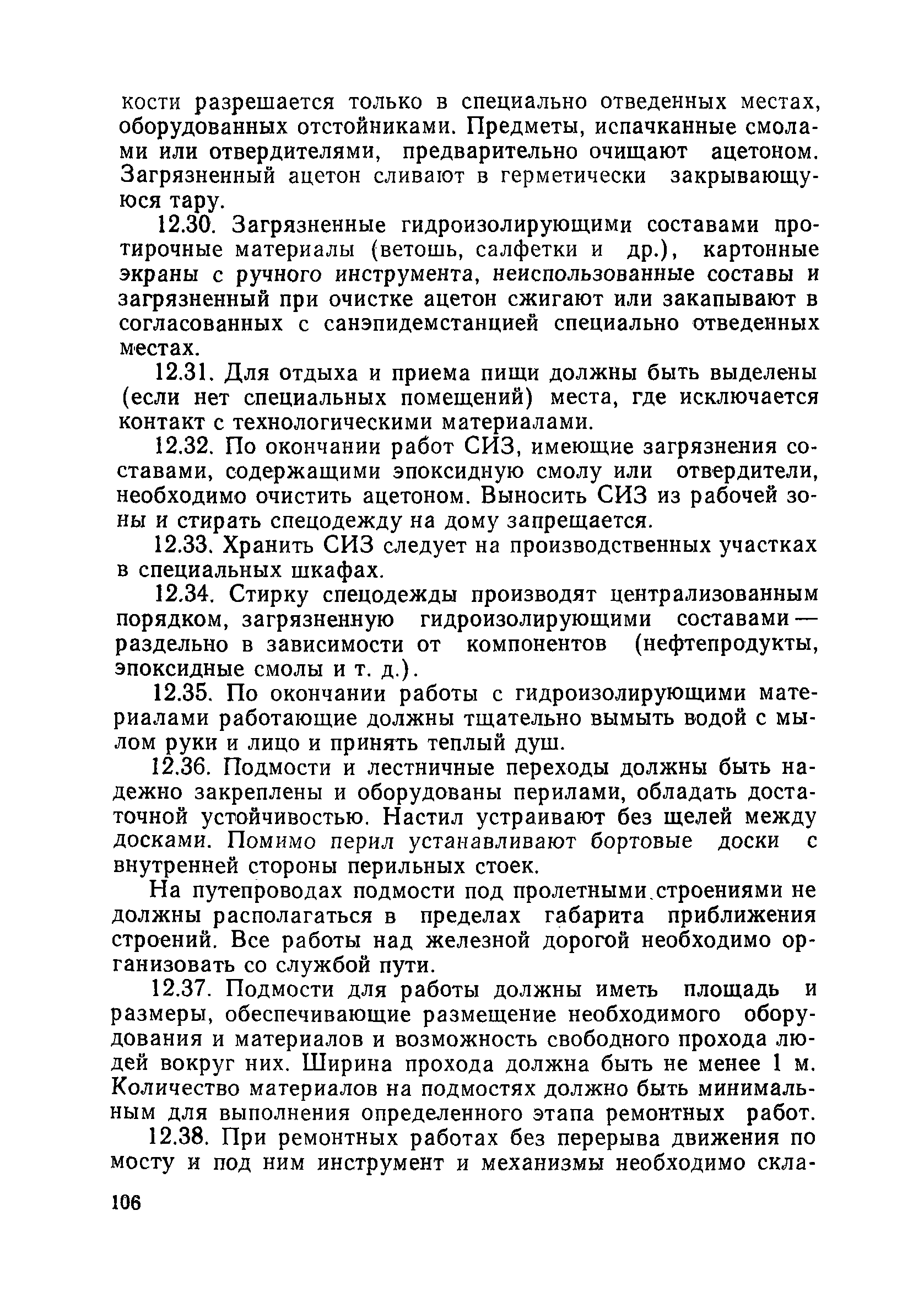 | | Нормативные ссылки: |  СНиП III-4-80* «Техника безопасности в строительстве»  СНиП 2.03.11-85 «Защита строительных конструкций от коррозии»  СНиП 2.05.03-84* «Мосты и трубы»  СНиП 3.06.04-91 «Мосты и трубы»  СНиП 3.06.07-86 «Мосты и трубы. Правила обследований и испытаний»  «Руководство по ремонту элементов мостового полотна автодорожных мостов»  ВСН 32-81 «Инструкция по устройству гидроизоляции конструкций мостов и труб на железных, автомобильных и городских дорогах»  ВСН 24-88 «Технические правила ремонта и содержания автомобильных дорог»  ВСН 37-84 «Инструкция по организации движения и ограждению мест производства дорожных работ»  ГОСТ 23457-86 «Технические средства организации дорожного движения. Правила применения»  Инструкция «Инструкция по перевозке крупногабаритных и тяжеловесных грузов автомобильным транспортом по дорогам Российской Федерации» Инструкция «Инструкция по окраске металлических конструкций, эксплуатируемых на автомобильных дорогах РСФСР, мостов, путепроводов, паромных переправ, ограждений и дорожных знаков» «Рекомендации по ремонту железобетонных мостов. (Конструктивные и технологические решения)» СНиП II-4-79 «Естественное и искусственное освещение»  ПТЭ «Правила технической эксплуатации электроустановок потребителей» ГОСТ 12.0.004-79 «Система стандартов безопасности труда. Организация обучения работающих безопасности труда. Общие положения» ГОСТ 12.1.005-76 «Система стандартов безопасности труда. Воздух рабочей зоны. Общие санитарно-гигиенические требования»  ГОСТ 9109-81 «Грунтовки ФЛ-03К и ФЛ-03Ж. Технические условия» ГОСТ 1003-73 «Сиккативы нафтенатные жидкие. Технические условия»  ГОСТ 10144-89 «Эмали ХВ-124. Технические условия» ГОСТ 10779-78 «Спирт поливиниловый. Технические условия»  ГОСТ 10834-76 «Жидкость гидрофобизирующая 136-41. Технические условия» ГОСТ 11539-83 «Фанера бакелизированная. Технические условия» ГОСТ 12.4.111-82 «Система стандартов безопасности труда. Костюмы мужские для защиты от нефти и нефтепродуктов. Технические условия» ГОСТ 12.4.112-82 «Система стандартов безопасности труда. Костюмы женские для защиты от нефти и нефтепродуктов. Технические условия»  ГОСТ 12.4.137-84 «Обувь специальная кожаная для защиты от нефти, нефтепродуктов, кислот, щелочей, нетоксичной и взрывоопасной пыли. Технические условия»  ГОСТ 12.4.059-89 «Система стандартов безопасности труда. Строительство. Ограждения предохранительные инвентарные. Общие технические условия»  ГОСТ 18188-72 «Растворители марок 645, 646, 647, 648 для лакокрасочных материалов. Технические условия» ГОСТ 19151-73 «Сурик свинцовый. Технические условия» ГОСТ 19347-84 «Купорос медный. Технические условия» ГОСТ 23143-83 «Эмали ЭП-773. Технические условия»  ГОСТ 23732-79 «Вода для бетонов и растворов. Технические условия» ГОСТ 23787.8-80 «Растворы антисептического препарата ХМ-11. Технические требования, требования безопасности и методы анализа»  ГОСТ 24258-88 «Средства подмащивания. Общие технические условия» ГОСТ 2651-78 «Натрия бихромат технический. Технические условия» ГОСТ 26600-85 «Знаки и огни навигационных внутренних водных путей. Общие технические условия»  ГОСТ 2768-84 «Ацетон технический. Технические условия»  ГОСТ 27772-88 «Прокат для строительных стальных конструкций. Общие технические условия» ГОСТ 4641-80 «Дегти каменноугольные для дорожного строительства. Технические условия» ГОСТ 5375-79 «Сапоги резиновые формовые. Техни