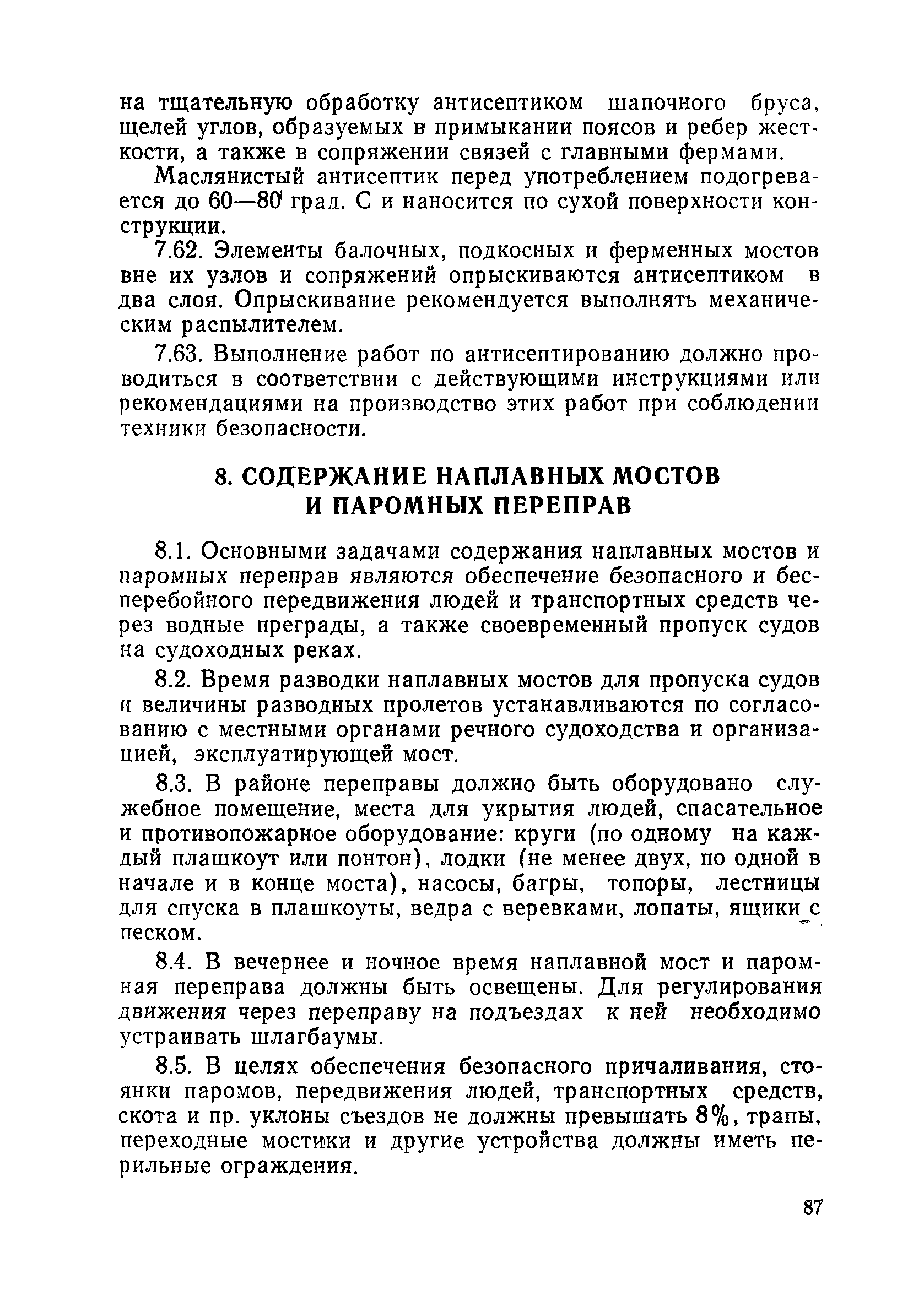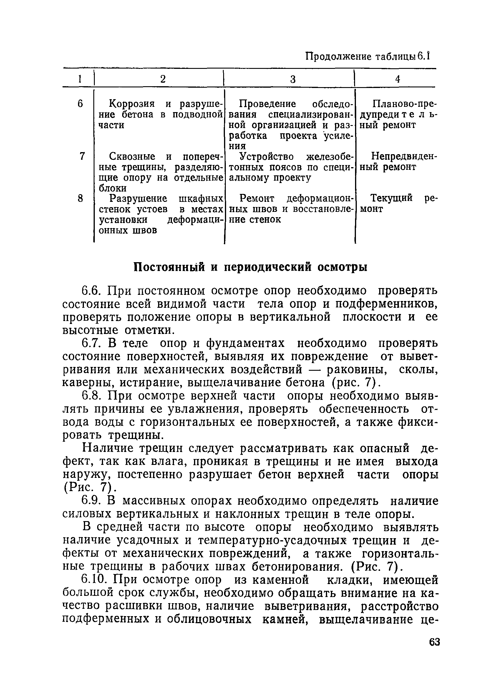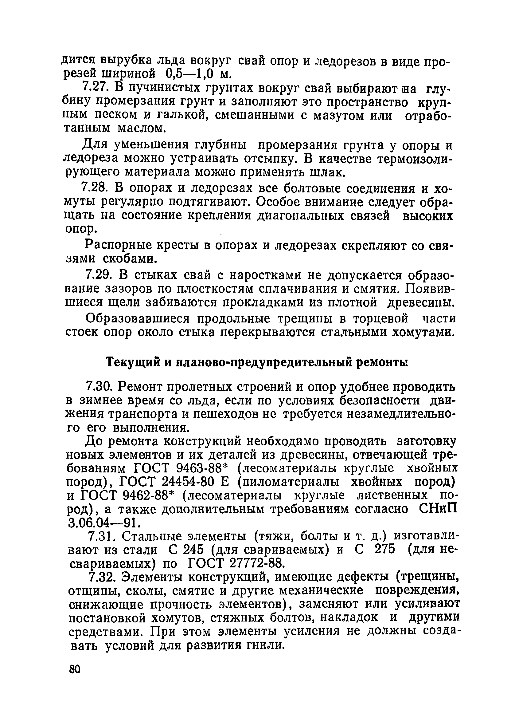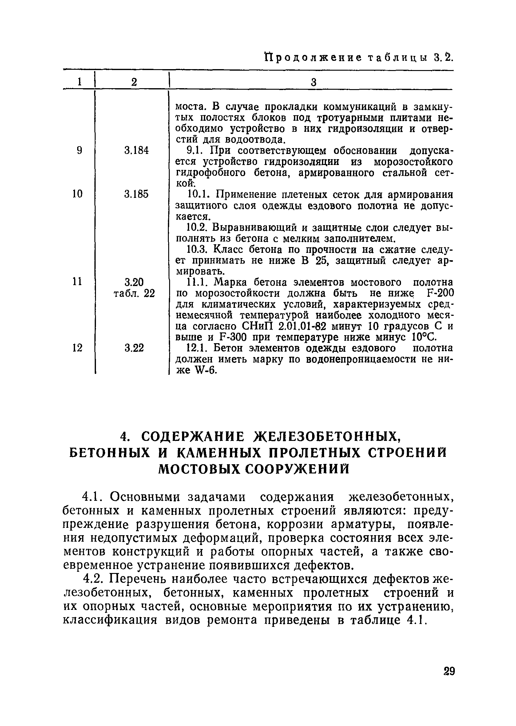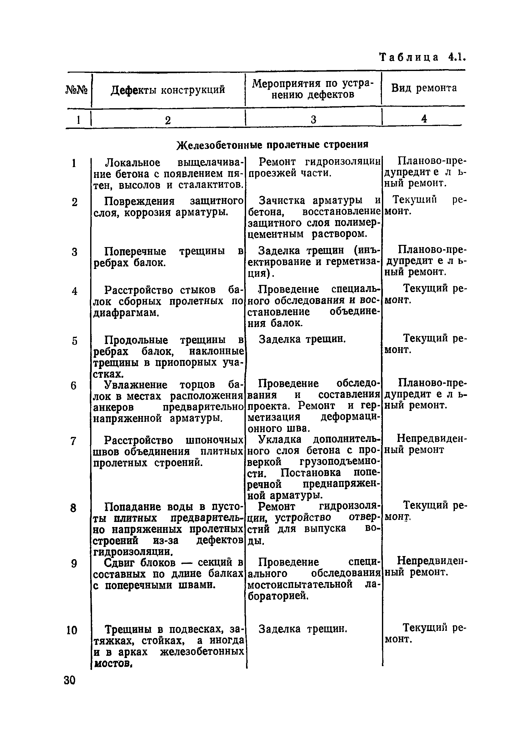 | | Нормативные ссылки: |  СНиП III-4-80* «Техника безопасности в строительстве»  СНиП 2.03.11-85 «Защита строительных конструкций от коррозии»  СНиП 2.05.03-84* «Мосты и трубы»  СНиП 3.06.04-91 «Мосты и трубы»  СНиП 3.06.07-86 «Мосты и трубы. Правила обследований и испытаний»  «Руководство по ремонту элементов мостового полотна автодорожных мостов»  ВСН 32-81 «Инструкция по устройству гидроизоляции конструкций мостов и труб на железных, автомобильных и городских дорогах»  ВСН 24-88 «Технические правила ремонта и содержания автомобильных дорог»  ВСН 37-84 «Инструкция по организации движения и ограждению мест производства дорожных работ»  ГОСТ 23457-86 «Технические средства организации дорожного движения. Правила применения»  Инструкция «Инструкция по перевозке крупногабаритных и тяжеловесных грузов автомобильным транспортом по дорогам Российской Федерации» Инструкция «Инструкция по окраске металлических конструкций, эксплуатируемых на автомобильных дорогах РСФСР, мостов, путепроводов, паромных переправ, ограждений и дорожных знаков» «Рекомендации по ремонту железобетонных мостов. (Конструктивные и технологические решения)» СНиП II-4-79 «Естественное и искусственное освещение»  ПТЭ «Правила технической эксплуатации электроустановок потребителей» ГОСТ 12.0.004-79 «Система стандартов безопасности труда. Организация обучения работающих безопасности труда. Общие положения» ГОСТ 12.1.005-76 «Система стандартов безопасности труда. Воздух рабочей зоны. Общие санитарно-гигиенические требования»  ГОСТ 9109-81 «Грунтовки ФЛ-03К и ФЛ-03Ж. Технические условия» ГОСТ 1003-73 «Сиккативы нафтенатные жидкие. Технические условия»  ГОСТ 10144-89 «Эмали ХВ-124. Технические условия» ГОСТ 10779-78 «Спирт поливиниловый. Технические условия»  ГОСТ 10834-76 «Жидкость гидрофобизирующая 136-41. Технические условия» ГОСТ 11539-83 «Фанера бакелизированная. Технические условия» ГОСТ 12.4.111-82 «Система стандартов безопасности труда. Костюмы мужские для защиты от нефти и нефтепродуктов. Технические условия» ГОСТ 12.4.112-82 «Система стандартов безопасности труда. Костюмы женские для защиты от нефти и нефтепродуктов. Технические условия»  ГОСТ 12.4.137-84 «Обувь специальная кожаная для защиты от нефти, нефтепродуктов, кислот, щелочей, нетоксичной и взрывоопасной пыли. Технические условия»  ГОСТ 12.4.059-89 «Система стандартов безопасности труда. Строительство. Ограждения предохранительные инвентарные. Общие технические условия»  ГОСТ 18188-72 «Растворители марок 645, 646, 647, 648 для лакокрасочных материалов. Технические условия» ГОСТ 19151-73 «Сурик свинцовый. Технические условия» ГОСТ 19347-84 «Купорос медный. Технические условия» ГОСТ 23143-83 «Эмали ЭП-773. Технические условия»  ГОСТ 23732-79 «Вода для бетонов и растворов. Технические условия» ГОСТ 23787.8-80 «Растворы антисептического препарата ХМ-11. Технические требования, требования безопасности и методы анализа»  ГОСТ 24258-88 «Средства подмащивания. Общие технические условия» ГОСТ 2651-78 «Натрия бихромат технический. Технические условия» ГОСТ 26600-85 «Знаки и огни навигационных внутренних водных путей. Общие технические условия»  ГОСТ 2768-84 «Ацетон технический. Технические условия»  ГОСТ 27772-88 «Прокат для строительных стальных конструкций. Общие технические условия» ГОСТ 4641-80 «Дегти каменноугольные для дорожного строительства. Технические условия» ГОСТ 5375-79 «Сапоги резиновые формовые. Техни