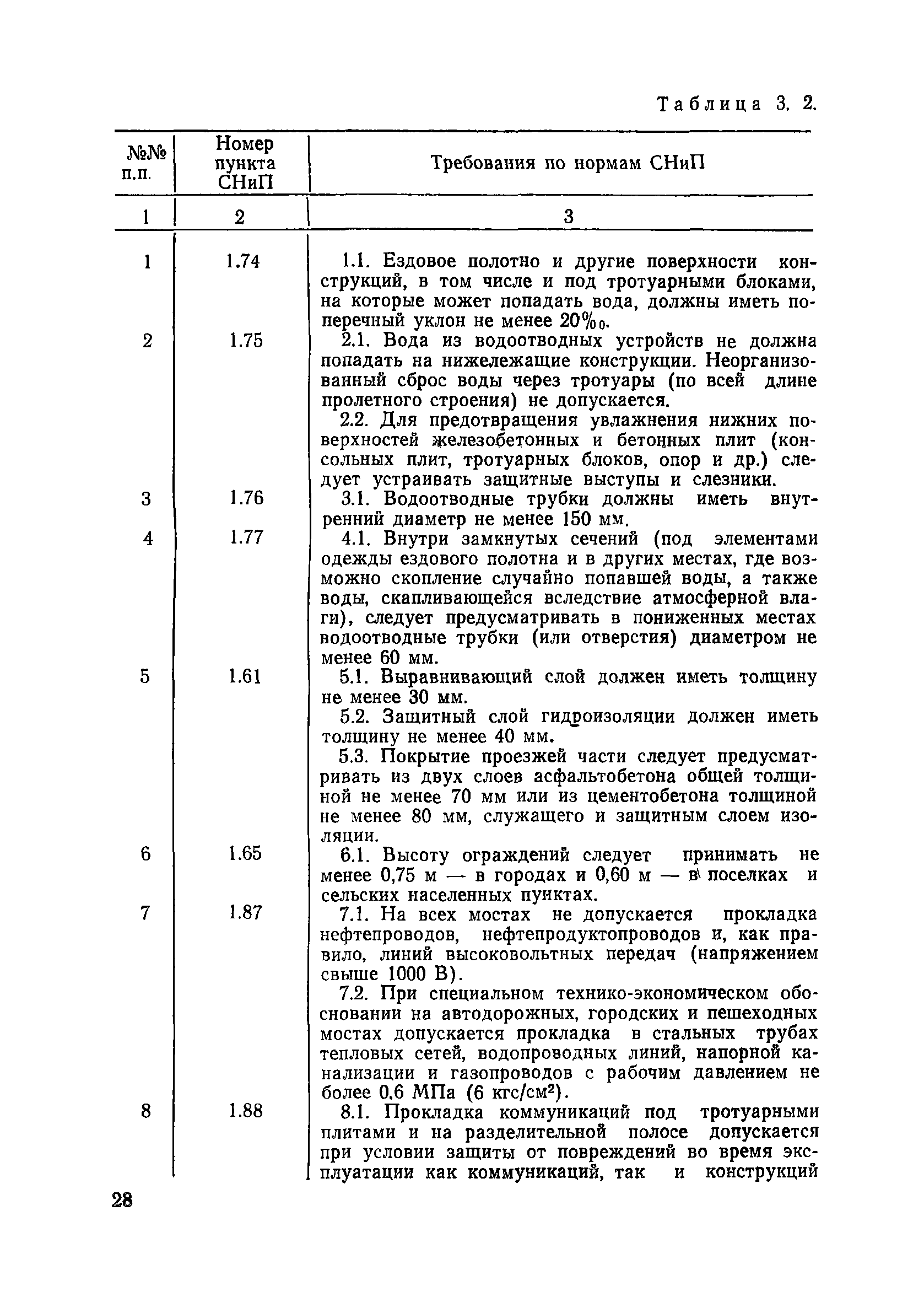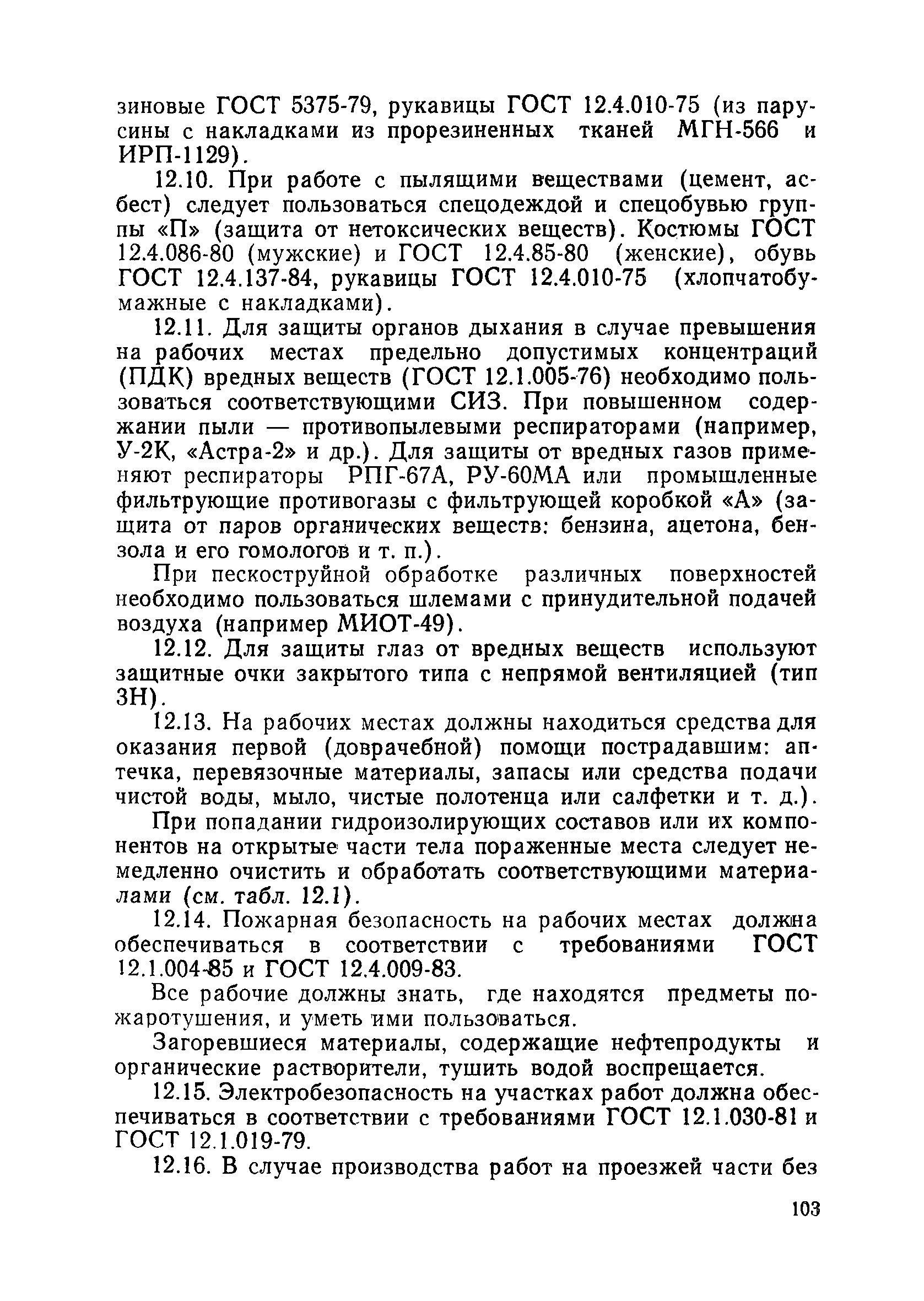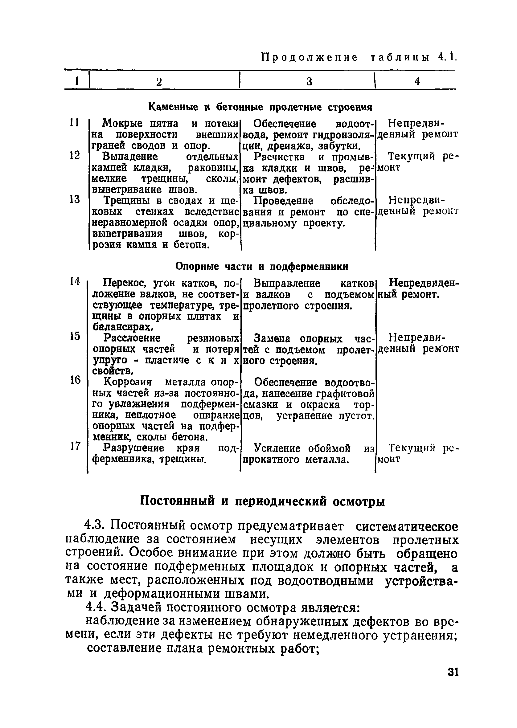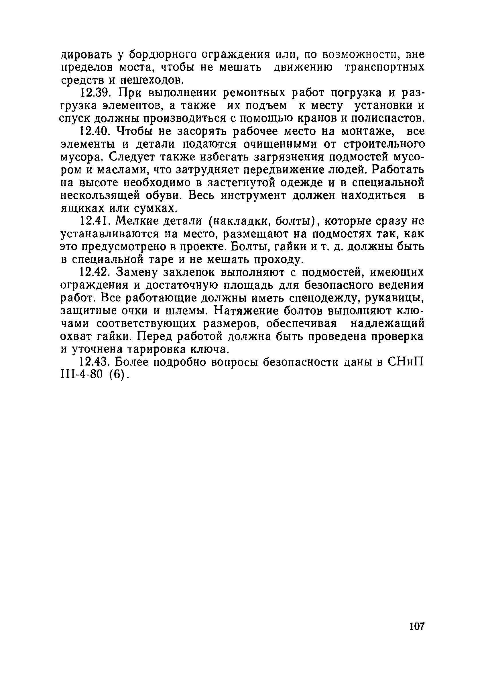 | | Нормативные ссылки: |  СНиП III-4-80* «Техника безопасности в строительстве»  СНиП 2.03.11-85 «Защита строительных конструкций от коррозии»  СНиП 2.05.03-84* «Мосты и трубы»  СНиП 3.06.04-91 «Мосты и трубы»  СНиП 3.06.07-86 «Мосты и трубы. Правила обследований и испытаний»  «Руководство по ремонту элементов мостового полотна автодорожных мостов»  ВСН 32-81 «Инструкция по устройству гидроизоляции конструкций мостов и труб на железных, автомобильных и городских дорогах»  ВСН 24-88 «Технические правила ремонта и содержания автомобильных дорог»  ВСН 37-84 «Инструкция по организации движения и ограждению мест производства дорожных работ»  ГОСТ 23457-86 «Технические средства организации дорожного движения. Правила применения»  Инструкция «Инструкция по перевозке крупногабаритных и тяжеловесных грузов автомобильным транспортом по дорогам Российской Федерации» Инструкция «Инструкция по окраске металлических конструкций, эксплуатируемых на автомобильных дорогах РСФСР, мостов, путепроводов, паромных переправ, ограждений и дорожных знаков» «Рекомендации по ремонту железобетонных мостов. (Конструктивные и технологические решения)» СНиП II-4-79 «Естественное и искусственное освещение»  ПТЭ «Правила технической эксплуатации электроустановок потребителей» ГОСТ 12.0.004-79 «Система стандартов безопасности труда. Организация обучения работающих безопасности труда. Общие положения» ГОСТ 12.1.005-76 «Система стандартов безопасности труда. Воздух рабочей зоны. Общие санитарно-гигиенические требования»  ГОСТ 9109-81 «Грунтовки ФЛ-03К и ФЛ-03Ж. Технические условия» ГОСТ 1003-73 «Сиккативы нафтенатные жидкие. Технические условия»  ГОСТ 10144-89 «Эмали ХВ-124. Технические условия» ГОСТ 10779-78 «Спирт поливиниловый. Технические условия»  ГОСТ 10834-76 «Жидкость гидрофобизирующая 136-41. Технические условия» ГОСТ 11539-83 «Фанера бакелизированная. Технические условия» ГОСТ 12.4.111-82 «Система стандартов безопасности труда. Костюмы мужские для защиты от нефти и нефтепродуктов. Технические условия» ГОСТ 12.4.112-82 «Система стандартов безопасности труда. Костюмы женские для защиты от нефти и нефтепродуктов. Технические условия»  ГОСТ 12.4.137-84 «Обувь специальная кожаная для защиты от нефти, нефтепродуктов, кислот, щелочей, нетоксичной и взрывоопасной пыли. Технические условия»  ГОСТ 12.4.059-89 «Система стандартов безопасности труда. Строительство. Ограждения предохранительные инвентарные. Общие технические условия»  ГОСТ 18188-72 «Растворители марок 645, 646, 647, 648 для лакокрасочных материалов. Технические условия» ГОСТ 19151-73 «Сурик свинцовый. Технические условия» ГОСТ 19347-84 «Купорос медный. Технические условия» ГОСТ 23143-83 «Эмали ЭП-773. Технические условия»  ГОСТ 23732-79 «Вода для бетонов и растворов. Технические условия» ГОСТ 23787.8-80 «Растворы антисептического препарата ХМ-11. Технические требования, требования безопасности и методы анализа»  ГОСТ 24258-88 «Средства подмащивания. Общие технические условия» ГОСТ 2651-78 «Натрия бихромат технический. Технические условия» ГОСТ 26600-85 «Знаки и огни навигационных внутренних водных путей. Общие технические условия»  ГОСТ 2768-84 «Ацетон технический. Технические условия»  ГОСТ 27772-88 «Прокат для строительных стальных конструкций. Общие технические условия» ГОСТ 4641-80 «Дегти каменноугольные для дорожного строительства. Технические условия» ГОСТ 5375-79 «Сапоги резиновые формовые. Техни