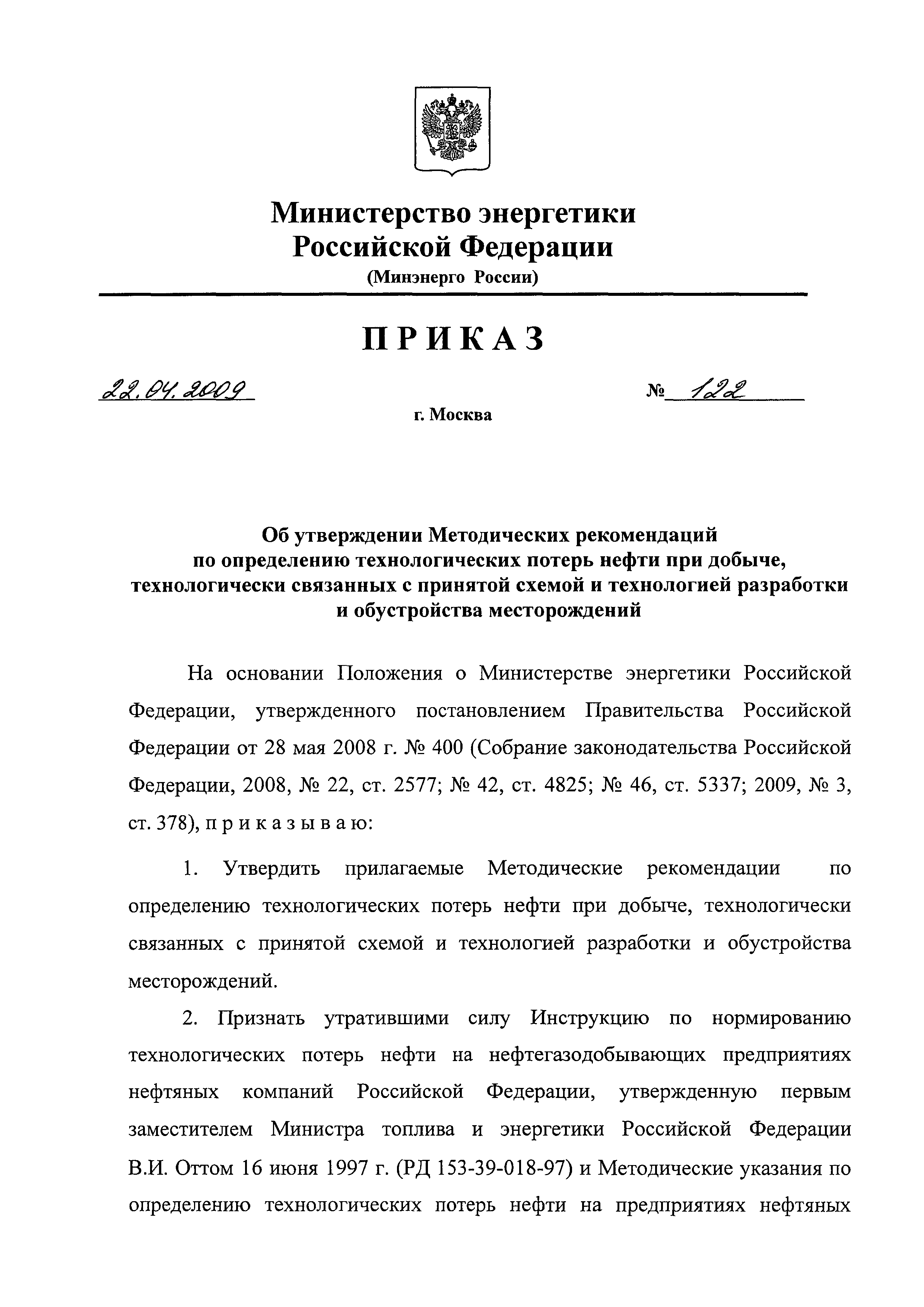 | Утверждён: | 22.04.2009 Минэнерго России (Russian Federation Minenergo 122) |