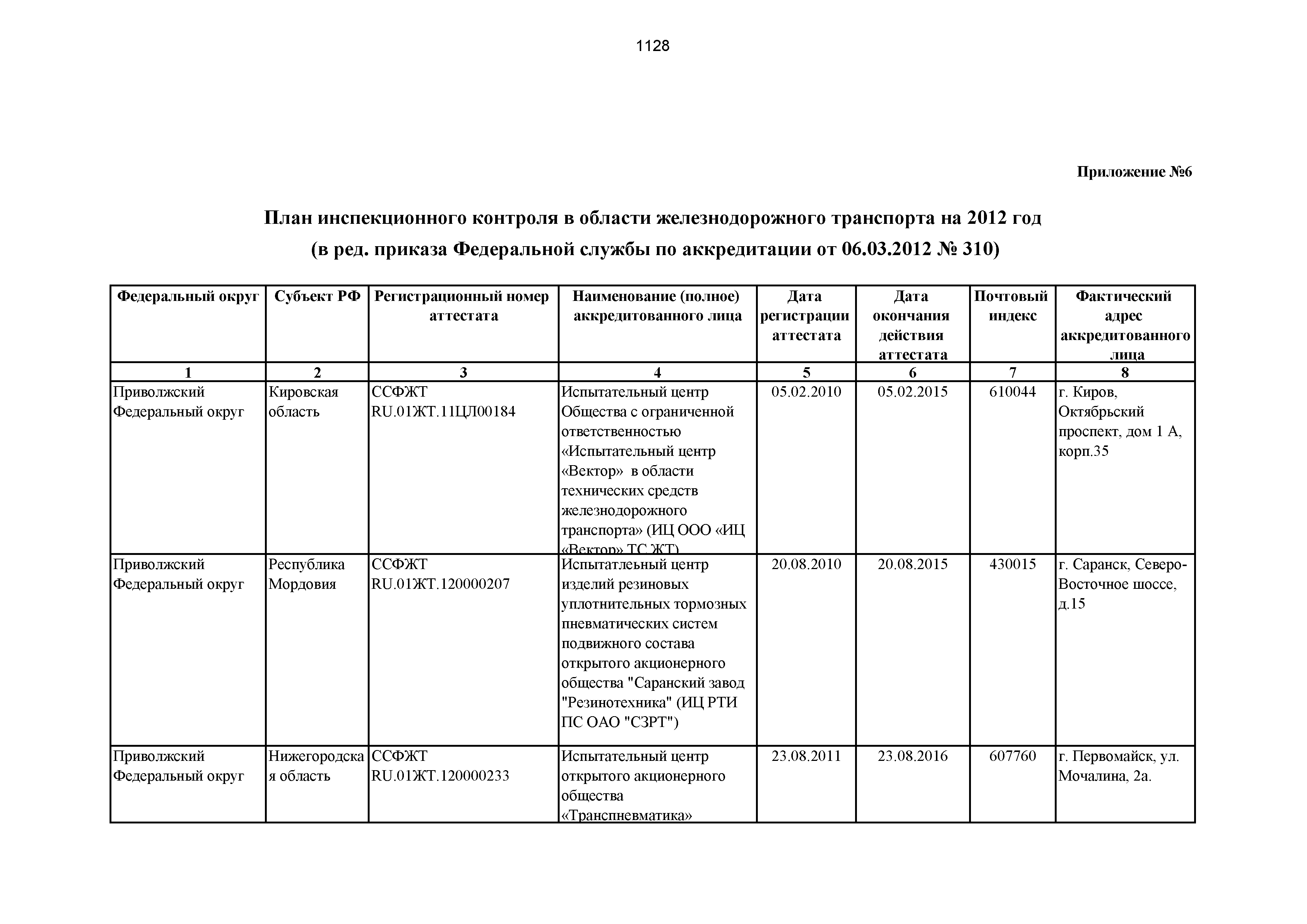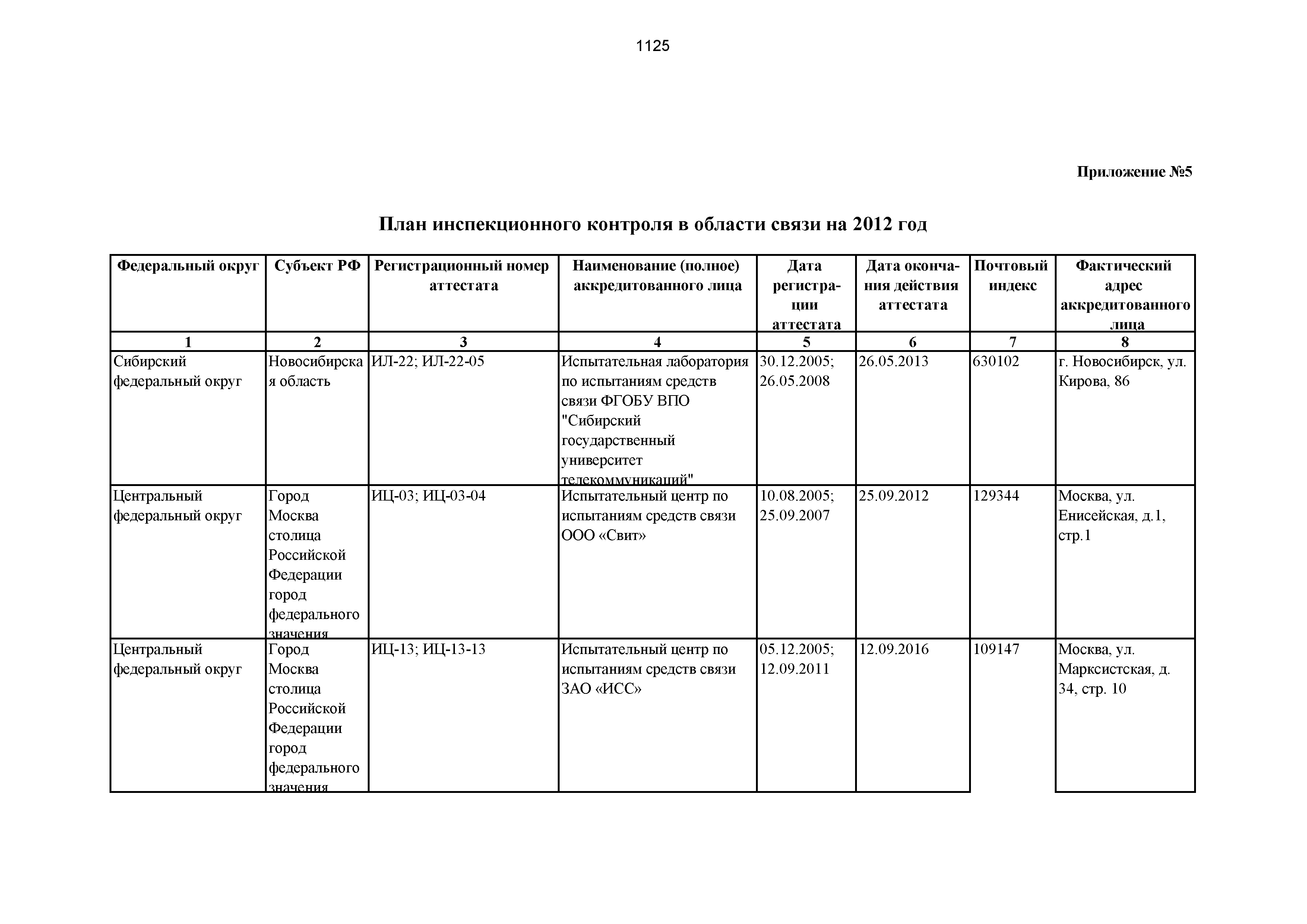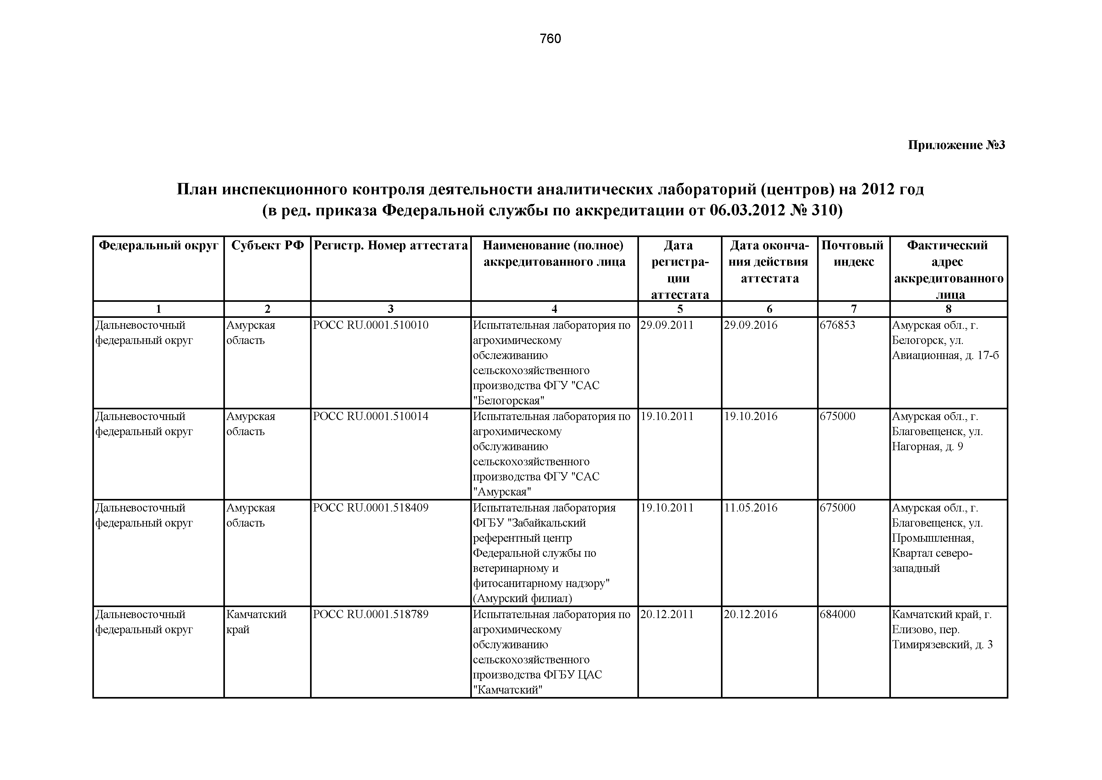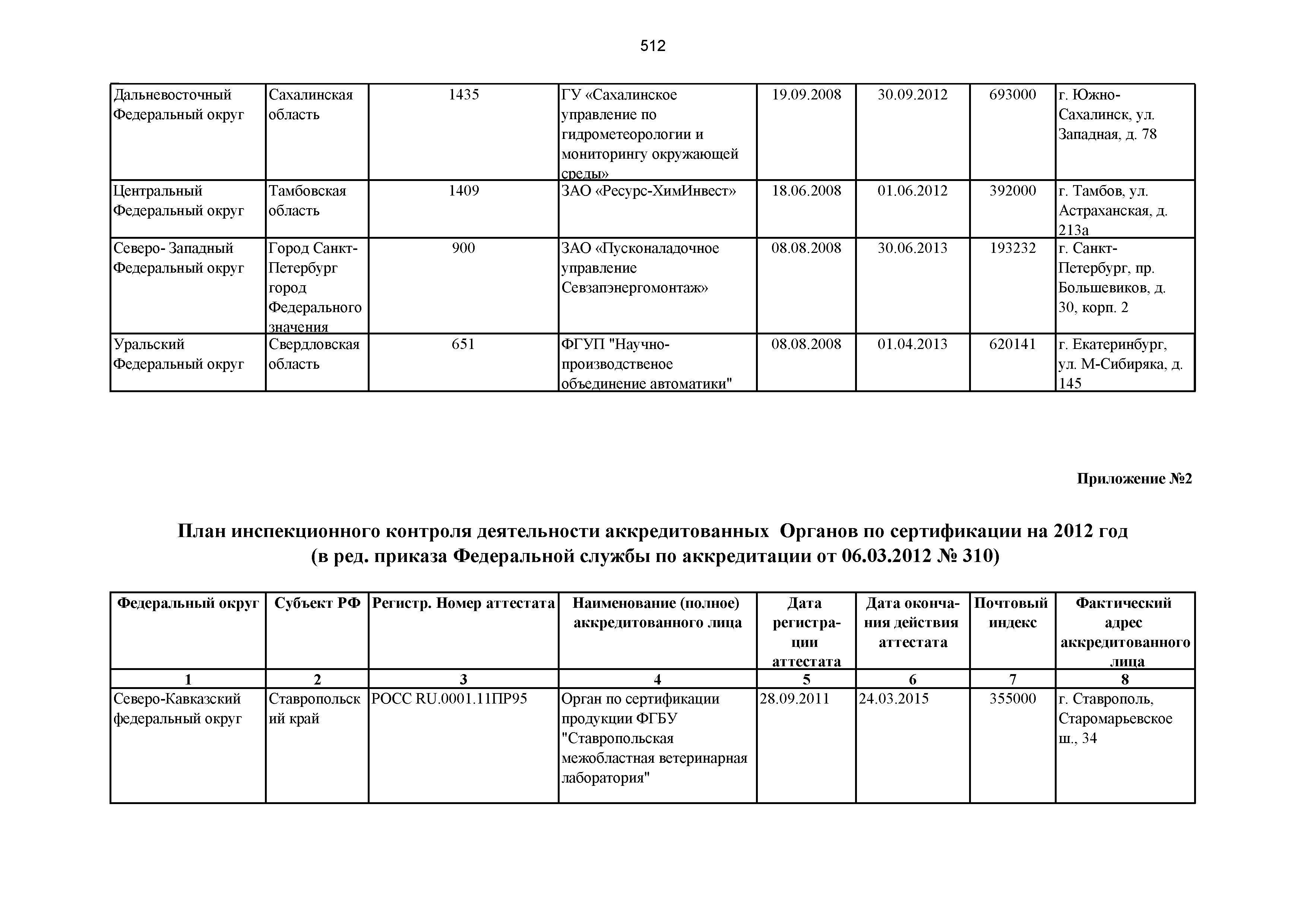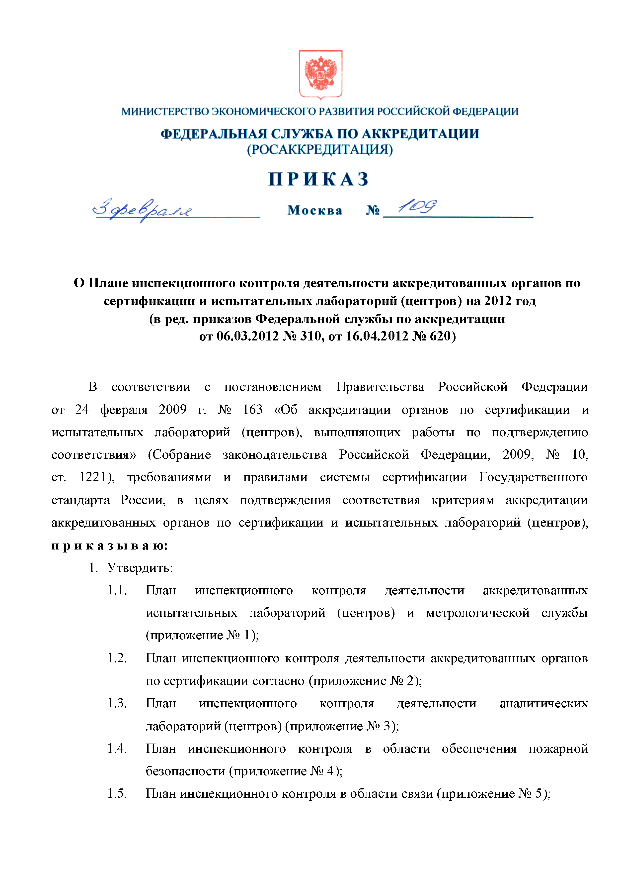 | Оглавление: | Приложение 1. План инспекционного контроля деятельности аккредитованных испытательных лабораторий (центров) и метрологической службы на 2012 год Приложение 2. План инспекционного контроля деятельности аккредитованных Органов по сертификации на 2012 год Приложение 3. План инспекционного контроля деятельности аналитических лабораторий (центров) на 2012 год Приложение 4. План инспекционного контроля в области обеспечения пожарной безопасности на 2012 год Приложение 5. План инспекционного контроля в области связи на 2012 год Приложение 6. План инспекционного контроля в области железнодорожного транспорта на 2012 год |