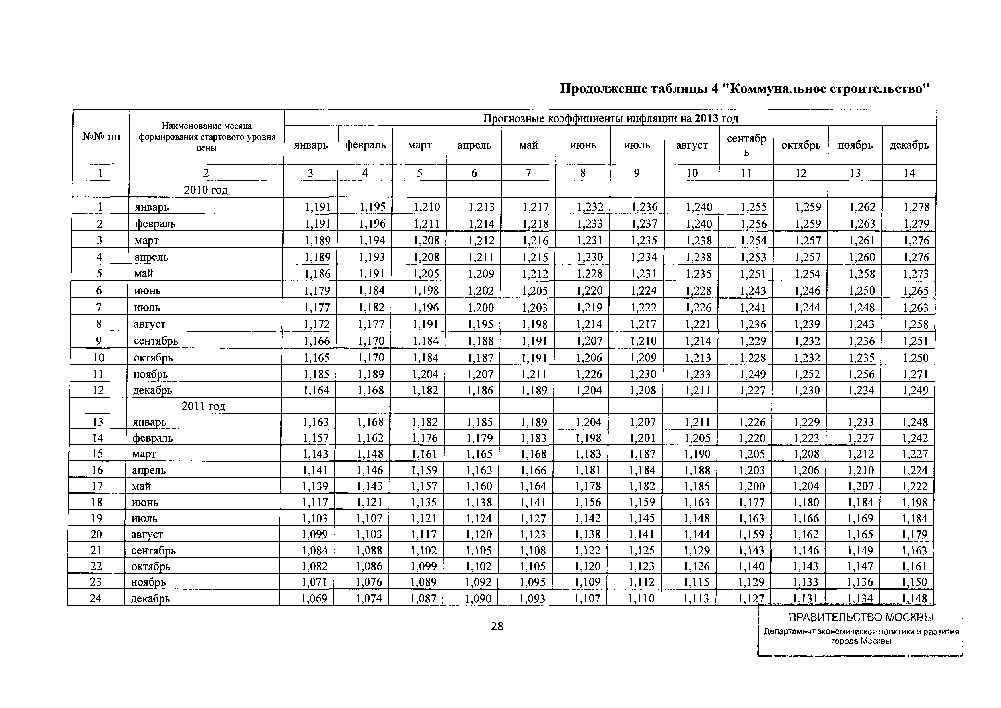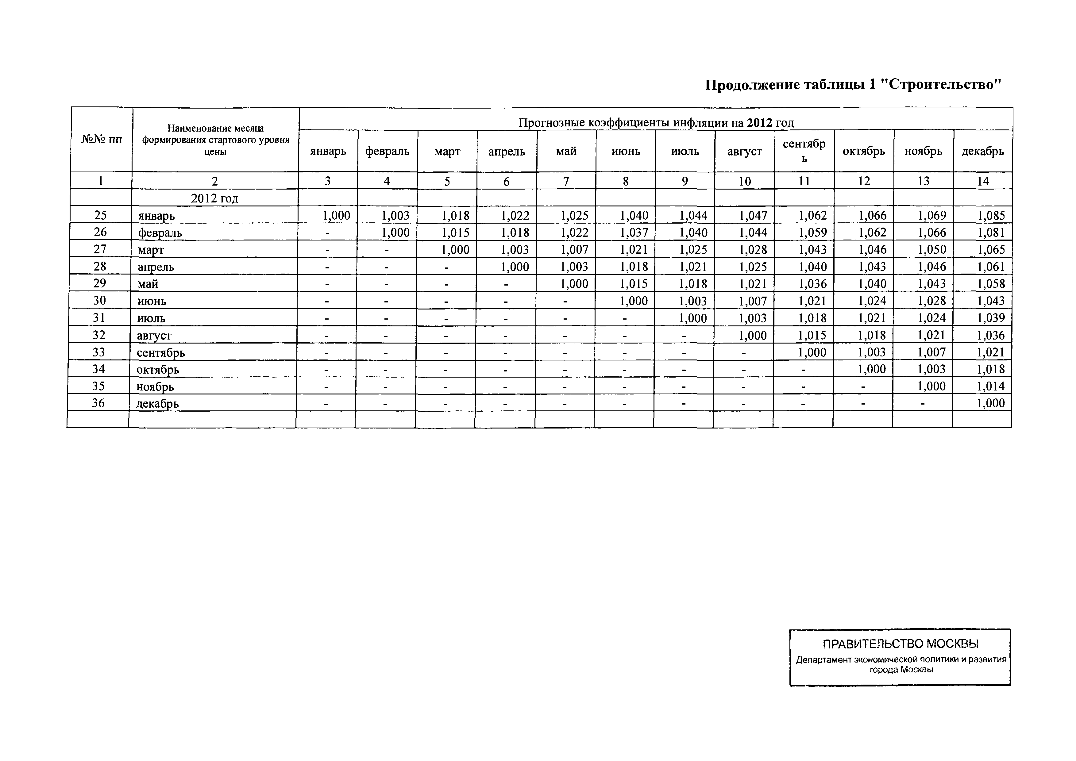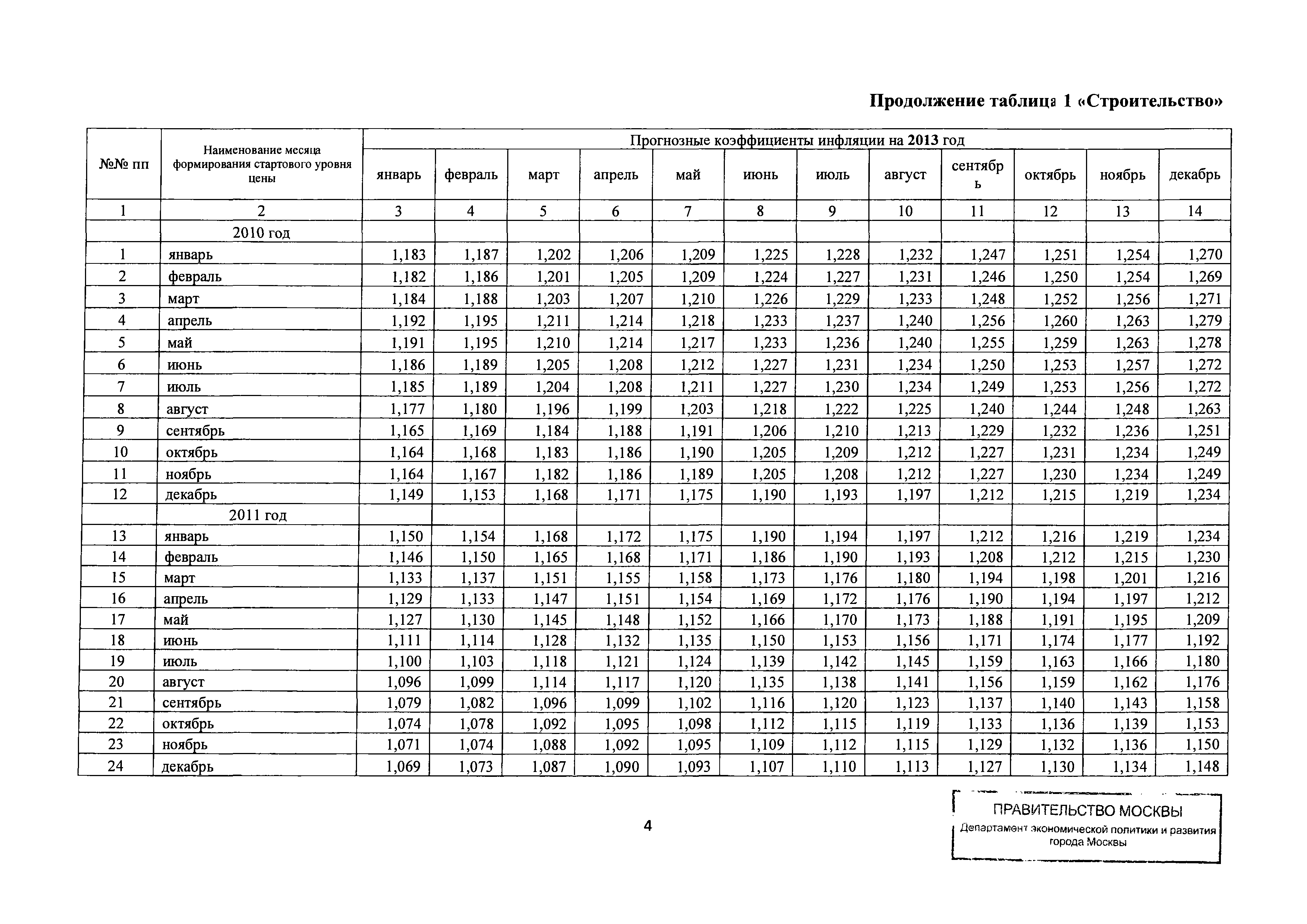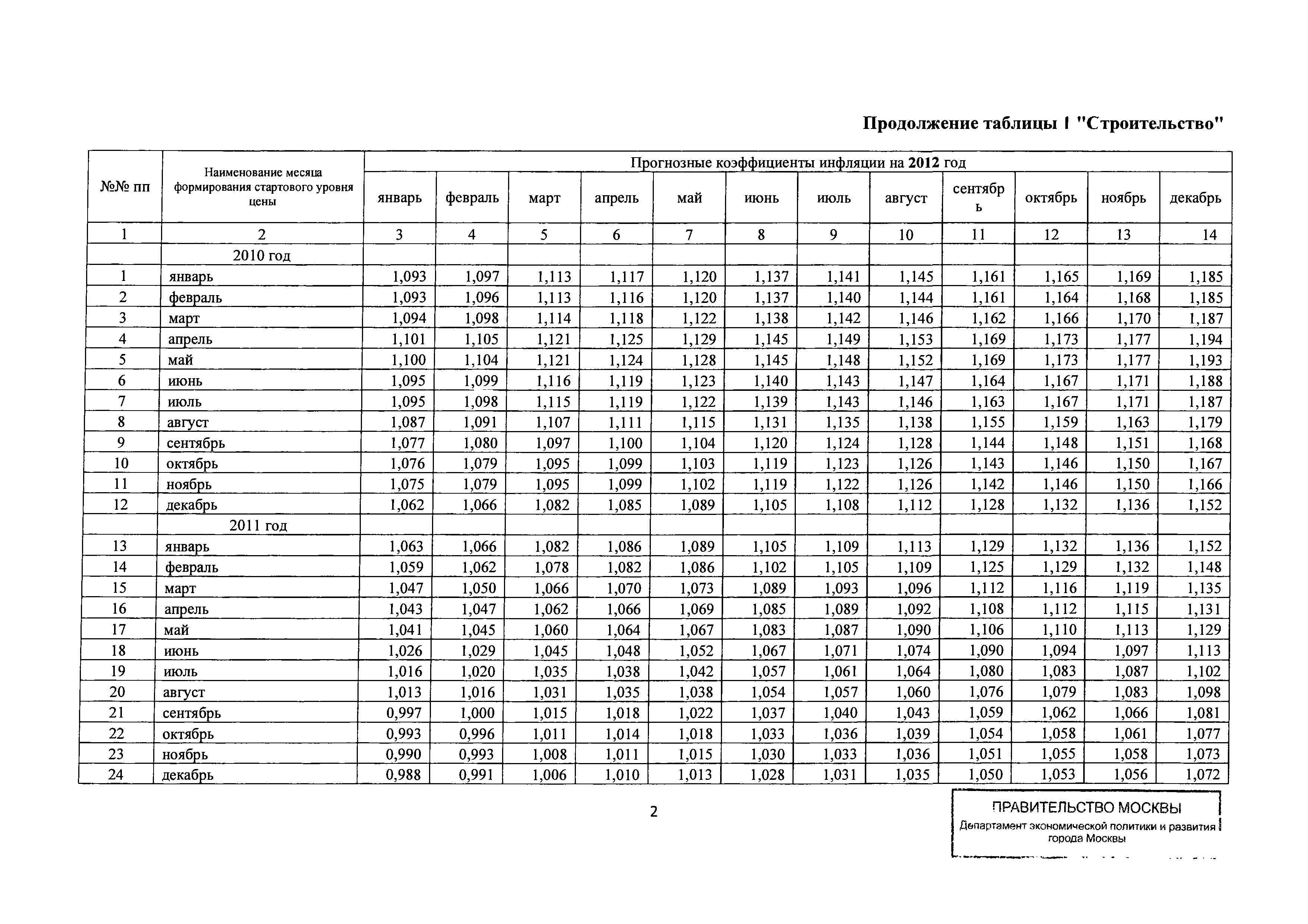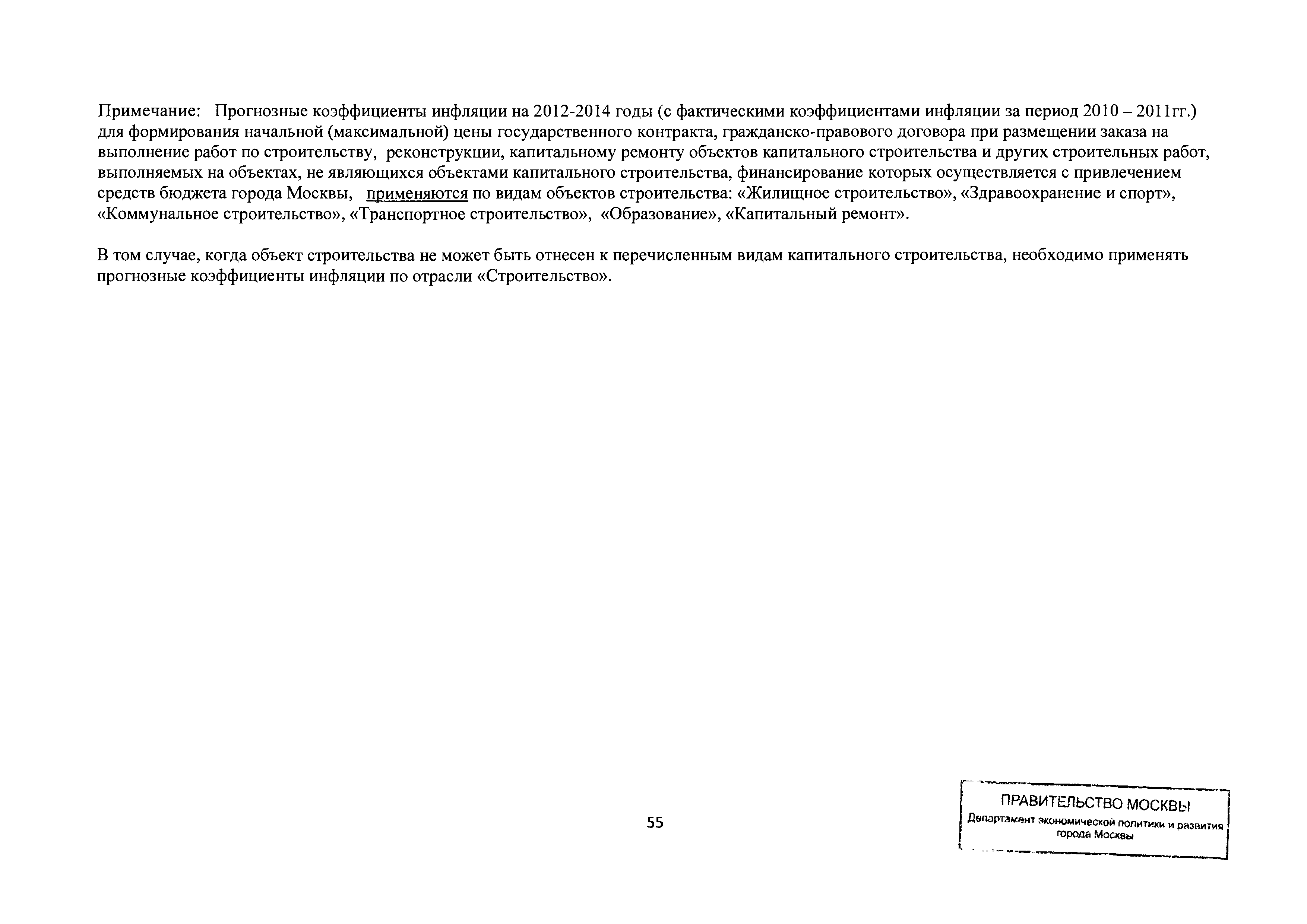 Прогнозные коэффициенты инфляции на 2012 - 2014 годы (с фактическими коэффициентами инфляции за период 2010 - 2011 гг.) для формирования начальной (максимальной) цены государственного контракта, гражданско-правового договора при размещении заказа на выполнение работ по строительству, реконструкции, капитальному ремонту объектов капитального строительства и других строительных работ, выполняемых на объектах, не являющихся объектами капитального строительства, финансируемых с привлечением средств бюджета города Москвы| Статус: | действует | | Название рус.: | Прогнозные коэффициенты инфляции на 2012 - 2014 годы (с фактическими коэффициентами инфляции за период 2010 - 2011 гг.) для формирования начальной (максимальной) цены государственного контракта, гражданско-правового договора при размещении заказа на выполнение работ по строительству, реконструкции, капитальному ремонту объектов капитального строительства и других строительных работ, выполняемых на объектах, не являющихся объектами капитального строительства, финансируемых с привлечением средств бюджета города Москвы | | Дата добавления в базу: | 01.09.2013 | | Дата актуализации: | 01.01.2021 | | Оглавление: | Таблица 1. Строительство Таблица 2. Жилищное строительство Таблица 3. Здравоохранение и спорт Таблица 4. Коммунальное строительство Таблица 5. Транспортное строительство Таблица 6. Образование Таблица 7. Капитальный ремонт | | Утверждён: | 22.02.2012 Департамент экономической политики и развития города Москвы (City of Moscow Department of Economic Policy and Development 3-Р)