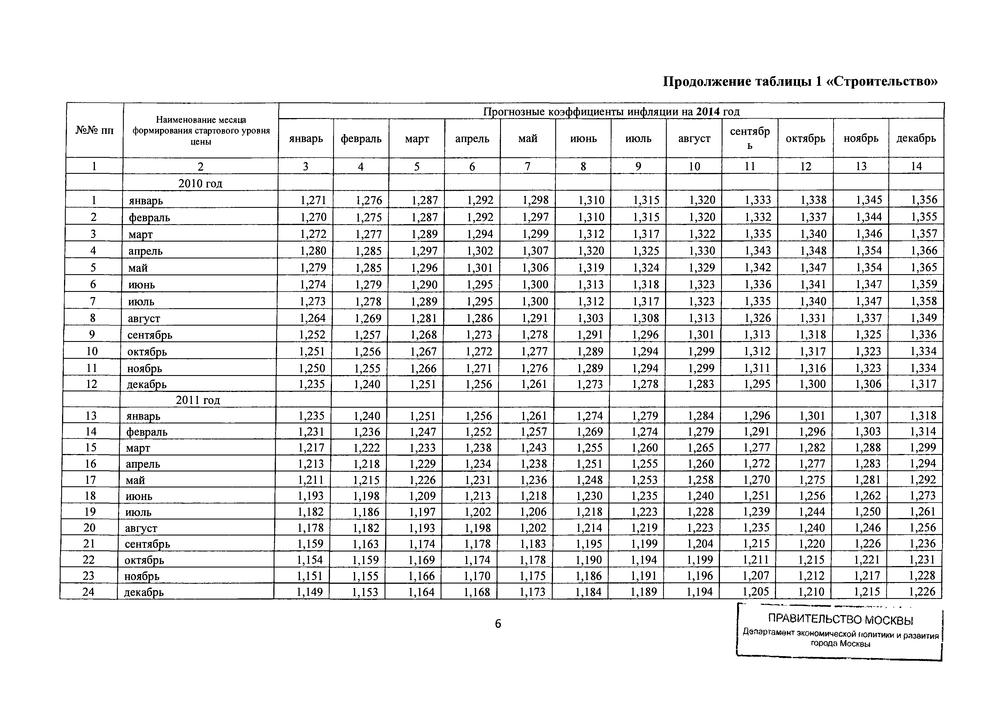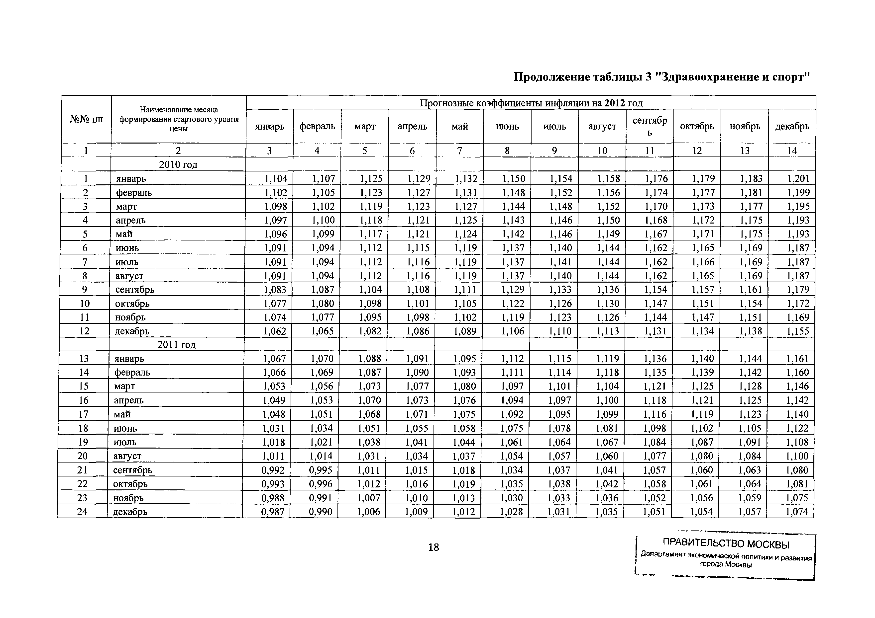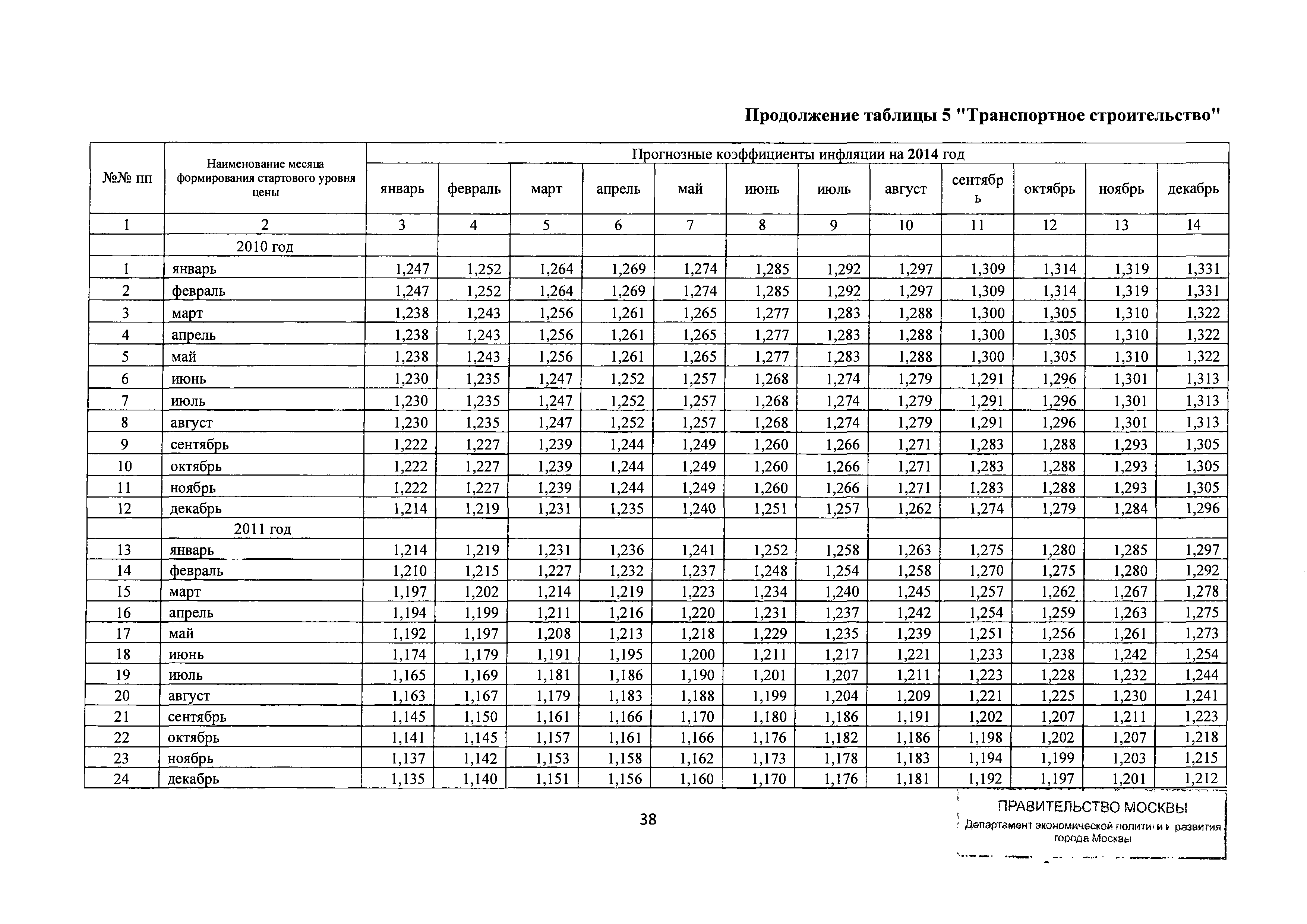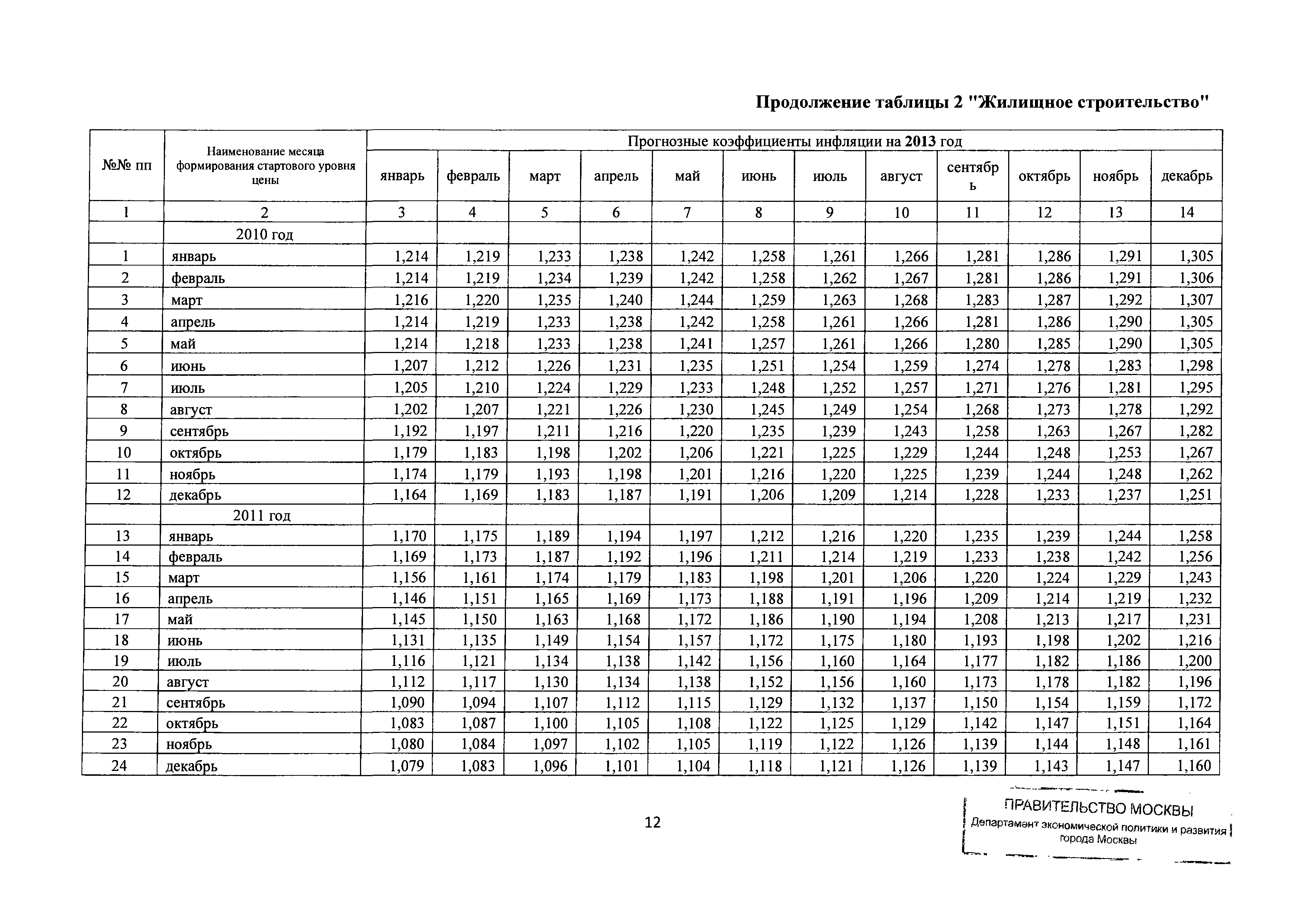Прогнозные коэффициенты инфляции на 2012 - 2014 годы (с фактическими коэффициентами инфляции за период 2010 - 2011 гг.) для формирования начальной (максимальной) цены государственного контракта, гражданско-правового договора при размещении заказа на выполнение работ по строительству, реконструкции, капитальному ремонту объектов капитального строительства и других строительных работ, выполняемых на объектах, не являющихся объектами капитального строительства, финансируемых с привлечением средств бюджета города Москвы| Статус: | действует | | Название рус.: | Прогнозные коэффициенты инфляции на 2012 - 2014 годы (с фактическими коэффициентами инфляции за период 2010 - 2011 гг.) для формирования начальной (максимальной) цены государственного контракта, гражданско-правового договора при размещении заказа на выполнение работ по строительству, реконструкции, капитальному ремонту объектов капитального строительства и других строительных работ, выполняемых на объектах, не являющихся объектами капитального строительства, финансируемых с привлечением средств бюджета города Москвы | | Дата добавления в базу: | 01.09.2013 | | Дата актуализации: | 01.01.2021 | | Оглавление: | Таблица 1. Строительство Таблица 2. Жилищное строительство Таблица 3. Здравоохранение и спорт Таблица 4. Коммунальное строительство Таблица 5. Транспортное строительство Таблица 6. Образование Таблица 7. Капитальный ремонт | | Утверждён: | 22.02.2012 Департамент экономической политики и развития города Москвы (City of Moscow Department of Economic Policy and Development 3-Р)