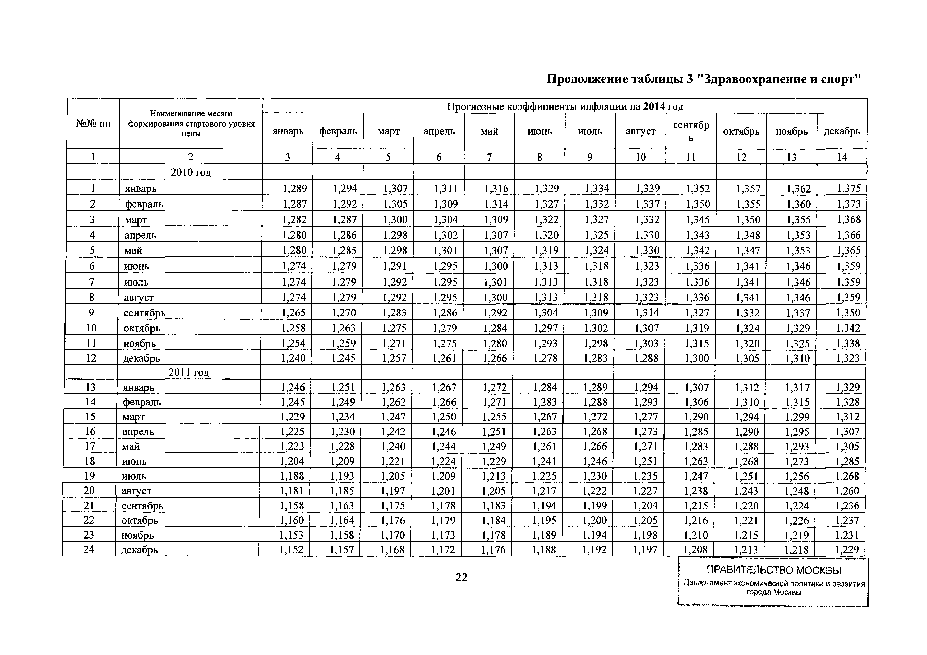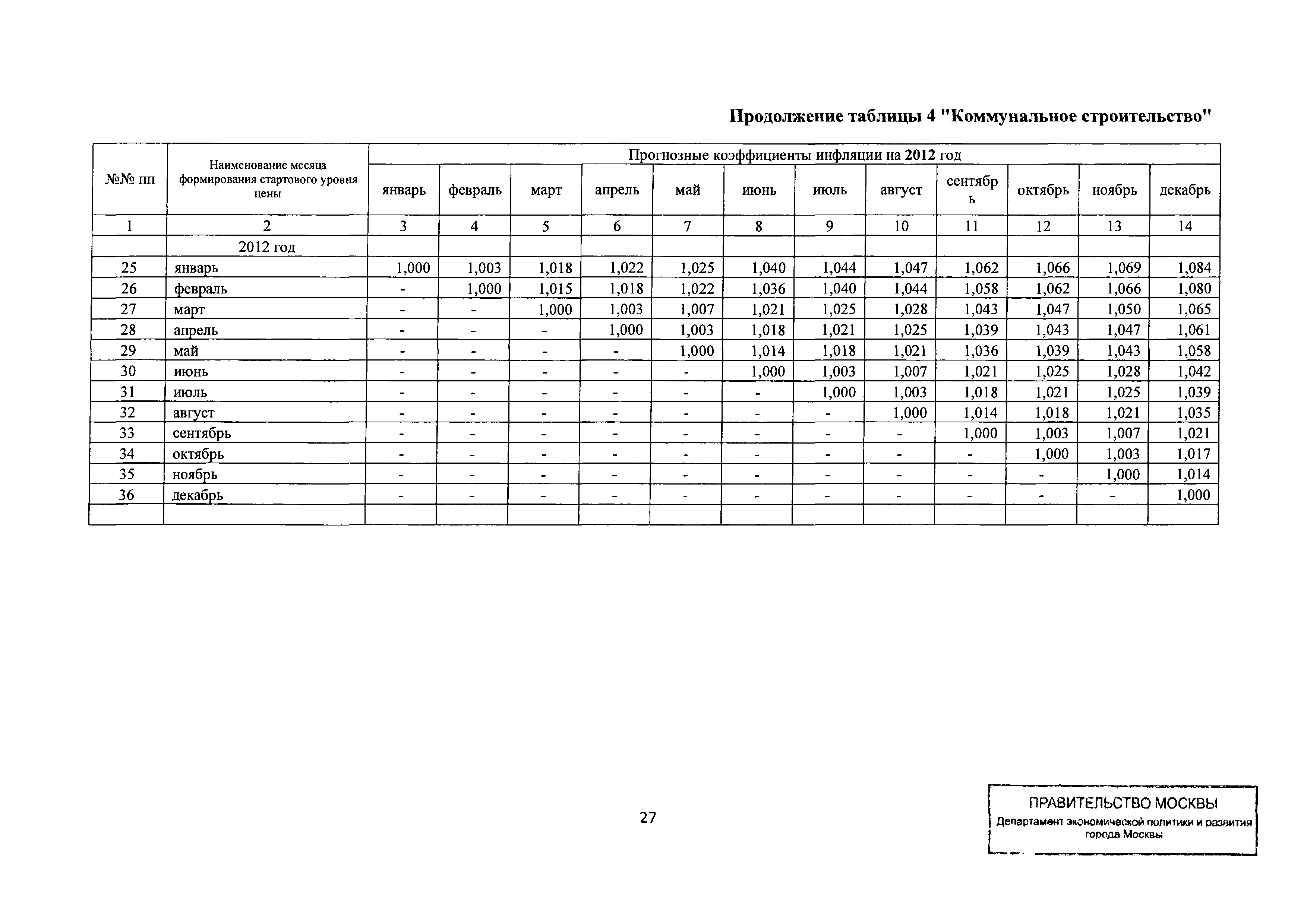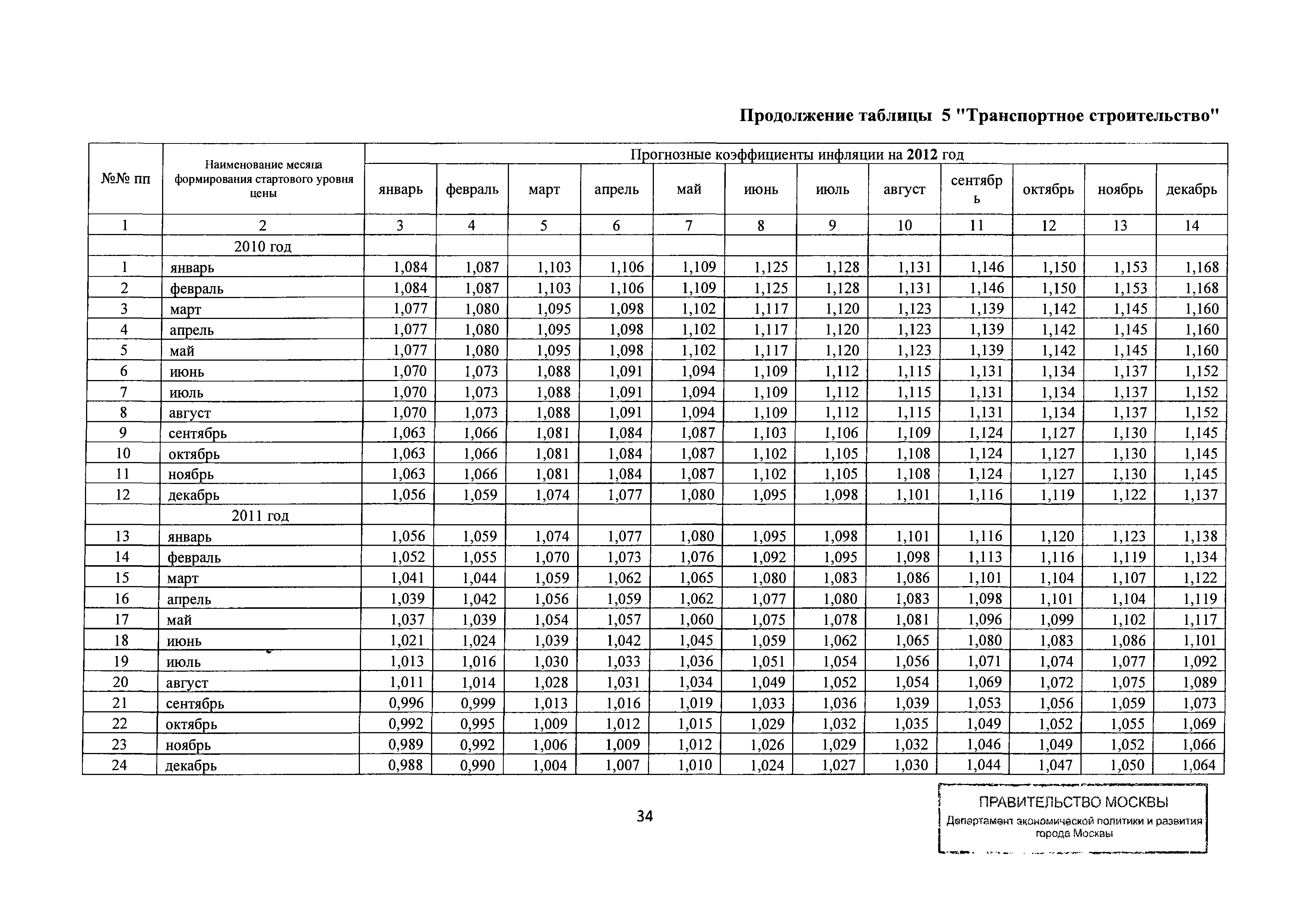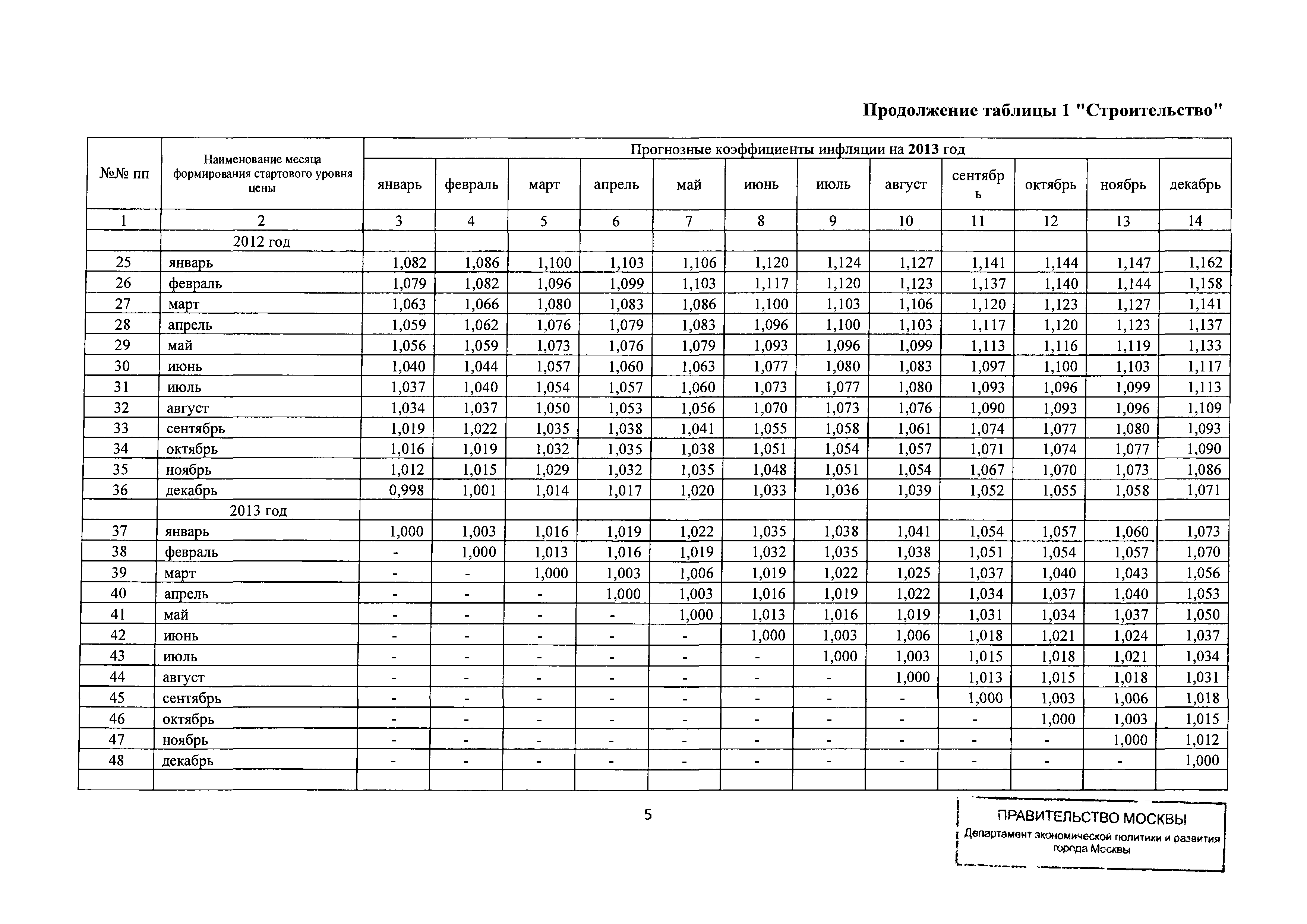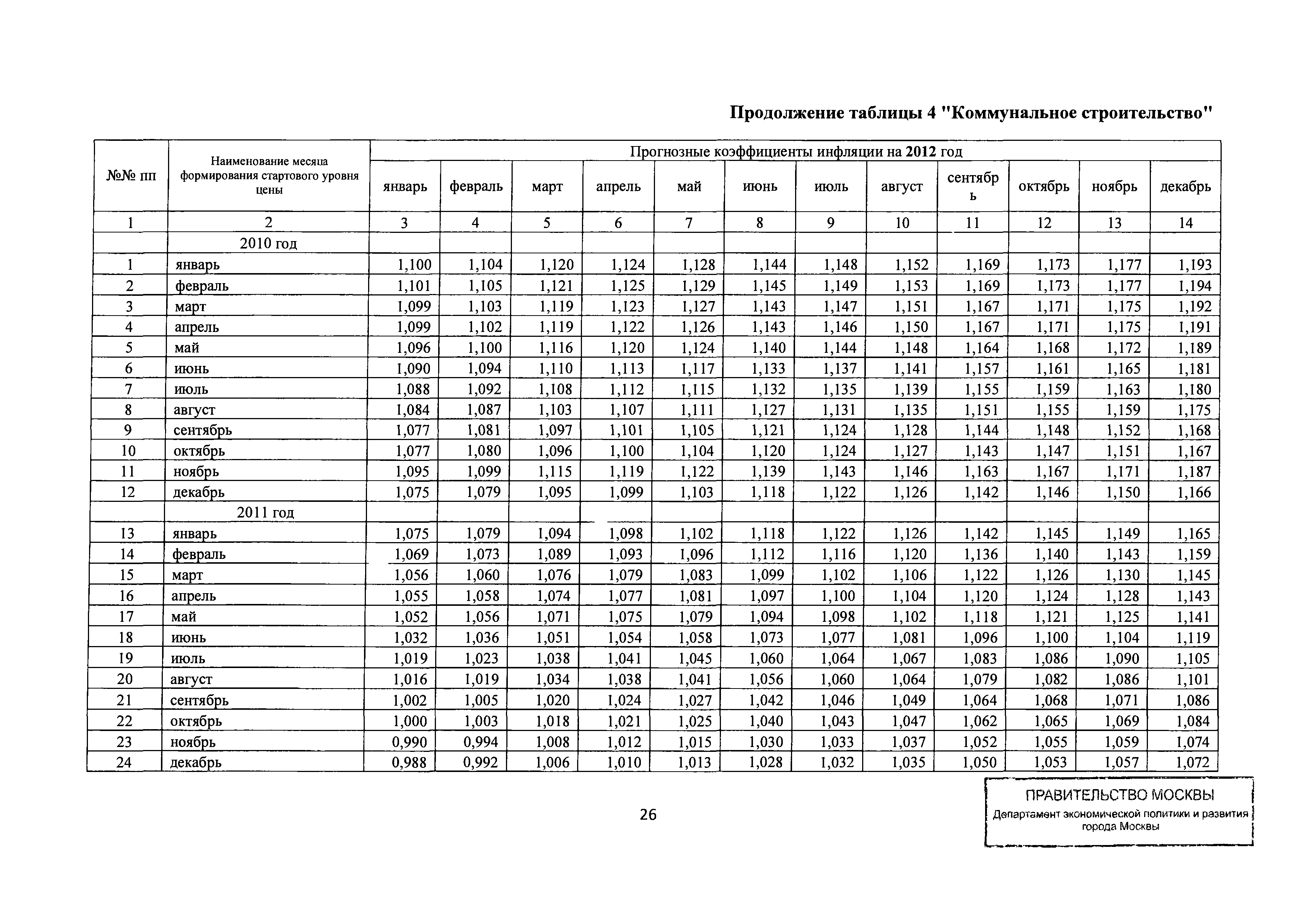 Прогнозные коэффициенты инфляции на 2012 - 2014 годы (с фактическими коэффициентами инфляции за период 2010 - 2011 гг.) для формирования начальной (максимальной) цены государственного контракта, гражданско-правового договора при размещении заказа на выполнение работ по строительству, реконструкции, капитальному ремонту объектов капитального строительства и других строительных работ, выполняемых на объектах, не являющихся объектами капитального строительства, финансируемых с привлечением средств бюджета города Москвы| Статус: | действует | | Название рус.: | Прогнозные коэффициенты инфляции на 2012 - 2014 годы (с фактическими коэффициентами инфляции за период 2010 - 2011 гг.) для формирования начальной (максимальной) цены государственного контракта, гражданско-правового договора при размещении заказа на выполнение работ по строительству, реконструкции, капитальному ремонту объектов капитального строительства и других строительных работ, выполняемых на объектах, не являющихся объектами капитального строительства, финансируемых с привлечением средств бюджета города Москвы | | Дата добавления в базу: | 01.09.2013 | | Дата актуализации: | 01.01.2021 | | Оглавление: | Таблица 1. Строительство Таблица 2. Жилищное строительство Таблица 3. Здравоохранение и спорт Таблица 4. Коммунальное строительство Таблица 5. Транспортное строительство Таблица 6. Образование Таблица 7. Капитальный ремонт | | Утверждён: | 22.02.2012 Департамент экономической политики и развития города Москвы (City of Moscow Department of Economic Policy and Development 3-Р)
