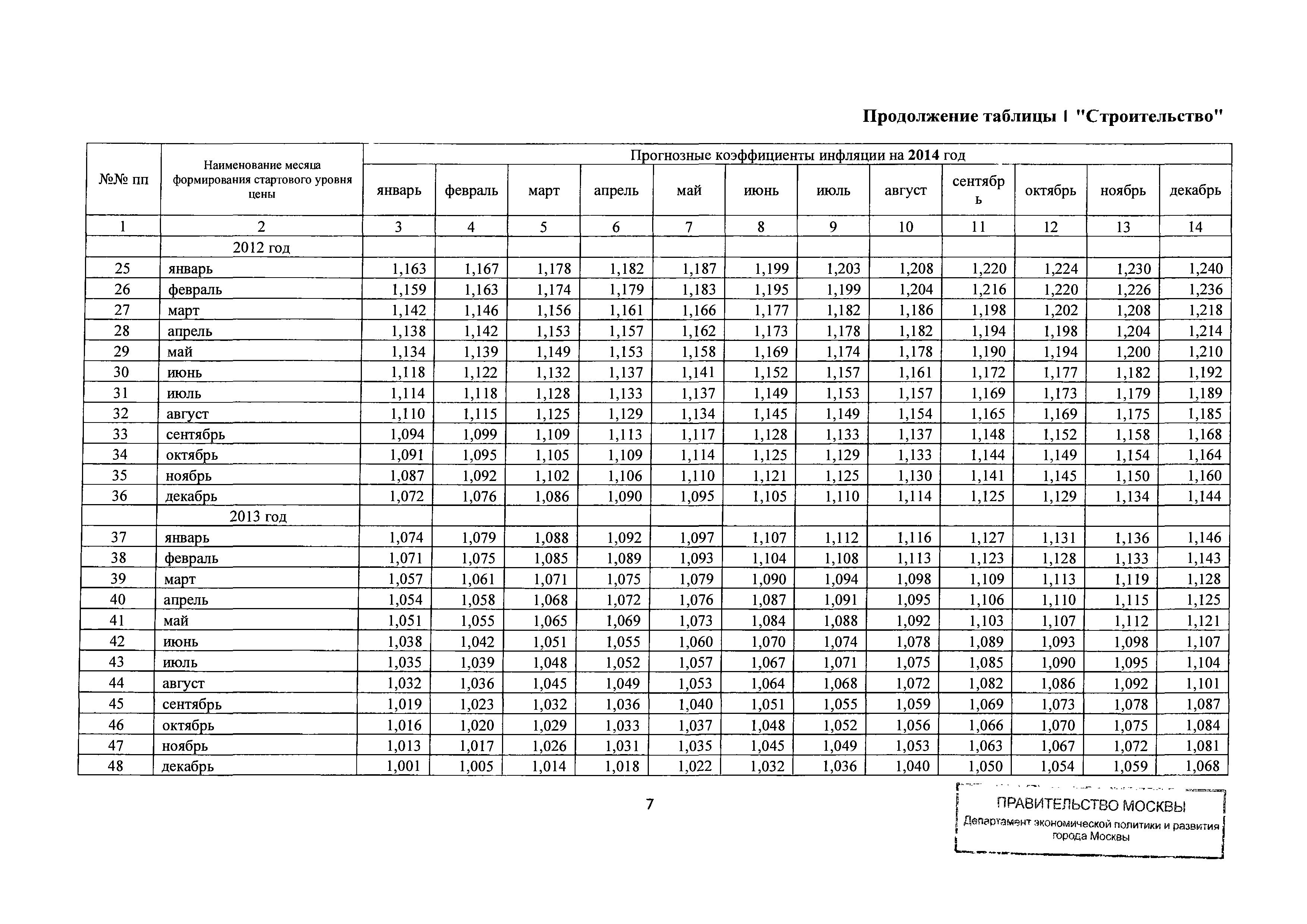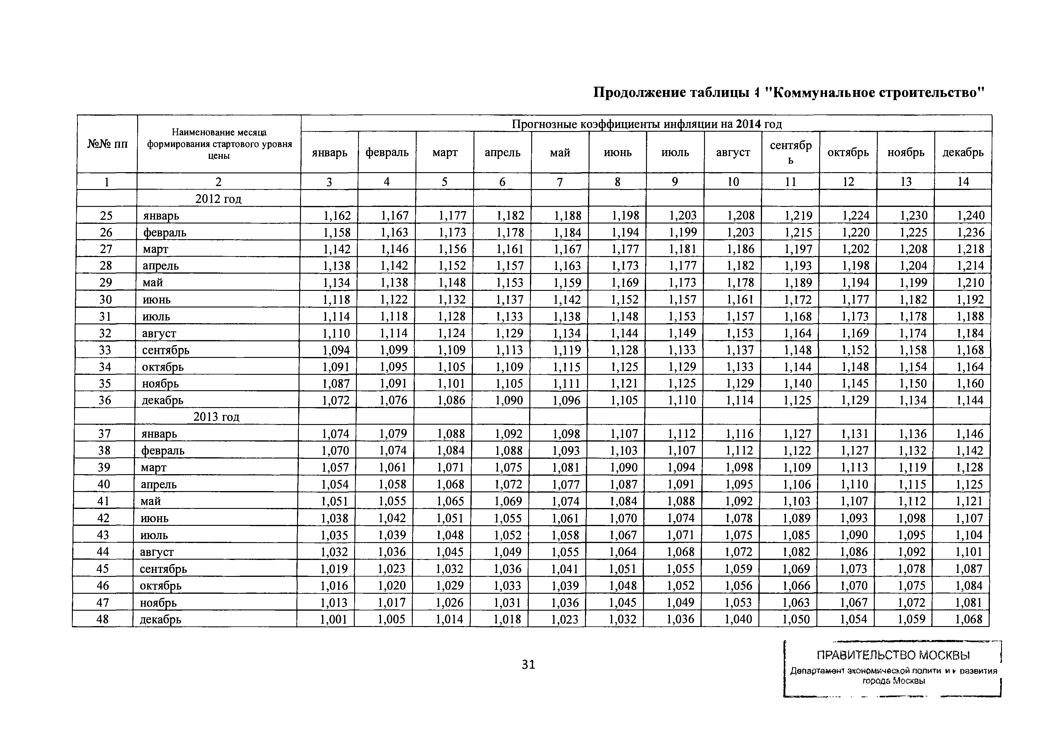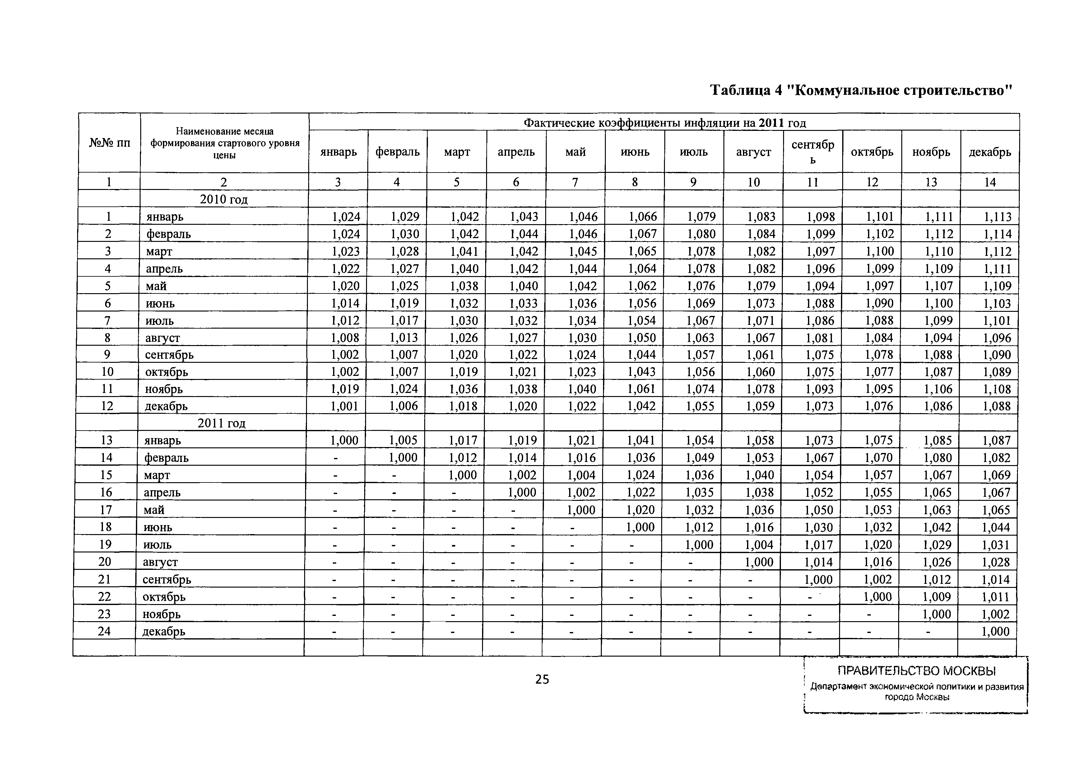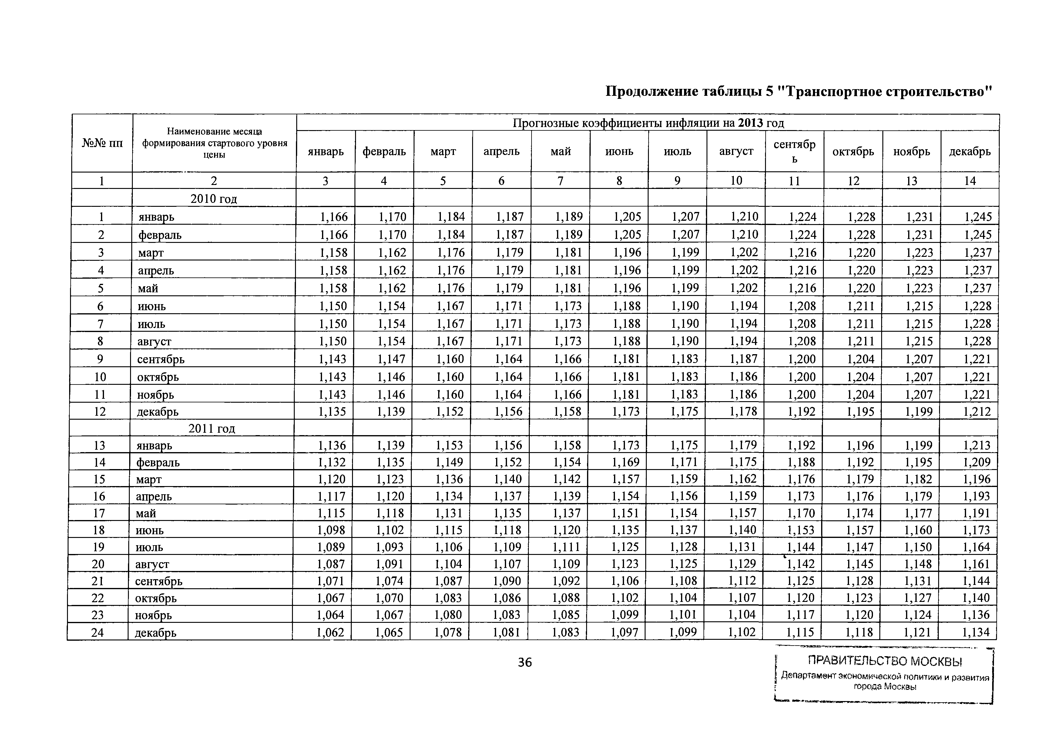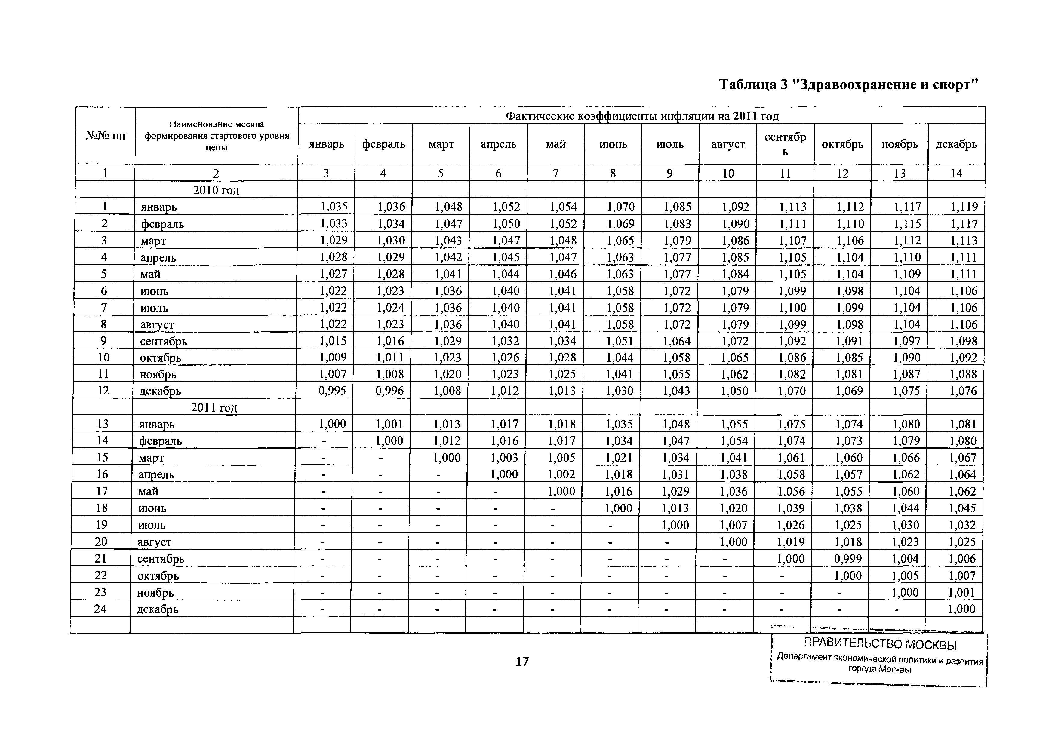 Прогнозные коэффициенты инфляции на 2012 - 2014 годы (с фактическими коэффициентами инфляции за период 2010 - 2011 гг.) для формирования начальной (максимальной) цены государственного контракта, гражданско-правового договора при размещении заказа на выполнение работ по строительству, реконструкции, капитальному ремонту объектов капитального строительства и других строительных работ, выполняемых на объектах, не являющихся объектами капитального строительства, финансируемых с привлечением средств бюджета города Москвы| Статус: | действует | | Название рус.: | Прогнозные коэффициенты инфляции на 2012 - 2014 годы (с фактическими коэффициентами инфляции за период 2010 - 2011 гг.) для формирования начальной (максимальной) цены государственного контракта, гражданско-правового договора при размещении заказа на выполнение работ по строительству, реконструкции, капитальному ремонту объектов капитального строительства и других строительных работ, выполняемых на объектах, не являющихся объектами капитального строительства, финансируемых с привлечением средств бюджета города Москвы | | Дата добавления в базу: | 01.09.2013 | | Дата актуализации: | 01.01.2021 | | Оглавление: | Таблица 1. Строительство Таблица 2. Жилищное строительство Таблица 3. Здравоохранение и спорт Таблица 4. Коммунальное строительство Таблица 5. Транспортное строительство Таблица 6. Образование Таблица 7. Капитальный ремонт | | Утверждён: | 22.02.2012 Департамент экономической политики и развития города Москвы (City of Moscow Department of Economic Policy and Development 3-Р)