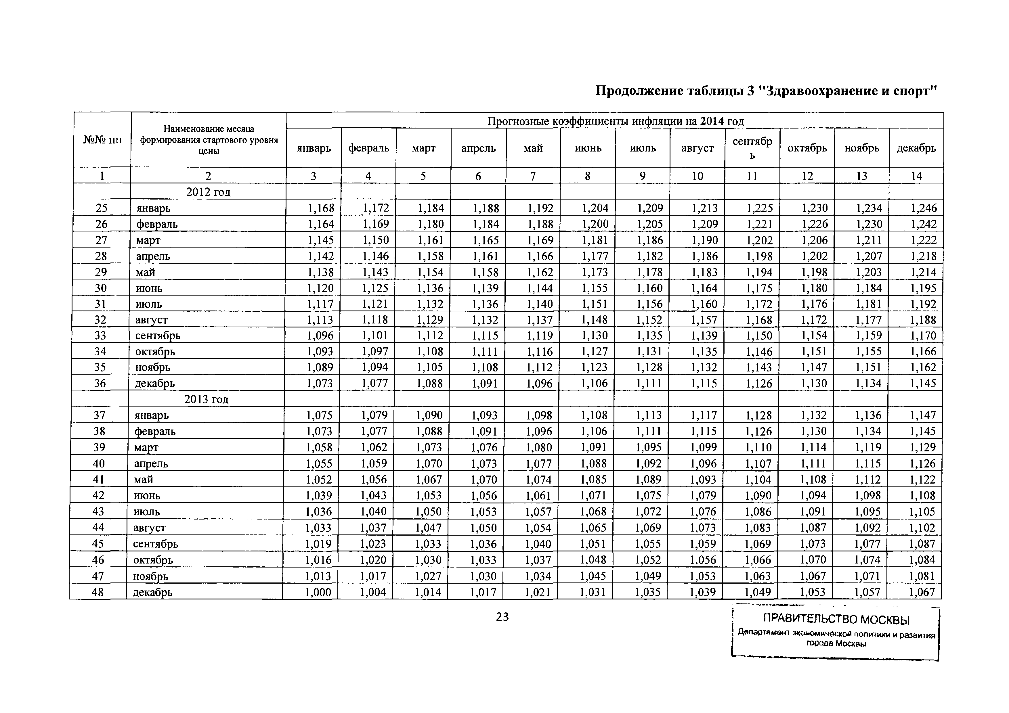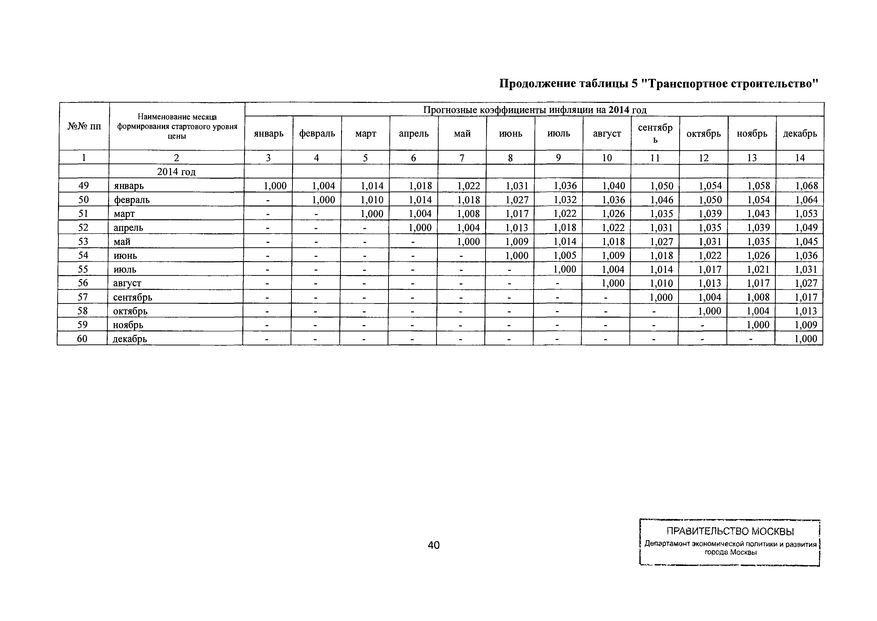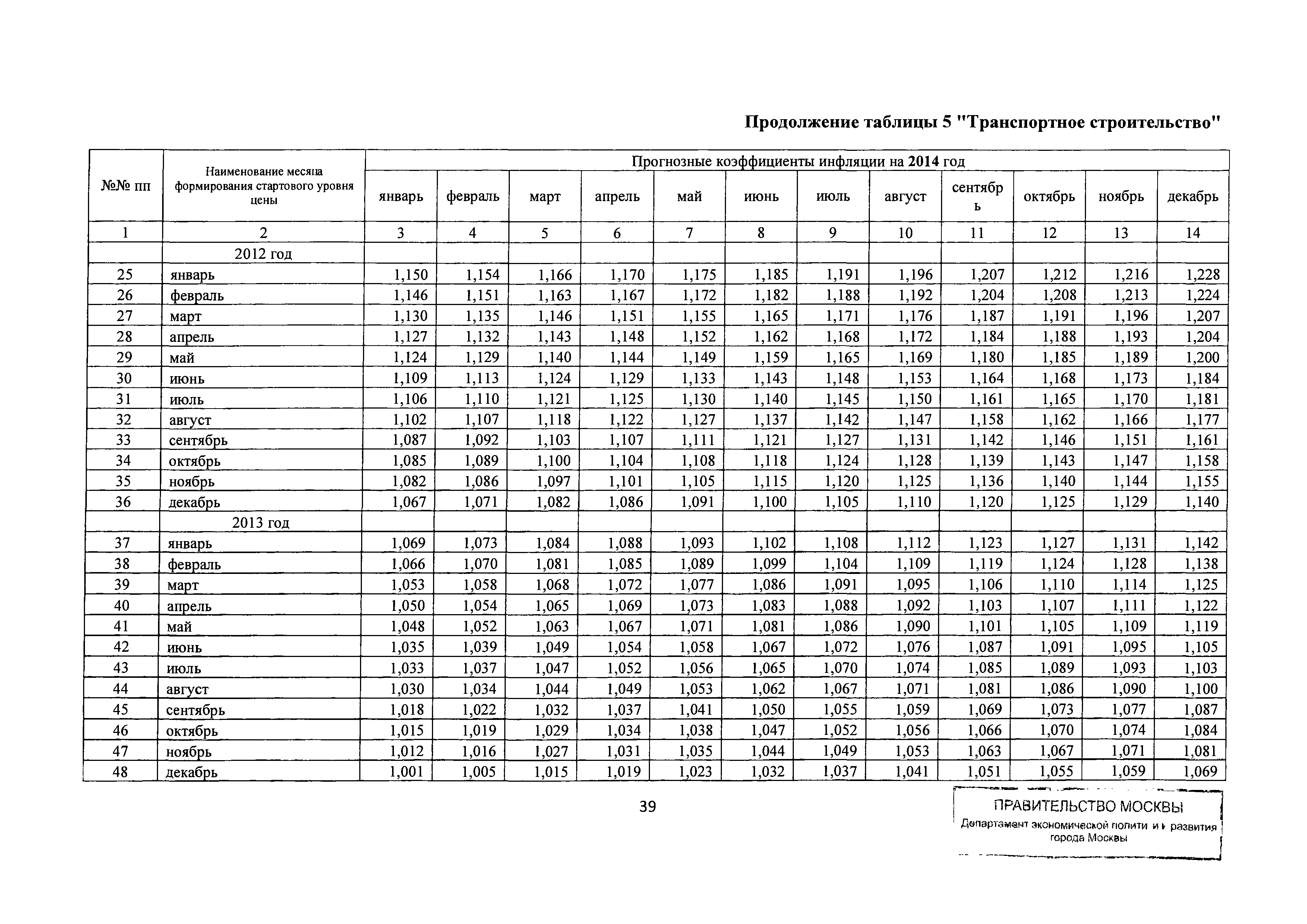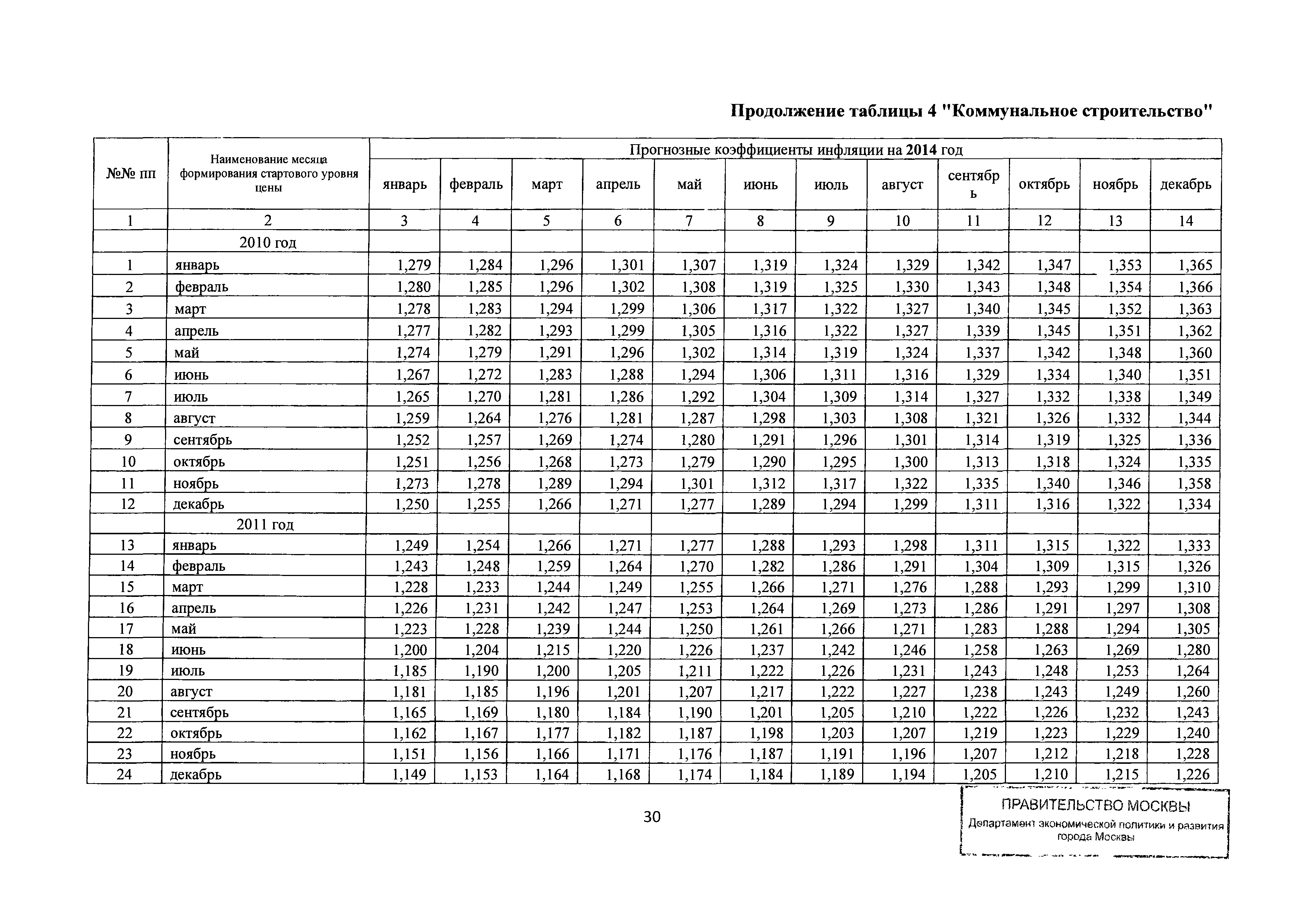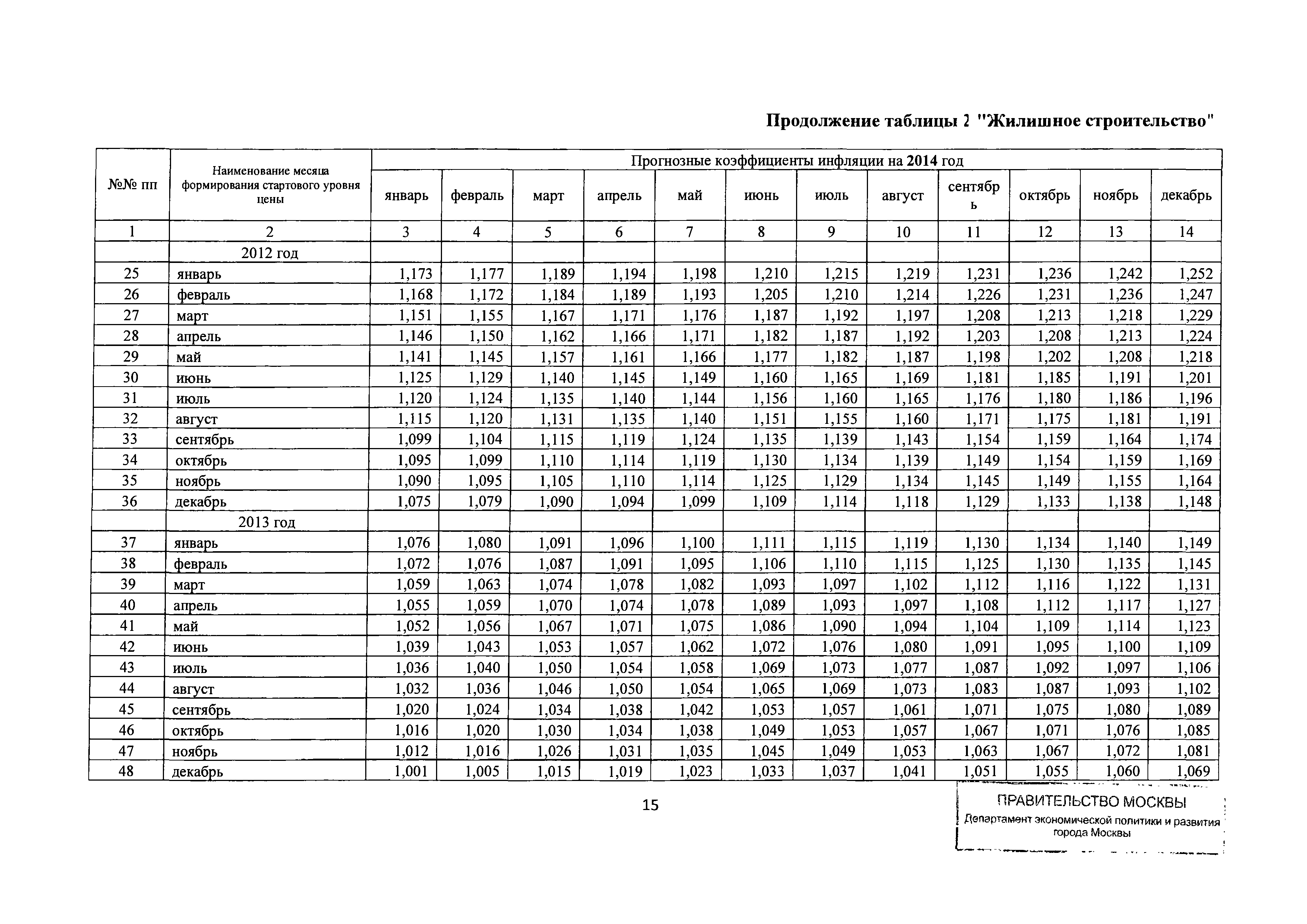 Прогнозные коэффициенты инфляции на 2012 - 2014 годы (с фактическими коэффициентами инфляции за период 2010 - 2011 гг.) для формирования начальной (максимальной) цены государственного контракта, гражданско-правового договора при размещении заказа на выполнение работ по строительству, реконструкции, капитальному ремонту объектов капитального строительства и других строительных работ, выполняемых на объектах, не являющихся объектами капитального строительства, финансируемых с привлечением средств бюджета города Москвы| Статус: | действует | | Название рус.: | Прогнозные коэффициенты инфляции на 2012 - 2014 годы (с фактическими коэффициентами инфляции за период 2010 - 2011 гг.) для формирования начальной (максимальной) цены государственного контракта, гражданско-правового договора при размещении заказа на выполнение работ по строительству, реконструкции, капитальному ремонту объектов капитального строительства и других строительных работ, выполняемых на объектах, не являющихся объектами капитального строительства, финансируемых с привлечением средств бюджета города Москвы | | Дата добавления в базу: | 01.09.2013 | | Дата актуализации: | 01.01.2021 | | Оглавление: | Таблица 1. Строительство Таблица 2. Жилищное строительство Таблица 3. Здравоохранение и спорт Таблица 4. Коммунальное строительство Таблица 5. Транспортное строительство Таблица 6. Образование Таблица 7. Капитальный ремонт | | Утверждён: | 22.02.2012 Департамент экономической политики и развития города Москвы (City of Moscow Department of Economic Policy and Development 3-Р)