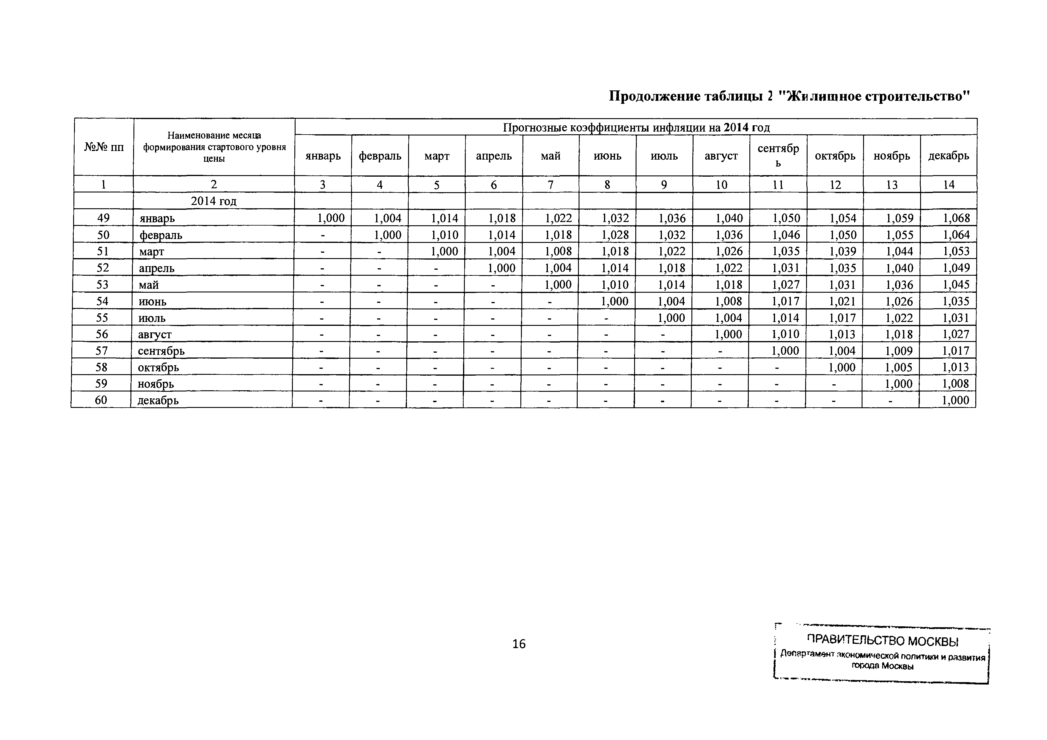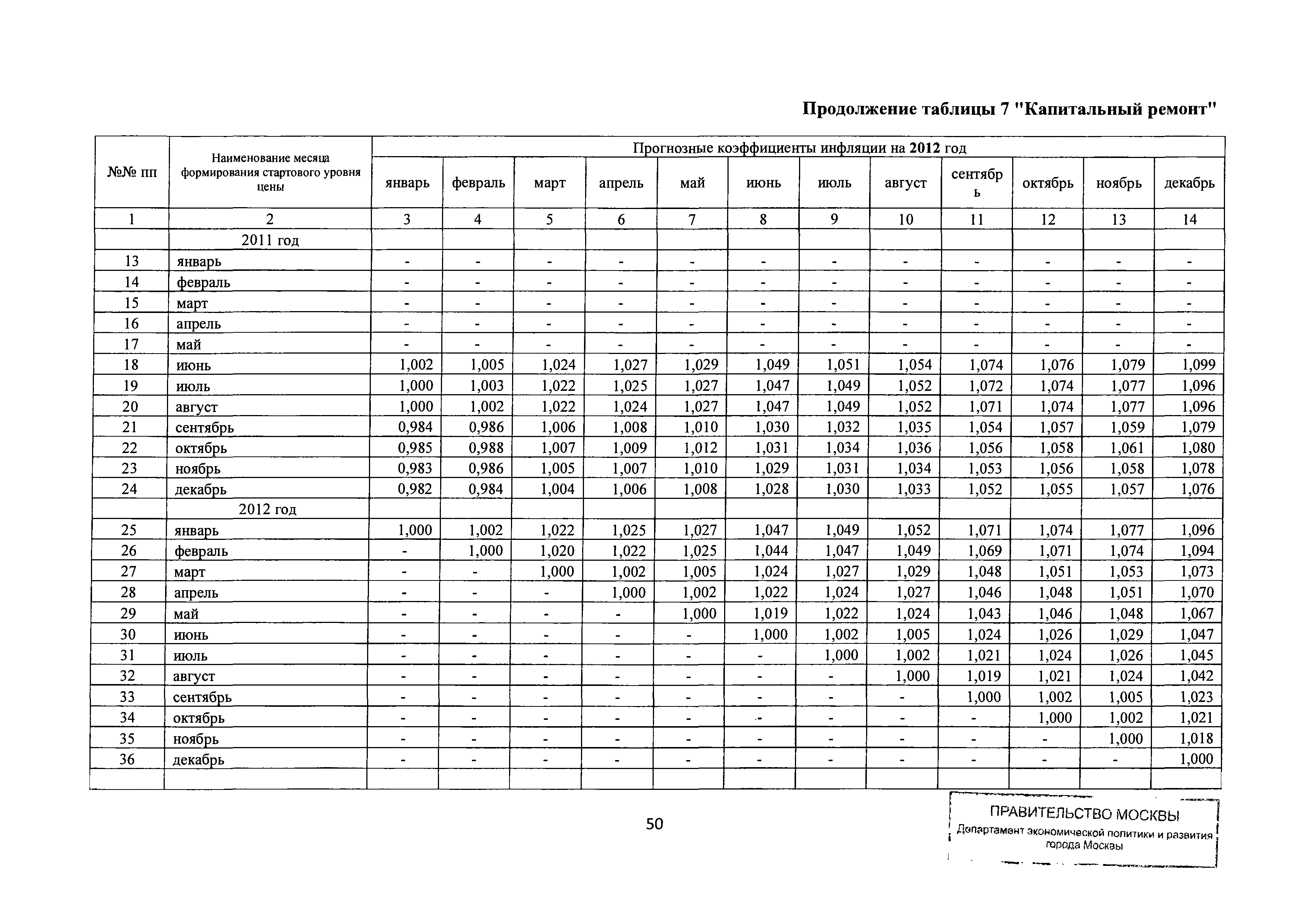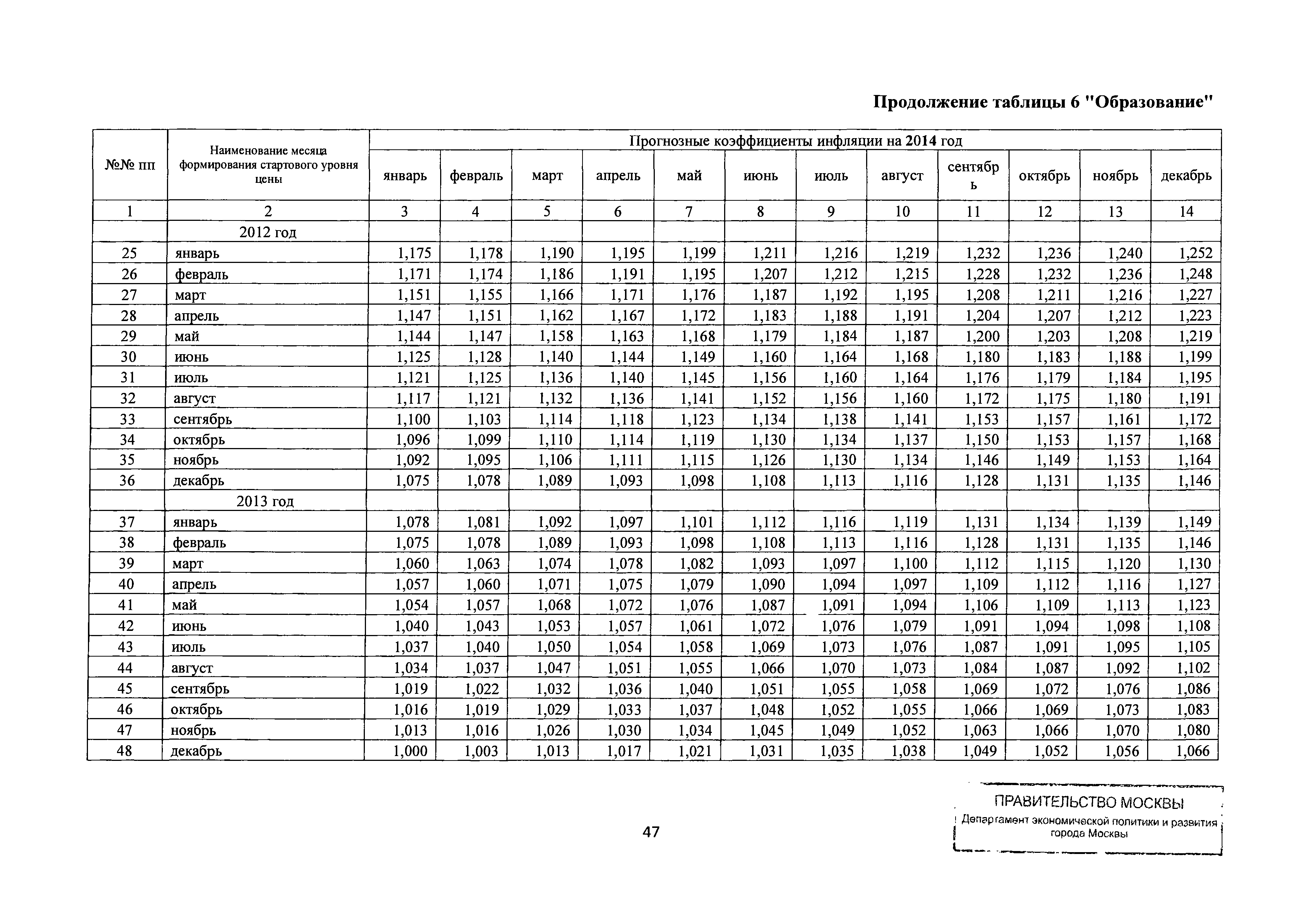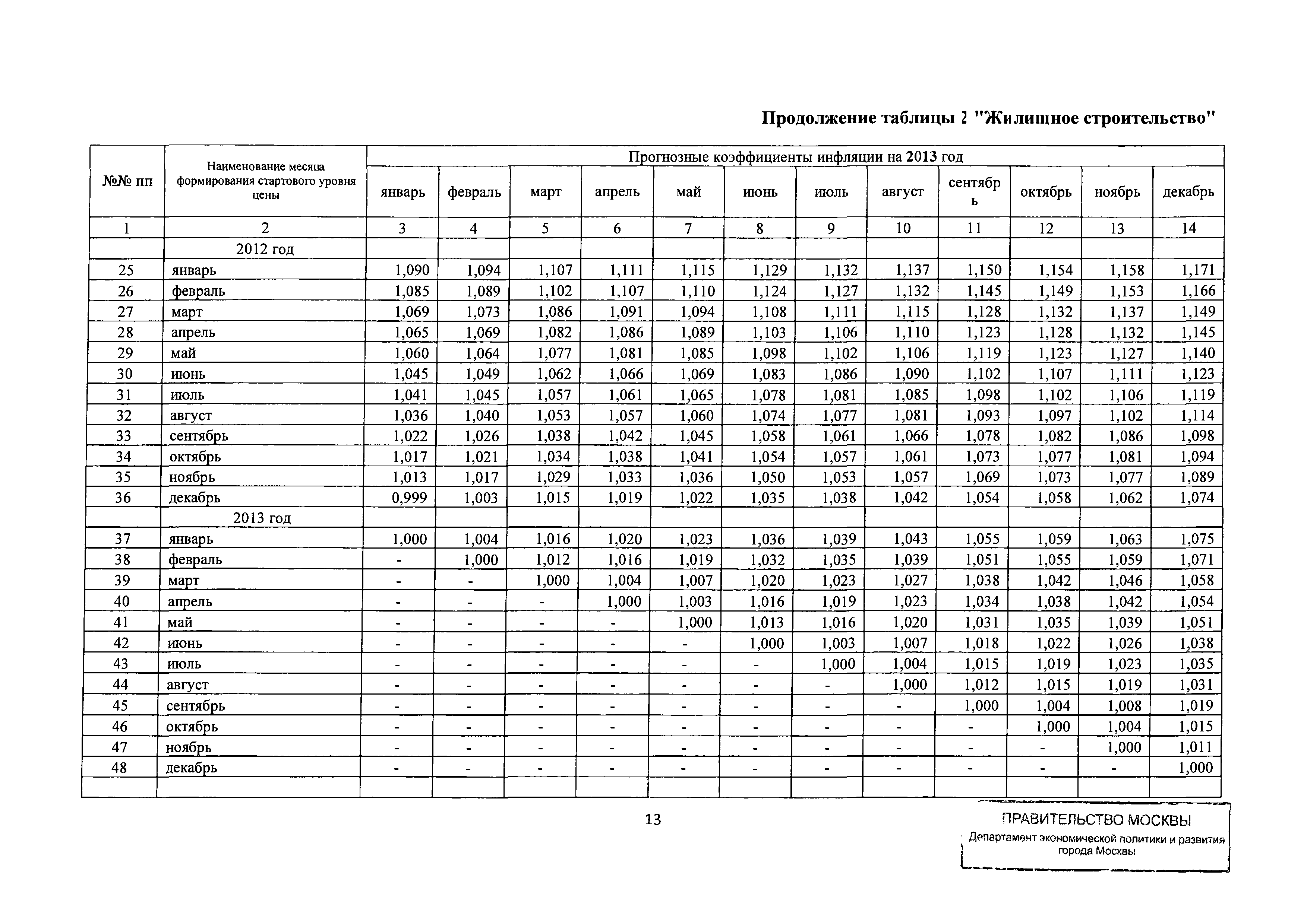 Прогнозные коэффициенты инфляции на 2012 - 2014 годы (с фактическими коэффициентами инфляции за период 2010 - 2011 гг.) для формирования начальной (максимальной) цены государственного контракта, гражданско-правового договора при размещении заказа на выполнение работ по строительству, реконструкции, капитальному ремонту объектов капитального строительства и других строительных работ, выполняемых на объектах, не являющихся объектами капитального строительства, финансируемых с привлечением средств бюджета города Москвы| Статус: | действует | | Название рус.: | Прогнозные коэффициенты инфляции на 2012 - 2014 годы (с фактическими коэффициентами инфляции за период 2010 - 2011 гг.) для формирования начальной (максимальной) цены государственного контракта, гражданско-правового договора при размещении заказа на выполнение работ по строительству, реконструкции, капитальному ремонту объектов капитального строительства и других строительных работ, выполняемых на объектах, не являющихся объектами капитального строительства, финансируемых с привлечением средств бюджета города Москвы | | Дата добавления в базу: | 01.09.2013 | | Дата актуализации: | 01.01.2021 | | Оглавление: | Таблица 1. Строительство Таблица 2. Жилищное строительство Таблица 3. Здравоохранение и спорт Таблица 4. Коммунальное строительство Таблица 5. Транспортное строительство Таблица 6. Образование Таблица 7. Капитальный ремонт | | Утверждён: | 22.02.2012 Департамент экономической политики и развития города Москвы (City of Moscow Department of Economic Policy and Development 3-Р)