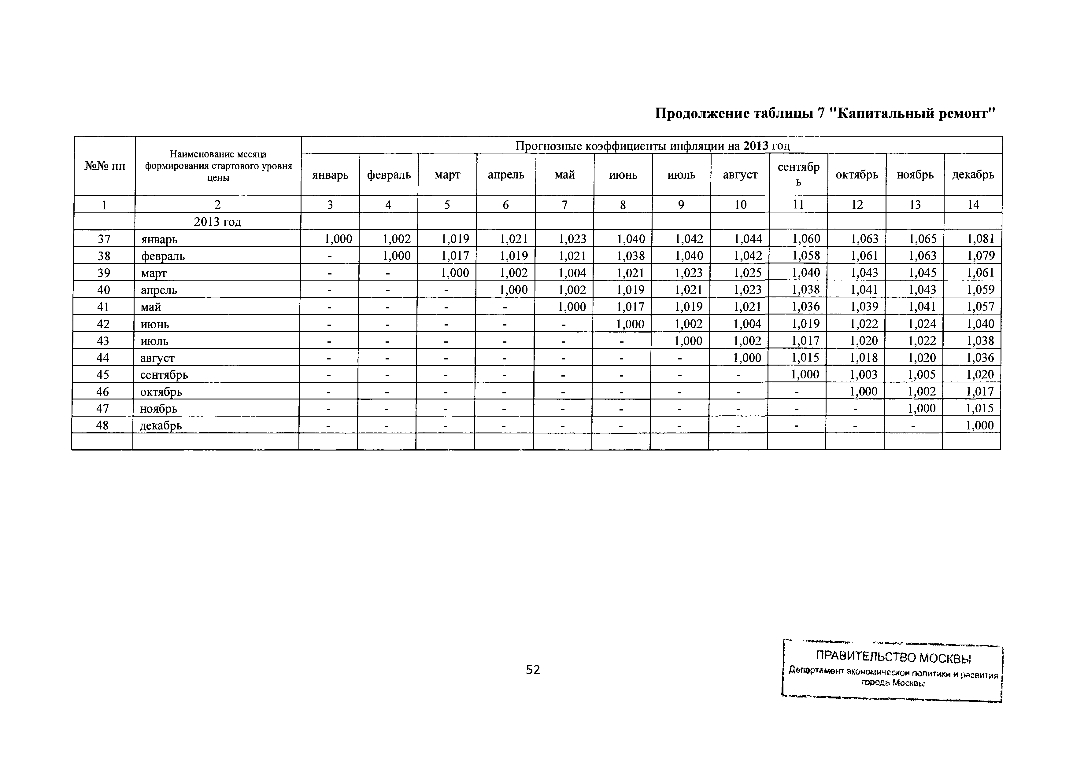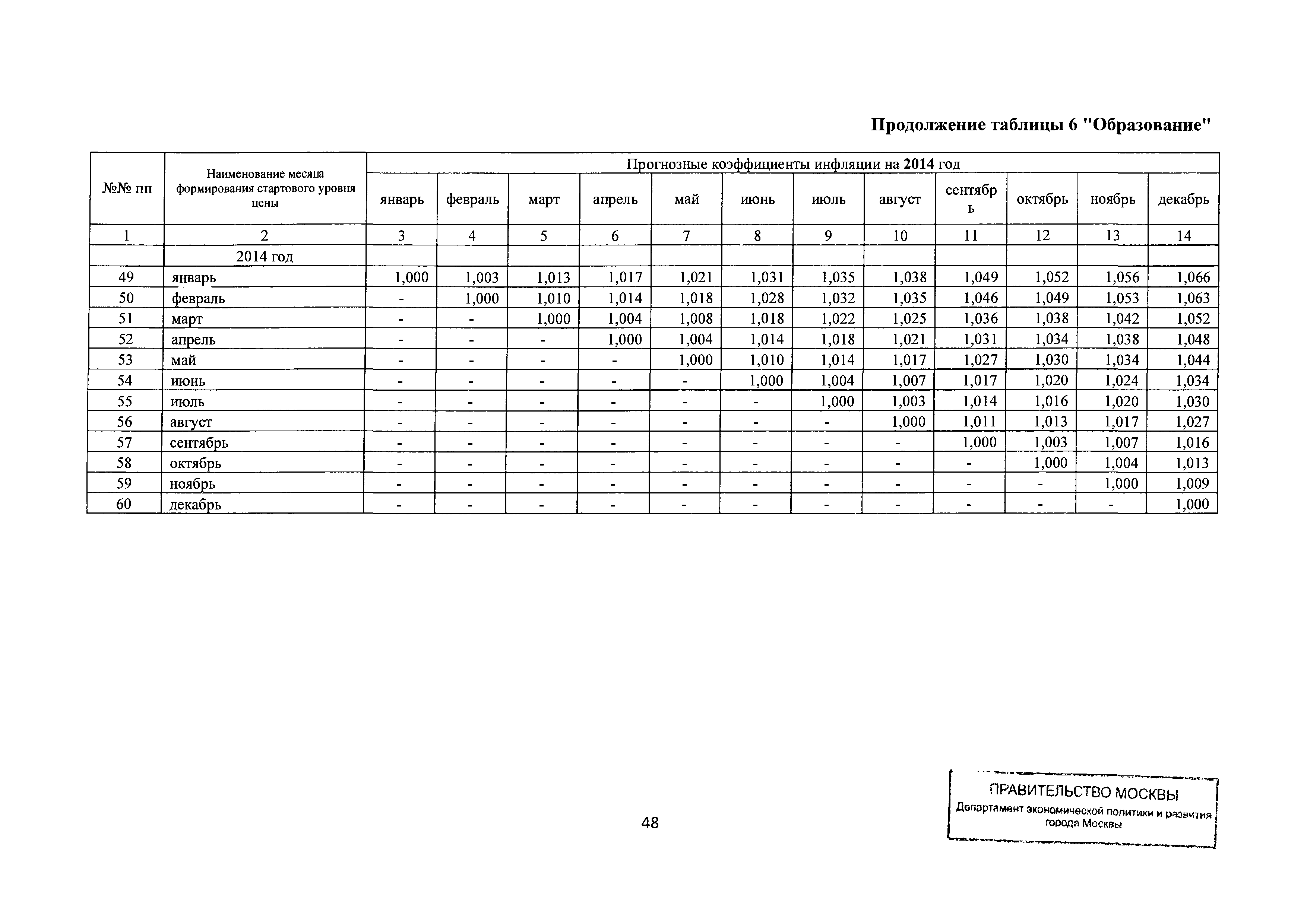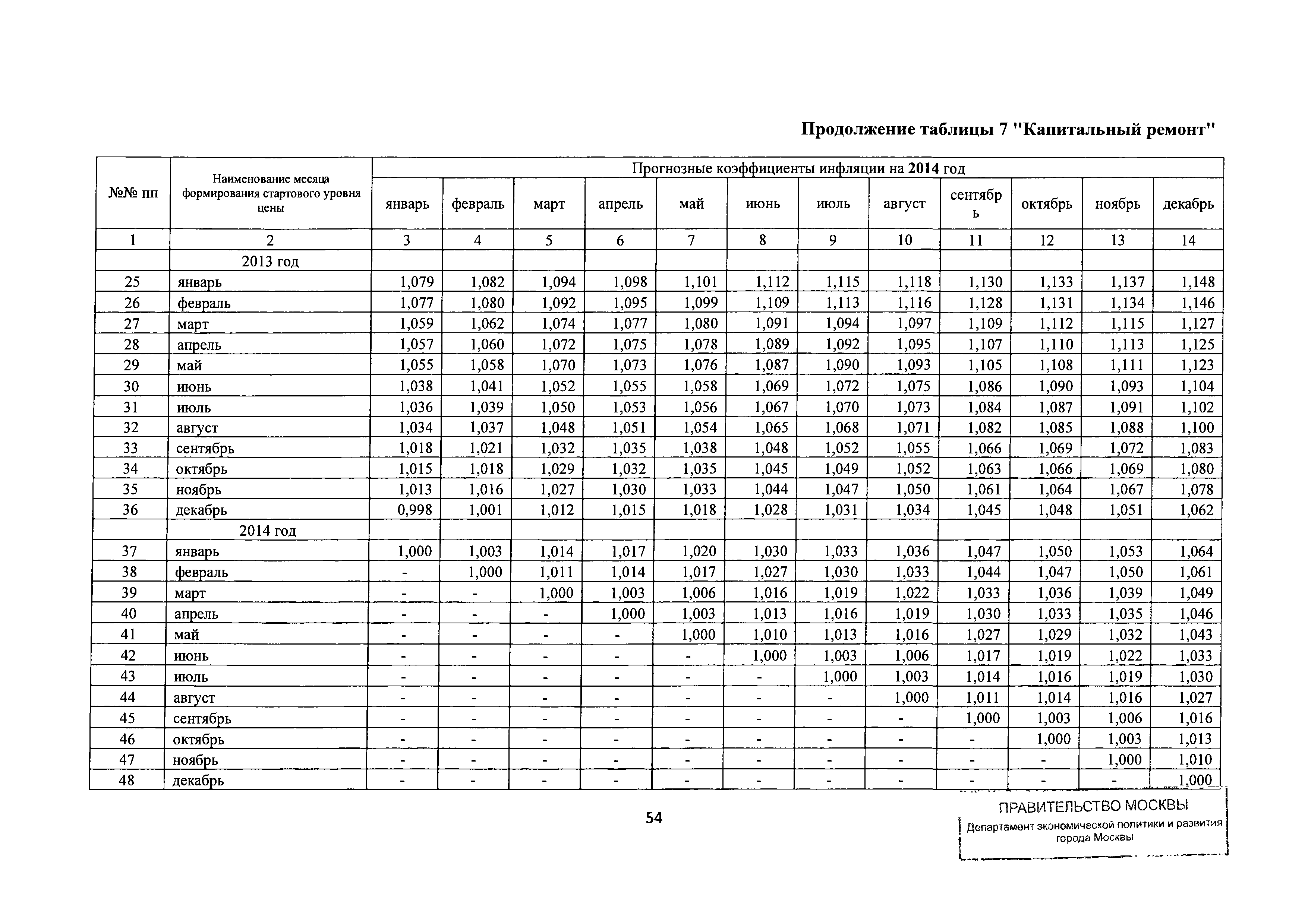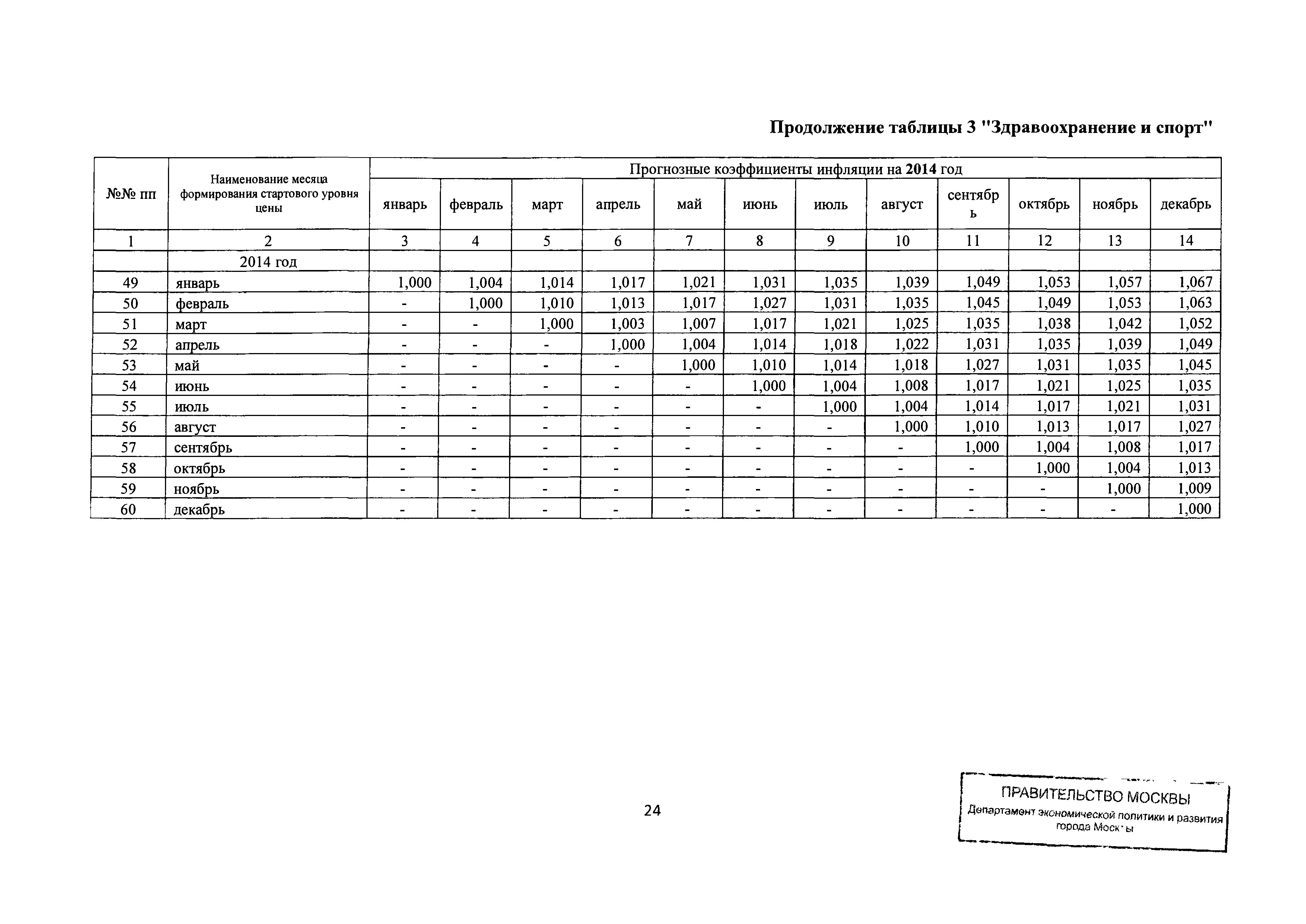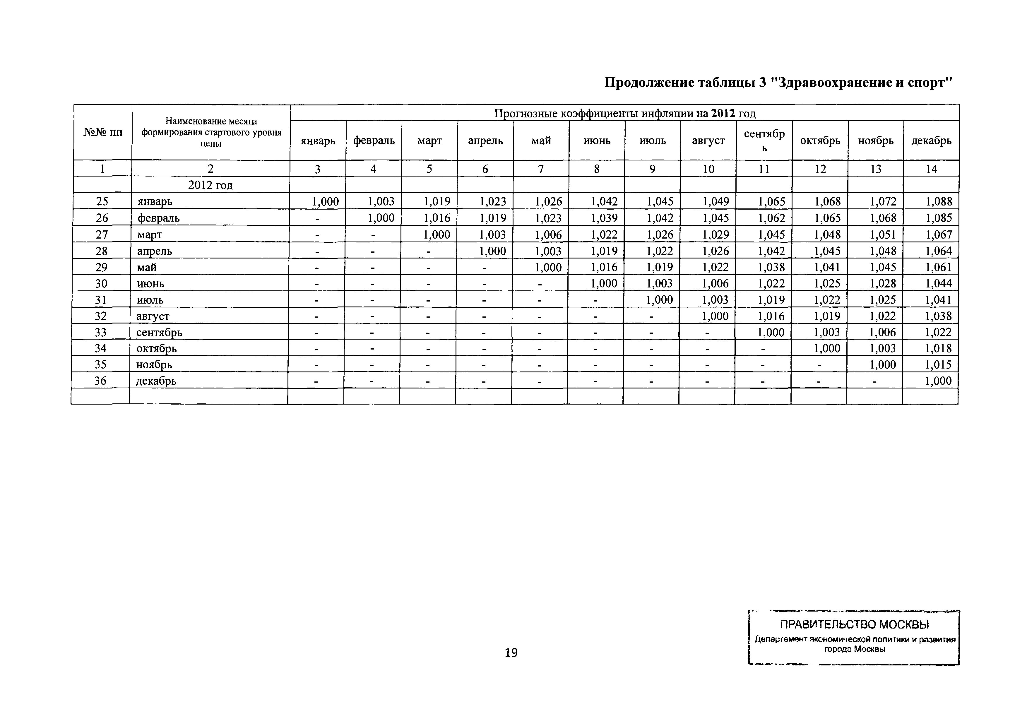 Прогнозные коэффициенты инфляции на 2012 - 2014 годы (с фактическими коэффициентами инфляции за период 2010 - 2011 гг.) для формирования начальной (максимальной) цены государственного контракта, гражданско-правового договора при размещении заказа на выполнение работ по строительству, реконструкции, капитальному ремонту объектов капитального строительства и других строительных работ, выполняемых на объектах, не являющихся объектами капитального строительства, финансируемых с привлечением средств бюджета города Москвы| Статус: | действует | | Название рус.: | Прогнозные коэффициенты инфляции на 2012 - 2014 годы (с фактическими коэффициентами инфляции за период 2010 - 2011 гг.) для формирования начальной (максимальной) цены государственного контракта, гражданско-правового договора при размещении заказа на выполнение работ по строительству, реконструкции, капитальному ремонту объектов капитального строительства и других строительных работ, выполняемых на объектах, не являющихся объектами капитального строительства, финансируемых с привлечением средств бюджета города Москвы | | Дата добавления в базу: | 01.09.2013 | | Дата актуализации: | 01.01.2021 | | Оглавление: | Таблица 1. Строительство Таблица 2. Жилищное строительство Таблица 3. Здравоохранение и спорт Таблица 4. Коммунальное строительство Таблица 5. Транспортное строительство Таблица 6. Образование Таблица 7. Капитальный ремонт | | Утверждён: | 22.02.2012 Департамент экономической политики и развития города Москвы (City of Moscow Department of Economic Policy and Development 3-Р)