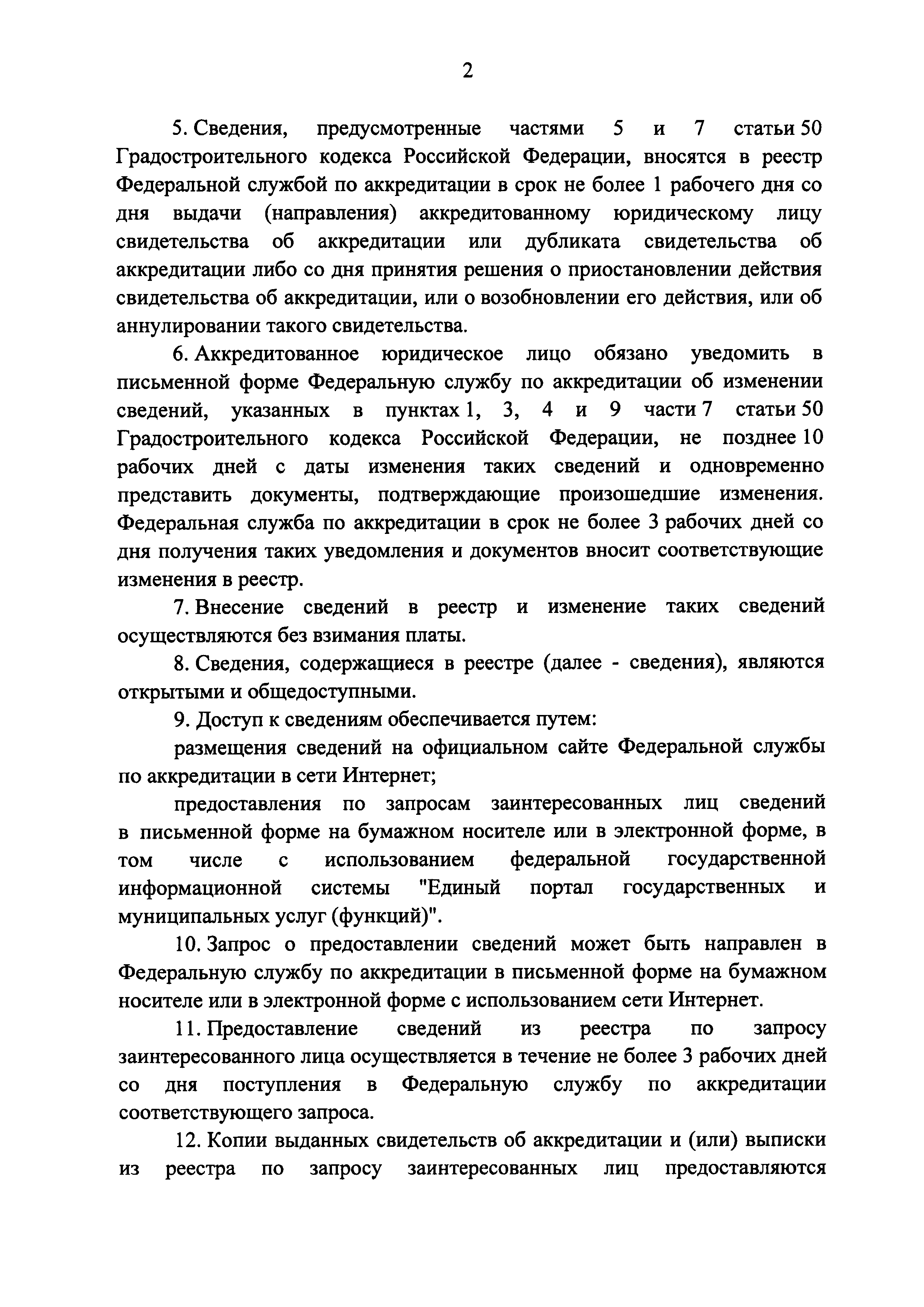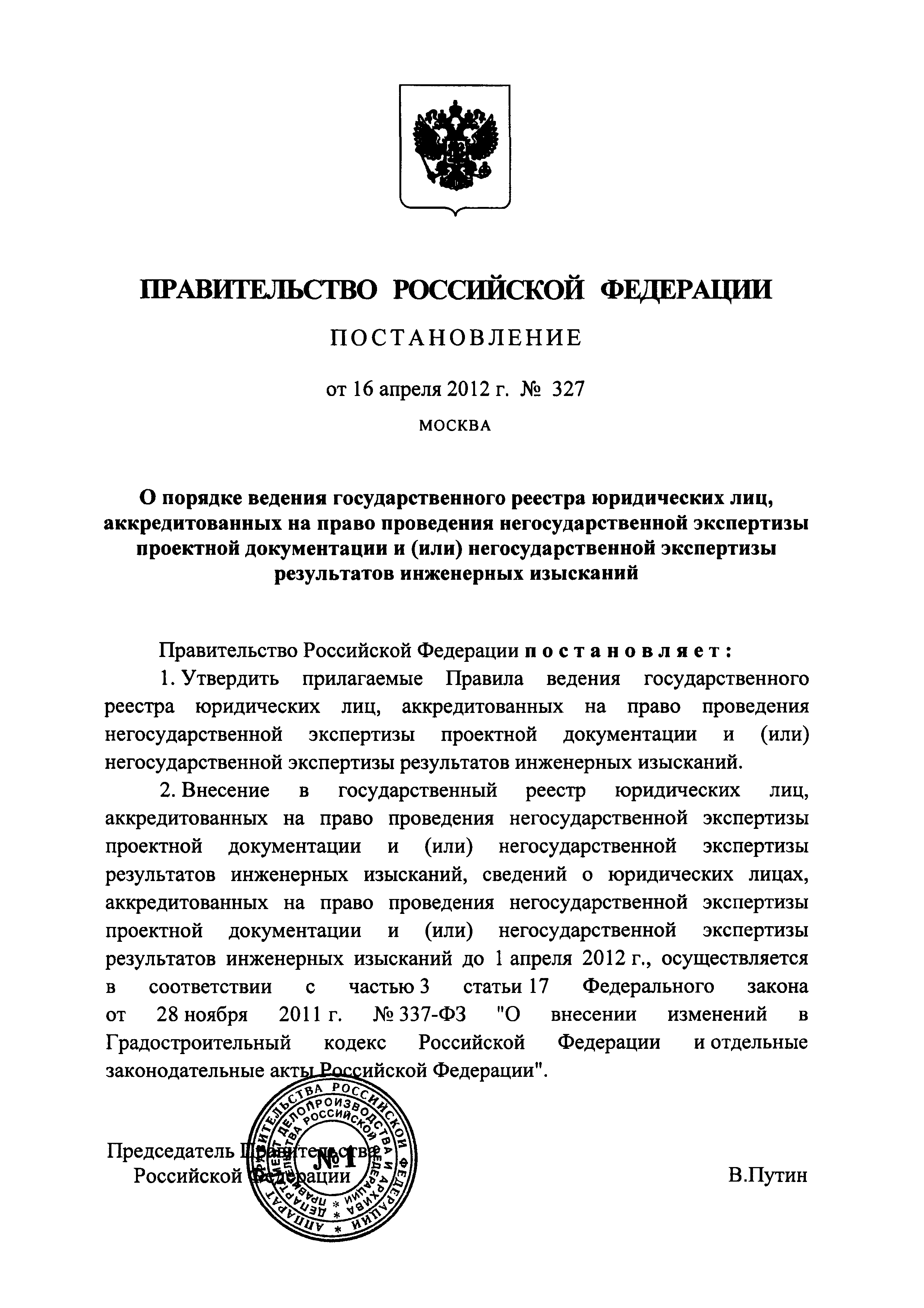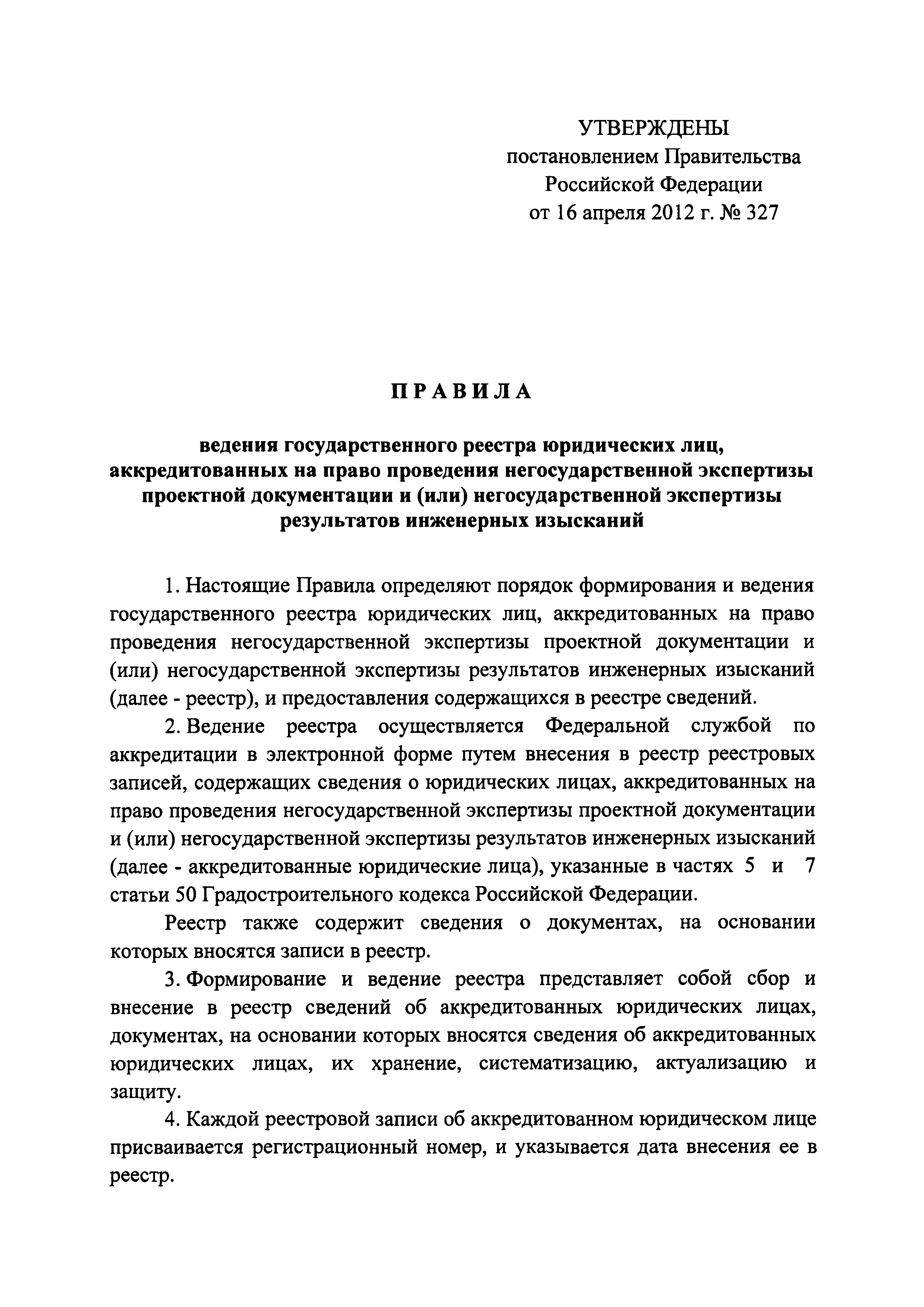 Правила ведения государственного реестра юридических лиц, аккредитованных на право проведения негосударственной экспертизы проектной документации и (или) негосударственной экспертизы результатов инженерных изысканий| Статус: | действует | | Название рус.: | Правила ведения государственного реестра юридических лиц, аккредитованных на право проведения негосударственной экспертизы проектной документации и (или) негосударственной экспертизы результатов инженерных изысканий | | Дата добавления в базу: | 01.09.2013 | | Дата актуализации: | 01.01.2021 | | Дата введения: | 01.05.2012 | | Область применения: | Правила определяют порядок формирования и ведения государственного реестра юридических лиц, аккредитованных на право проведения негосударственной экспертизы проектной документации и (или) негосударственной экспертизы результатов инженерных изысканий, и предоставления содержащихся в реестре сведений. | | Утверждён: | 16.04.2012 Правительство Российской Федерации (327)