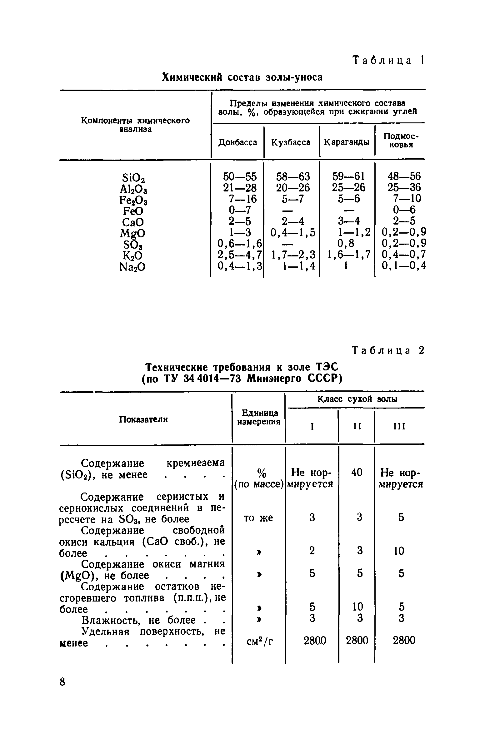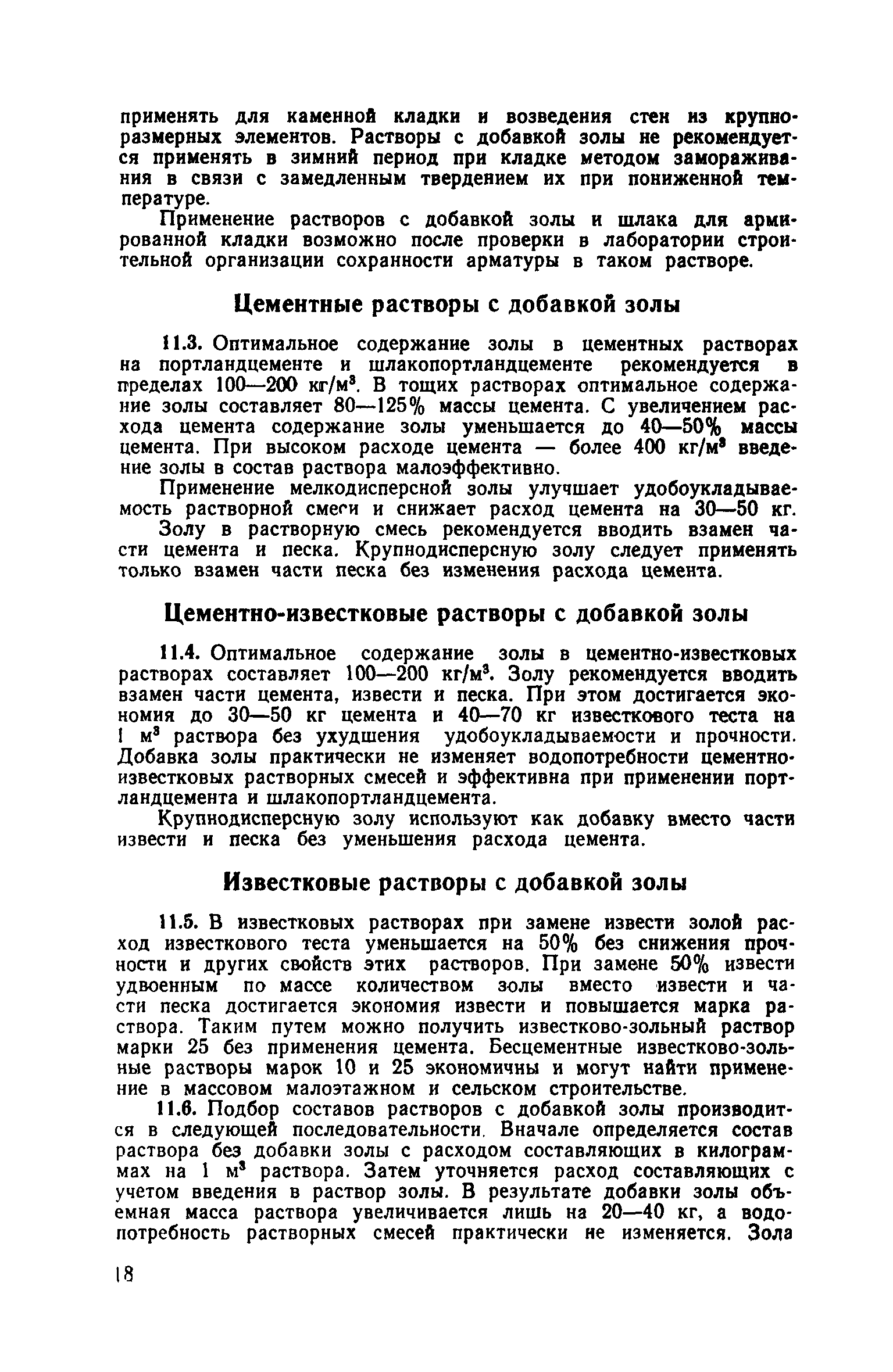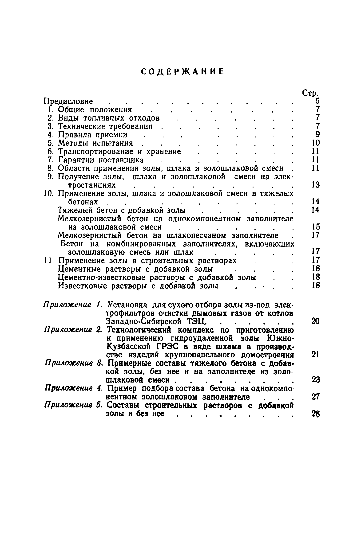 | Оглавление: | Предисловие 1. Общие положения 2. Виды топливных отходов 3. Технические требования 4. Правила приемки 5. Методы испытания 6. Транспортирование и хранение 7. Гарантии поставщика 8. Области применения золы, шлака и золошлаковой смеси 9. Получение золы, шлака и золошлаковой смеси на электростанциях 10. Применение золы, шлака и золошлаковой смеси в тяжелых бетонах Тяжелый бетон с добавкой золы Мелкозернистый бетон на однокомпонентном заполнителе из золошлаковой смеси Мелкозернистый бетон на шлакопесчаном заполнителе Бетон на комбинированных заполнителях, включающих золошлаковую смесь или шлак 11. Применение золы в строительных растворах Цементные растворы с добавкой золы Цементно-известковые растворы с добавкой золы Известковые растворы с добавкой золы Приложение 1. Установка для сухого отбора золы из-под электрофильтров очистки дымовых газов от котлов Западно-Сибирской ТЭЦ Приложение 2. Технологический комплекс по приготовлению и применению гидроудаленной золы Южно-Кузбасской ГРЭС в виде шлама в производстве изделий крупнопанельного домостроения Приложение 3. Примерные составы тяжелого бетона с добавкой золы, без нее и на заполнителе из золошлаковой смеси Приложение 4. Пример подбора состава бетона на однокомпонентном золошлаковом заполнителе Приложение 5. Составы строительных растворов с добавкой золы и без нее |