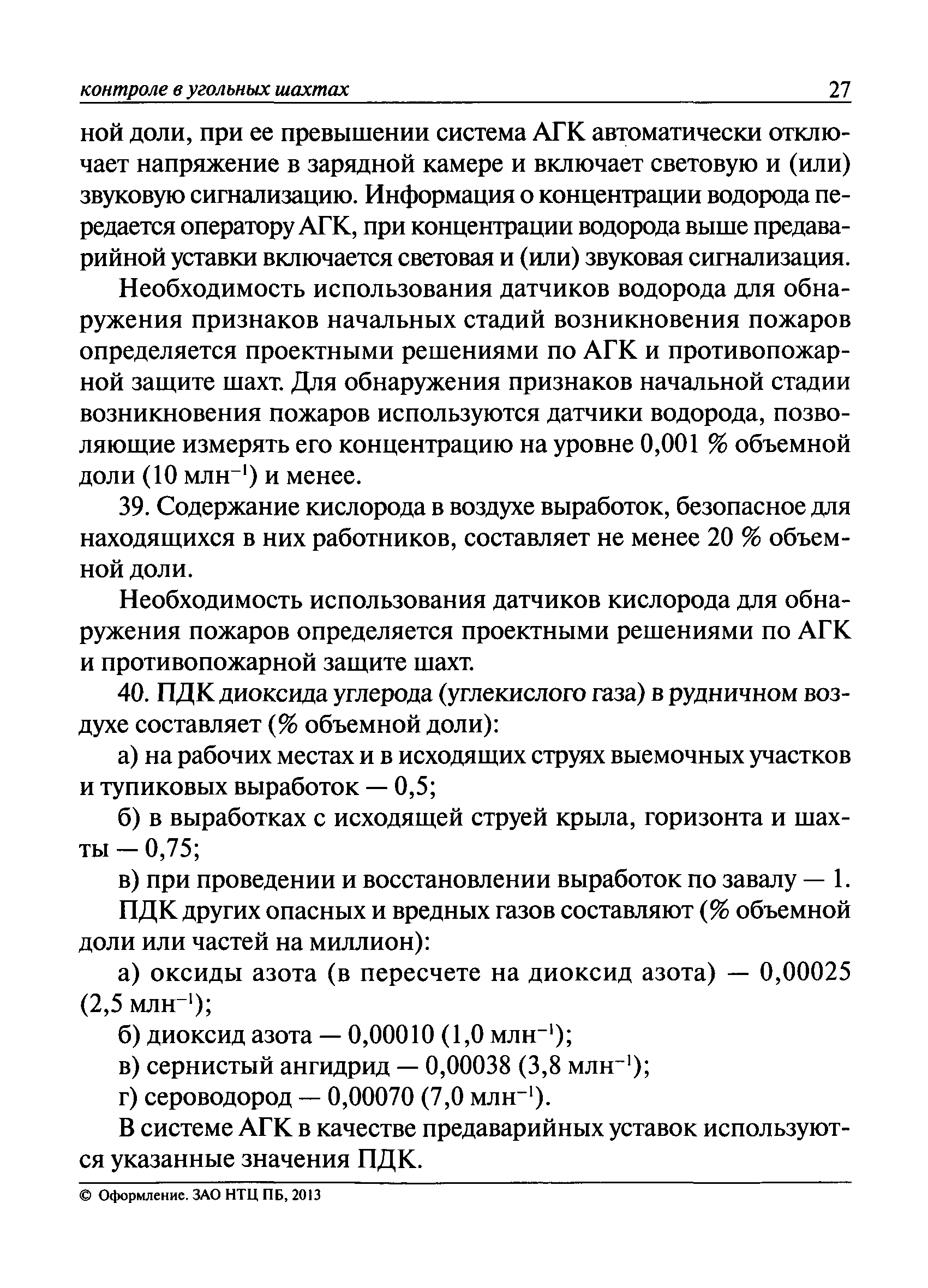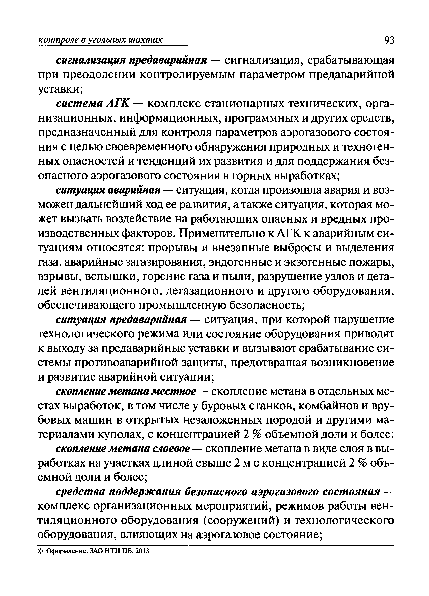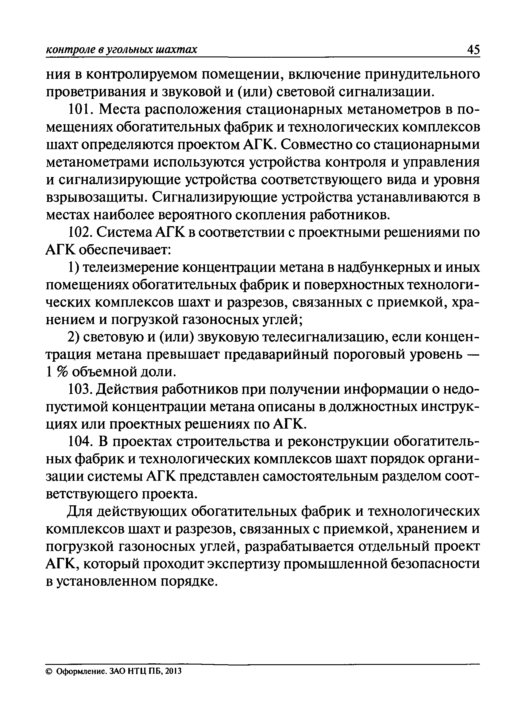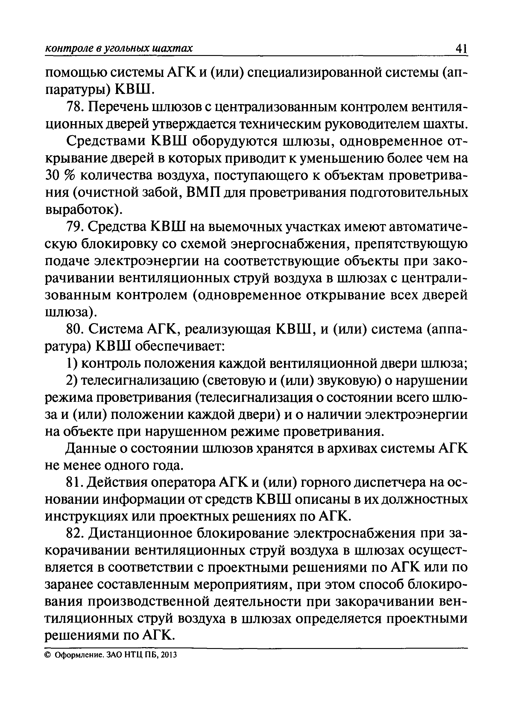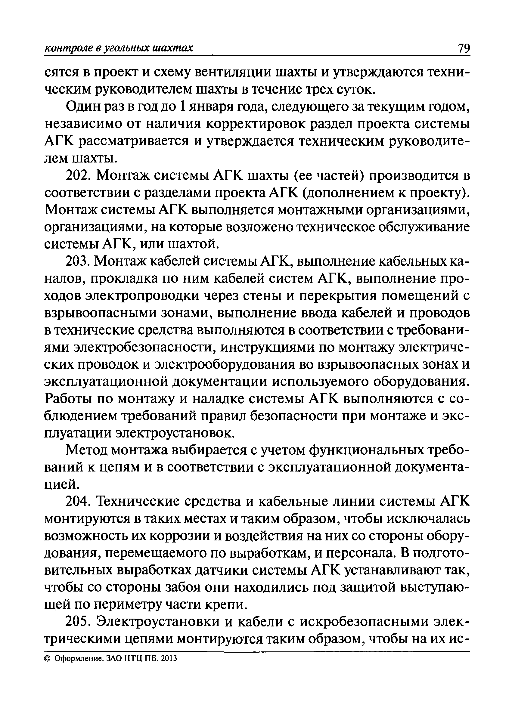| Оглавление: | I. Общие положения II. Назначение, область применения и состав системы АГК III. Контроль метана IV. Контроль оксида углерода, опасных и вредных газов и кислорода V. Контроль пыли VI. Контроль расхода воздуха VII. Контроль и управление установками и оборудованием для поддержания безопасного аэрогазового режима VIII. Контроль параметров рудничной атмосферы в целях обнаружения подземных пожаров IX. Техническое обеспечение системы АГК X. Информационное, математическое и программное обеспечение системы АГК XI. Метрологическое обеспечение системы АГК XII. Организационное обеспечение системы АГК XIII. Проектирование, монтаж и сдача в эксплуатацию системы АГК XIV. Эксплуатация и обслуживание системы АГК Приложение № 1. Термины и их определения Приложение № 2. Методики расчета расхода воздуха и выделяемого объема оксида углерода Приложение № 3. Методика определения фона индикаторных газов Приложение № 4. Журнал эксплуатации и обслуживания системы АГК Приложение № 5. Журнал оператора АГК Приложение № 6. Акт сдачи-приемки в эксплуатацию системы АГК Приложение № 7. Методика приготовления метановоздушных смесей для проверки датчиков метана Приложение № 8. Журнал плановой проверки системы АГК |