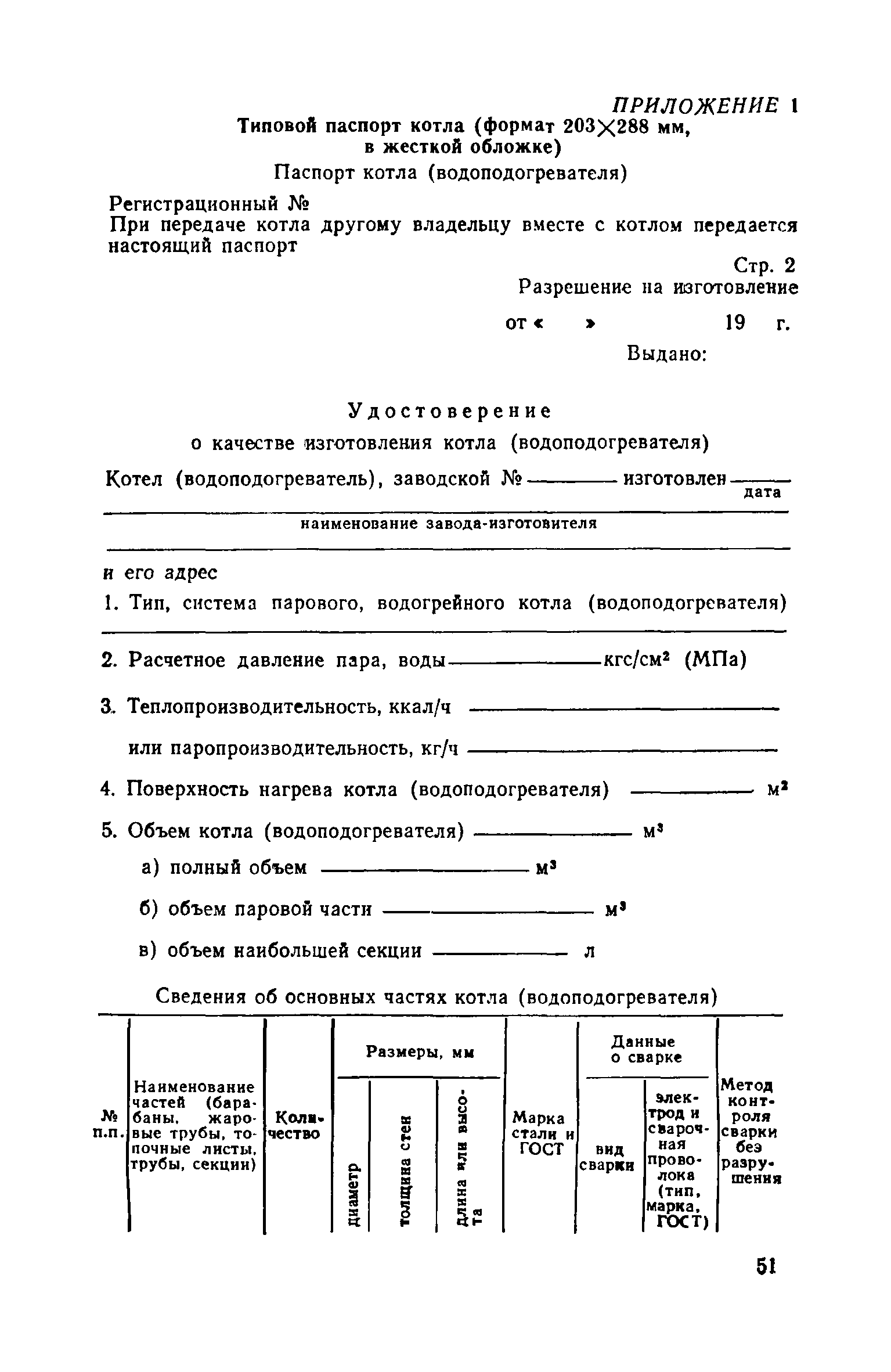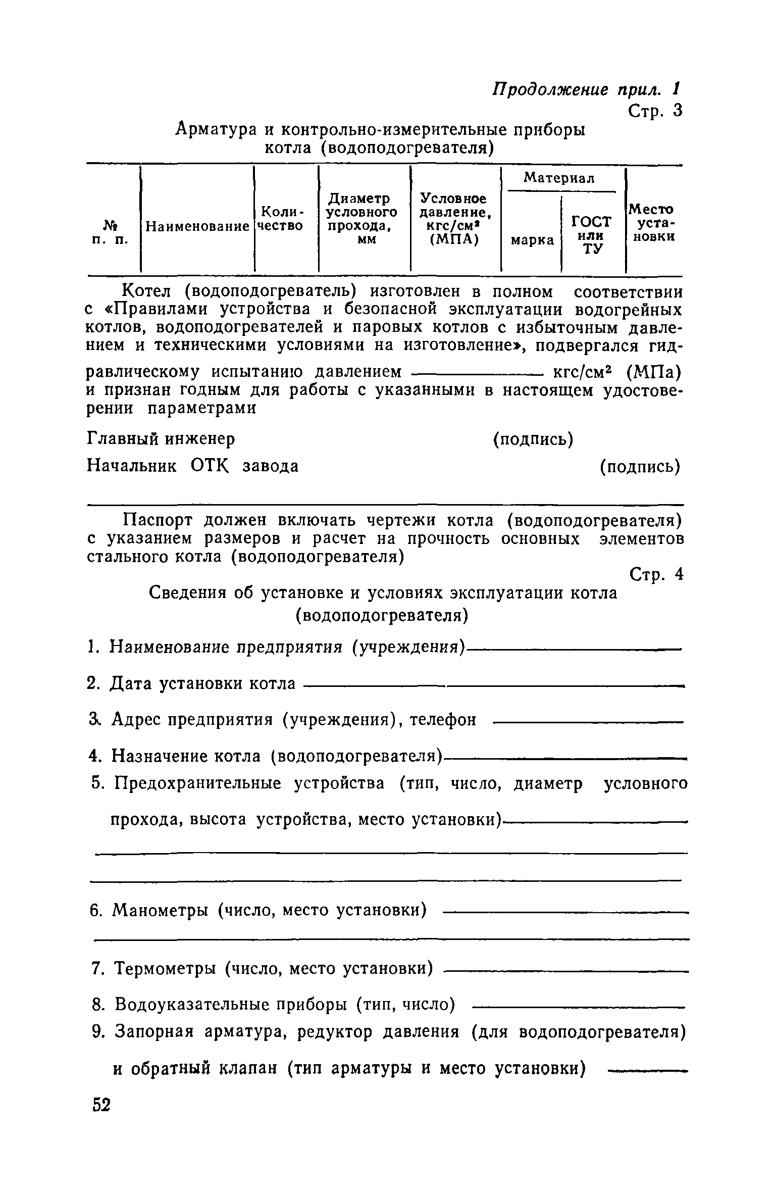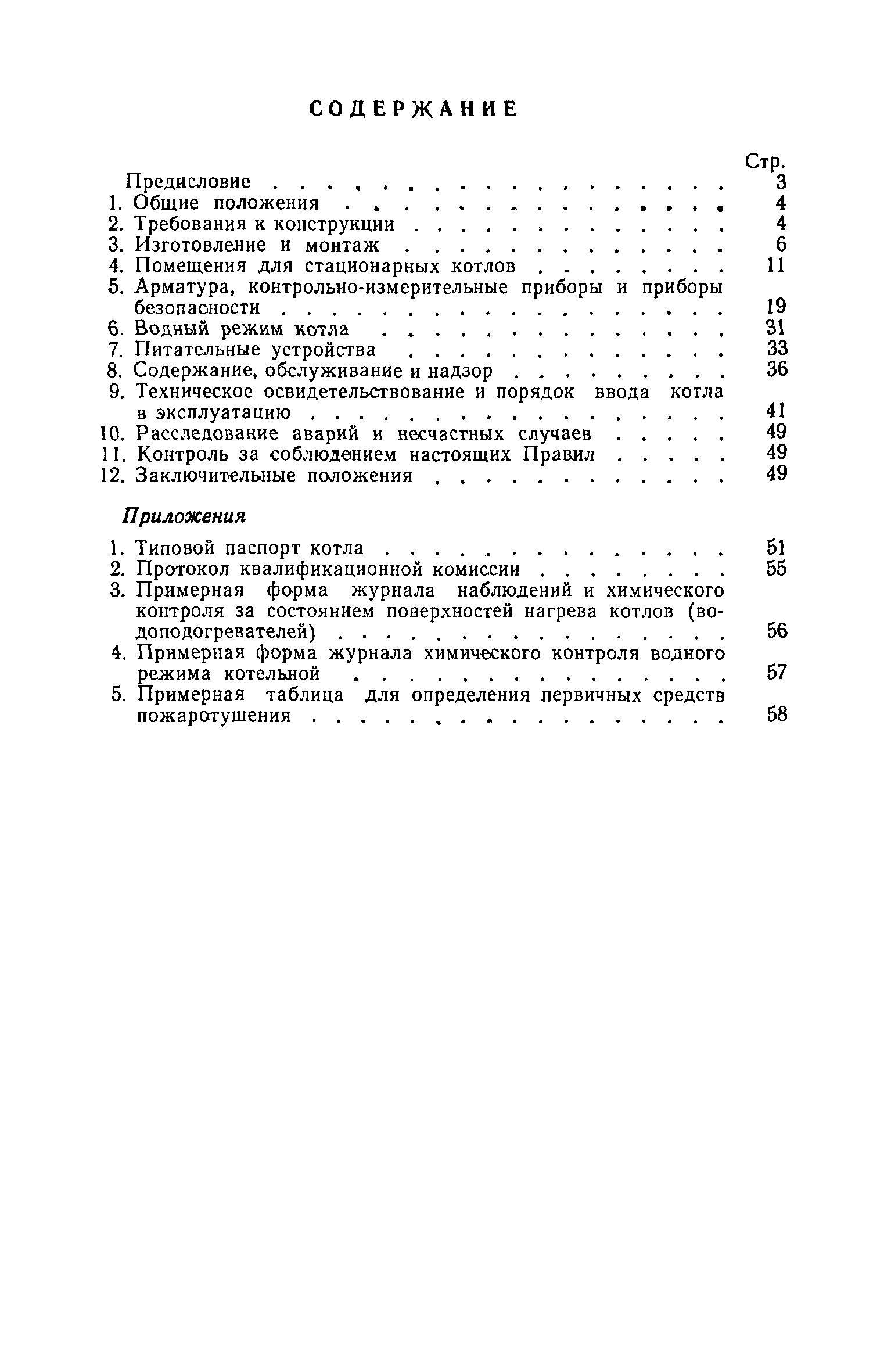 | Оглавление: | Предисловие 1. Общие положения 2. Требования к конструкции 3. Изготовление и монтаж 4. Помещения для стационарных котлов 5. Арматура, контрольно-измерительные приборы и приборы безопасности 6. Водный режим котла 7. Питательные устройства 8. Содержание. Обслуживание и надзор 9. Техническое освидетельствование и порядок ввода котла в эксплуатацию 10. Расследование аварий и несчастных случаев 11. Контроль за соблюдением настоящих Правил 12. Заключительные положения Приложение 1. Типовой паспорт котла Приложение 2. Протокол квалификационной комиссии Приложение 3. Примерная форма журнала наблюдений и химического контроля за состоянием поверхностей нагрева котлов (водоподогревателей) Приложение 4. Примерная форма журнала химического контроля водного режима котельной Приложение 5. Примерная таблица для определения первичных средств пожаротушения |