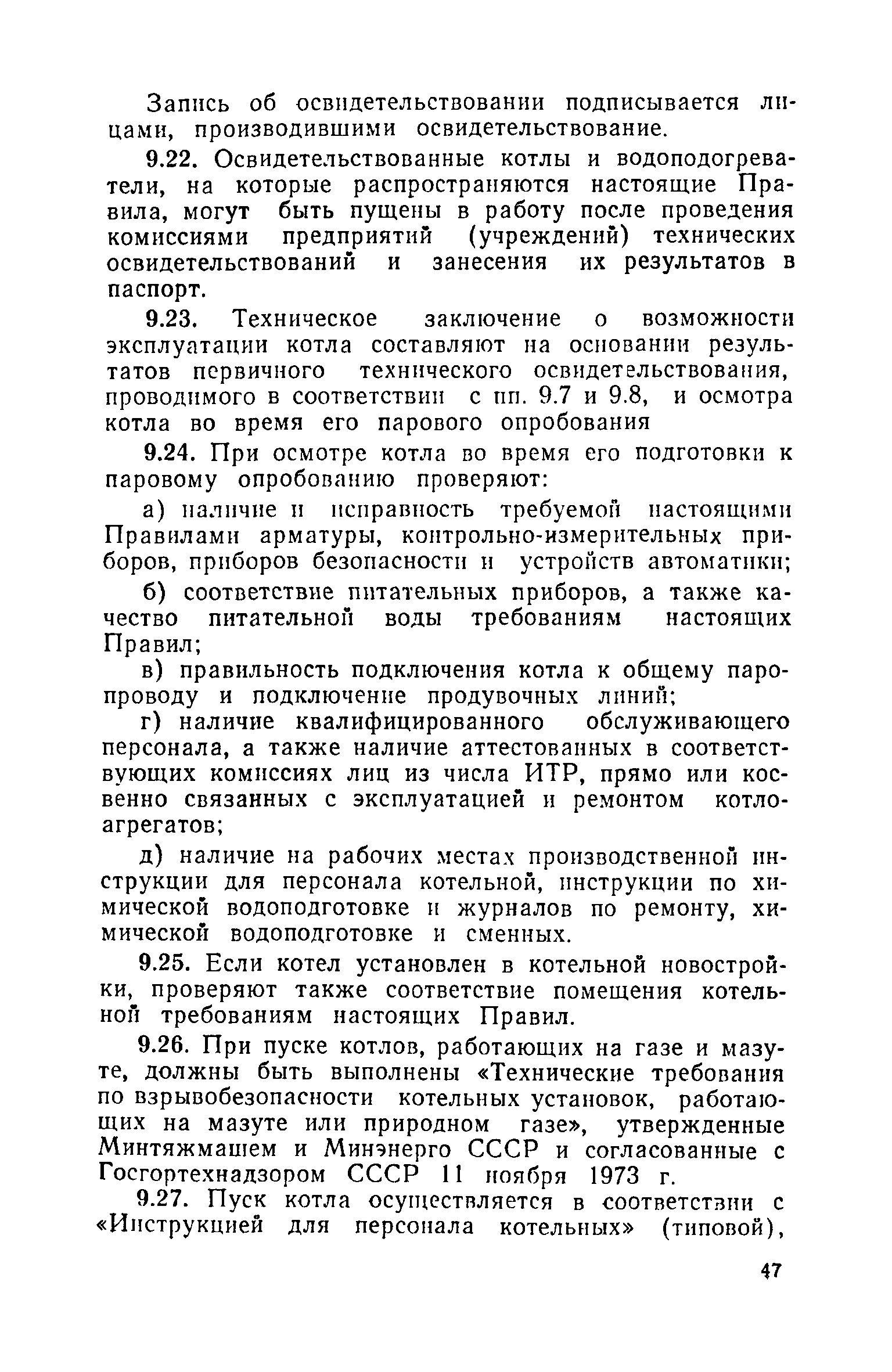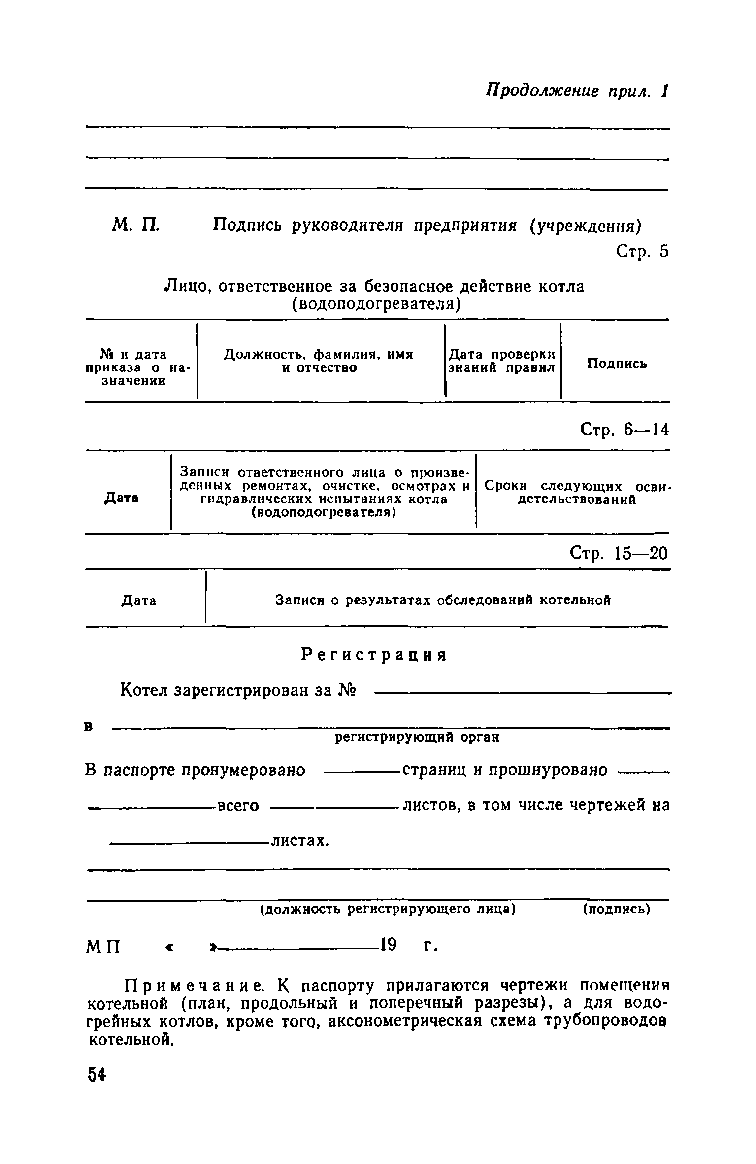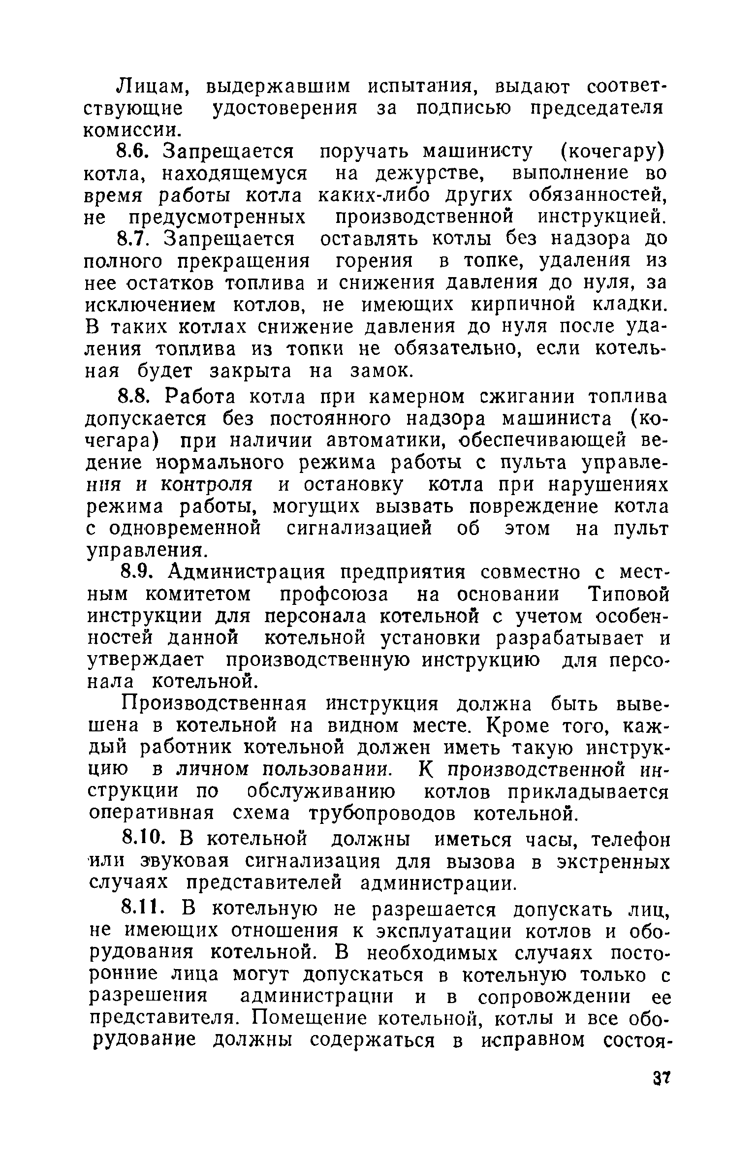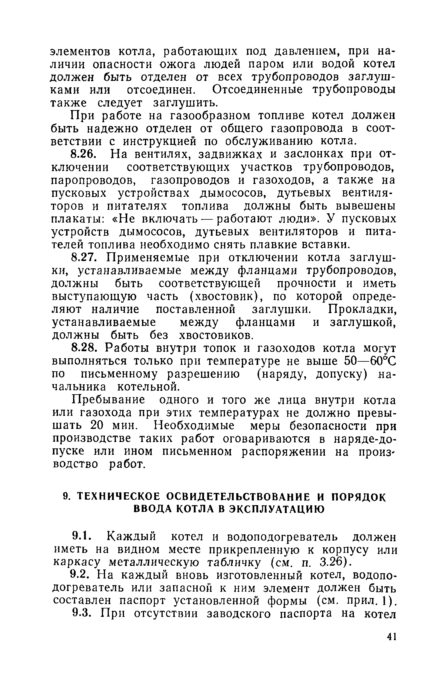 | Оглавление: | Предисловие 1. Общие положения 2. Требования к конструкции 3. Изготовление и монтаж 4. Помещения для стационарных котлов 5. Арматура, контрольно-измерительные приборы и приборы безопасности 6. Водный режим котла 7. Питательные устройства 8. Содержание. Обслуживание и надзор 9. Техническое освидетельствование и порядок ввода котла в эксплуатацию 10. Расследование аварий и несчастных случаев 11. Контроль за соблюдением настоящих Правил 12. Заключительные положения Приложение 1. Типовой паспорт котла Приложение 2. Протокол квалификационной комиссии Приложение 3. Примерная форма журнала наблюдений и химического контроля за состоянием поверхностей нагрева котлов (водоподогревателей) Приложение 4. Примерная форма журнала химического контроля водного режима котельной Приложение 5. Примерная таблица для определения первичных средств пожаротушения |