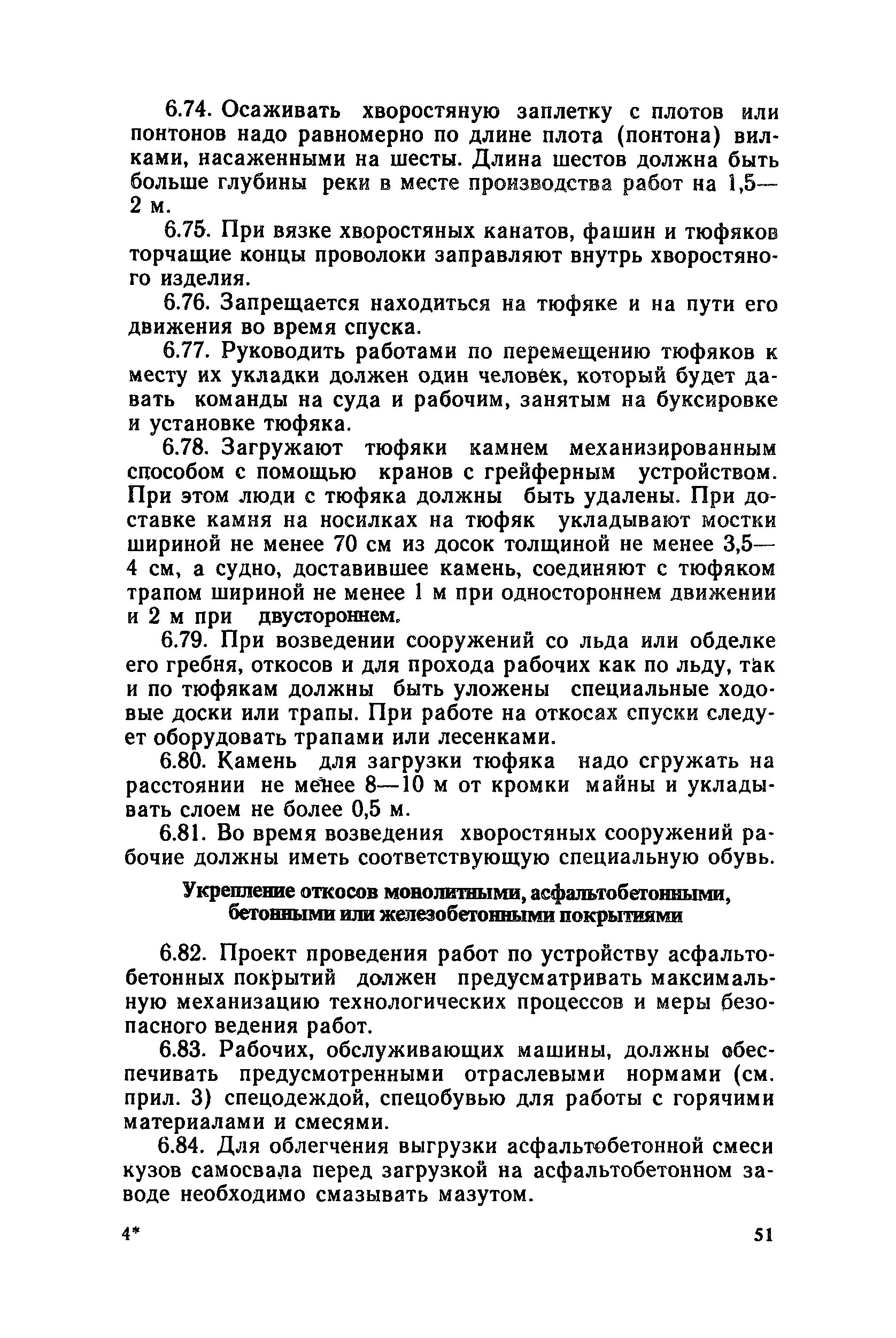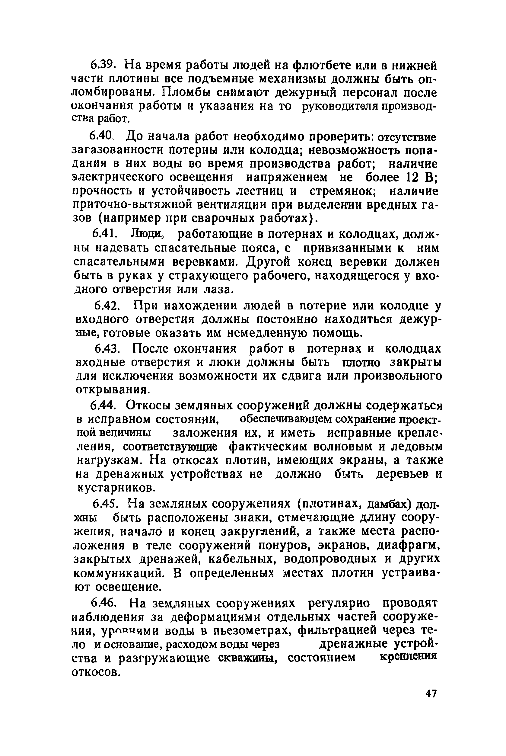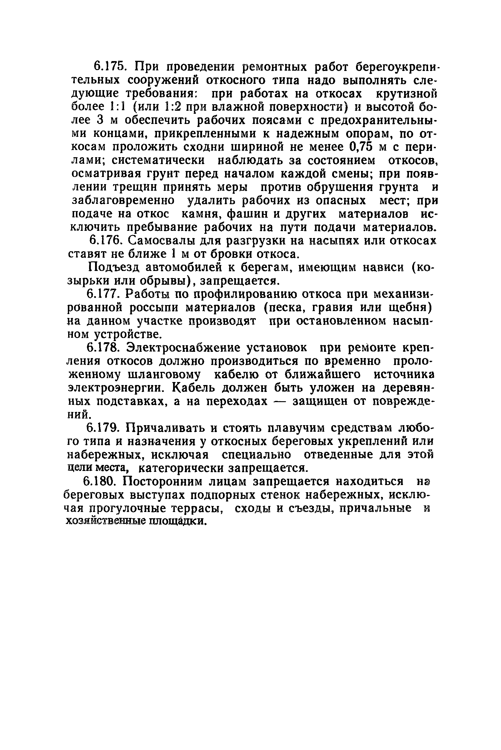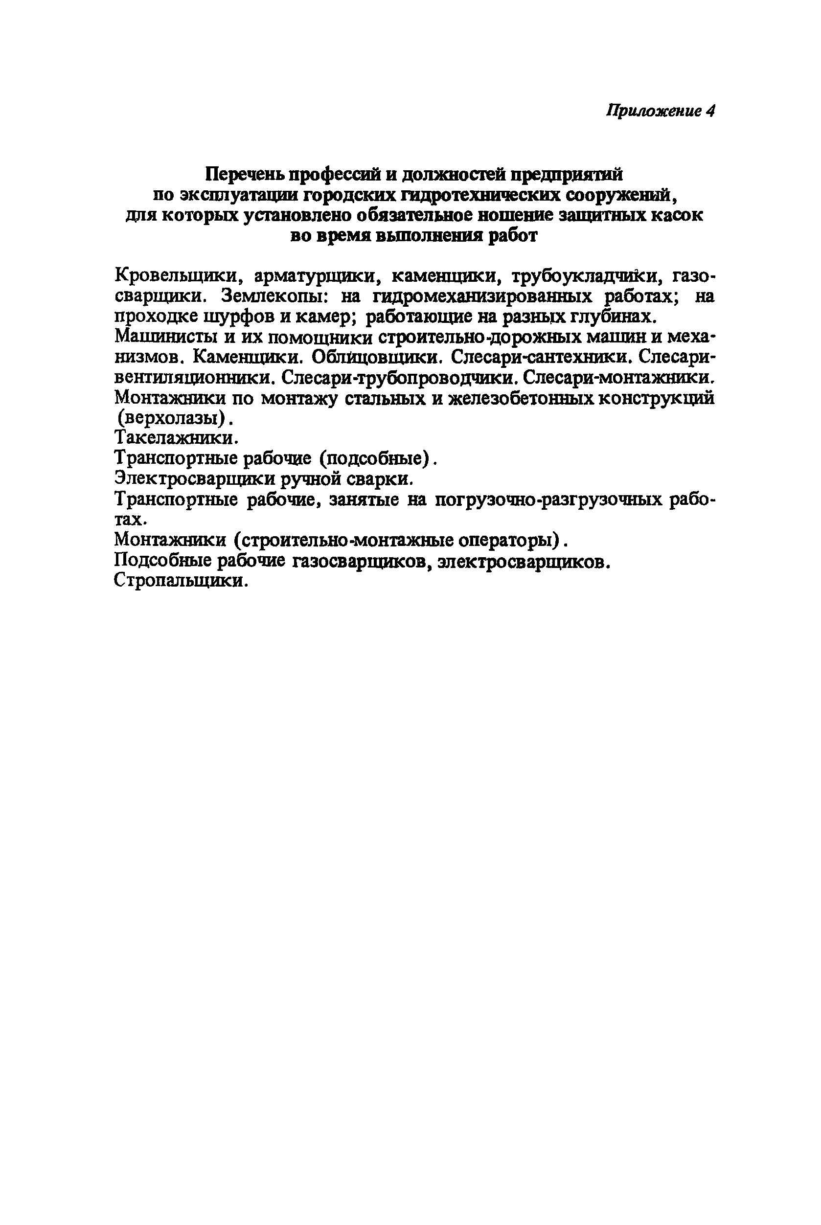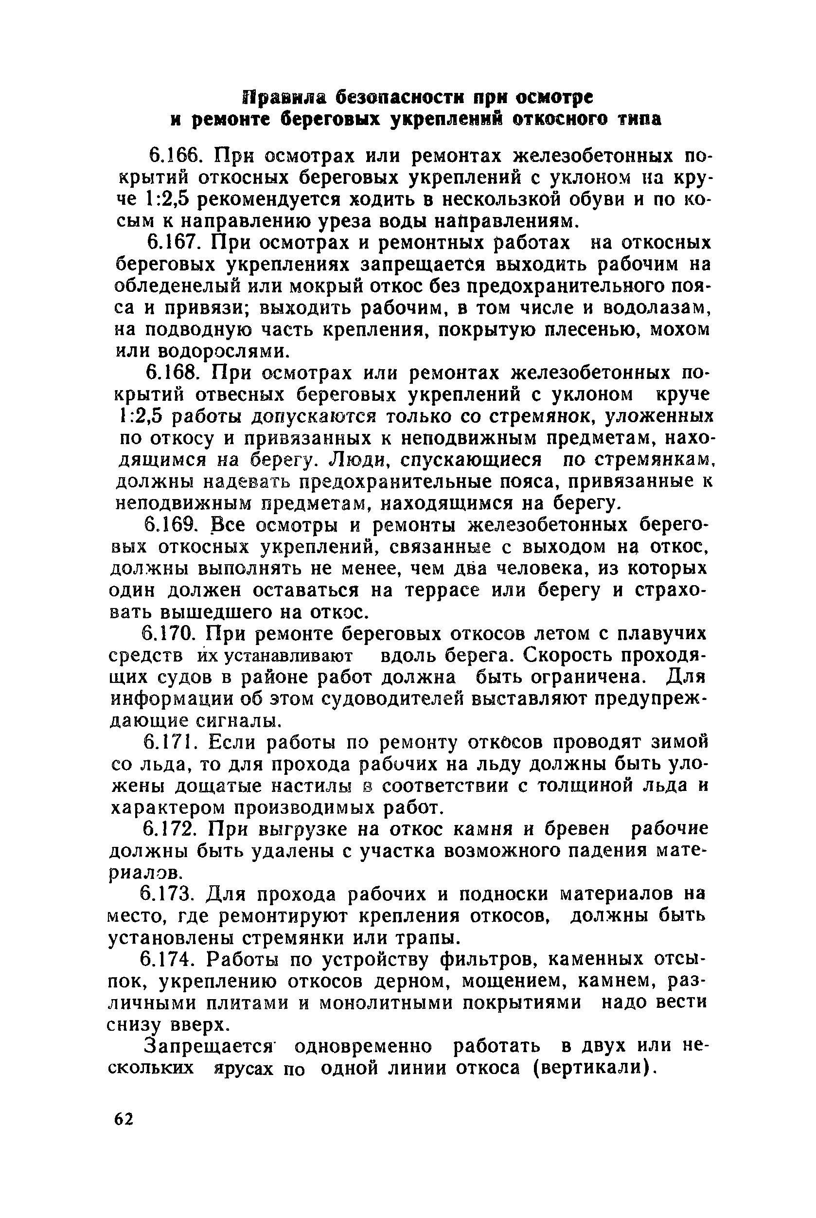 | Оглавление: | 1. Общие положения Область и порядок применения правил 2. Общие требования безопасности при эксплуатации электрических установок 3. Безопасная эксплуатация водосточных и дренажных насосных станций гидротехнических сооружений Общие требования безопасности к устройству и размещению оборудования насосных станций Безопасная организация работы и эксплуатация водосточных и дренажных насосных станций 4. Техника безопасности при эксплуатации и ремонте подземных коллекторов и галерей Безопасная эксплуатация и проведение ремонтных работ в колодцах, коллекторах, камерах, дренажах, ливнеприемниках, смотровых колодцах штолен и других сооружениях с возможным появлением вредных газов Техника безопасности при ремонте водостоков и коллекторов большого сечения Техника безопасности при работе на передвижных парообразователях Техника безопасности при работе на илососах Техника безопасности при промывке водостоков и колодцев с применением поливомоечных машин Техника безопасности при работе на машинах для гидромеханической очистки водосточных коллекторов струями высокого давления 5. Техника безопасности при производстве отдельных видов работ Организация места производства работ Опасные работы Оградительные мероприятия при выполнении работ на действующих дорогах, мостах и набережных Устройство и эксплуатация лесов, подмостей, приставных лестниц и других приспособлений для выполнения работ Вибраторы и трамбующие средства Очистка поверхности гидротехнических сооружений пескоструйными аппаратами Расшивочные работы с подвесных люлек и передвижных подмостей Торкретирование поверхностей Компрессоры Безопасность при работе с газонокосилкой СК-20 на склонах Безопасность работы при устройстве газонов методом гидропосева Безопасность при работах на камышекосилках 6. Техника безопасности при эксплуатации и ремонте береговых укреплений, набережных и откосов Берегоочистительные работы Разборка старых конструкций, сооружений и зданий Работа на гидротехнических сооружениях в условиях суточного колебания уровня воды Земляные плотины и дамбы Подпорные стены Возведение насыпных и намывных сооружений Возведение хворостяных сооружений Укрепление откосов монолитными асфальтобетонными, бетонными и железобетонными покрытиями Укрепление откосов сборными и гибкими железобетонными и асфальтобетонными покрытиями Укрепление береговых откосов химическими веществами Укрепление откосов камнем, посевом трав, посадкой ивняка и одерновкой Работа над водой и на воде и безопасная эксплуатация плавучих средств Работы со льда при эксплуатации и ремонте гидротехнических сооружений Пропуск ледохода и паводковых вод Правила безопасности при осмотре и ремонте береговых укреплений откосного типа Приложение 1. Выписка из "Положения об организации работы по охране труда в системе Минжилкомхоза РСФСР" Приложение 2. Список производств и профессий, для которых обязательны предварительные при поступлении на работу и периодические медицинские осмотры в целях предупреждения заболеваний, несчастных случаев и обеспечения безопасности труда Приложение 3. Типовые отраслевые нормы бесплатной выдачи специальной одежды, специальной обуви и других средств индивидуальной защиты рабочим и служащим жилищно-коммунального х