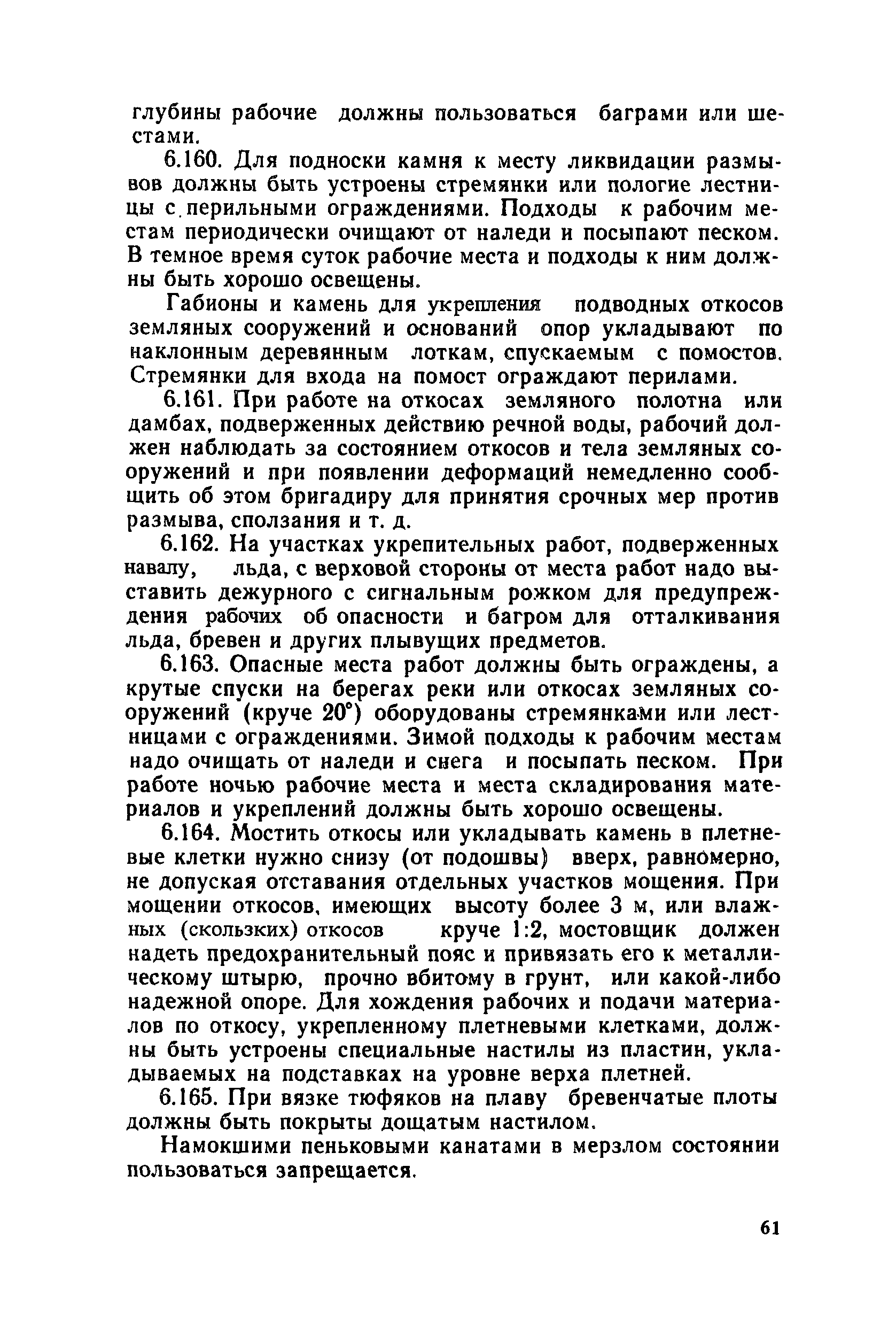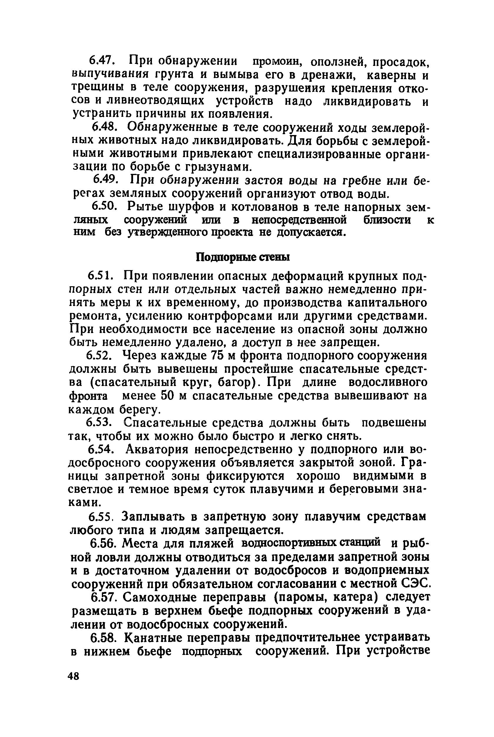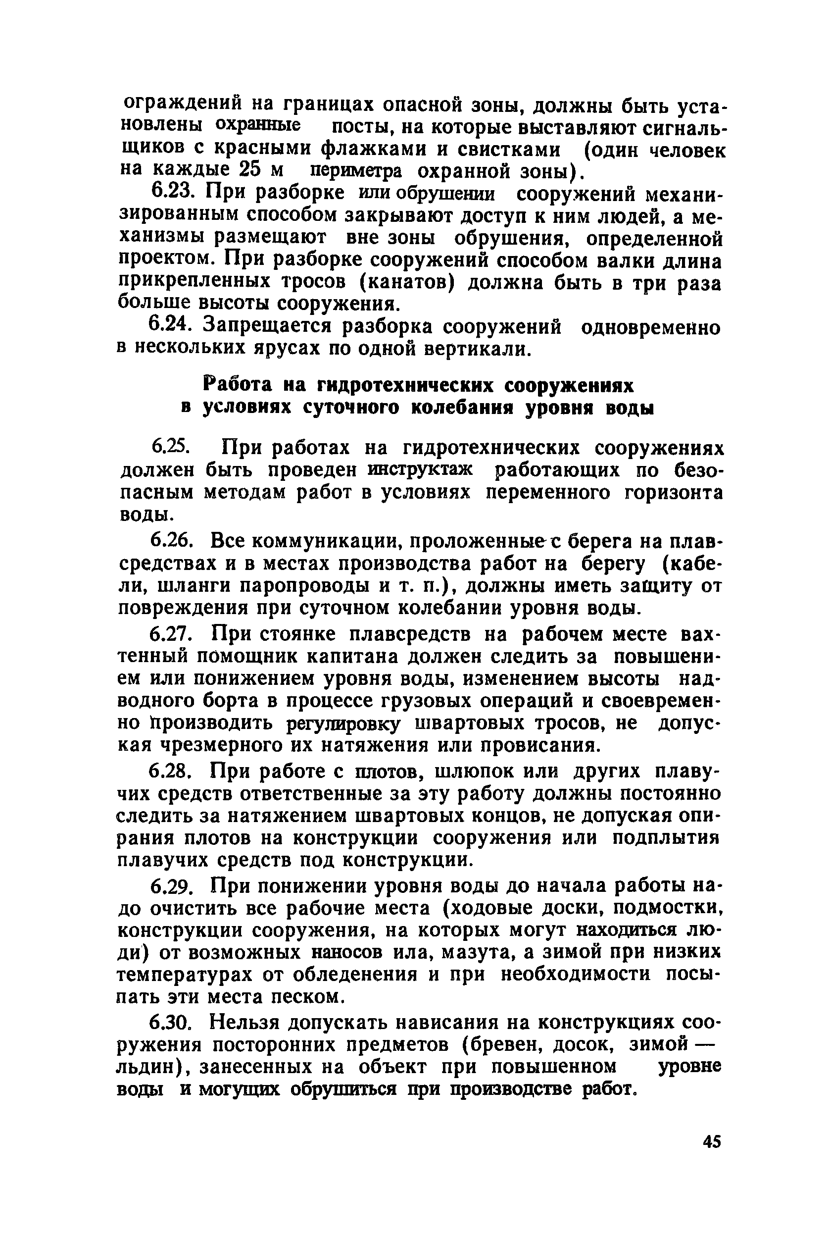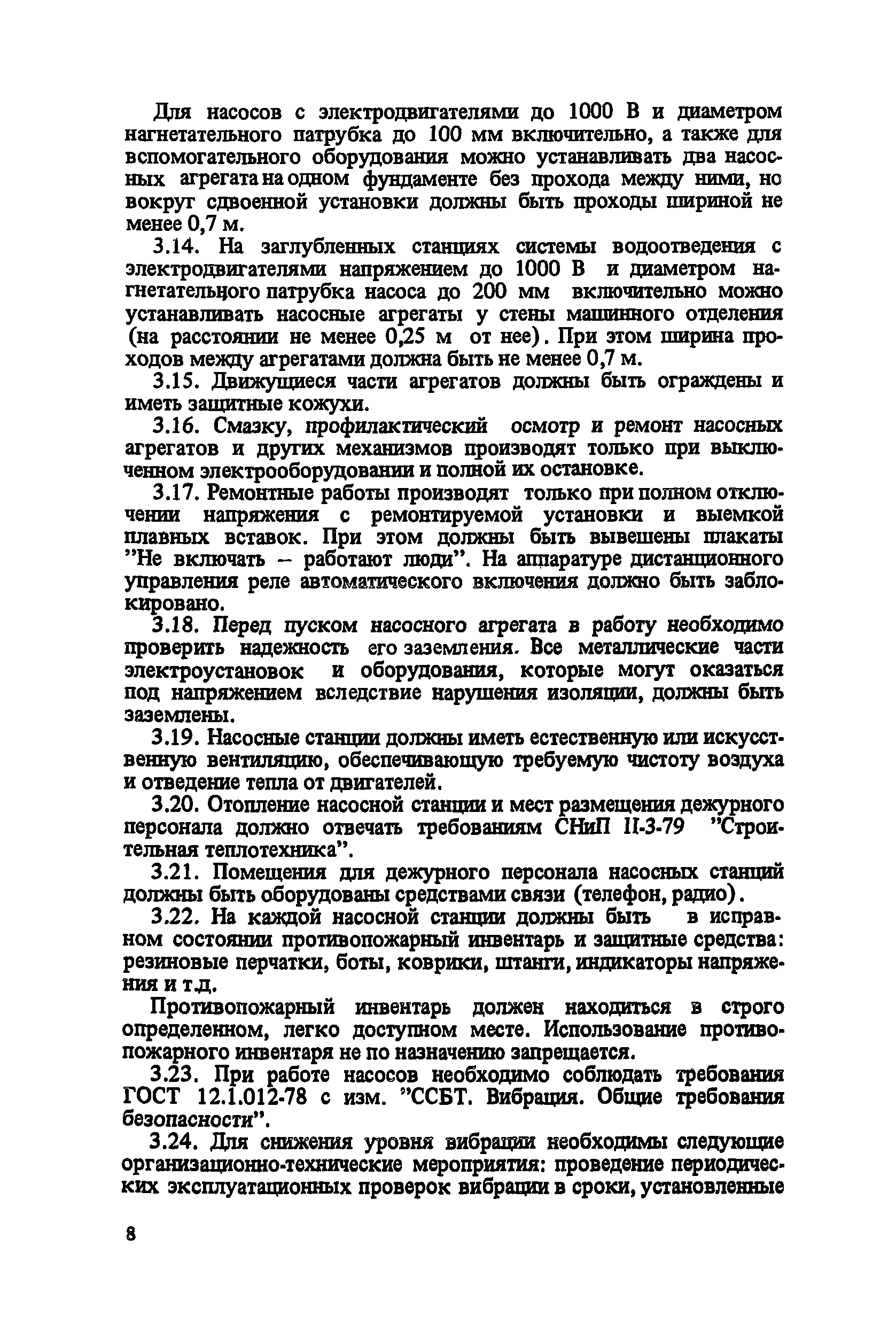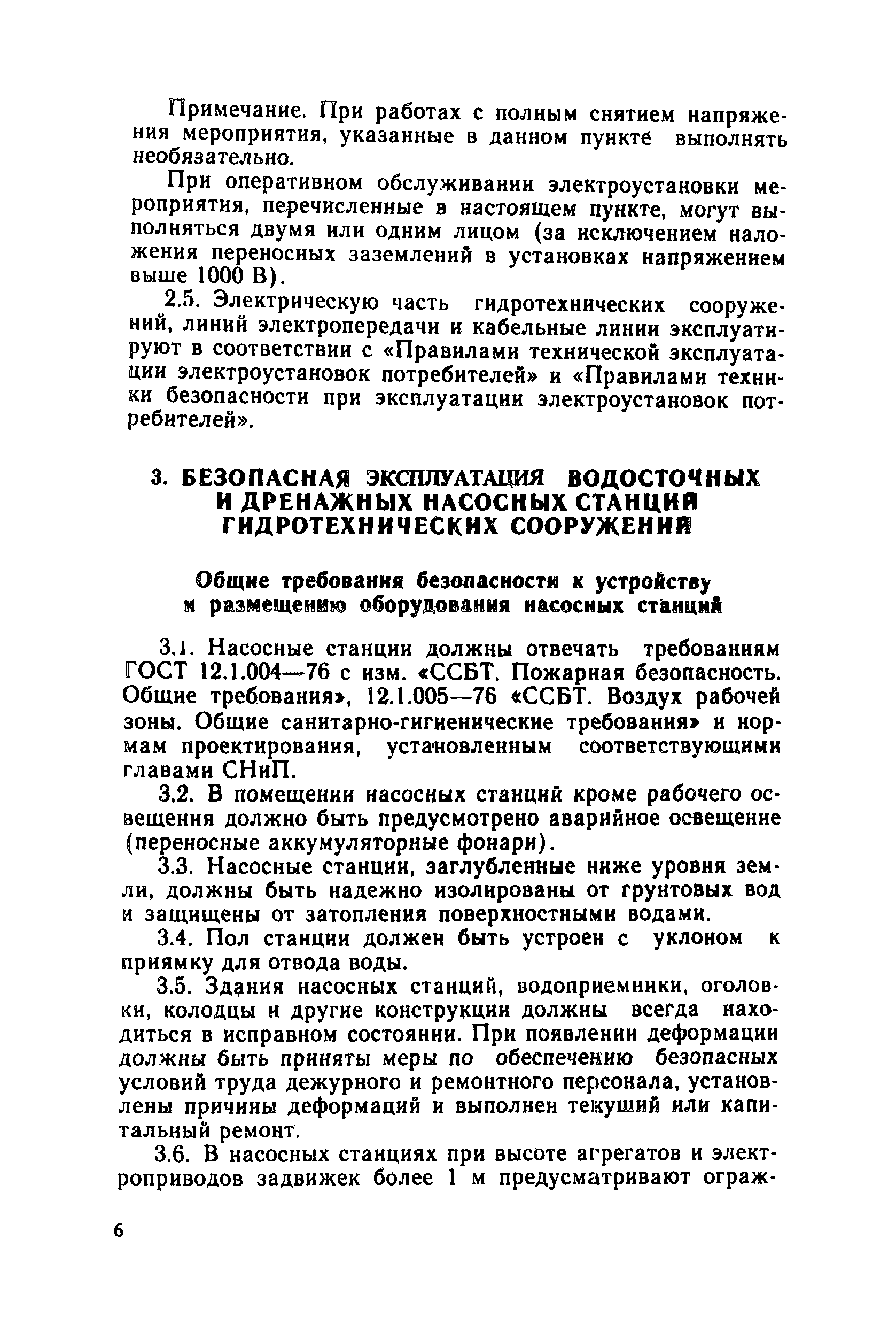 | Оглавление: | 1. Общие положения Область и порядок применения правил 2. Общие требования безопасности при эксплуатации электрических установок 3. Безопасная эксплуатация водосточных и дренажных насосных станций гидротехнических сооружений Общие требования безопасности к устройству и размещению оборудования насосных станций Безопасная организация работы и эксплуатация водосточных и дренажных насосных станций 4. Техника безопасности при эксплуатации и ремонте подземных коллекторов и галерей Безопасная эксплуатация и проведение ремонтных работ в колодцах, коллекторах, камерах, дренажах, ливнеприемниках, смотровых колодцах штолен и других сооружениях с возможным появлением вредных газов Техника безопасности при ремонте водостоков и коллекторов большого сечения Техника безопасности при работе на передвижных парообразователях Техника безопасности при работе на илососах Техника безопасности при промывке водостоков и колодцев с применением поливомоечных машин Техника безопасности при работе на машинах для гидромеханической очистки водосточных коллекторов струями высокого давления 5. Техника безопасности при производстве отдельных видов работ Организация места производства работ Опасные работы Оградительные мероприятия при выполнении работ на действующих дорогах, мостах и набережных Устройство и эксплуатация лесов, подмостей, приставных лестниц и других приспособлений для выполнения работ Вибраторы и трамбующие средства Очистка поверхности гидротехнических сооружений пескоструйными аппаратами Расшивочные работы с подвесных люлек и передвижных подмостей Торкретирование поверхностей Компрессоры Безопасность при работе с газонокосилкой СК-20 на склонах Безопасность работы при устройстве газонов методом гидропосева Безопасность при работах на камышекосилках 6. Техника безопасности при эксплуатации и ремонте береговых укреплений, набережных и откосов Берегоочистительные работы Разборка старых конструкций, сооружений и зданий Работа на гидротехнических сооружениях в условиях суточного колебания уровня воды Земляные плотины и дамбы Подпорные стены Возведение насыпных и намывных сооружений Возведение хворостяных сооружений Укрепление откосов монолитными асфальтобетонными, бетонными и железобетонными покрытиями Укрепление откосов сборными и гибкими железобетонными и асфальтобетонными покрытиями Укрепление береговых откосов химическими веществами Укрепление откосов камнем, посевом трав, посадкой ивняка и одерновкой Работа над водой и на воде и безопасная эксплуатация плавучих средств Работы со льда при эксплуатации и ремонте гидротехнических сооружений Пропуск ледохода и паводковых вод Правила безопасности при осмотре и ремонте береговых укреплений откосного типа Приложение 1. Выписка из "Положения об организации работы по охране труда в системе Минжилкомхоза РСФСР" Приложение 2. Список производств и профессий, для которых обязательны предварительные при поступлении на работу и периодические медицинские осмотры в целях предупреждения заболеваний, несчастных случаев и обеспечения безопасности труда Приложение 3. Типовые отраслевые нормы бесплатной выдачи специальной одежды, специальной обуви и других средств индивидуальной защиты рабочим и служащим жилищно-коммунального х