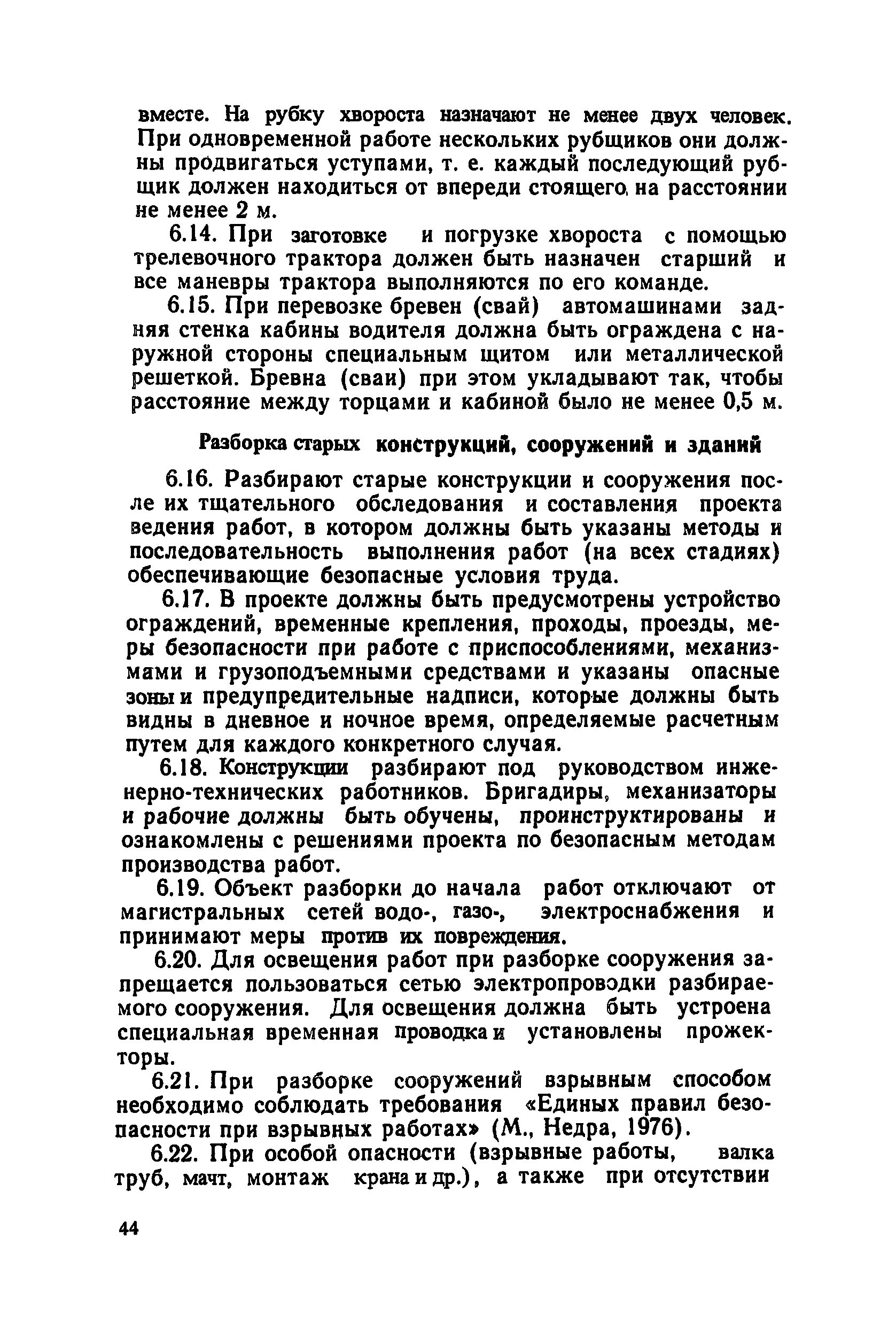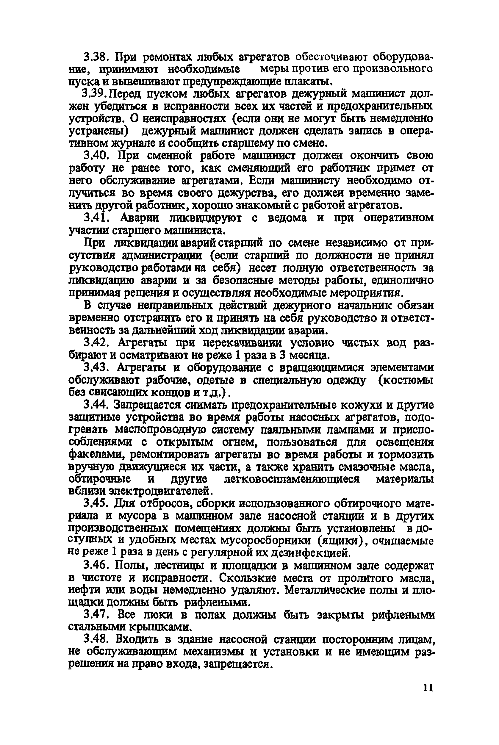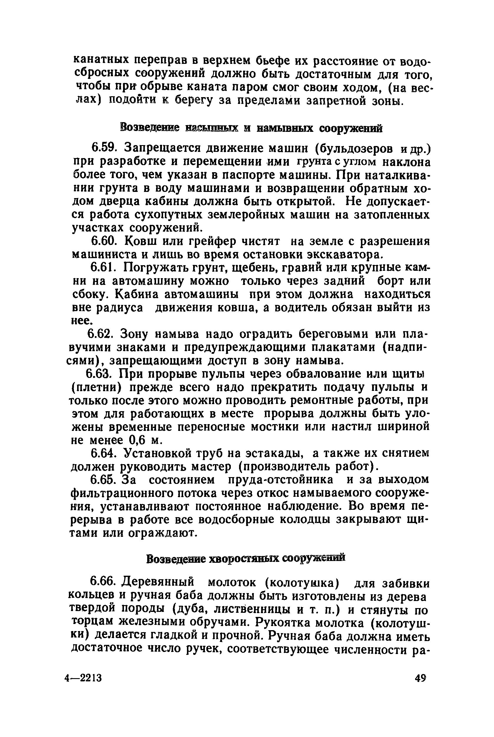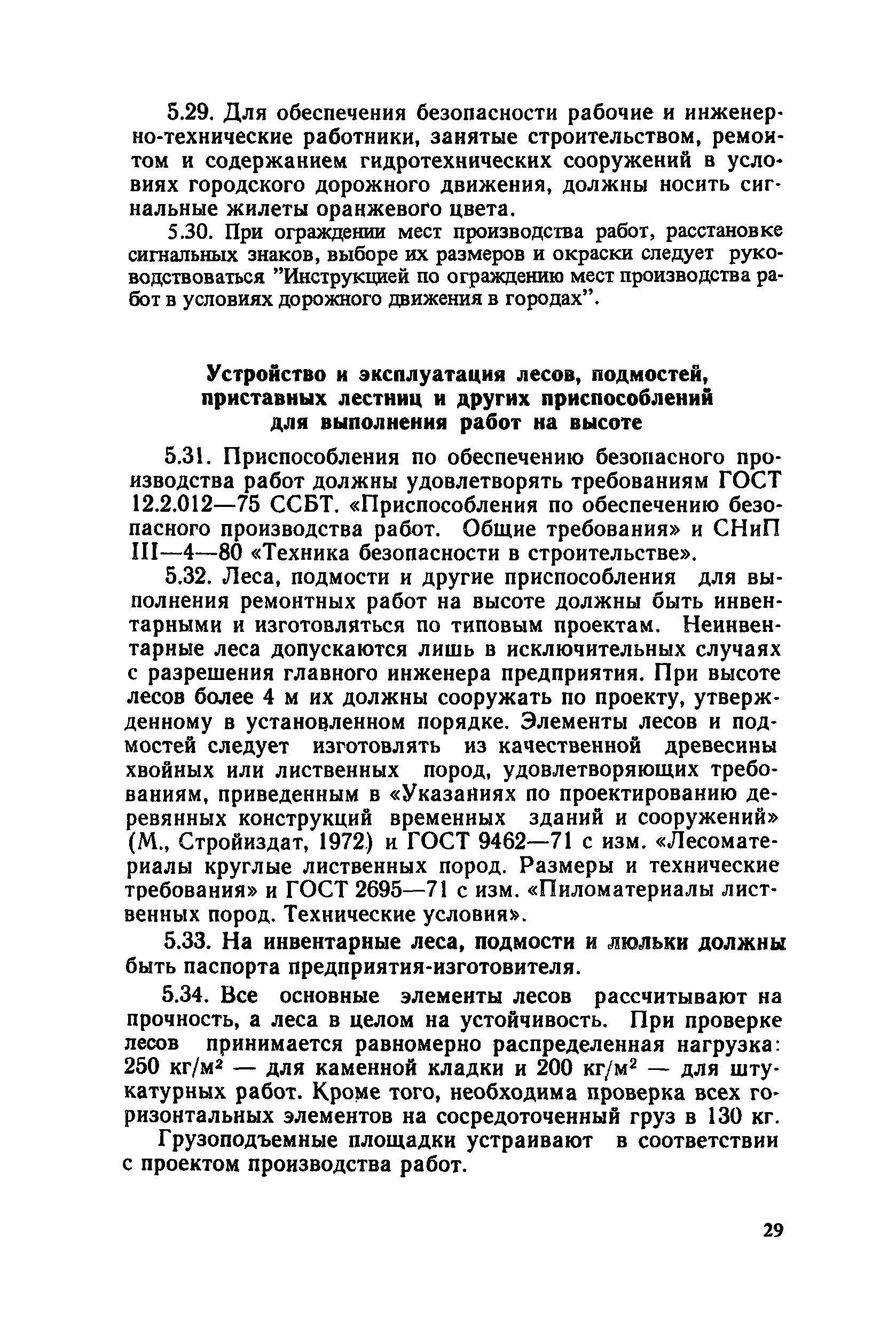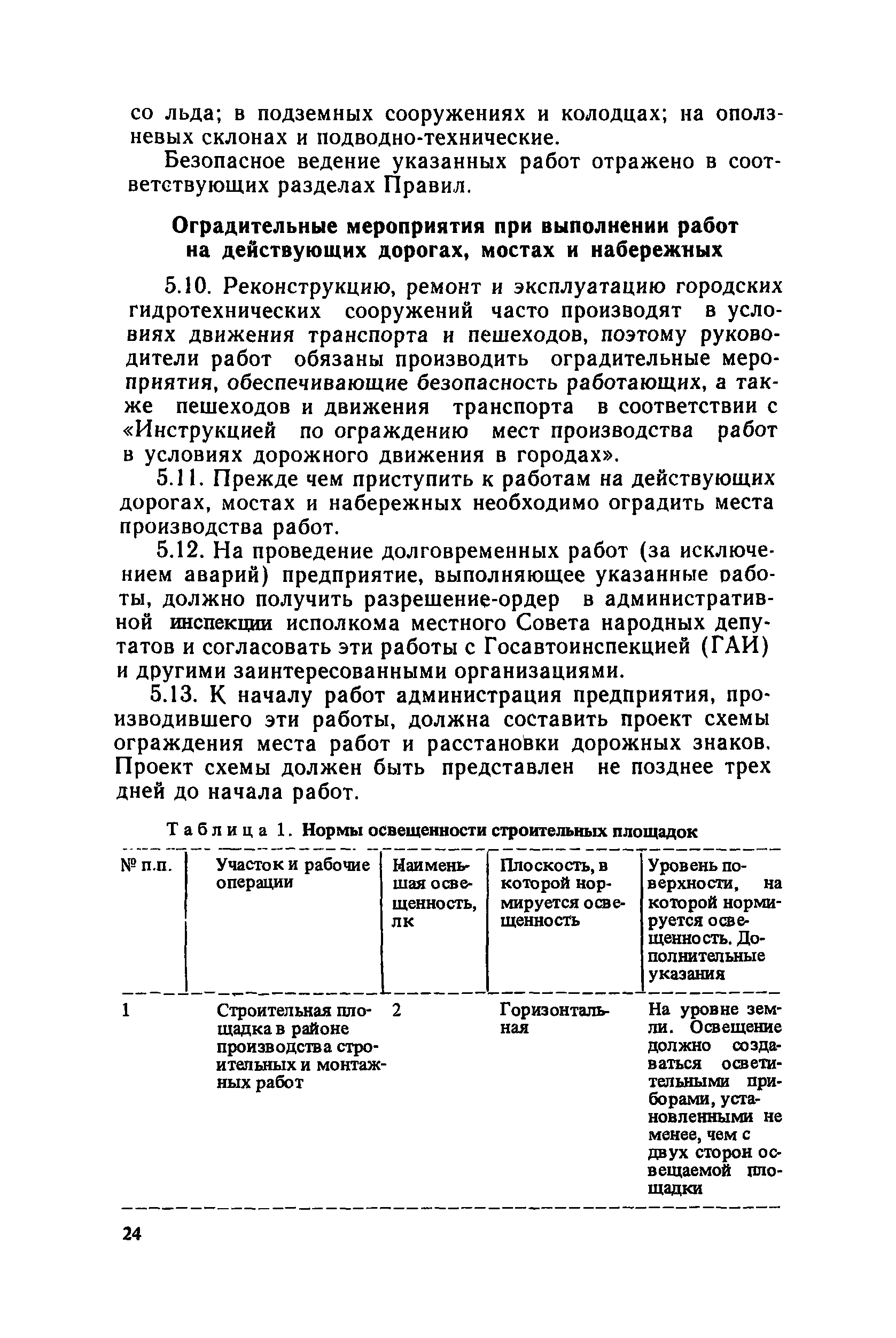 | Оглавление: | 1. Общие положения Область и порядок применения правил 2. Общие требования безопасности при эксплуатации электрических установок 3. Безопасная эксплуатация водосточных и дренажных насосных станций гидротехнических сооружений Общие требования безопасности к устройству и размещению оборудования насосных станций Безопасная организация работы и эксплуатация водосточных и дренажных насосных станций 4. Техника безопасности при эксплуатации и ремонте подземных коллекторов и галерей Безопасная эксплуатация и проведение ремонтных работ в колодцах, коллекторах, камерах, дренажах, ливнеприемниках, смотровых колодцах штолен и других сооружениях с возможным появлением вредных газов Техника безопасности при ремонте водостоков и коллекторов большого сечения Техника безопасности при работе на передвижных парообразователях Техника безопасности при работе на илососах Техника безопасности при промывке водостоков и колодцев с применением поливомоечных машин Техника безопасности при работе на машинах для гидромеханической очистки водосточных коллекторов струями высокого давления 5. Техника безопасности при производстве отдельных видов работ Организация места производства работ Опасные работы Оградительные мероприятия при выполнении работ на действующих дорогах, мостах и набережных Устройство и эксплуатация лесов, подмостей, приставных лестниц и других приспособлений для выполнения работ Вибраторы и трамбующие средства Очистка поверхности гидротехнических сооружений пескоструйными аппаратами Расшивочные работы с подвесных люлек и передвижных подмостей Торкретирование поверхностей Компрессоры Безопасность при работе с газонокосилкой СК-20 на склонах Безопасность работы при устройстве газонов методом гидропосева Безопасность при работах на камышекосилках 6. Техника безопасности при эксплуатации и ремонте береговых укреплений, набережных и откосов Берегоочистительные работы Разборка старых конструкций, сооружений и зданий Работа на гидротехнических сооружениях в условиях суточного колебания уровня воды Земляные плотины и дамбы Подпорные стены Возведение насыпных и намывных сооружений Возведение хворостяных сооружений Укрепление откосов монолитными асфальтобетонными, бетонными и железобетонными покрытиями Укрепление откосов сборными и гибкими железобетонными и асфальтобетонными покрытиями Укрепление береговых откосов химическими веществами Укрепление откосов камнем, посевом трав, посадкой ивняка и одерновкой Работа над водой и на воде и безопасная эксплуатация плавучих средств Работы со льда при эксплуатации и ремонте гидротехнических сооружений Пропуск ледохода и паводковых вод Правила безопасности при осмотре и ремонте береговых укреплений откосного типа Приложение 1. Выписка из "Положения об организации работы по охране труда в системе Минжилкомхоза РСФСР" Приложение 2. Список производств и профессий, для которых обязательны предварительные при поступлении на работу и периодические медицинские осмотры в целях предупреждения заболеваний, несчастных случаев и обеспечения безопасности труда Приложение 3. Типовые отраслевые нормы бесплатной выдачи специальной одежды, специальной обуви и других средств индивидуальной защиты рабочим и служащим жилищно-коммунального х