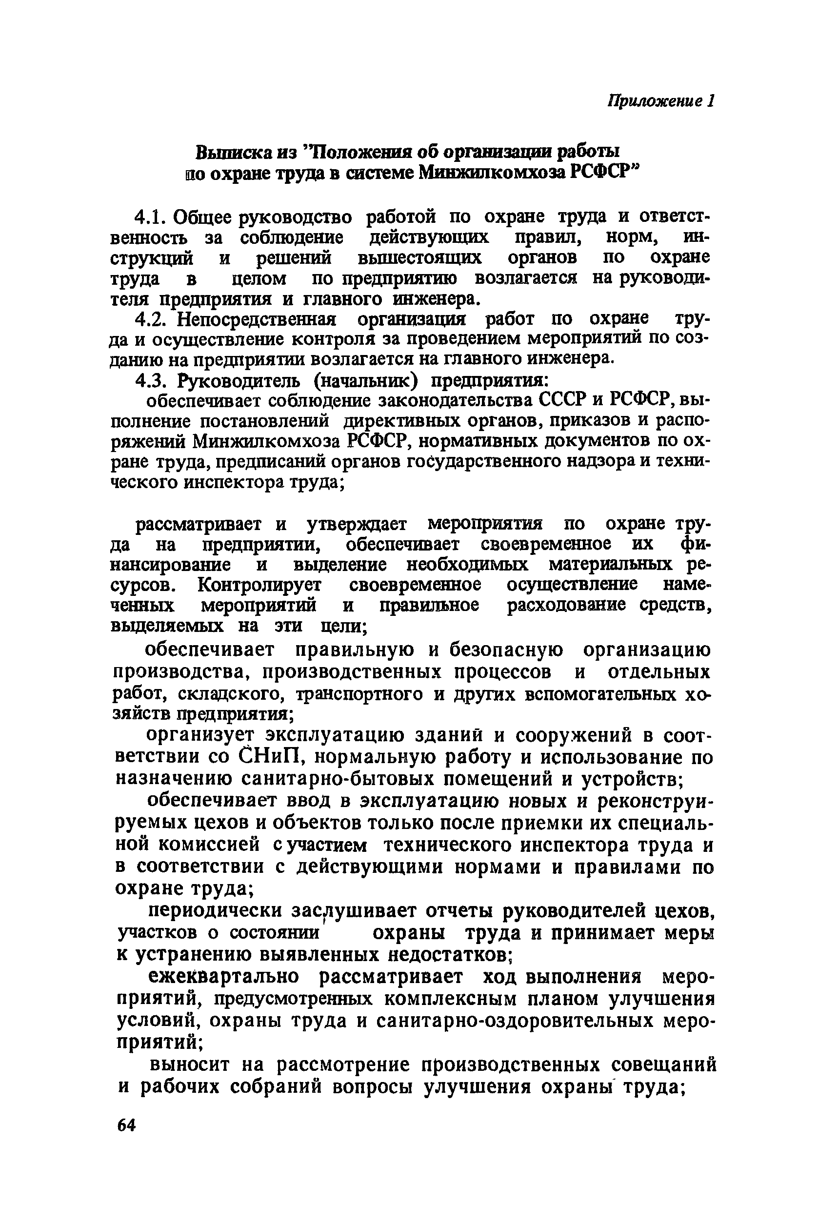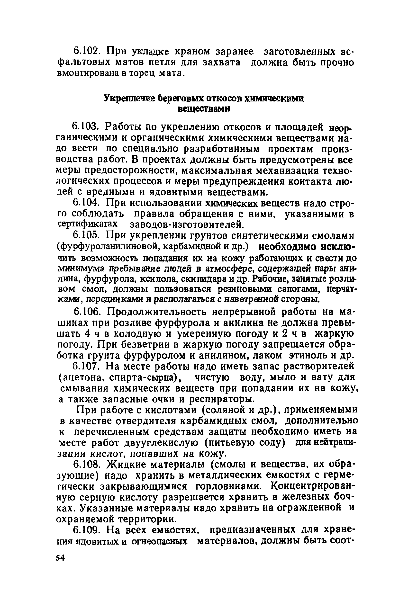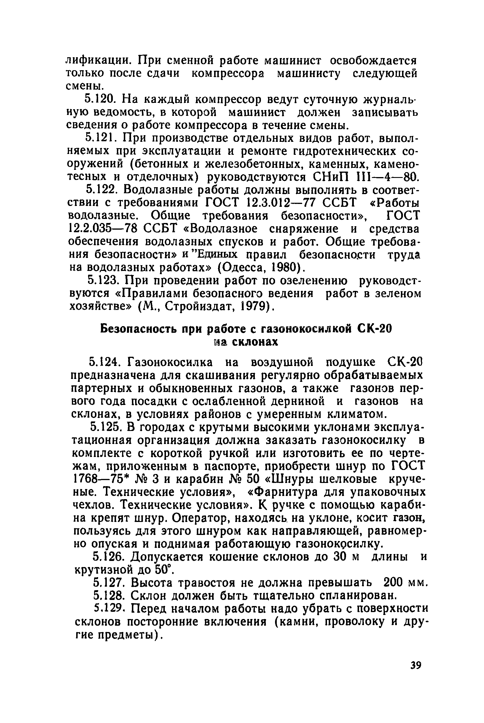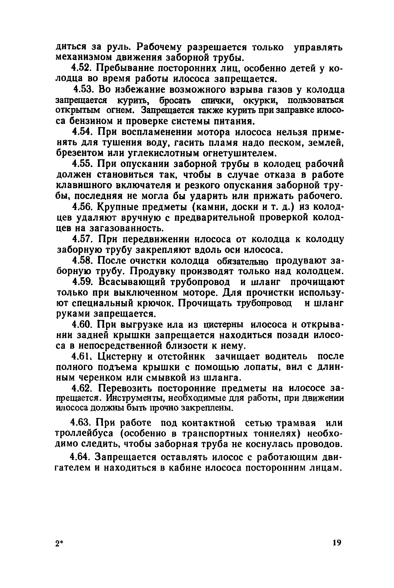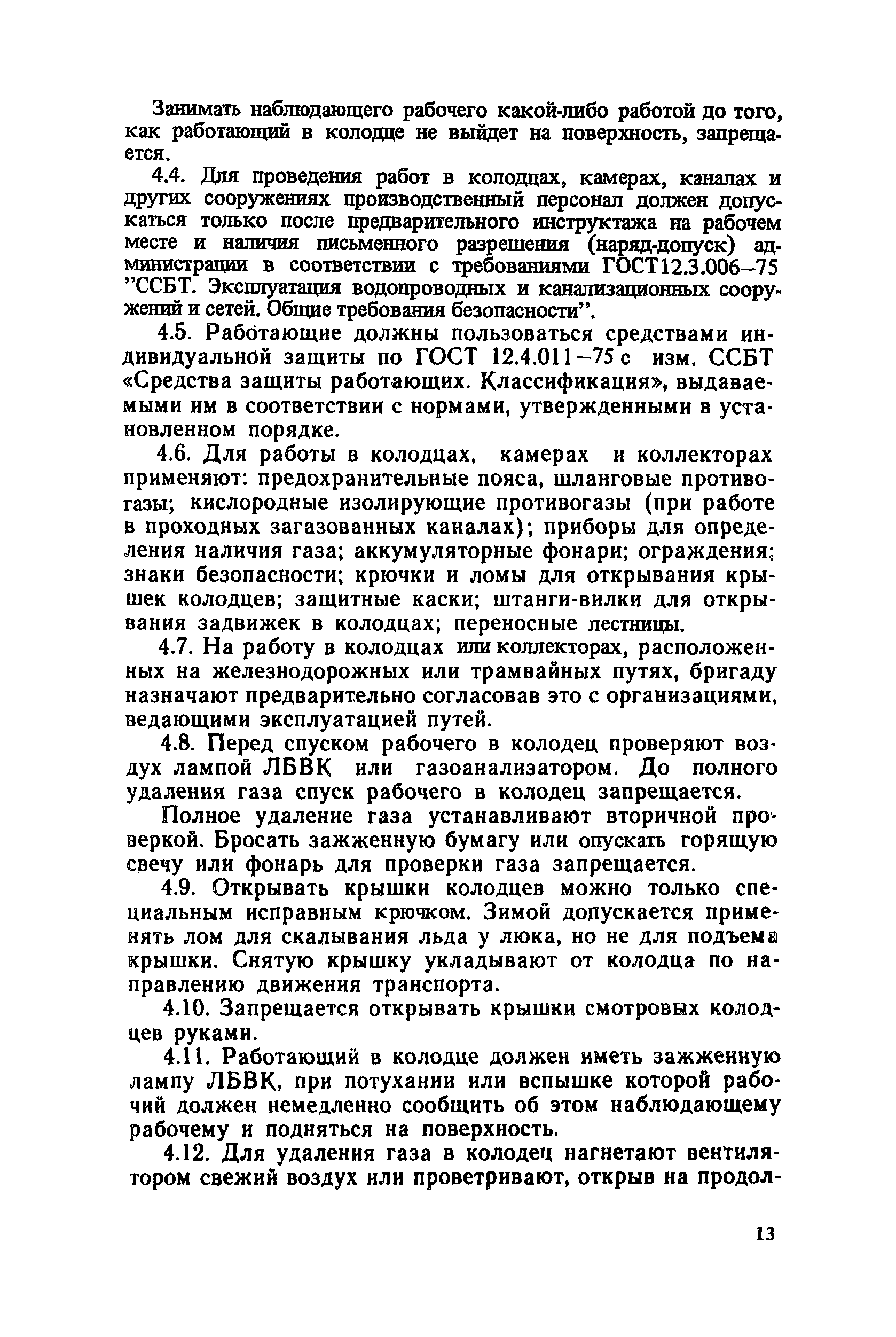 | Оглавление: | 1. Общие положения Область и порядок применения правил 2. Общие требования безопасности при эксплуатации электрических установок 3. Безопасная эксплуатация водосточных и дренажных насосных станций гидротехнических сооружений Общие требования безопасности к устройству и размещению оборудования насосных станций Безопасная организация работы и эксплуатация водосточных и дренажных насосных станций 4. Техника безопасности при эксплуатации и ремонте подземных коллекторов и галерей Безопасная эксплуатация и проведение ремонтных работ в колодцах, коллекторах, камерах, дренажах, ливнеприемниках, смотровых колодцах штолен и других сооружениях с возможным появлением вредных газов Техника безопасности при ремонте водостоков и коллекторов большого сечения Техника безопасности при работе на передвижных парообразователях Техника безопасности при работе на илососах Техника безопасности при промывке водостоков и колодцев с применением поливомоечных машин Техника безопасности при работе на машинах для гидромеханической очистки водосточных коллекторов струями высокого давления 5. Техника безопасности при производстве отдельных видов работ Организация места производства работ Опасные работы Оградительные мероприятия при выполнении работ на действующих дорогах, мостах и набережных Устройство и эксплуатация лесов, подмостей, приставных лестниц и других приспособлений для выполнения работ Вибраторы и трамбующие средства Очистка поверхности гидротехнических сооружений пескоструйными аппаратами Расшивочные работы с подвесных люлек и передвижных подмостей Торкретирование поверхностей Компрессоры Безопасность при работе с газонокосилкой СК-20 на склонах Безопасность работы при устройстве газонов методом гидропосева Безопасность при работах на камышекосилках 6. Техника безопасности при эксплуатации и ремонте береговых укреплений, набережных и откосов Берегоочистительные работы Разборка старых конструкций, сооружений и зданий Работа на гидротехнических сооружениях в условиях суточного колебания уровня воды Земляные плотины и дамбы Подпорные стены Возведение насыпных и намывных сооружений Возведение хворостяных сооружений Укрепление откосов монолитными асфальтобетонными, бетонными и железобетонными покрытиями Укрепление откосов сборными и гибкими железобетонными и асфальтобетонными покрытиями Укрепление береговых откосов химическими веществами Укрепление откосов камнем, посевом трав, посадкой ивняка и одерновкой Работа над водой и на воде и безопасная эксплуатация плавучих средств Работы со льда при эксплуатации и ремонте гидротехнических сооружений Пропуск ледохода и паводковых вод Правила безопасности при осмотре и ремонте береговых укреплений откосного типа Приложение 1. Выписка из "Положения об организации работы по охране труда в системе Минжилкомхоза РСФСР" Приложение 2. Список производств и профессий, для которых обязательны предварительные при поступлении на работу и периодические медицинские осмотры в целях предупреждения заболеваний, несчастных случаев и обеспечения безопасности труда Приложение 3. Типовые отраслевые нормы бесплатной выдачи специальной одежды, специальной обуви и других средств индивидуальной защиты рабочим и служащим жилищно-коммунального х