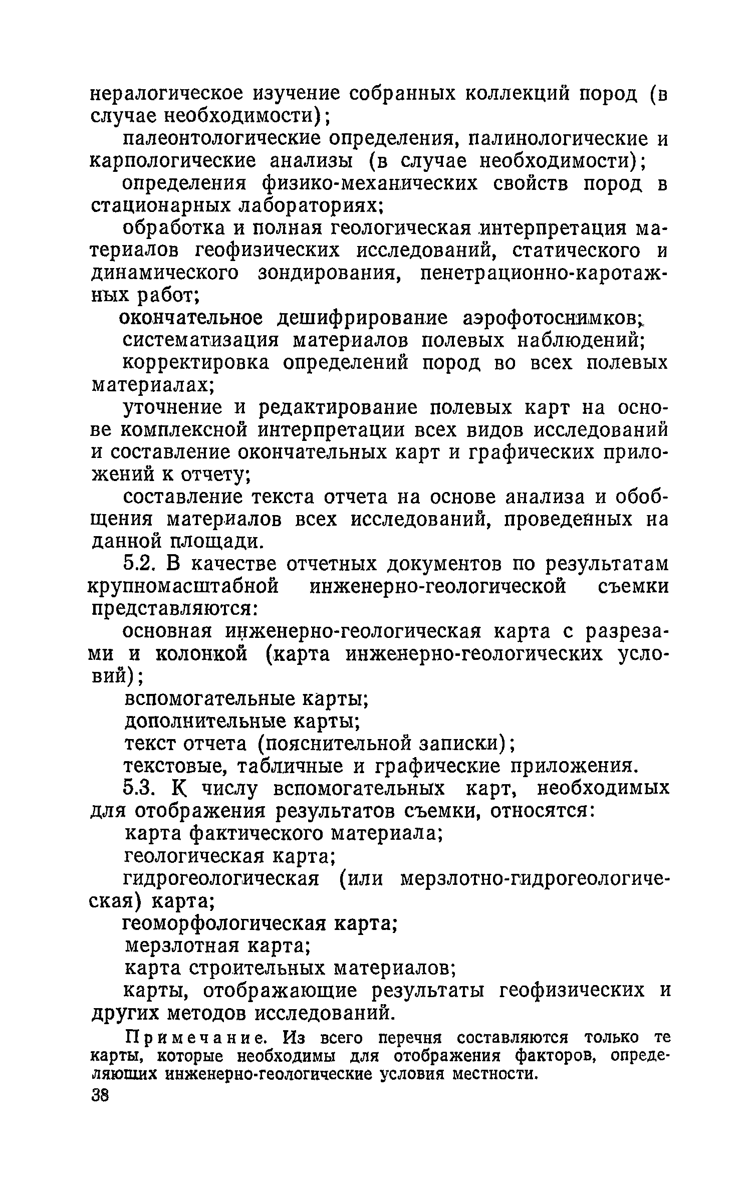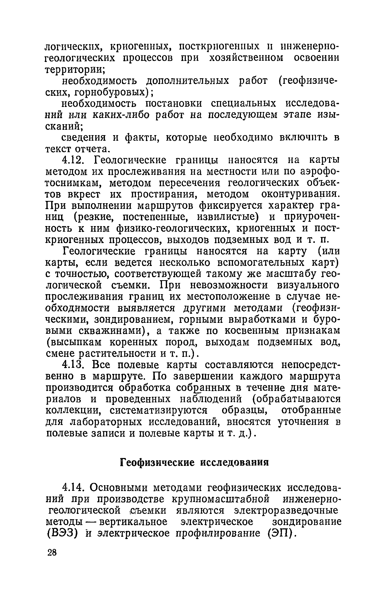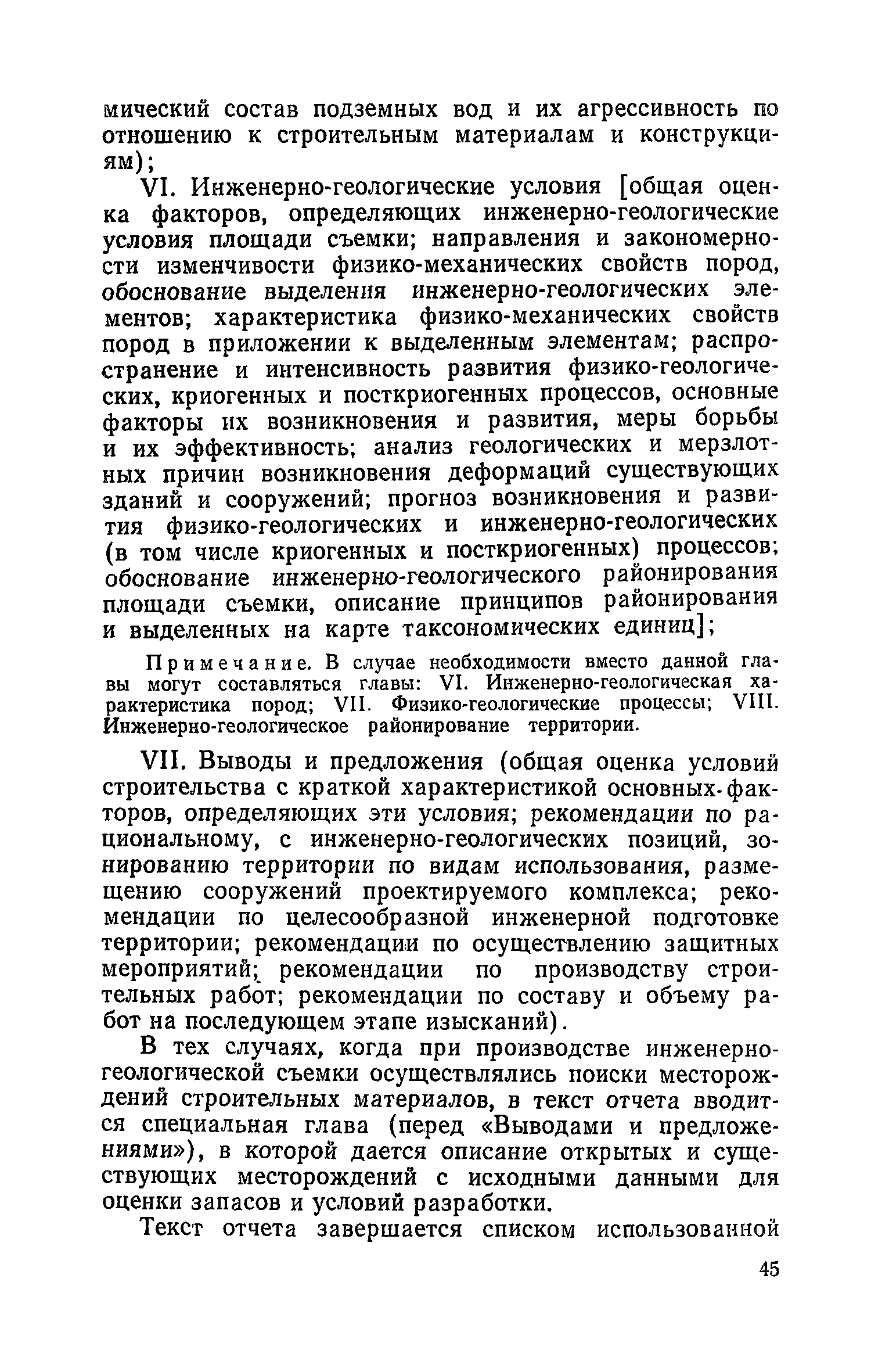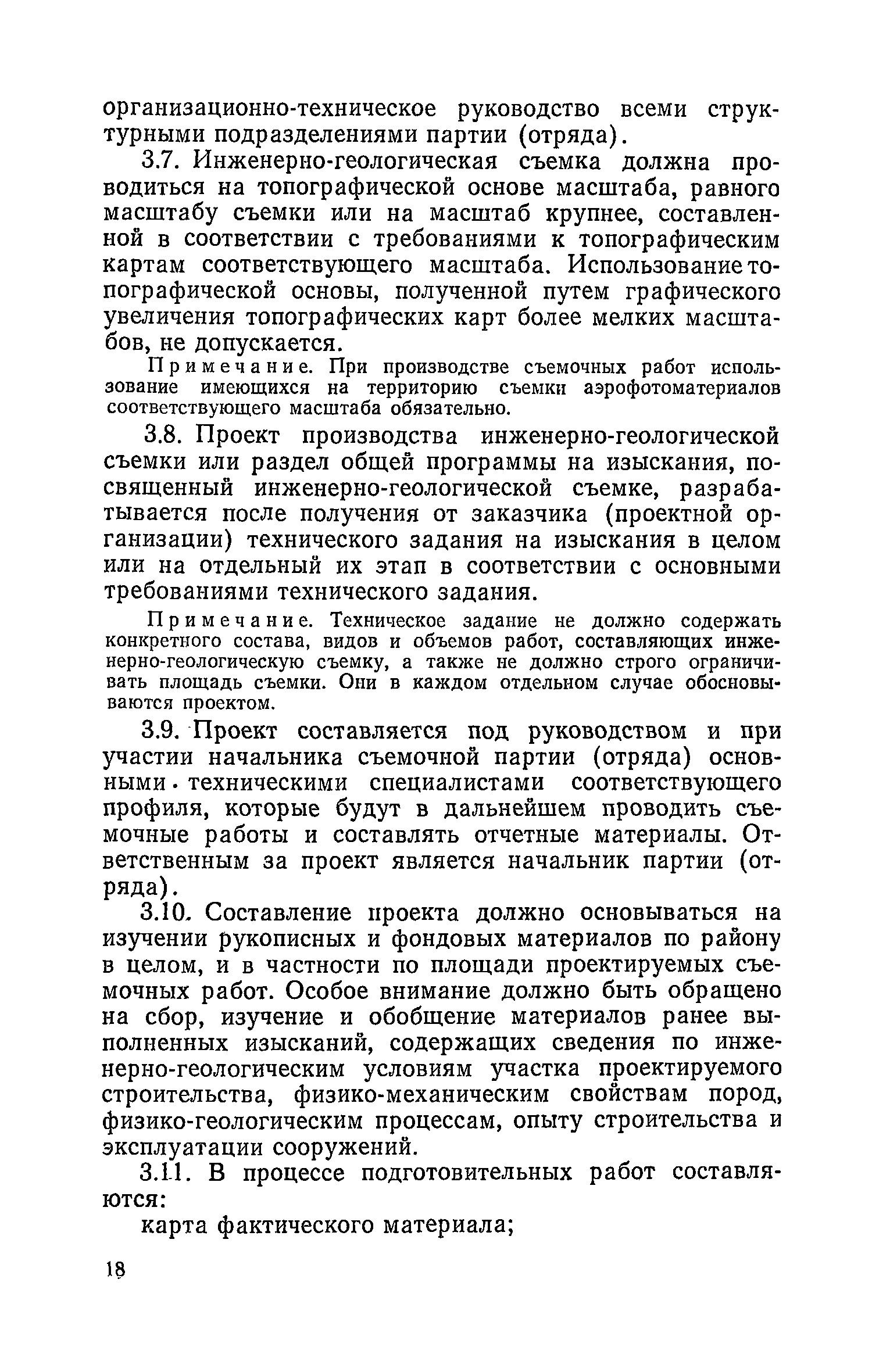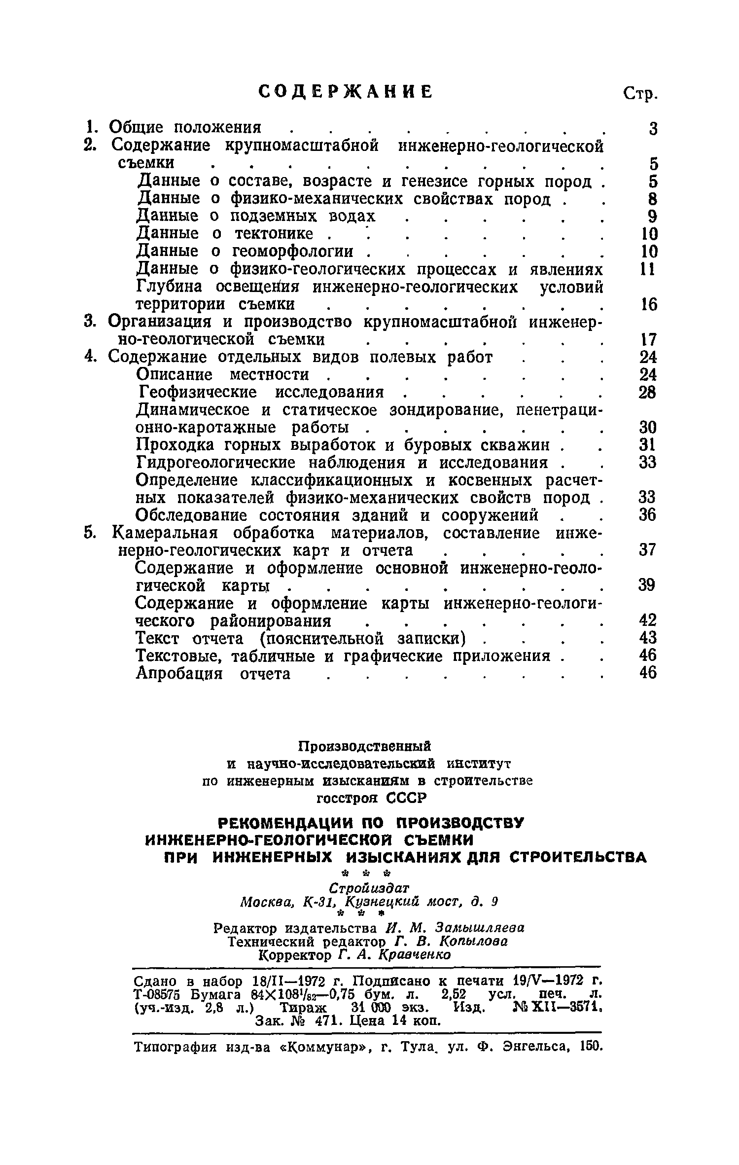 | Оглавление: | 1. Общие положения 2. Содержание крупномасштабной инженерно-геологической съемки Данные о составе, возрасте и генезисе горных пород Данные о физико-механических свойствах пород Данные о подземных водах Данные о тектонике Данные о геоморфологии Данные о физико-геологических процессах и явлениях Глубина освещения инженерно-геологических условий территории съемки 3. Организация и производство крупномасштабной инженерно-геологической съемки 4. Содержание отдельных видов полевых работ Описание местности Геофизические исследования Динамическое и статическое зондирование, пенетрационно-каротажные работы Проходка горных выработок и буровых скважин Гидрогеологические наблюдения и исследования Определение классификационных и косвенных расчетных показателей физико-механических свойств пород Обследование состояния зданий и сооружений 5. Камеральная обработка материалов, составление инженерно-геологических карт и отчета Содержание и оформление основной инженерно-геологической карты Содержание и оформление карты инженерно-геологического районирования Текст отчета (пояснительной записки) Текстовые, табличные и графические приложения Апробация отчета |