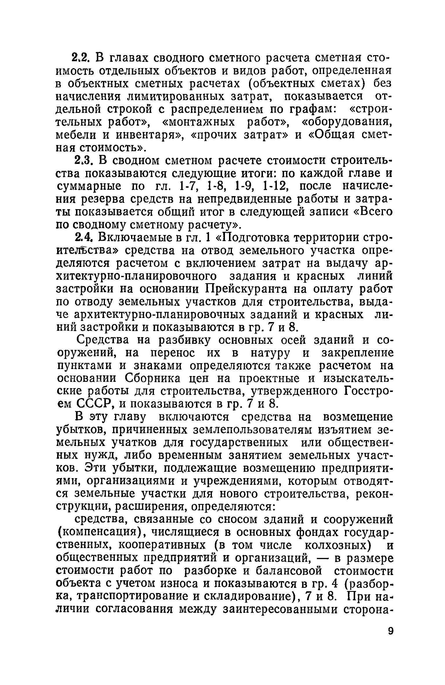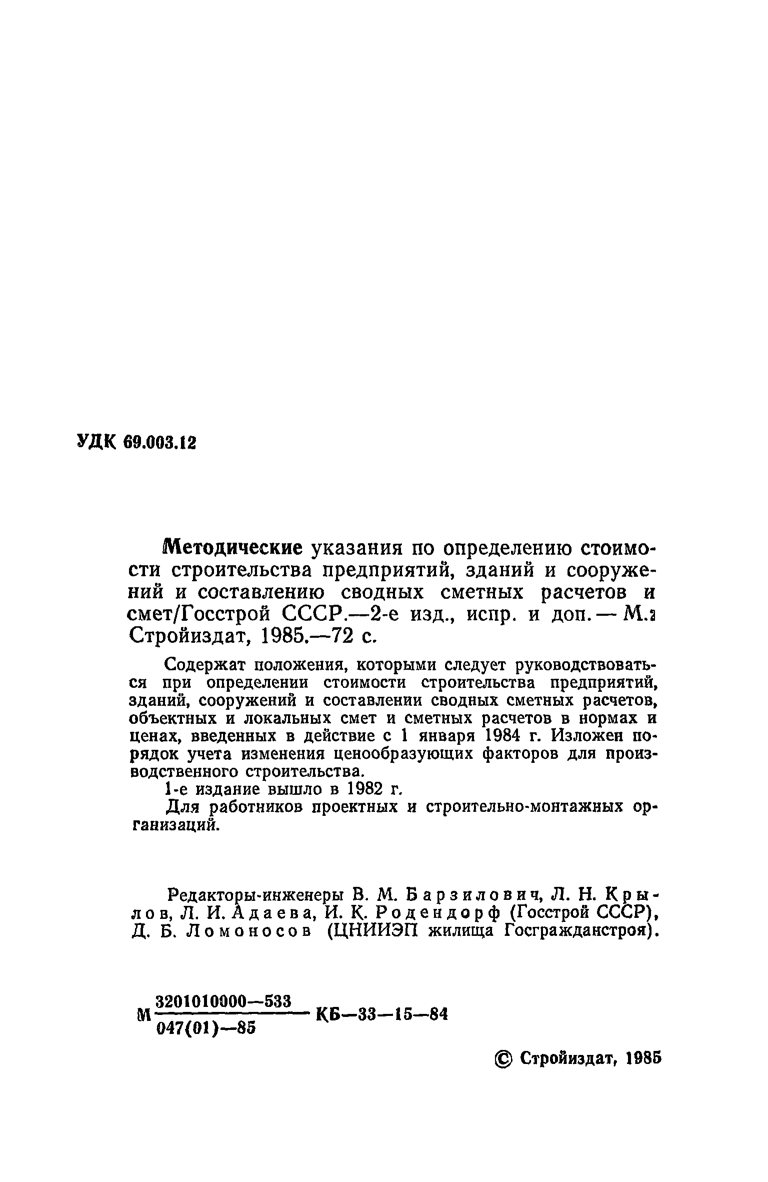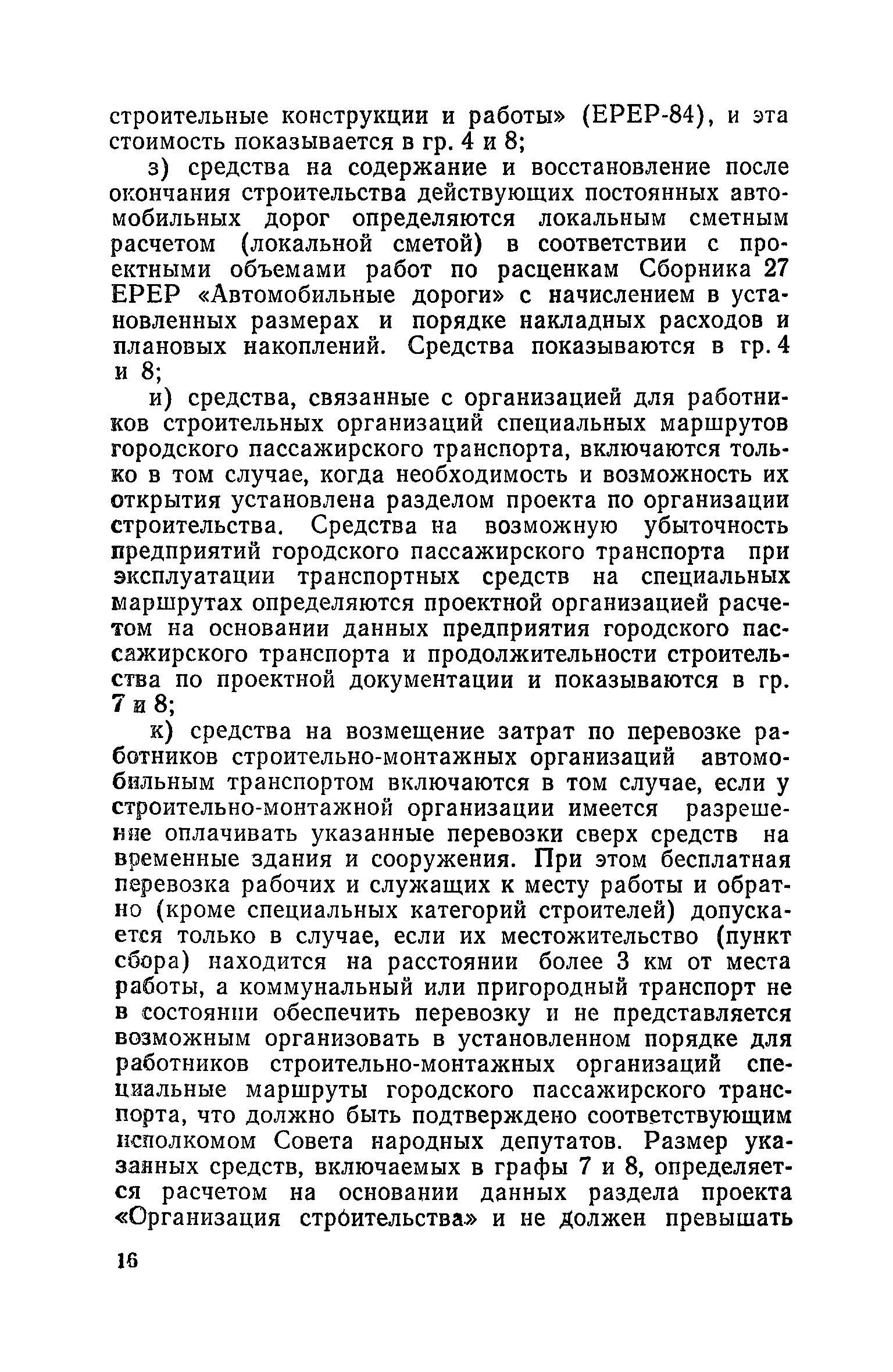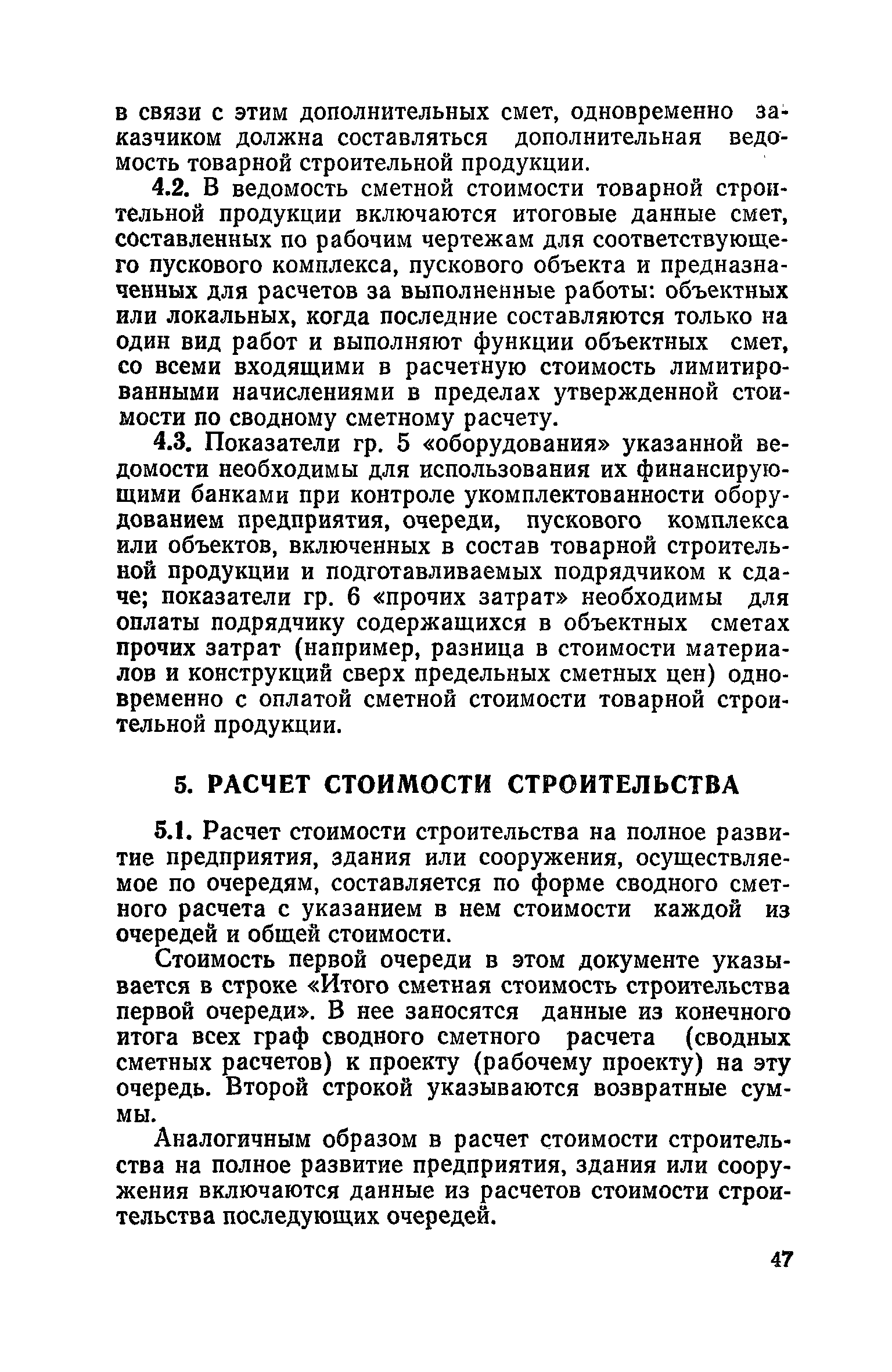 Методические указания по определению стоимости строительства предприятий, зданий и сооружений и составлению сводных сметных расчетов и смет| Статус: | заменен | | Название рус.: | Методические указания по определению стоимости строительства предприятий, зданий и сооружений и составлению сводных сметных расчетов и смет | | Дата добавления в базу: | 01.09.2013 | | Дата актуализации: | 01.01.2021 | | Дата введения: | 01.07.1984 | | Дата окончания срока действия: | 01.04.1994 | | Область применения: | Документ содержит положения, которыми следует руководствоваться при определении стоимости строительства предприятий, зданий, сооружений и составлении сводных сметных расчетов, объектных и локальных смет и сметных расчетов в нормах и ценах, введенных в действие с 1 января 1984 г. Изложен порядок учета изменения ценообразующих факторов для производственного строительства. | | Оглавление: | 1. Общие положения 2. Составление сметной документации Сводный сметный расчет стоимости строительства Сводка затрат Объектные сметы Локальные сметы Объектные и локальные сметные расчеты 3. Ведомость сметной стоимости строительства объектов, входящих в пусковой комплекс 4. Ведомость сметной стоимости товарной строительной продукции 5. Расчет стоимости строительства 6. Контроль за сметной стоимостью в строительстве Приложение 1. Индивидуальная единичная расценка (форма №10) Приложение 2. Индивидуальная расценка на монтаж оборудования (форма №11) Приложение 3. Каталог единичных расценок (форма №12) Приложение 4. Калькуляция стоимости материалов, конструкций и изделий (форма №13) Приложение 5. Калькуляция транспортных расходов на 1 т (форма №14) Приложение 6. Указания по заполнению форм сметной документации Приложение 7. Примерная номенклатура сводного сметного расчета стоимости строительства | | Разработан: | ЦНИИЭП жилища
