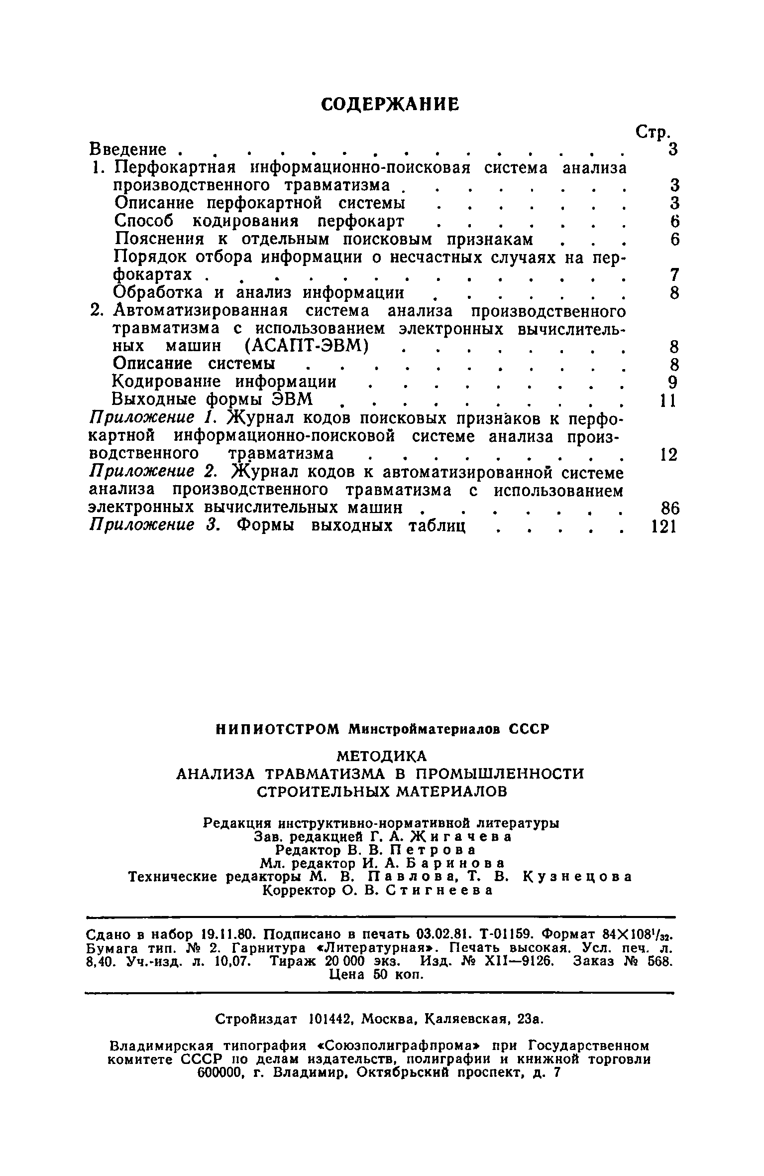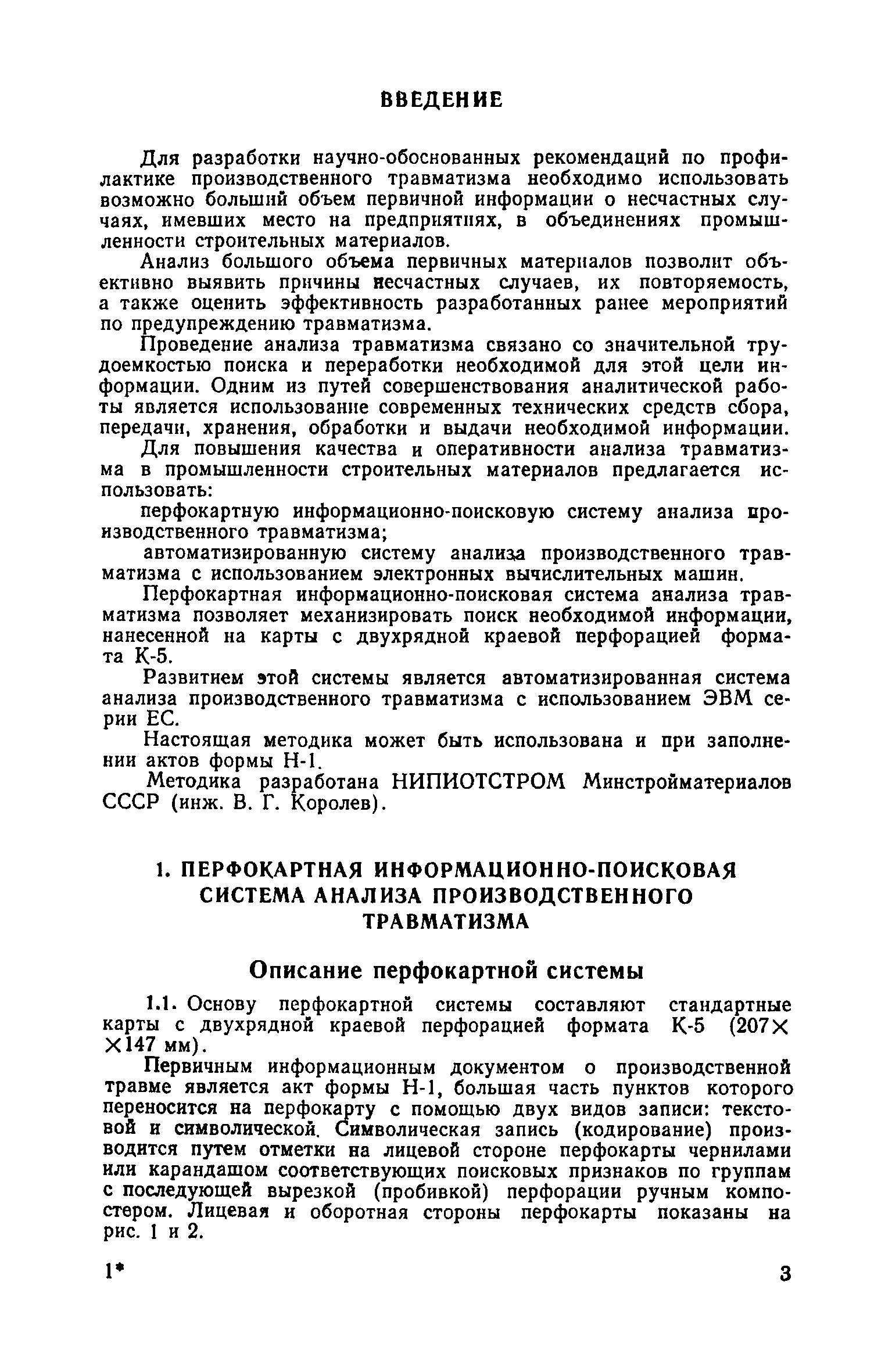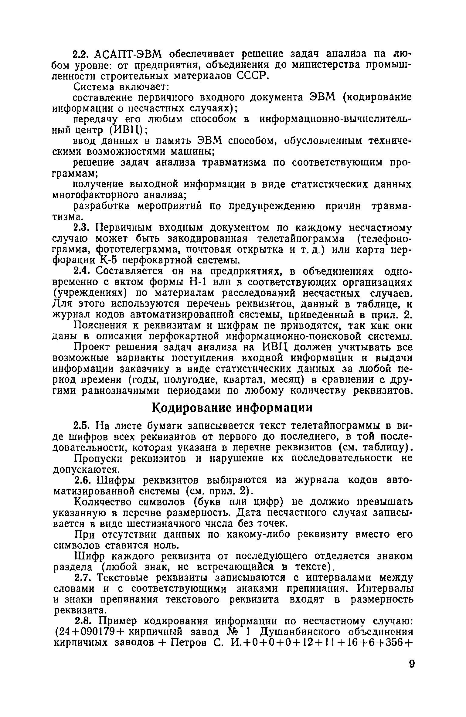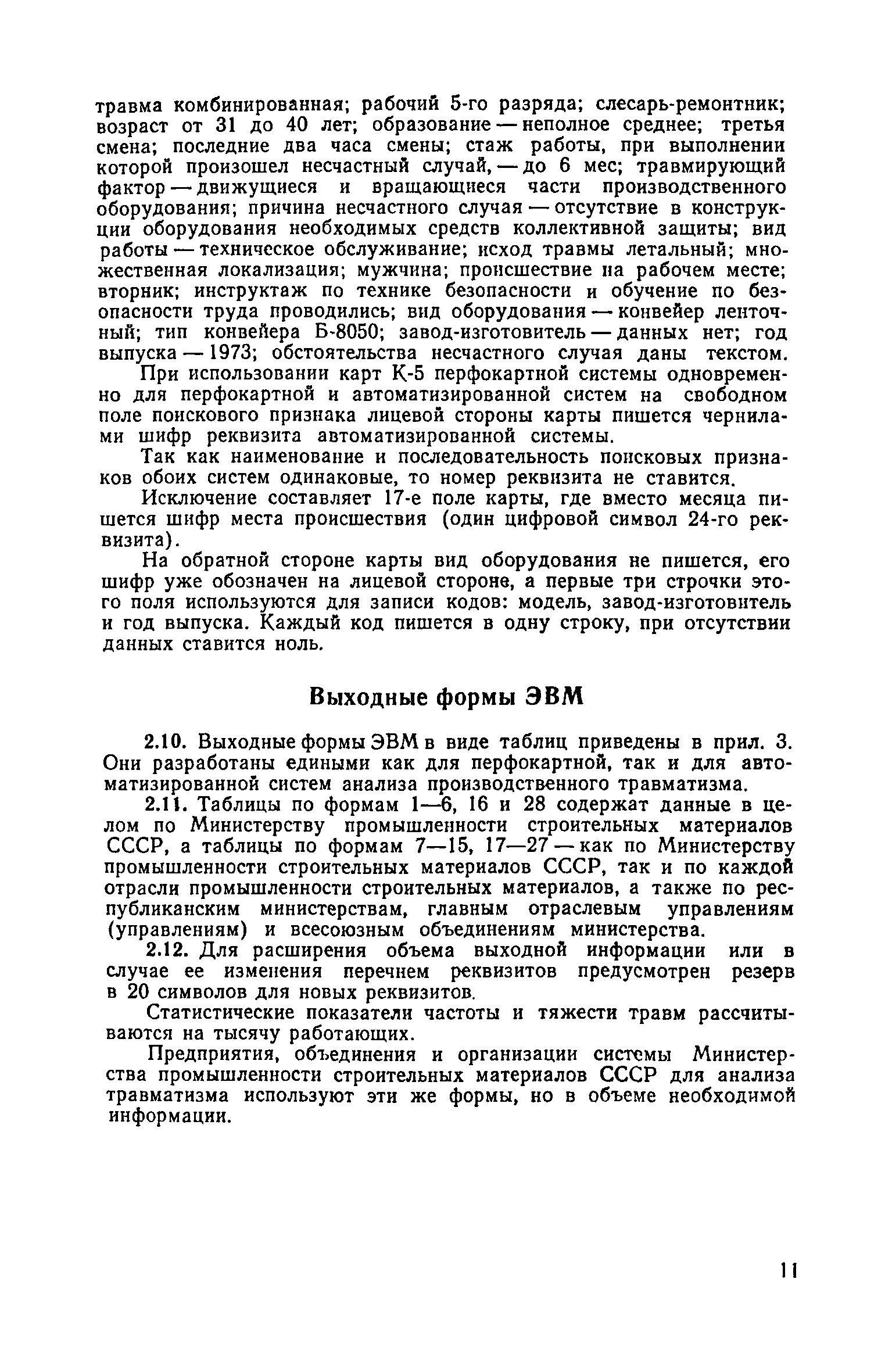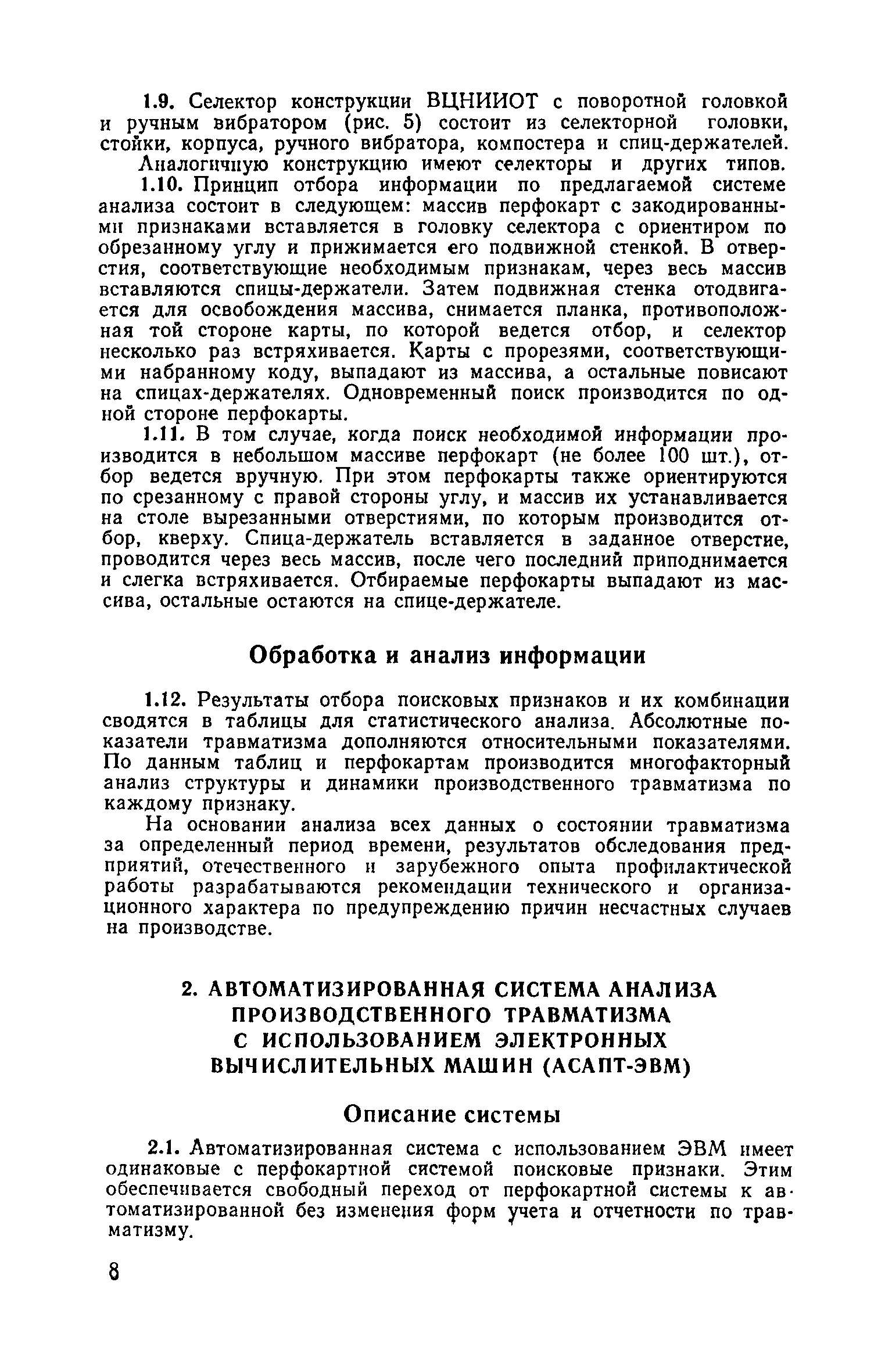| Оглавление: | Введение 1. Перфокартная информационно-поисковая система анализа производственного травматизма Описание перфокартной системы Способ кодирования перфокарт Пояснения к отдельным поисковым признакам Порядок отбора информации о несчастных случаях на перфокартах Обработка и анализ информации 2. Автоматизированная система анализа производственного травматизма с использованием электронных вычислительных машин (АСАПТ-ЭВМ) Описание системы Кодирование информации Выходные ЭВМ Приложение 1. Журнал кодов поисковых признаков к перфокартной информационно-поисковой системе производственного травматизма Приложение 2. Журнал кодов к автоматизированной системе анализа производственного травматизма с использованием электронных вычислительных машин Приложение 3. Формы выходных таблиц |