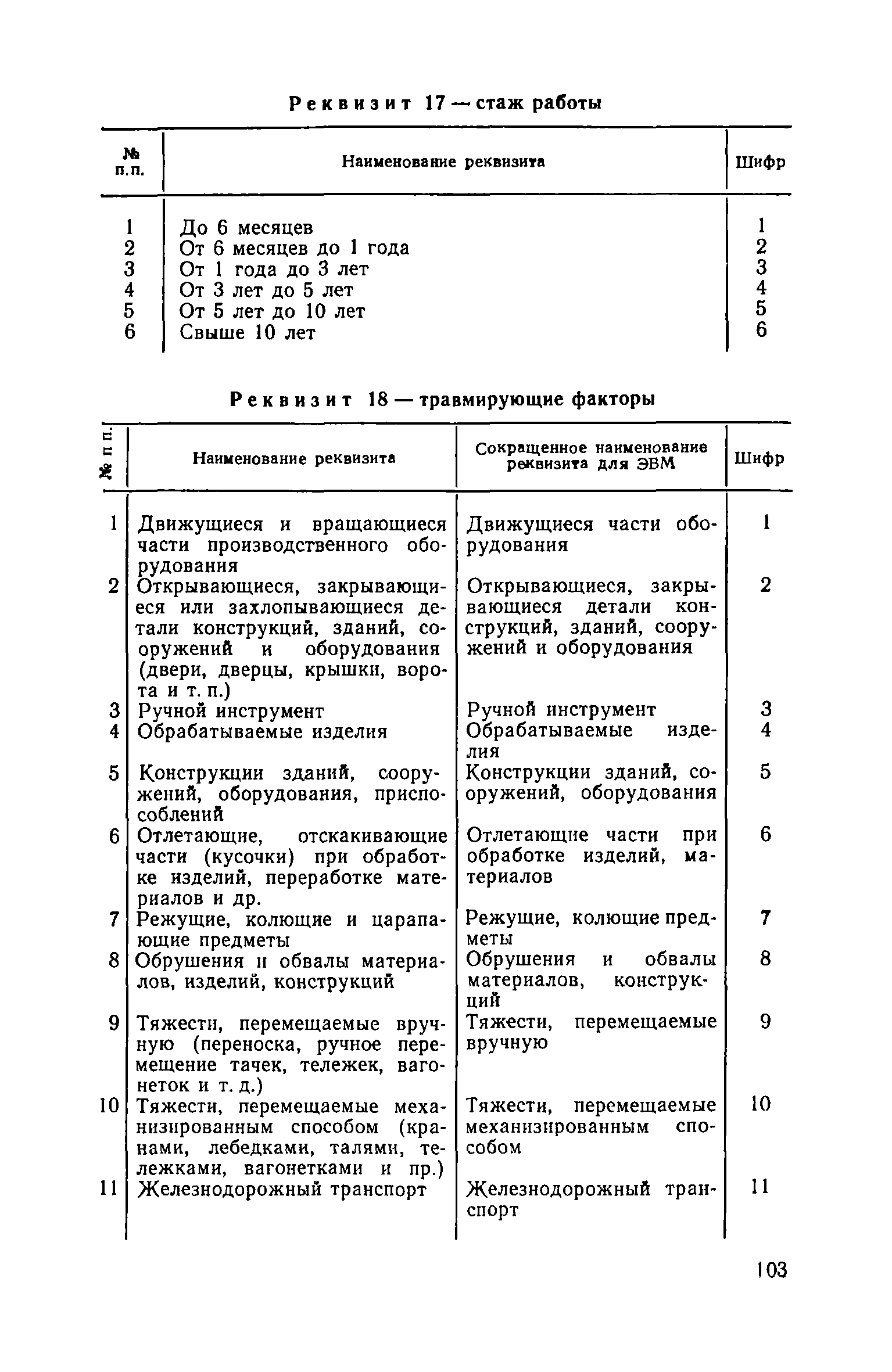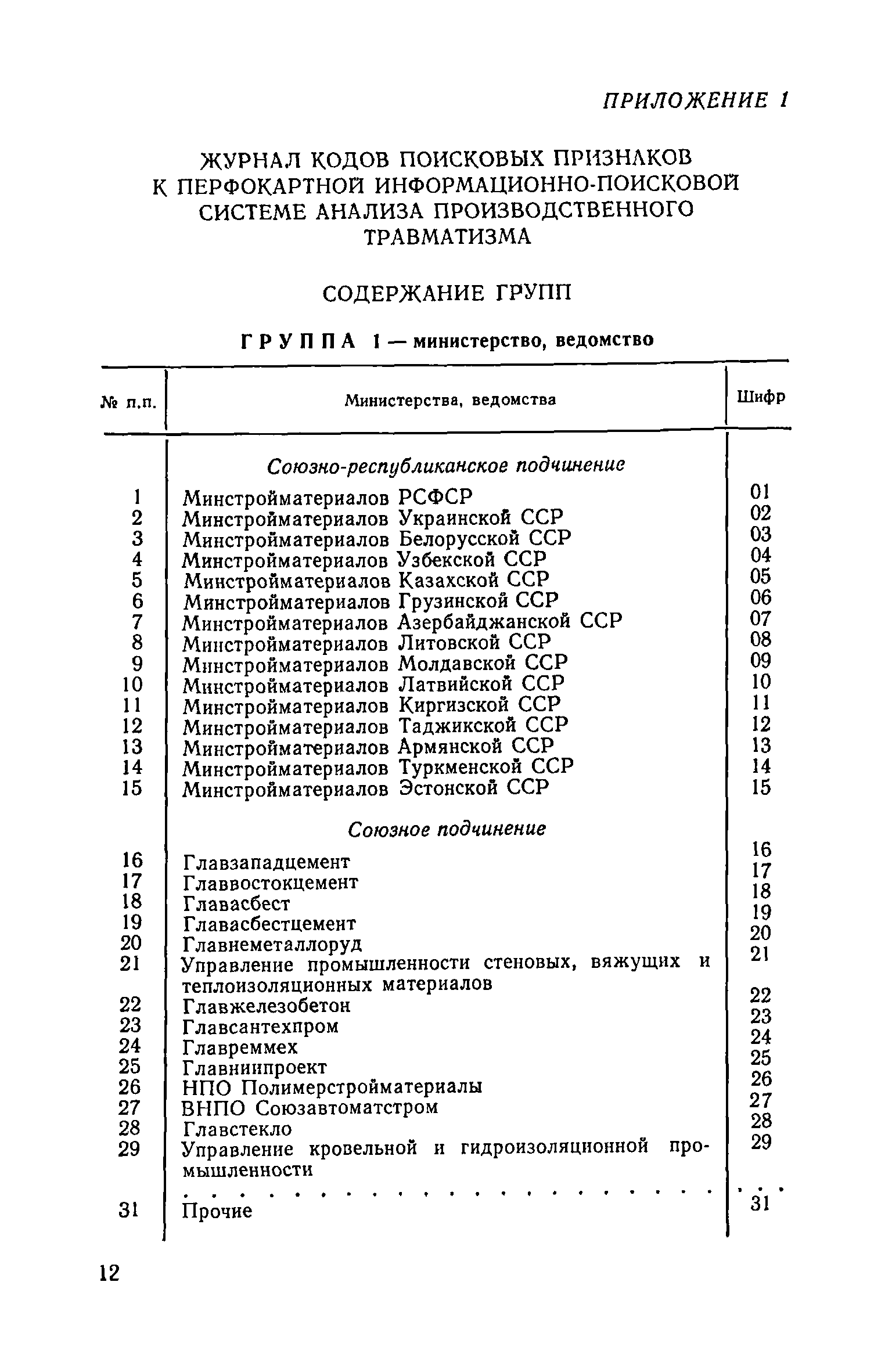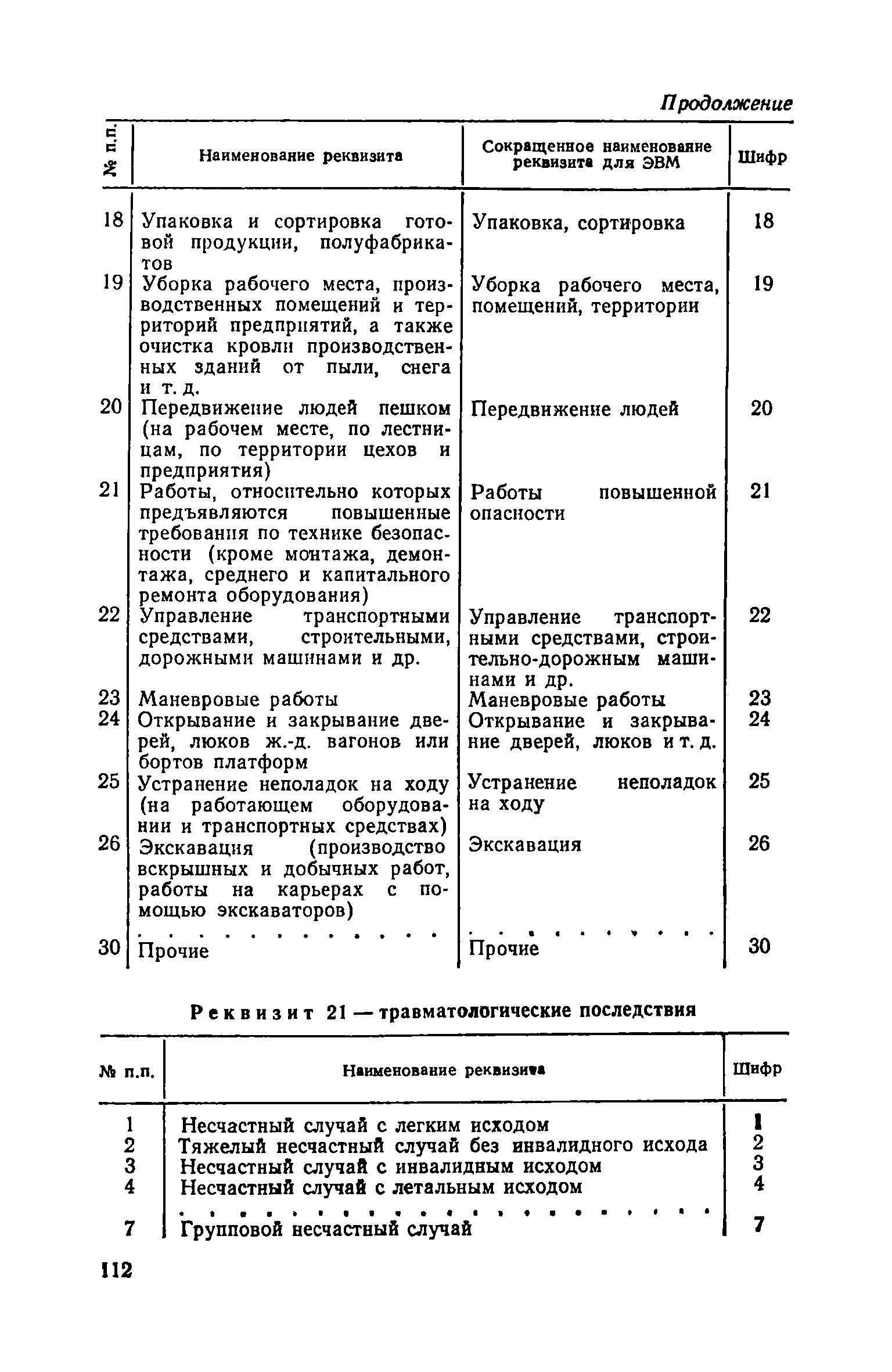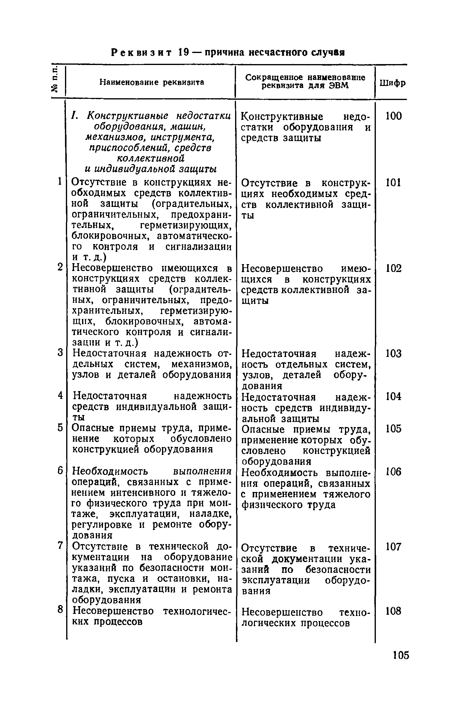 | Оглавление: | Введение 1. Перфокартная информационно-поисковая система анализа производственного травматизма Описание перфокартной системы Способ кодирования перфокарт Пояснения к отдельным поисковым признакам Порядок отбора информации о несчастных случаях на перфокартах Обработка и анализ информации 2. Автоматизированная система анализа производственного травматизма с использованием электронных вычислительных машин (АСАПТ-ЭВМ) Описание системы Кодирование информации Выходные ЭВМ Приложение 1. Журнал кодов поисковых признаков к перфокартной информационно-поисковой системе производственного травматизма Приложение 2. Журнал кодов к автоматизированной системе анализа производственного травматизма с использованием электронных вычислительных машин Приложение 3. Формы выходных таблиц |