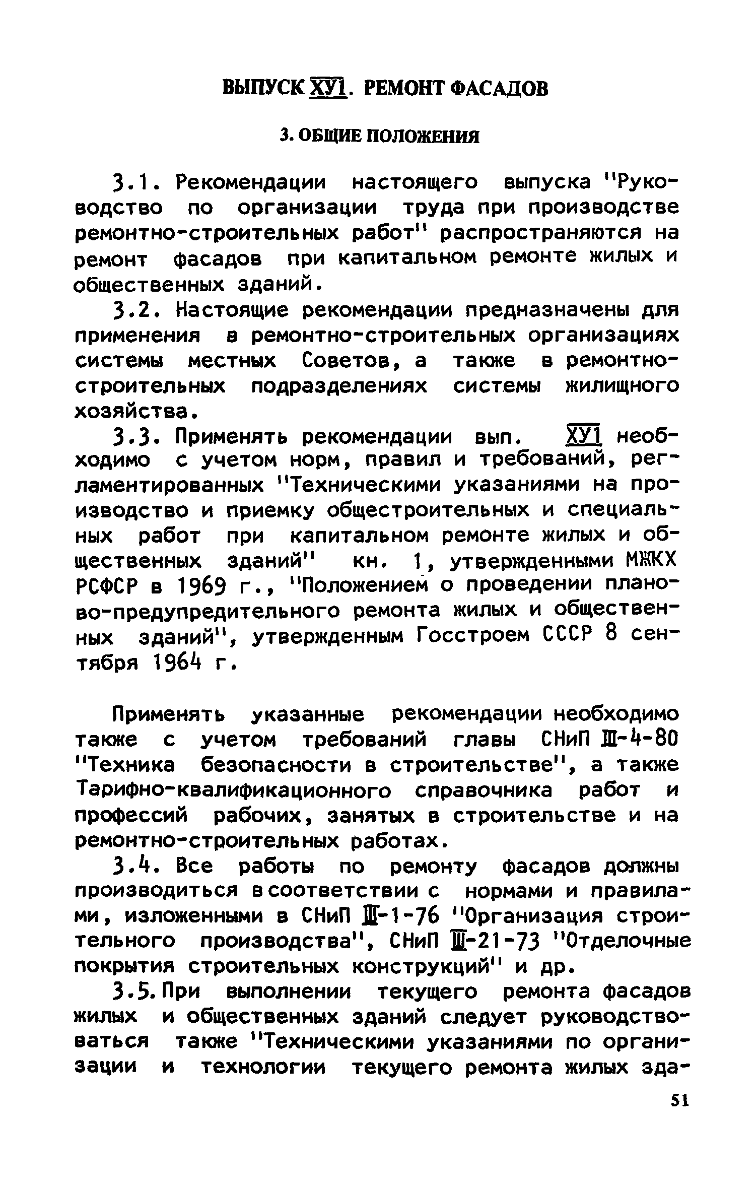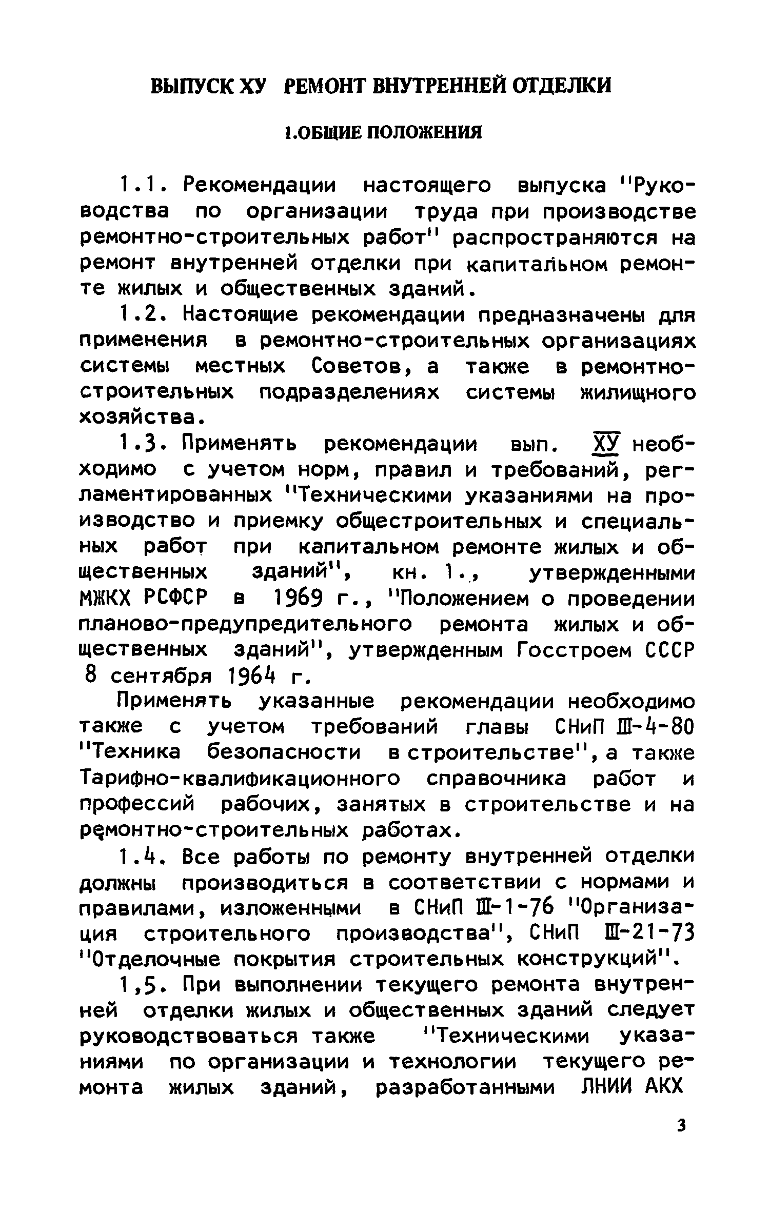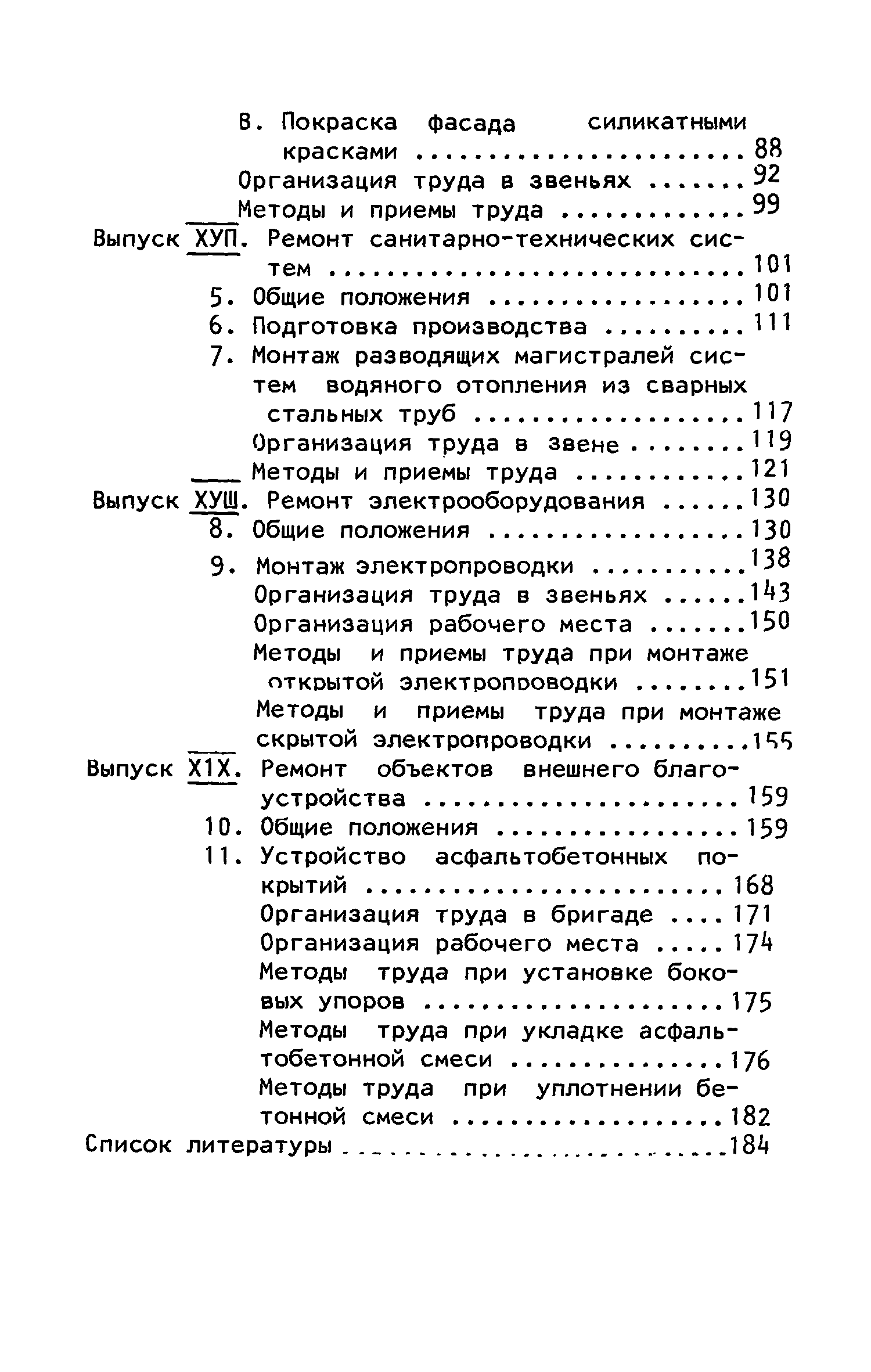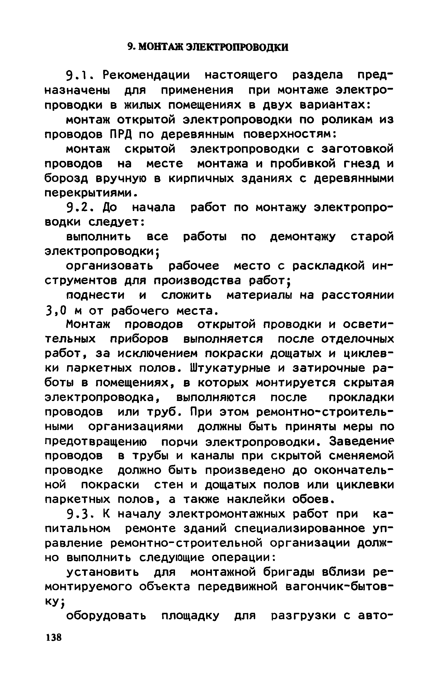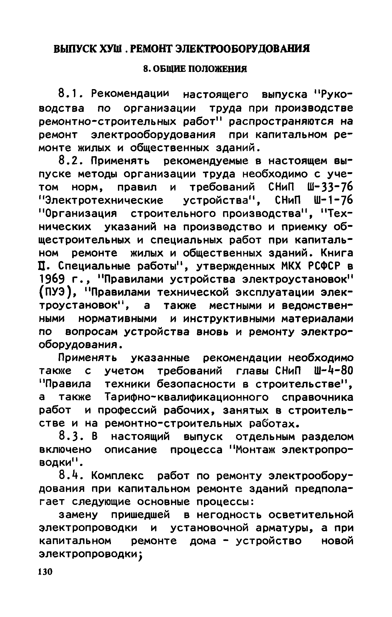 Руководство по организации труда при производстве ремонтно-строительных работ. Часть III. Ремонт внутренней отделки и фасадов, санитарно-технических систем, электрооборудования и объектов внешнего благоустройства| Статус: | действует | | Название рус.: | Руководство по организации труда при производстве ремонтно-строительных работ. Часть III. Ремонт внутренней отделки и фасадов, санитарно-технических систем, электрооборудования и объектов внешнего благоустройства | | Дата добавления в базу: | 01.09.2013 | | Дата актуализации: | 01.01.2021 | | Область применения: | В документе даны рекомендации по оптимальной структуре и оснащению строительных звеньев и бригад инструментами, приспособлениями, механизмами и специальным оборудованием | | Оглавление: | Выпуск XV. Ремонт внутренней отделки 1. Общие положения 2. Производство улучшенной штукатурки механизированным способом Организация труда в звеньях Организация и обслуживание рабочих мест Методы и приемы труда Выпуск XVI. Ремонт фасадов 3. Общие положения Техника безопасности 4. Ремонт и покраска фасадов зданий силикатными красками А. Подготовка поверхности фасадов к оштукатуриванию Организация труда в звеньях Организация рабочих мест Методы труда Б. Ремонт штукатурки Организация труда в звеньях и бригадах Организация рабочих мест Методы и приемы труда В. Покраска фасада силикатными красками Организация труда в звеньях Методы и приемы труда Выпуск XVII. Ремонт санитарно-технических систем 5. Общие положения 6. Подготовка производства 7. Монтаж разводящих магистралей систем водяного отопления из сварных стальных труб Организация труда в звене Методы и приемы труда Выпуск XVIII. Ремонт электрооборудования 8. Общие положения 9. Монтаж электропроводки Организация труда в звеньях Организация рабочего места Методы и приемы труда при монтаже открытой электропроводки Методы и приемы труда при монтаже скрытой электропроводки Выпуск XIX. Ремонт объектов внешнего благоустройства 10. Общие положения 11. Устройство асфальтобетонных покрытий Организация труда в бригаде Организация рабочего места Методы труда при установке боковых упоров Методы труда при укладке асфальтобетонной смеси Методы труда при уплотнении бетонной смеси Список литературы | | Разработан: | ЛНИИ АКХ им. К.Д. Памфилова Минжилкомхоза РСФСР
