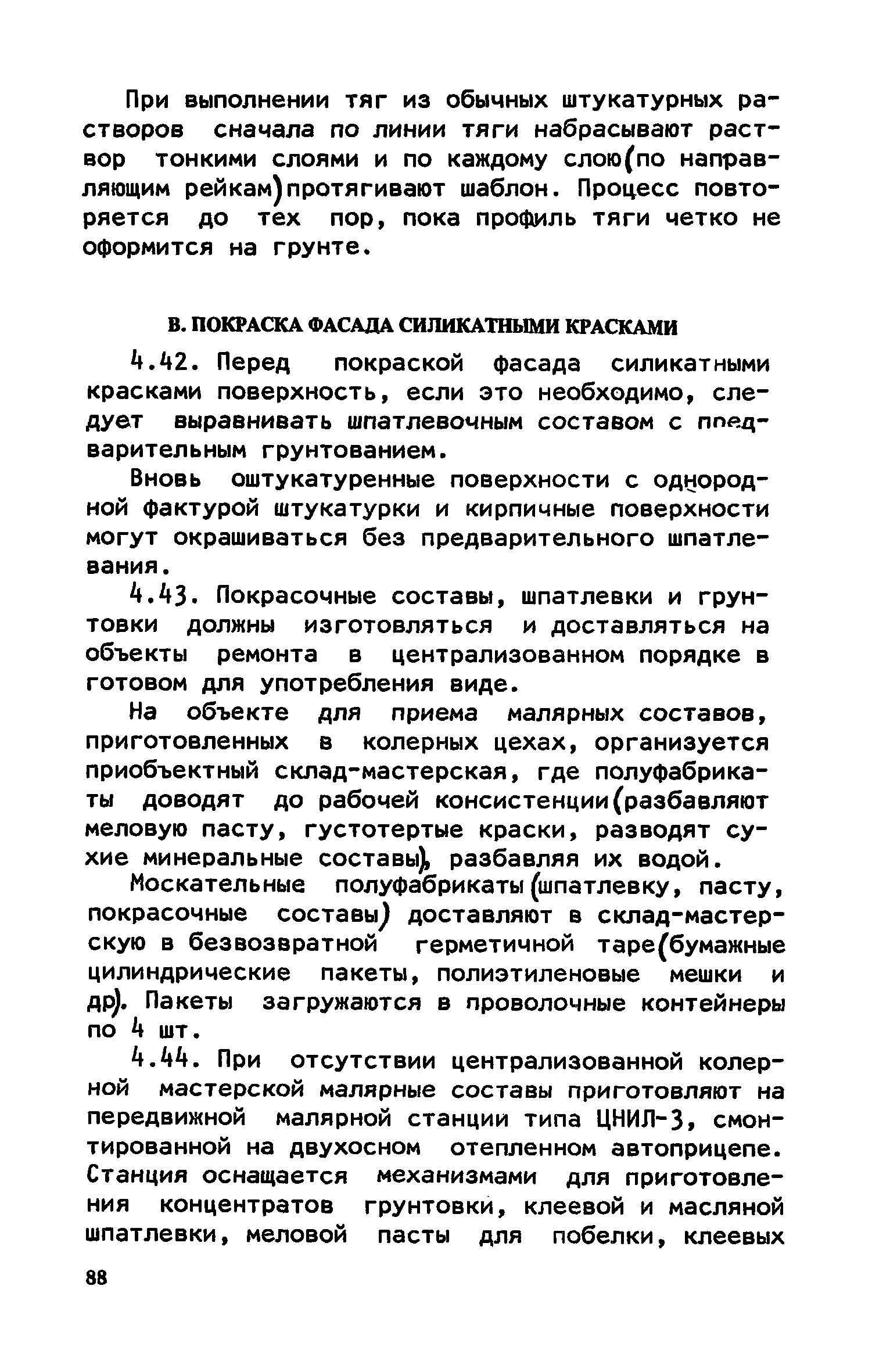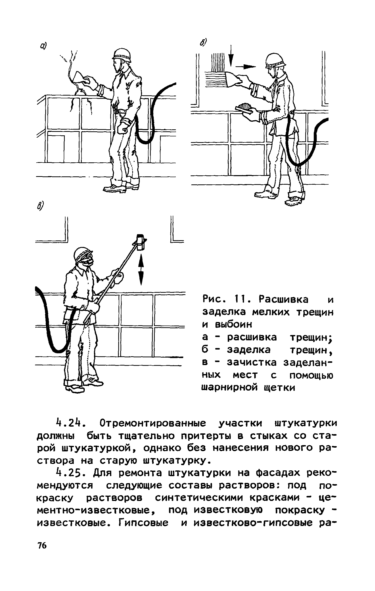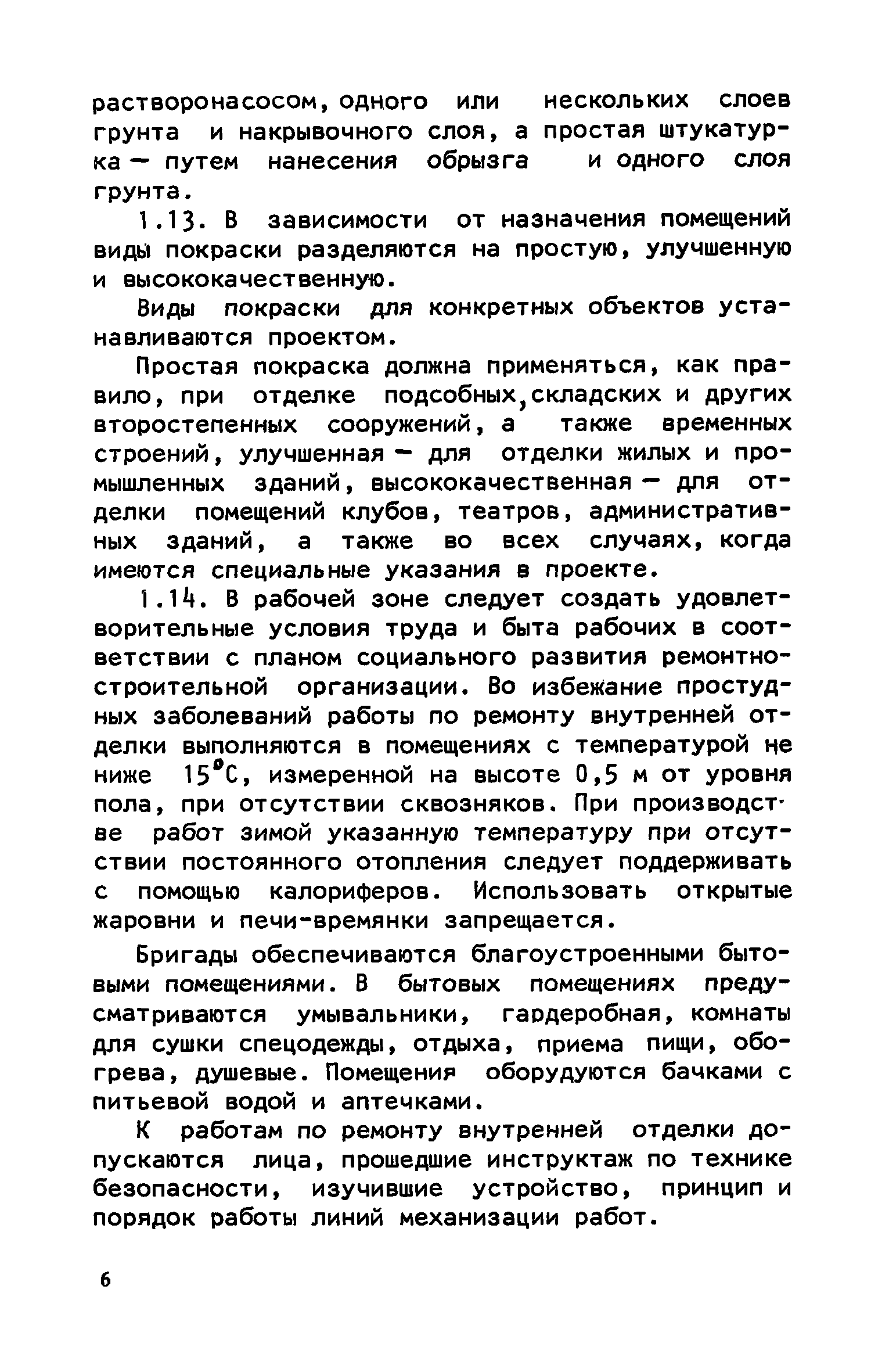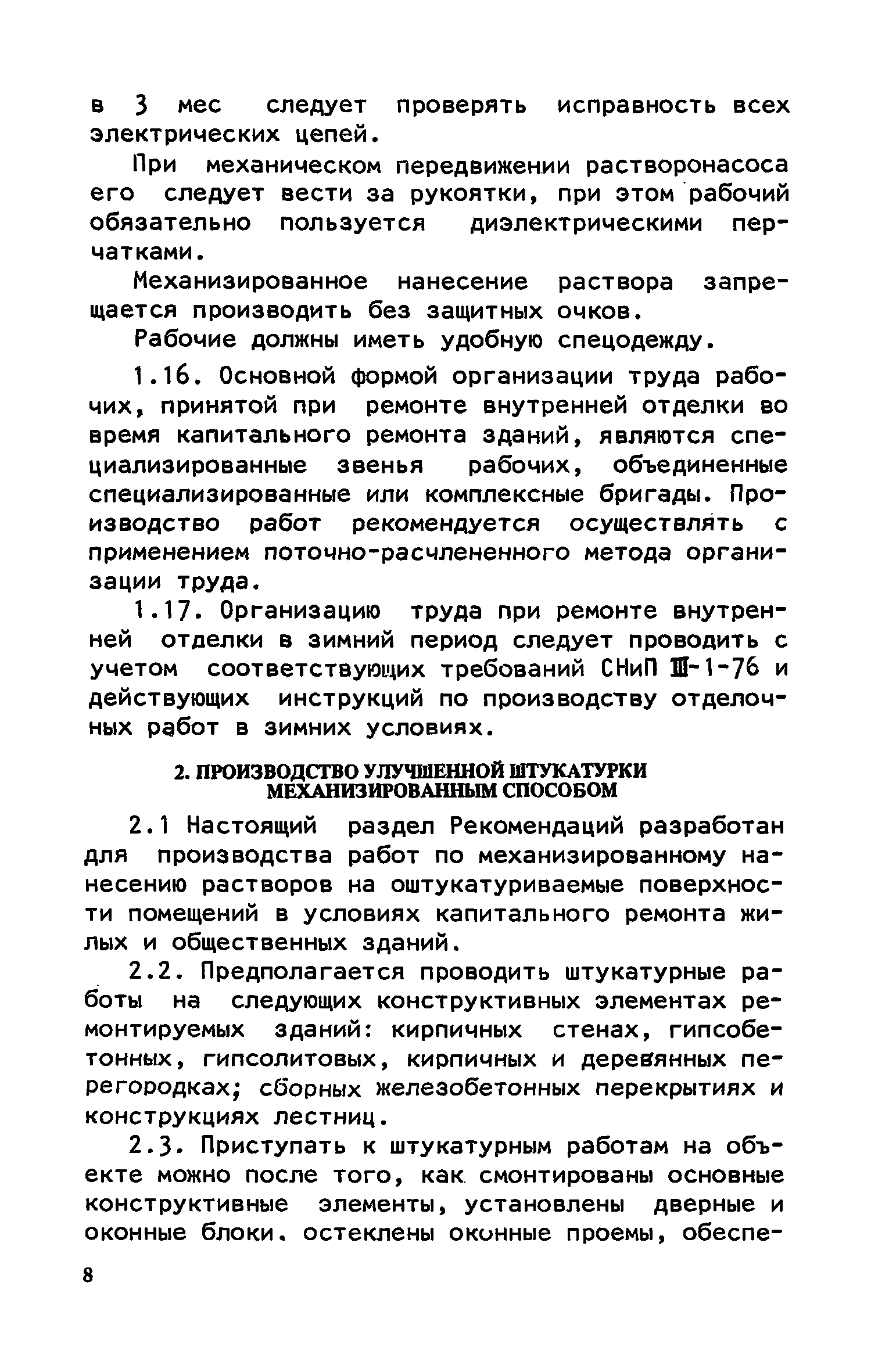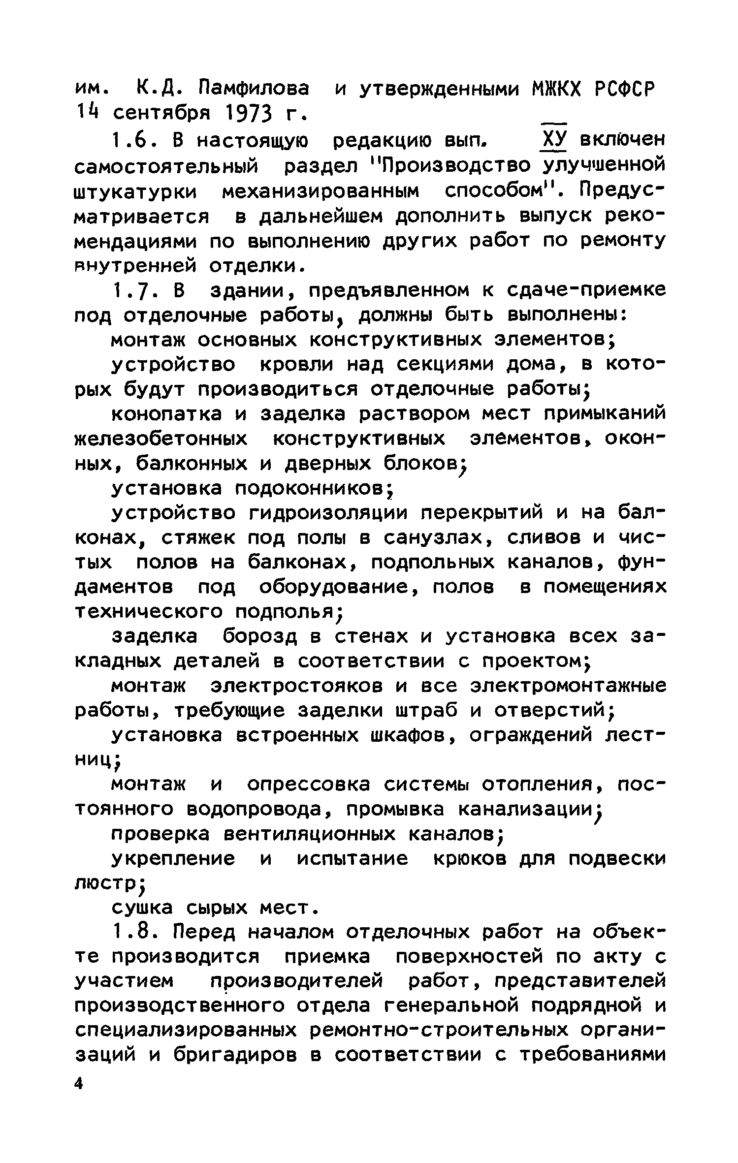 Руководство по организации труда при производстве ремонтно-строительных работ. Часть III. Ремонт внутренней отделки и фасадов, санитарно-технических систем, электрооборудования и объектов внешнего благоустройства| Статус: | действует | | Название рус.: | Руководство по организации труда при производстве ремонтно-строительных работ. Часть III. Ремонт внутренней отделки и фасадов, санитарно-технических систем, электрооборудования и объектов внешнего благоустройства | | Дата добавления в базу: | 01.09.2013 | | Дата актуализации: | 01.01.2021 | | Область применения: | В документе даны рекомендации по оптимальной структуре и оснащению строительных звеньев и бригад инструментами, приспособлениями, механизмами и специальным оборудованием | | Оглавление: | Выпуск XV. Ремонт внутренней отделки 1. Общие положения 2. Производство улучшенной штукатурки механизированным способом Организация труда в звеньях Организация и обслуживание рабочих мест Методы и приемы труда Выпуск XVI. Ремонт фасадов 3. Общие положения Техника безопасности 4. Ремонт и покраска фасадов зданий силикатными красками А. Подготовка поверхности фасадов к оштукатуриванию Организация труда в звеньях Организация рабочих мест Методы труда Б. Ремонт штукатурки Организация труда в звеньях и бригадах Организация рабочих мест Методы и приемы труда В. Покраска фасада силикатными красками Организация труда в звеньях Методы и приемы труда Выпуск XVII. Ремонт санитарно-технических систем 5. Общие положения 6. Подготовка производства 7. Монтаж разводящих магистралей систем водяного отопления из сварных стальных труб Организация труда в звене Методы и приемы труда Выпуск XVIII. Ремонт электрооборудования 8. Общие положения 9. Монтаж электропроводки Организация труда в звеньях Организация рабочего места Методы и приемы труда при монтаже открытой электропроводки Методы и приемы труда при монтаже скрытой электропроводки Выпуск XIX. Ремонт объектов внешнего благоустройства 10. Общие положения 11. Устройство асфальтобетонных покрытий Организация труда в бригаде Организация рабочего места Методы труда при установке боковых упоров Методы труда при укладке асфальтобетонной смеси Методы труда при уплотнении бетонной смеси Список литературы | | Разработан: | ЛНИИ АКХ им. К.Д. Памфилова Минжилкомхоза РСФСР