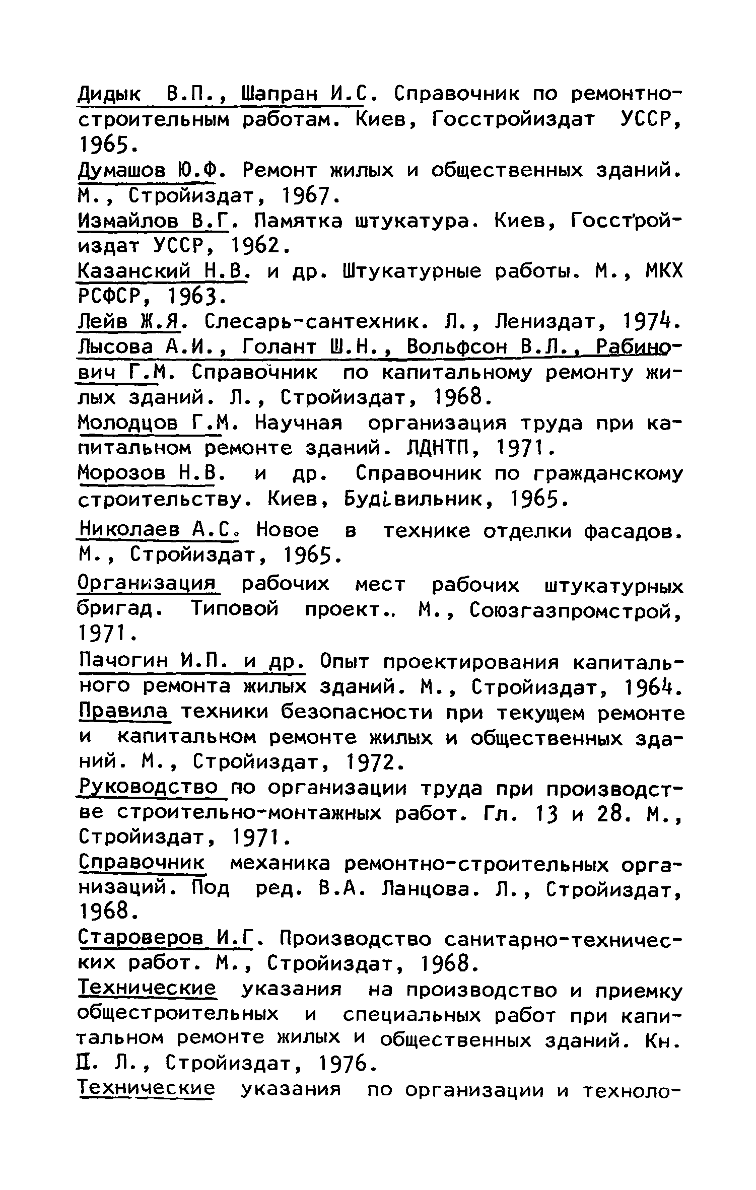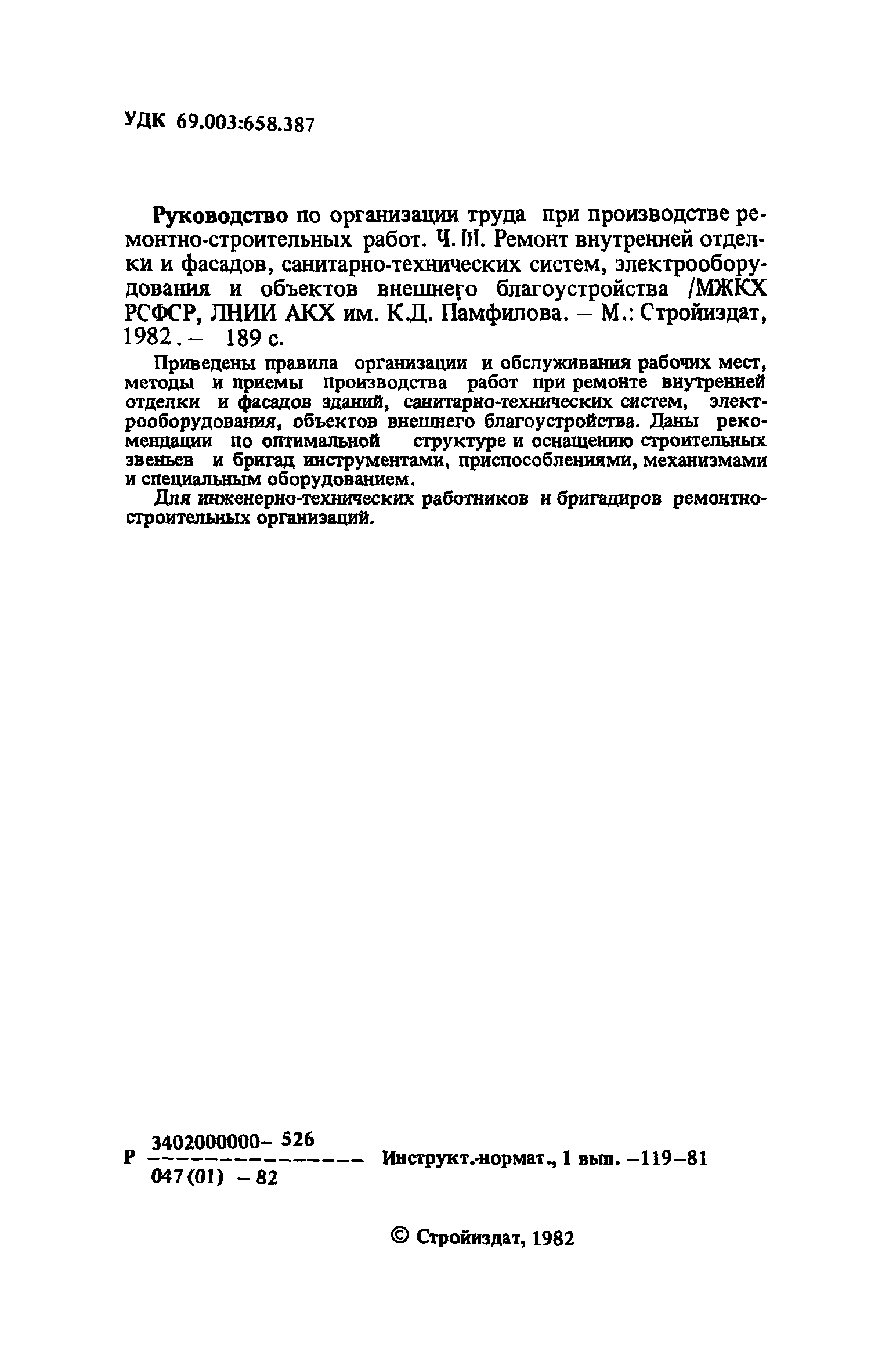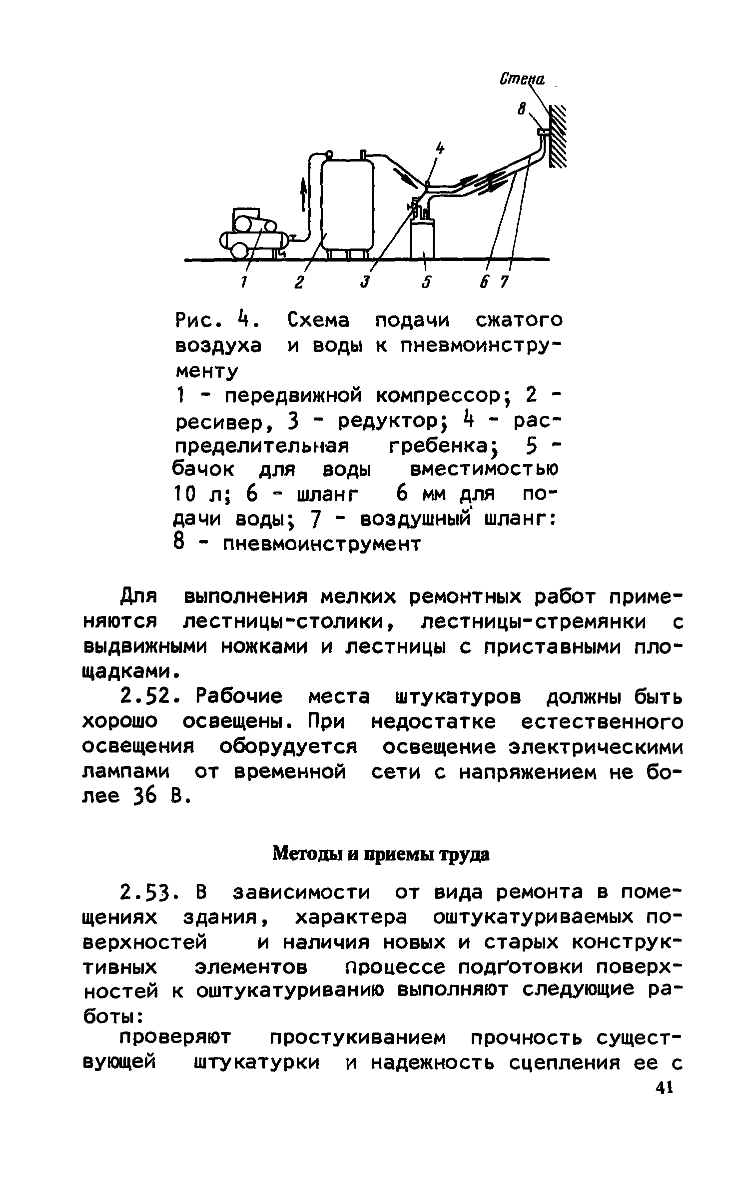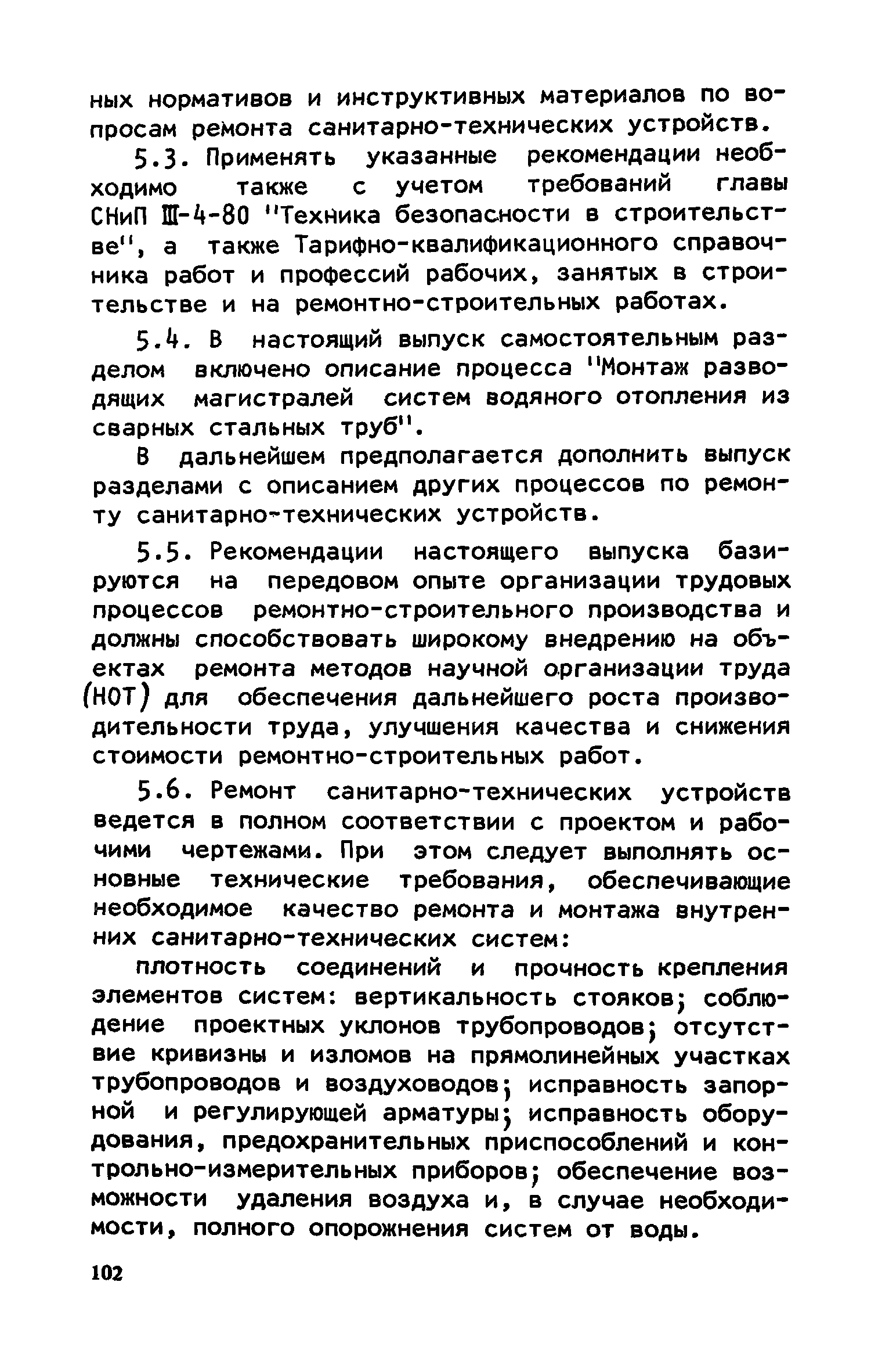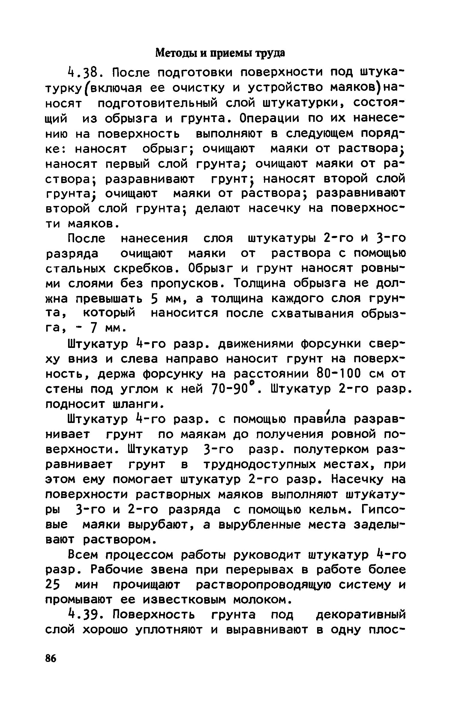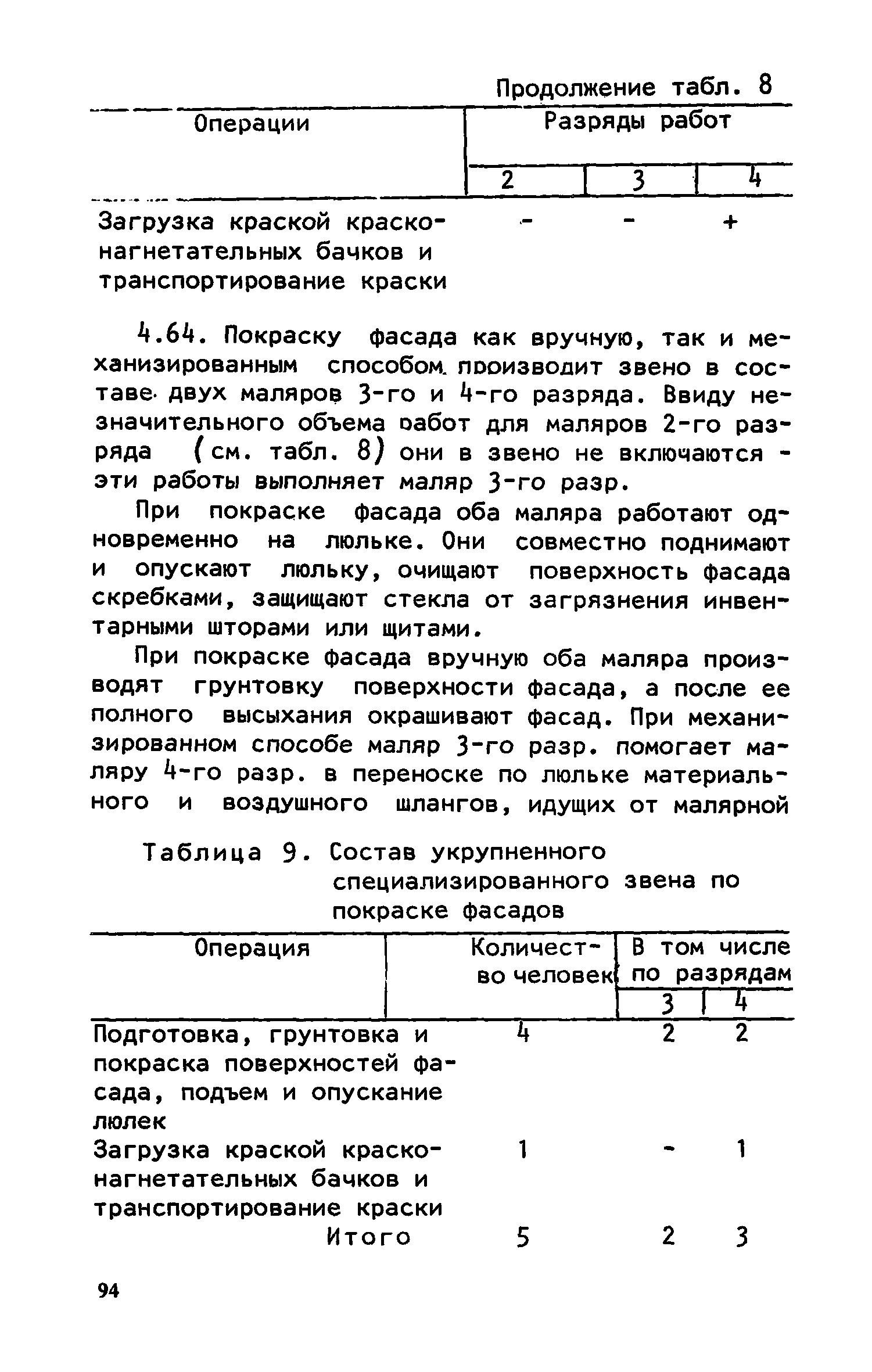 Руководство по организации труда при производстве ремонтно-строительных работ. Часть III. Ремонт внутренней отделки и фасадов, санитарно-технических систем, электрооборудования и объектов внешнего благоустройства| Статус: | действует | | Название рус.: | Руководство по организации труда при производстве ремонтно-строительных работ. Часть III. Ремонт внутренней отделки и фасадов, санитарно-технических систем, электрооборудования и объектов внешнего благоустройства | | Дата добавления в базу: | 01.09.2013 | | Дата актуализации: | 01.01.2021 | | Область применения: | В документе даны рекомендации по оптимальной структуре и оснащению строительных звеньев и бригад инструментами, приспособлениями, механизмами и специальным оборудованием | | Оглавление: | Выпуск XV. Ремонт внутренней отделки 1. Общие положения 2. Производство улучшенной штукатурки механизированным способом Организация труда в звеньях Организация и обслуживание рабочих мест Методы и приемы труда Выпуск XVI. Ремонт фасадов 3. Общие положения Техника безопасности 4. Ремонт и покраска фасадов зданий силикатными красками А. Подготовка поверхности фасадов к оштукатуриванию Организация труда в звеньях Организация рабочих мест Методы труда Б. Ремонт штукатурки Организация труда в звеньях и бригадах Организация рабочих мест Методы и приемы труда В. Покраска фасада силикатными красками Организация труда в звеньях Методы и приемы труда Выпуск XVII. Ремонт санитарно-технических систем 5. Общие положения 6. Подготовка производства 7. Монтаж разводящих магистралей систем водяного отопления из сварных стальных труб Организация труда в звене Методы и приемы труда Выпуск XVIII. Ремонт электрооборудования 8. Общие положения 9. Монтаж электропроводки Организация труда в звеньях Организация рабочего места Методы и приемы труда при монтаже открытой электропроводки Методы и приемы труда при монтаже скрытой электропроводки Выпуск XIX. Ремонт объектов внешнего благоустройства 10. Общие положения 11. Устройство асфальтобетонных покрытий Организация труда в бригаде Организация рабочего места Методы труда при установке боковых упоров Методы труда при укладке асфальтобетонной смеси Методы труда при уплотнении бетонной смеси Список литературы | | Разработан: | ЛНИИ АКХ им. К.Д. Памфилова Минжилкомхоза РСФСР