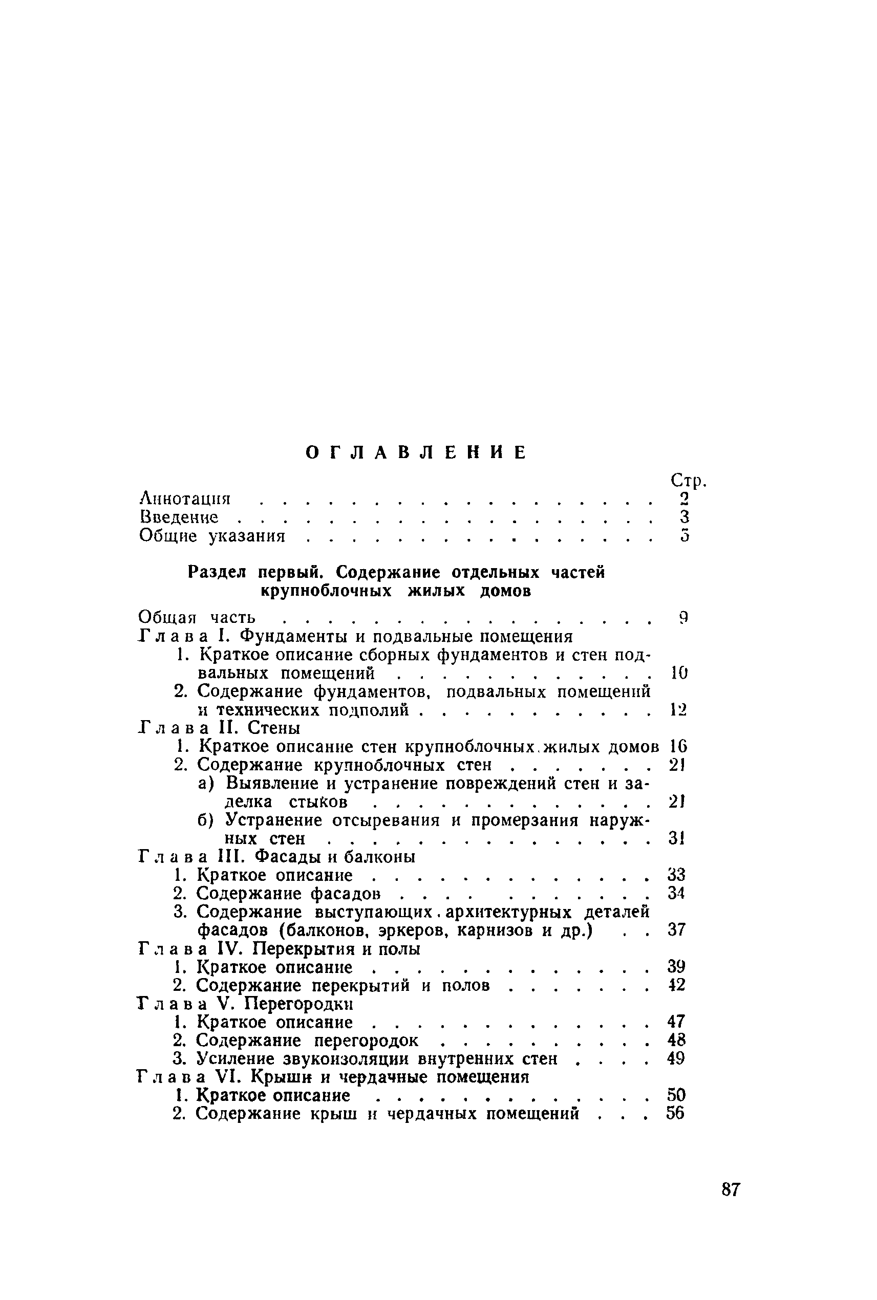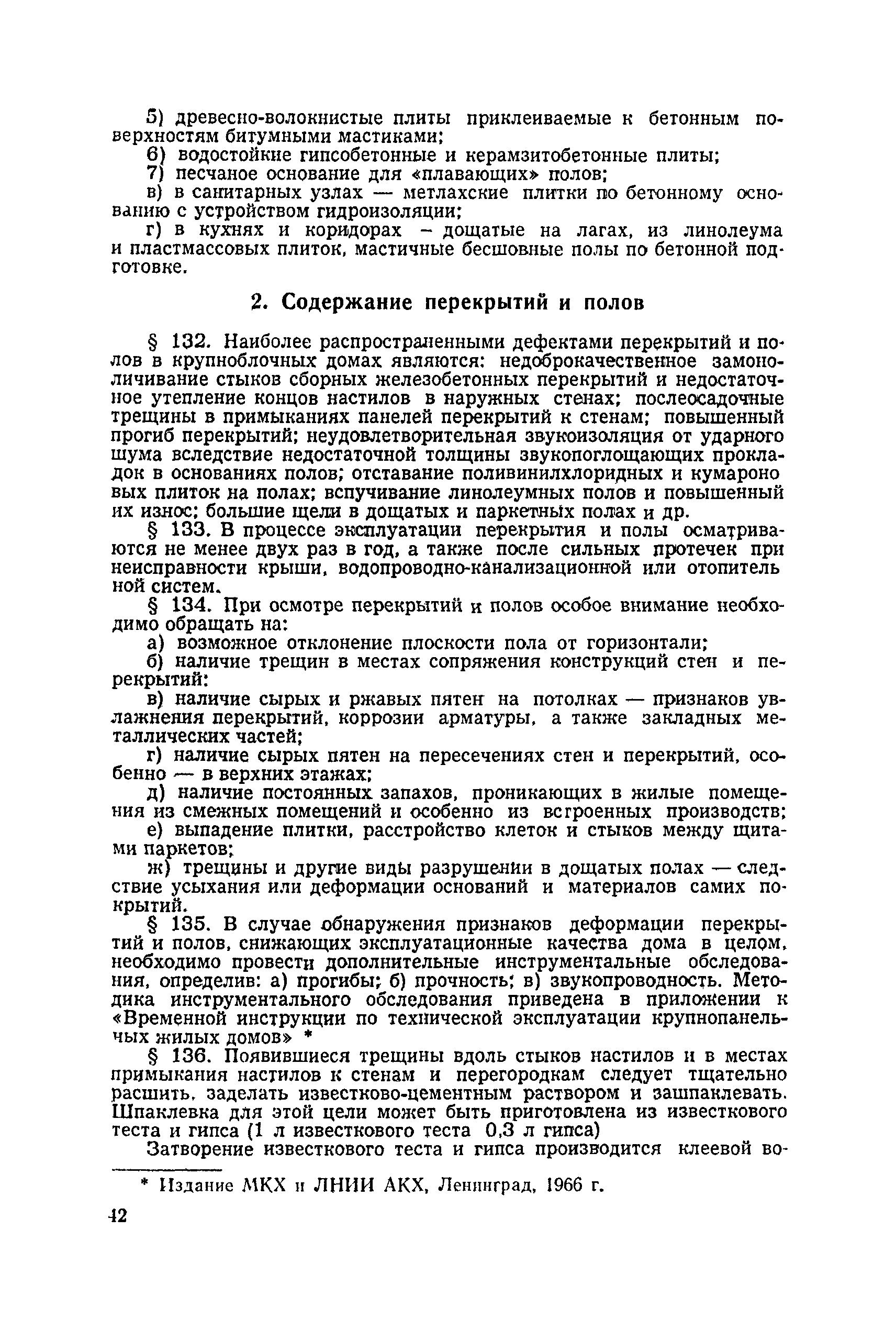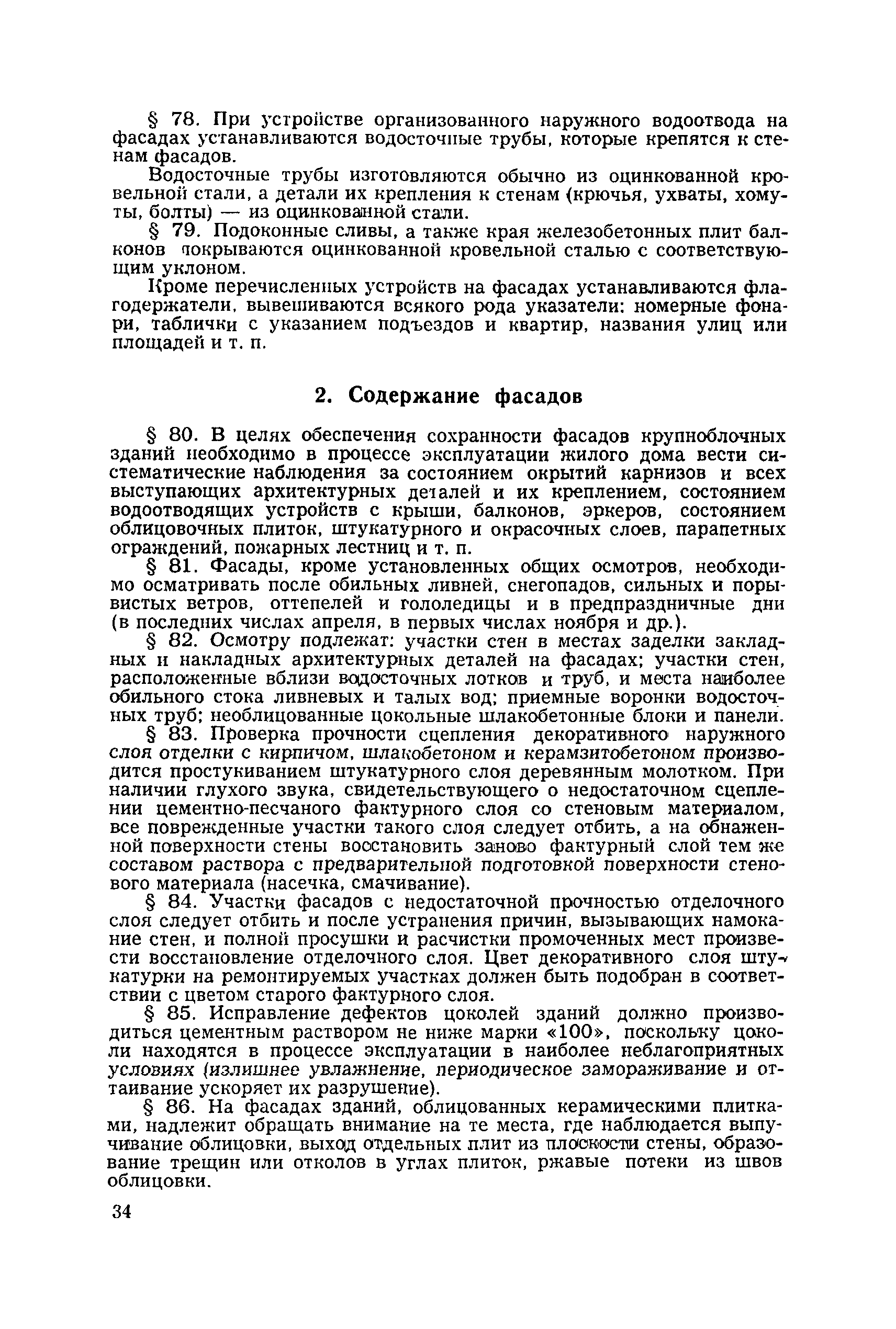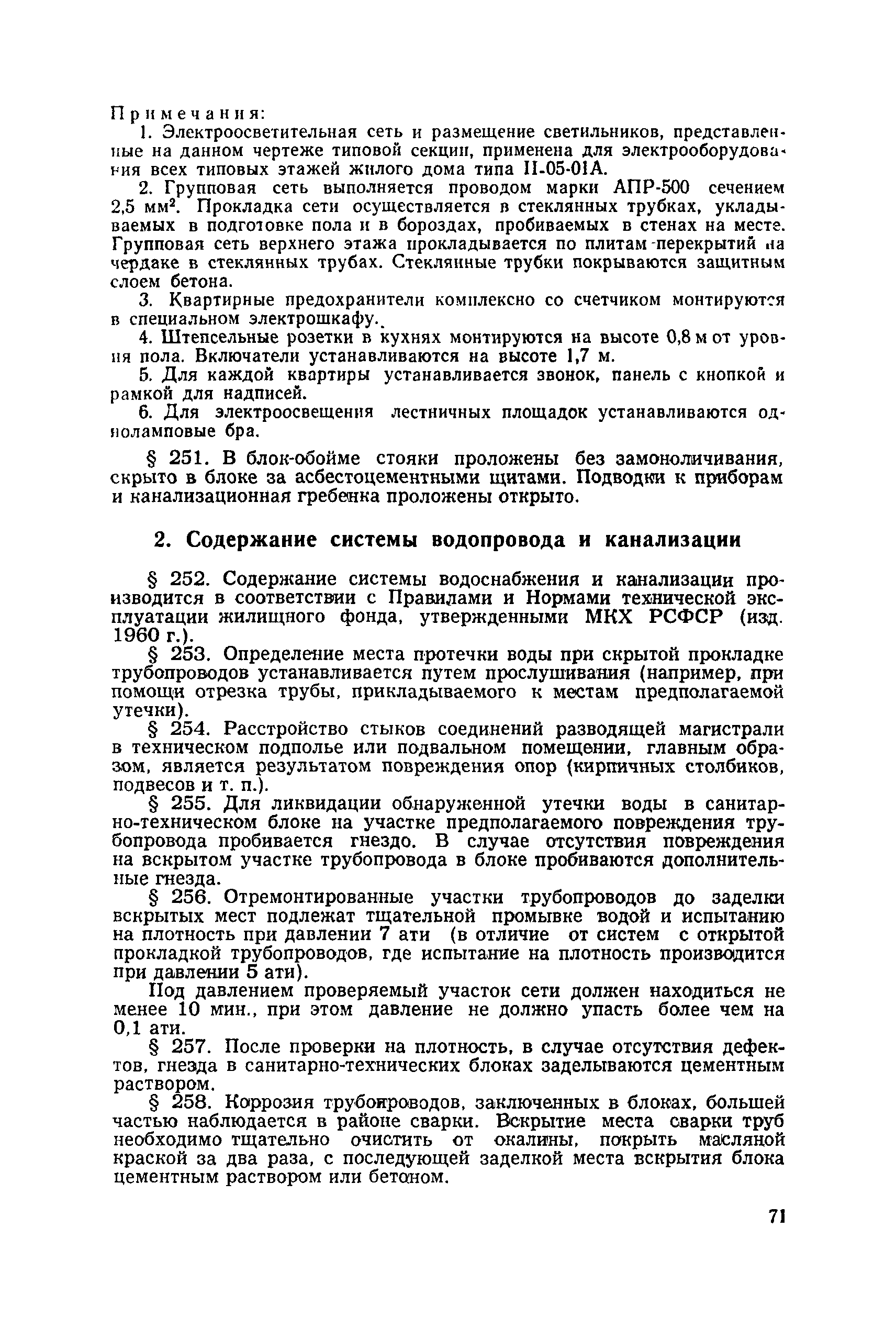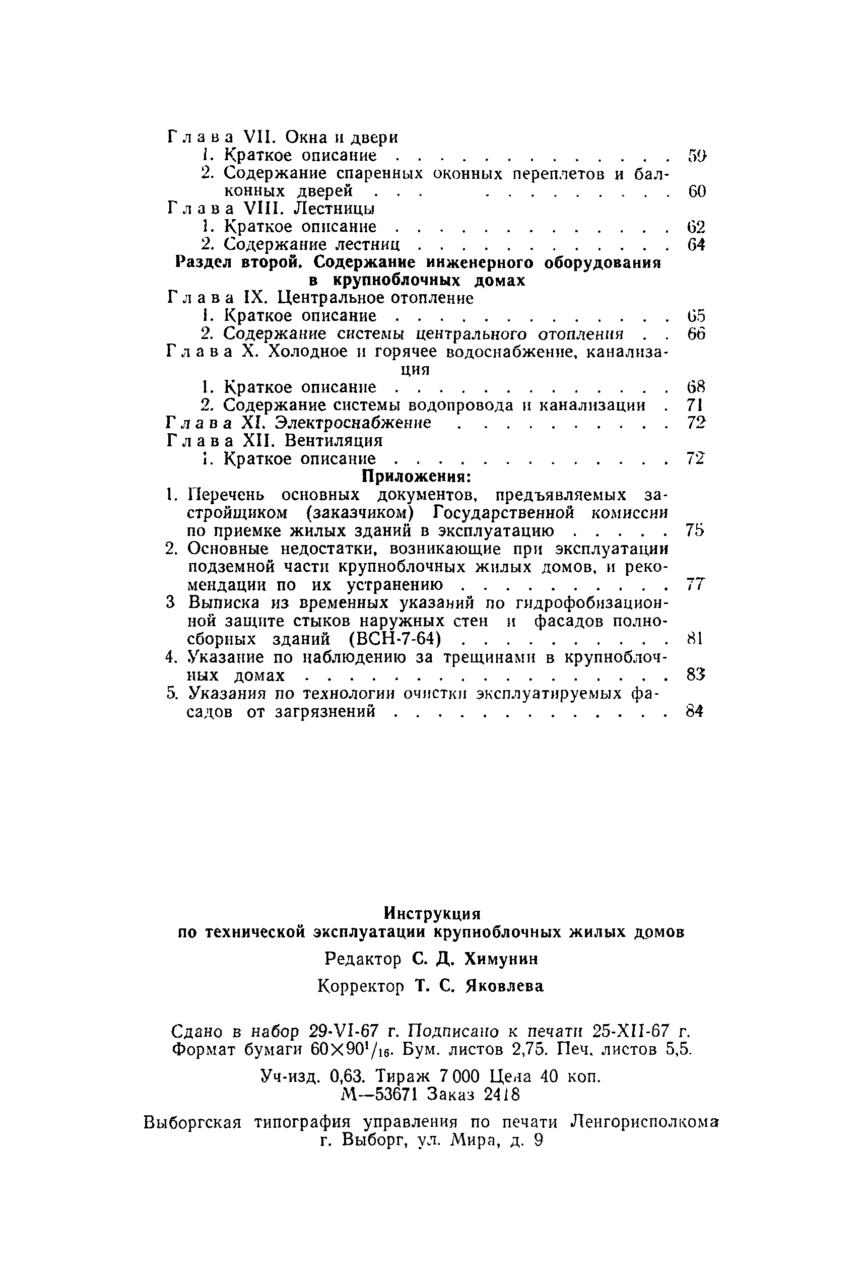 | Оглавление: | Аннотация Введение Общие указания Раздел первый. Содержание отдельных частей крупноблочных жилых домов Общая часть Глава I. Фундаменты и подвальные помещения 1. Краткое описание сборных фундаментов и стен подвальных помещений 2. Содержание фундаментов. Подвальных помещений и технических подполий Глава II. Стены 1. Краткое описание стен крупноблочных жилых домов 2. Содержание крупноблочных стен а) Выявление и устранение повреждений стен и заделка стыков б) Устранение отсыревания и промерзания наружных стен Глава III. Фасады и балконы 1. Краткое описание 2. Содержание фасадов 3. Содержание выступающих архитектурных деталей фасадов (балконов, эркеров, карнизов и др.) Глава IV. Перекрытия и полы 1. Краткое описание 2. Содержание перекрытий и полов Глава V. Перегородки 1. Краткое описание 2. Содержание перегородок 3. Усиление звукоизоляции внутренних стен Глава VI. Крыши и чердачные помещения 1. Краткое описание 2. Содержание крыш и чердачных помещений Глава VII. Окна и двери 1. Краткое описание 2. Содержание спаренных оконных переплетов и балконных дверей Глава VIII. Лестницы 1. Краткое описание 2. Содержание лестниц Раздел второй. Содержание инженерного оборудования в крупноблочных домах Глава IX. Центральное отопление 1. Краткое описание 2. Содержание системы центрального отопления Глава X. Холодное и горячее водоснабжение, канализация 1. Краткое описание 2. Содержание системы водопровода и канализации Глава XI. Электроснабжение Глава XII. Вентиляция 1. Краткое описание Приложение 1. Перечень основных документов, предъявляемых застройщиком (заказчиком) Государственной комиссии по приемке жилых зданий в эксплуатацию Приложение 2. Основные недостатки, возникающие при эксплуатации подземной части крупноблочных жилых домов, и рекомендации по их устранению Приложение 3. Выписка из временных указаний по гидрофобизационной защите стыков наружных стен и фасадов полносборных зданий (ВСН-7-64) Приложение 4. Указание по наблюдению за трещинами в крупноблочных домах Приложение 5. Указания по технологии очистки эксплуатируемых фасадов от загрязнений |