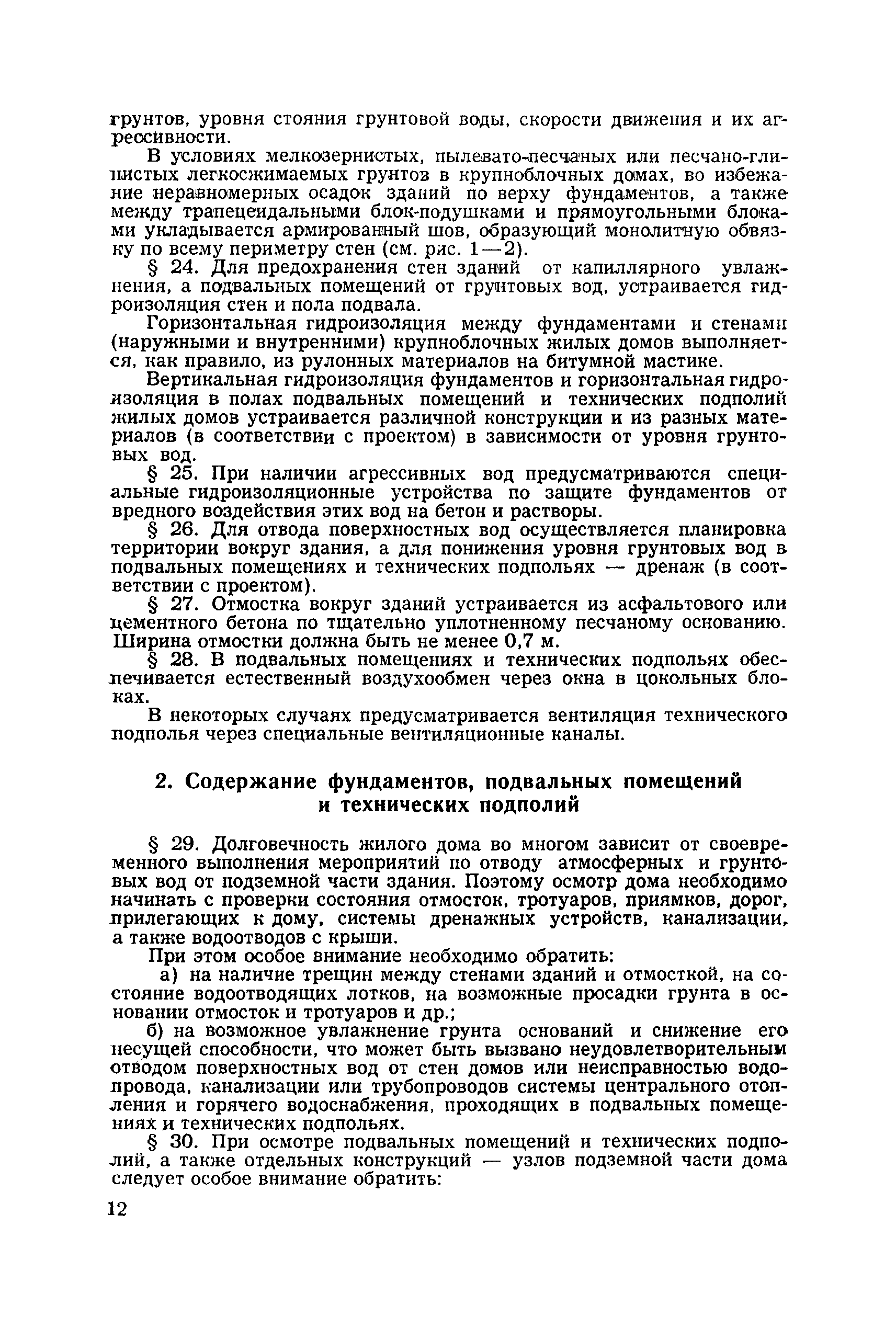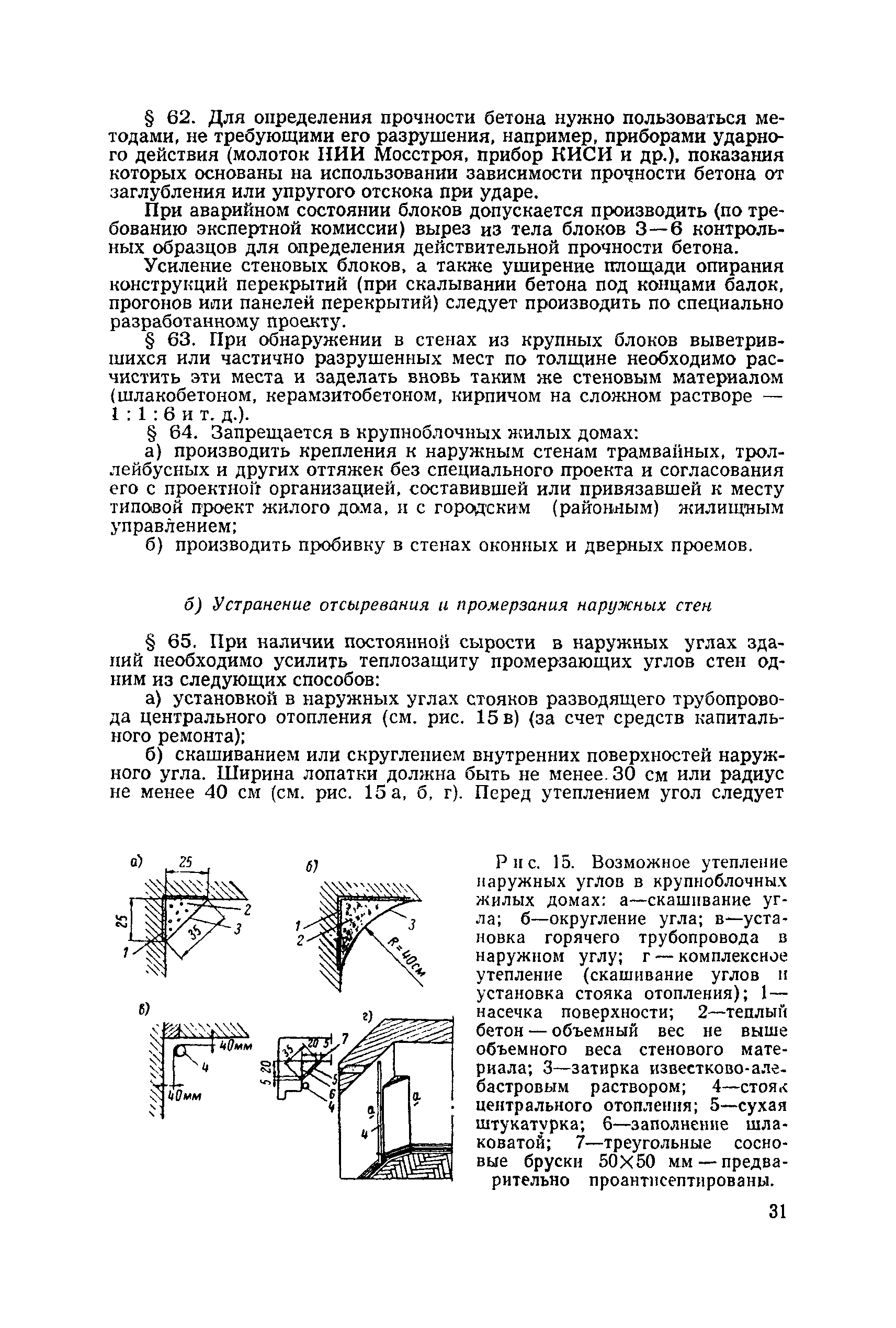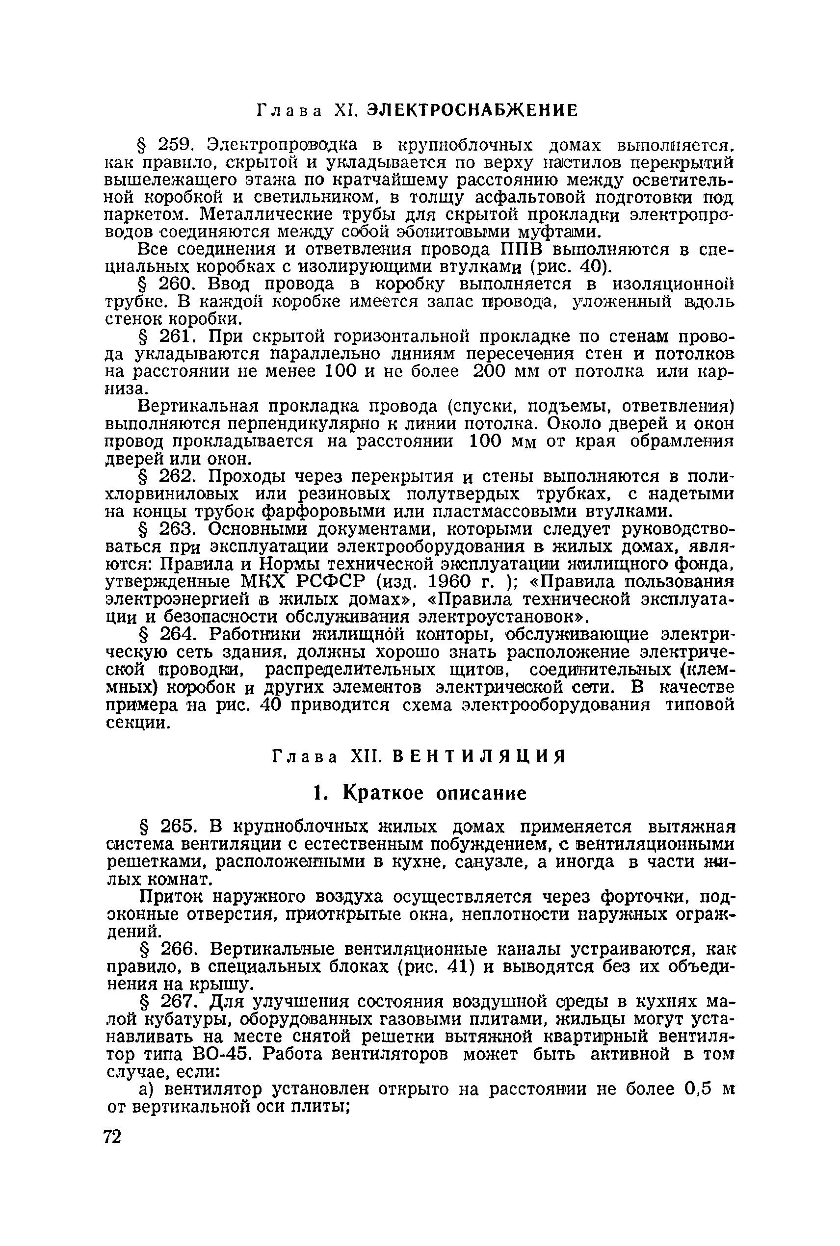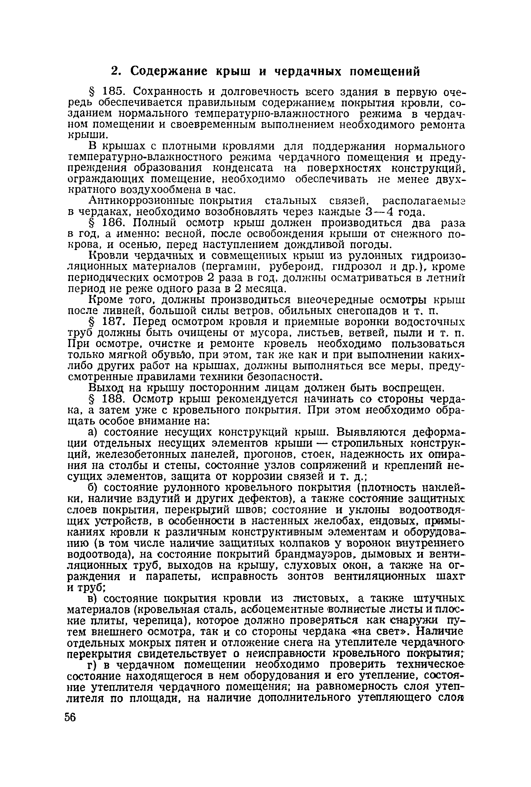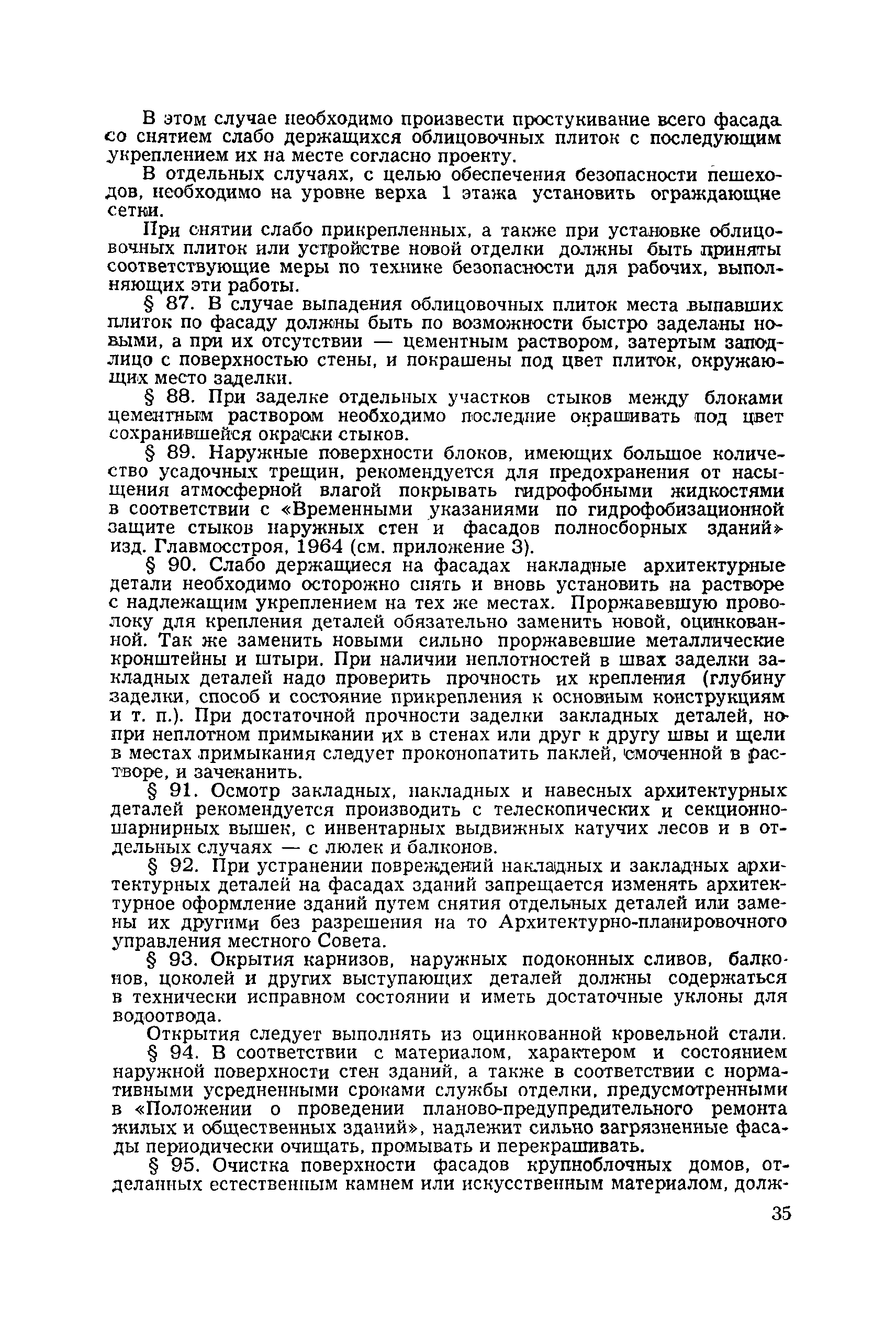 | Оглавление: | Аннотация Введение Общие указания Раздел первый. Содержание отдельных частей крупноблочных жилых домов Общая часть Глава I. Фундаменты и подвальные помещения 1. Краткое описание сборных фундаментов и стен подвальных помещений 2. Содержание фундаментов. Подвальных помещений и технических подполий Глава II. Стены 1. Краткое описание стен крупноблочных жилых домов 2. Содержание крупноблочных стен а) Выявление и устранение повреждений стен и заделка стыков б) Устранение отсыревания и промерзания наружных стен Глава III. Фасады и балконы 1. Краткое описание 2. Содержание фасадов 3. Содержание выступающих архитектурных деталей фасадов (балконов, эркеров, карнизов и др.) Глава IV. Перекрытия и полы 1. Краткое описание 2. Содержание перекрытий и полов Глава V. Перегородки 1. Краткое описание 2. Содержание перегородок 3. Усиление звукоизоляции внутренних стен Глава VI. Крыши и чердачные помещения 1. Краткое описание 2. Содержание крыш и чердачных помещений Глава VII. Окна и двери 1. Краткое описание 2. Содержание спаренных оконных переплетов и балконных дверей Глава VIII. Лестницы 1. Краткое описание 2. Содержание лестниц Раздел второй. Содержание инженерного оборудования в крупноблочных домах Глава IX. Центральное отопление 1. Краткое описание 2. Содержание системы центрального отопления Глава X. Холодное и горячее водоснабжение, канализация 1. Краткое описание 2. Содержание системы водопровода и канализации Глава XI. Электроснабжение Глава XII. Вентиляция 1. Краткое описание Приложение 1. Перечень основных документов, предъявляемых застройщиком (заказчиком) Государственной комиссии по приемке жилых зданий в эксплуатацию Приложение 2. Основные недостатки, возникающие при эксплуатации подземной части крупноблочных жилых домов, и рекомендации по их устранению Приложение 3. Выписка из временных указаний по гидрофобизационной защите стыков наружных стен и фасадов полносборных зданий (ВСН-7-64) Приложение 4. Указание по наблюдению за трещинами в крупноблочных домах Приложение 5. Указания по технологии очистки эксплуатируемых фасадов от загрязнений |