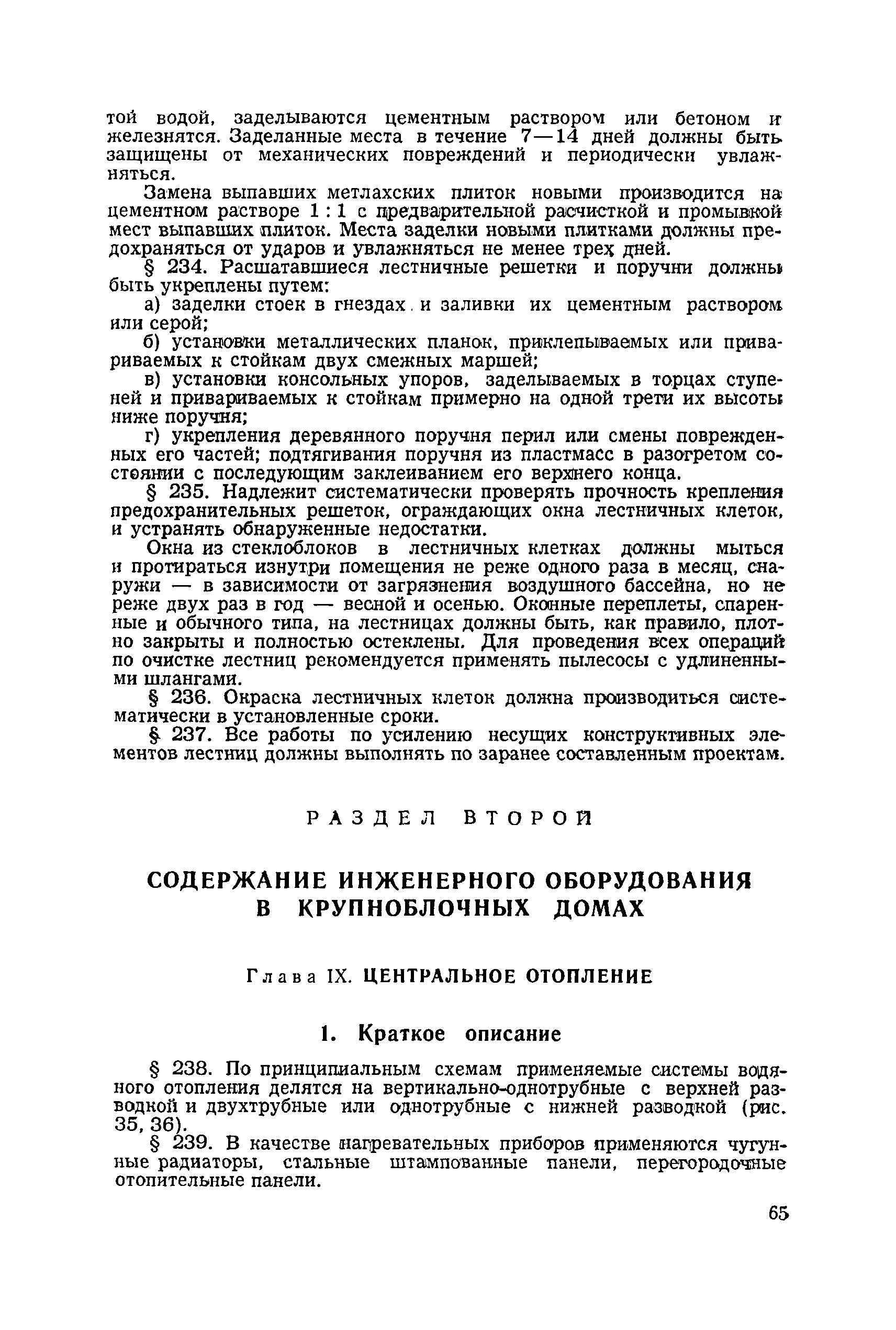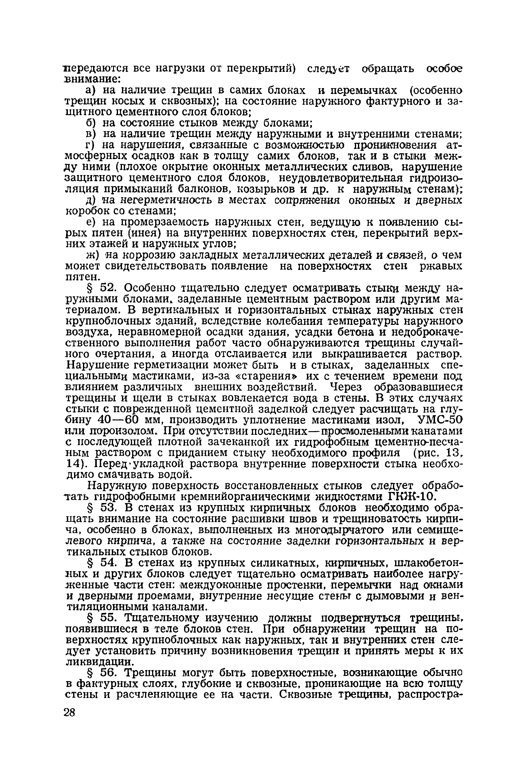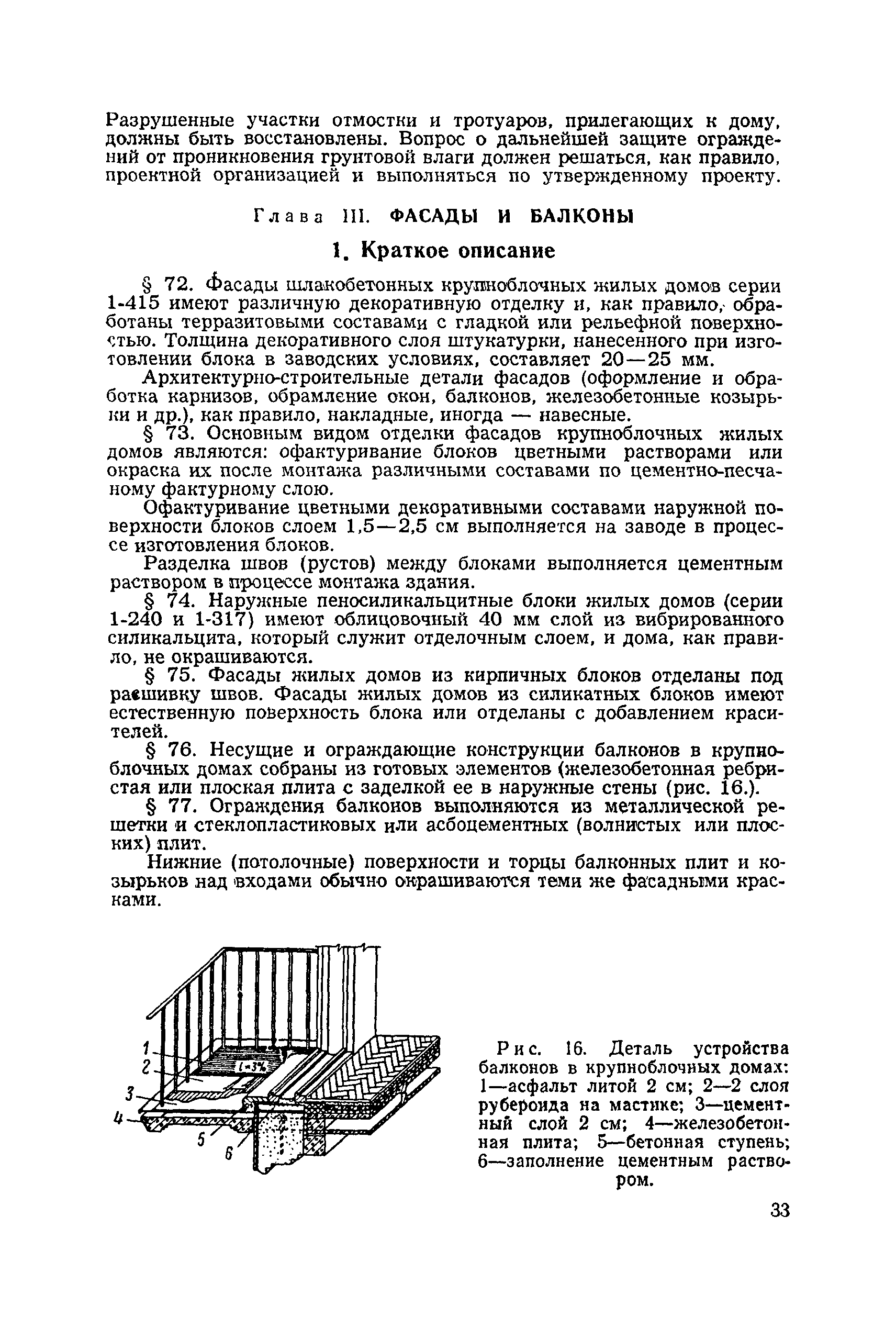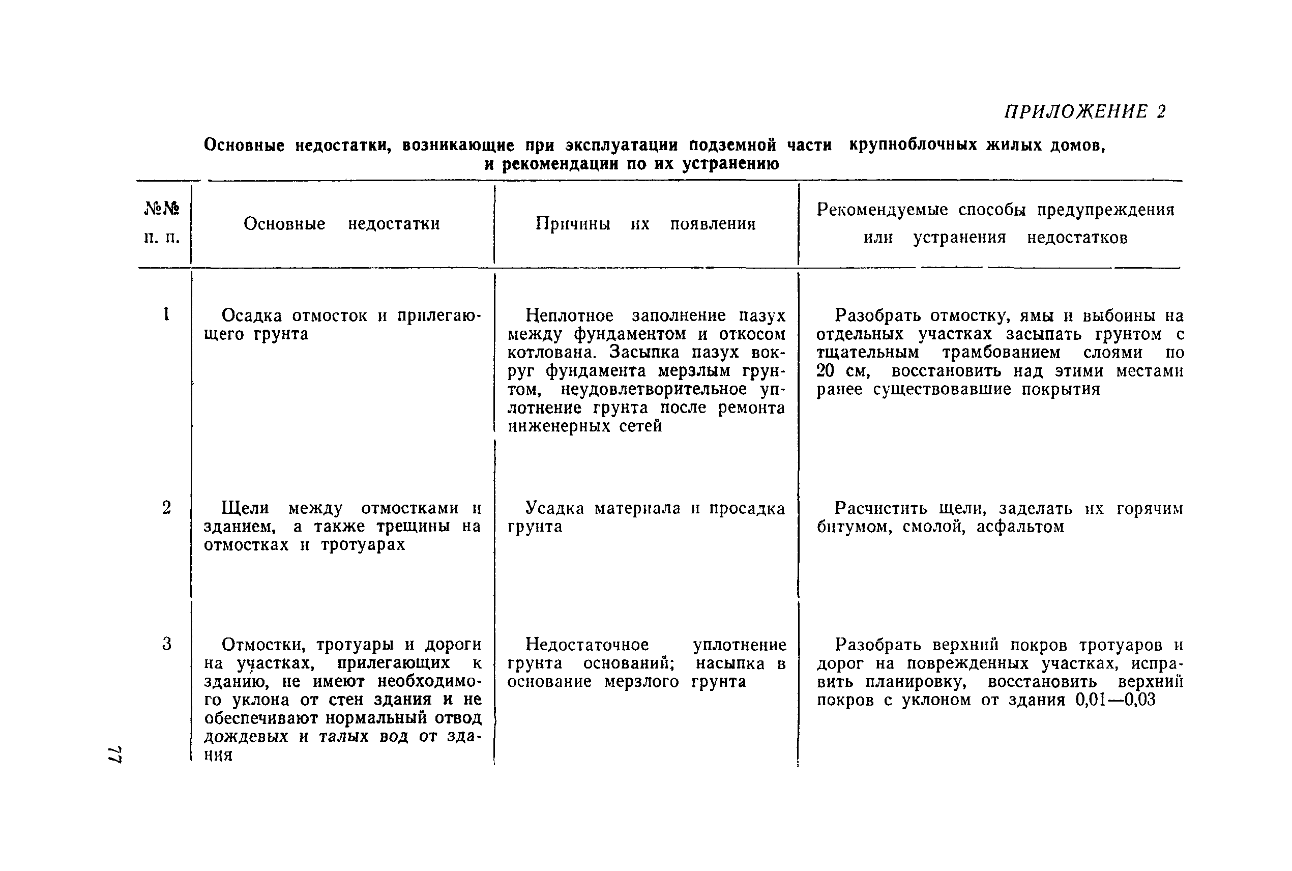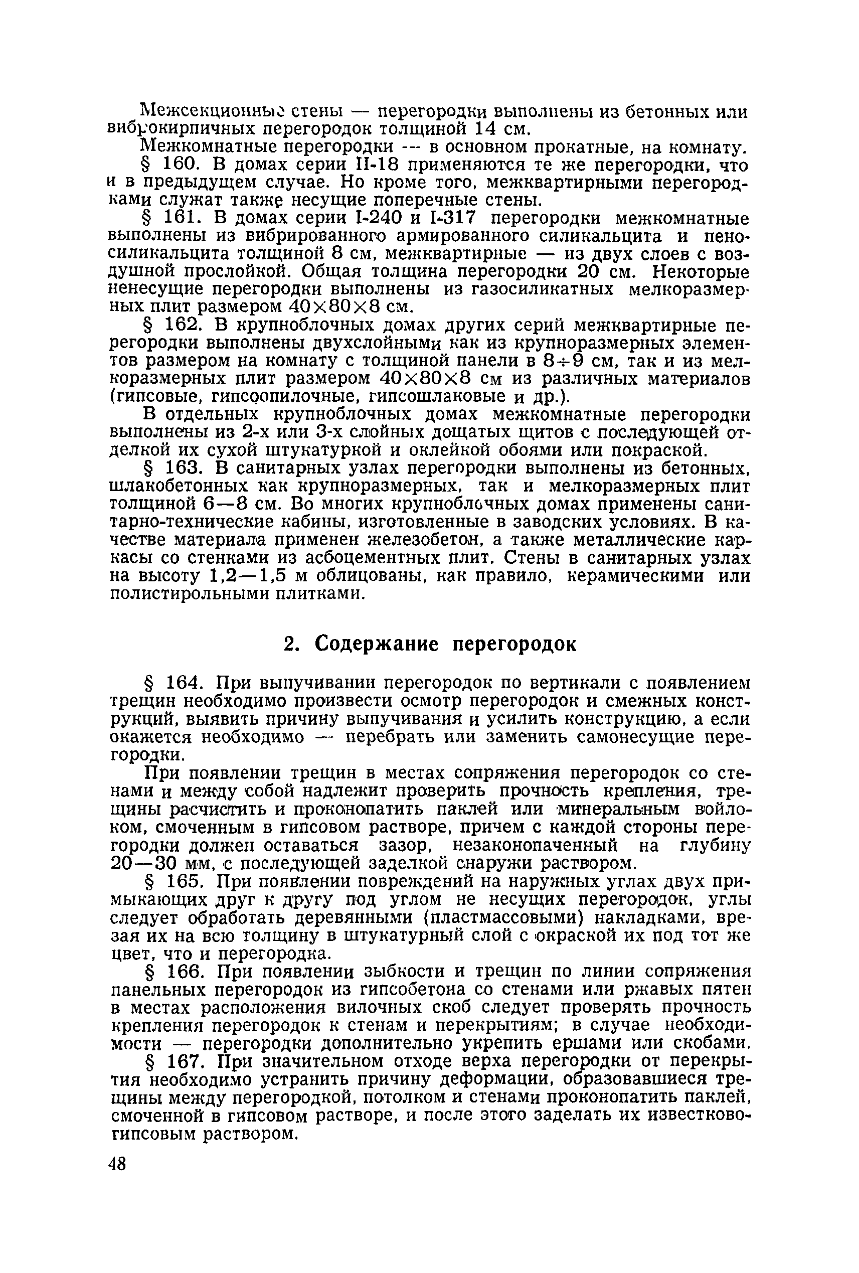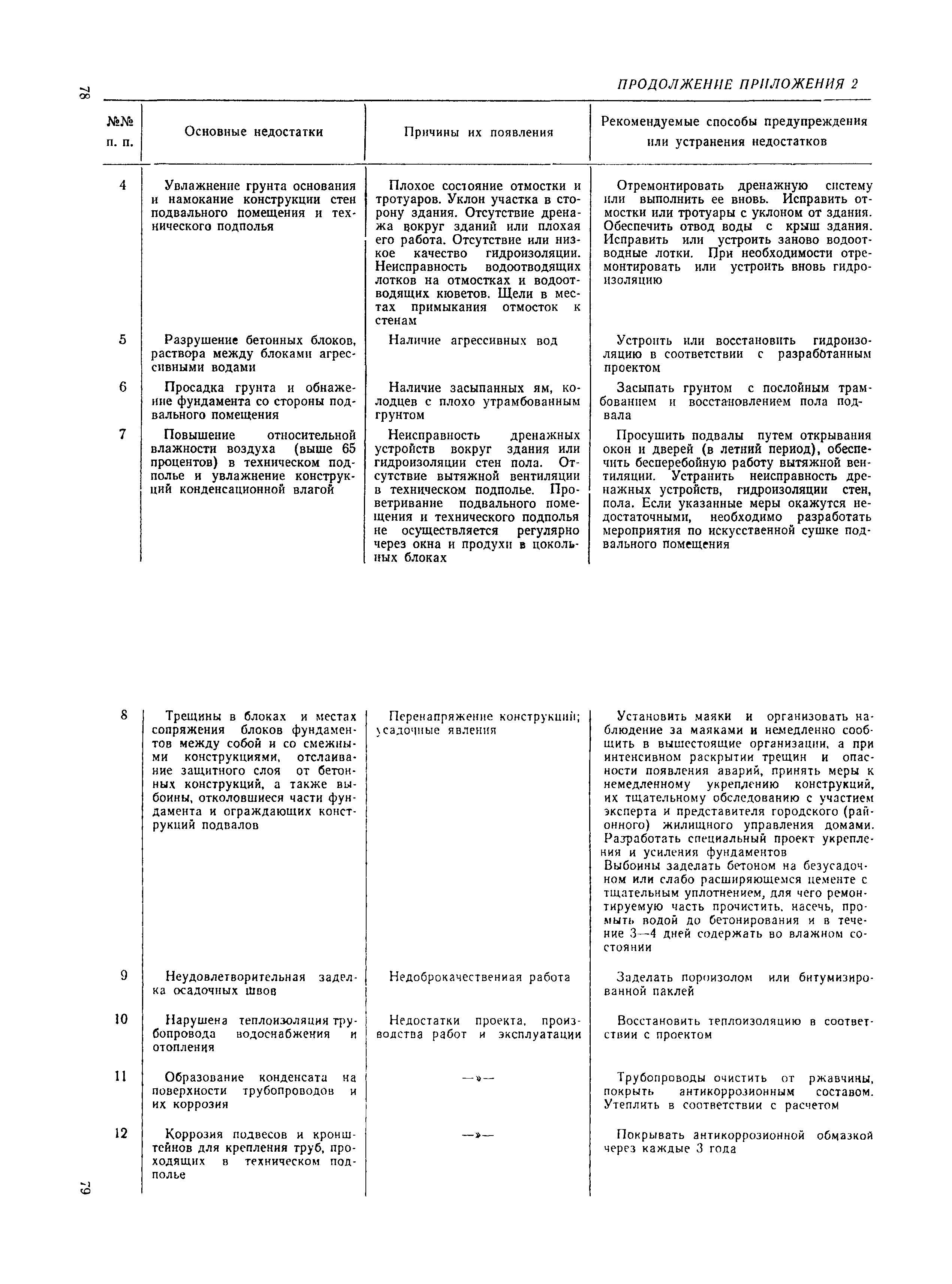 | Оглавление: | Аннотация Введение Общие указания Раздел первый. Содержание отдельных частей крупноблочных жилых домов Общая часть Глава I. Фундаменты и подвальные помещения 1. Краткое описание сборных фундаментов и стен подвальных помещений 2. Содержание фундаментов. Подвальных помещений и технических подполий Глава II. Стены 1. Краткое описание стен крупноблочных жилых домов 2. Содержание крупноблочных стен а) Выявление и устранение повреждений стен и заделка стыков б) Устранение отсыревания и промерзания наружных стен Глава III. Фасады и балконы 1. Краткое описание 2. Содержание фасадов 3. Содержание выступающих архитектурных деталей фасадов (балконов, эркеров, карнизов и др.) Глава IV. Перекрытия и полы 1. Краткое описание 2. Содержание перекрытий и полов Глава V. Перегородки 1. Краткое описание 2. Содержание перегородок 3. Усиление звукоизоляции внутренних стен Глава VI. Крыши и чердачные помещения 1. Краткое описание 2. Содержание крыш и чердачных помещений Глава VII. Окна и двери 1. Краткое описание 2. Содержание спаренных оконных переплетов и балконных дверей Глава VIII. Лестницы 1. Краткое описание 2. Содержание лестниц Раздел второй. Содержание инженерного оборудования в крупноблочных домах Глава IX. Центральное отопление 1. Краткое описание 2. Содержание системы центрального отопления Глава X. Холодное и горячее водоснабжение, канализация 1. Краткое описание 2. Содержание системы водопровода и канализации Глава XI. Электроснабжение Глава XII. Вентиляция 1. Краткое описание Приложение 1. Перечень основных документов, предъявляемых застройщиком (заказчиком) Государственной комиссии по приемке жилых зданий в эксплуатацию Приложение 2. Основные недостатки, возникающие при эксплуатации подземной части крупноблочных жилых домов, и рекомендации по их устранению Приложение 3. Выписка из временных указаний по гидрофобизационной защите стыков наружных стен и фасадов полносборных зданий (ВСН-7-64) Приложение 4. Указание по наблюдению за трещинами в крупноблочных домах Приложение 5. Указания по технологии очистки эксплуатируемых фасадов от загрязнений |