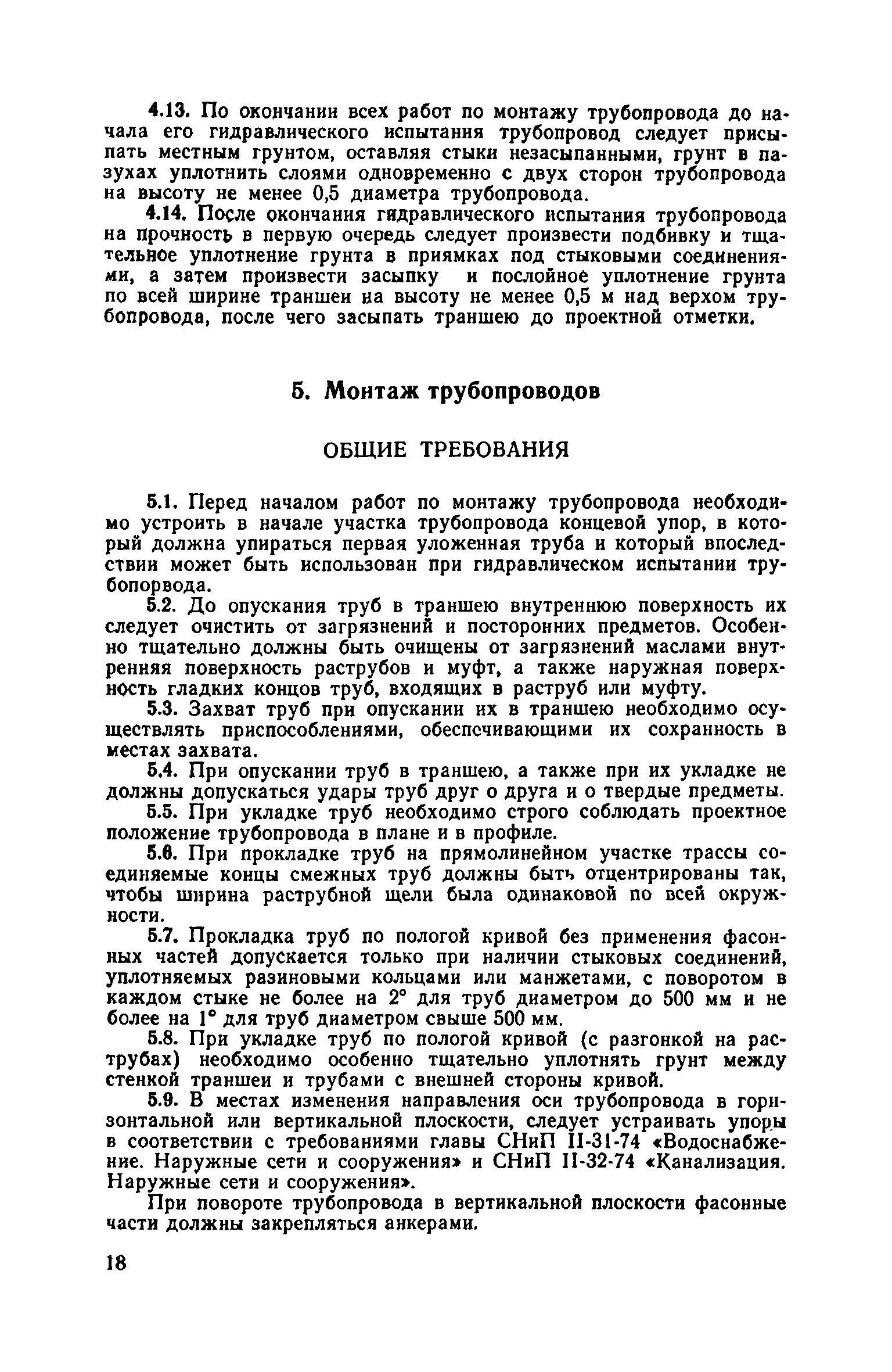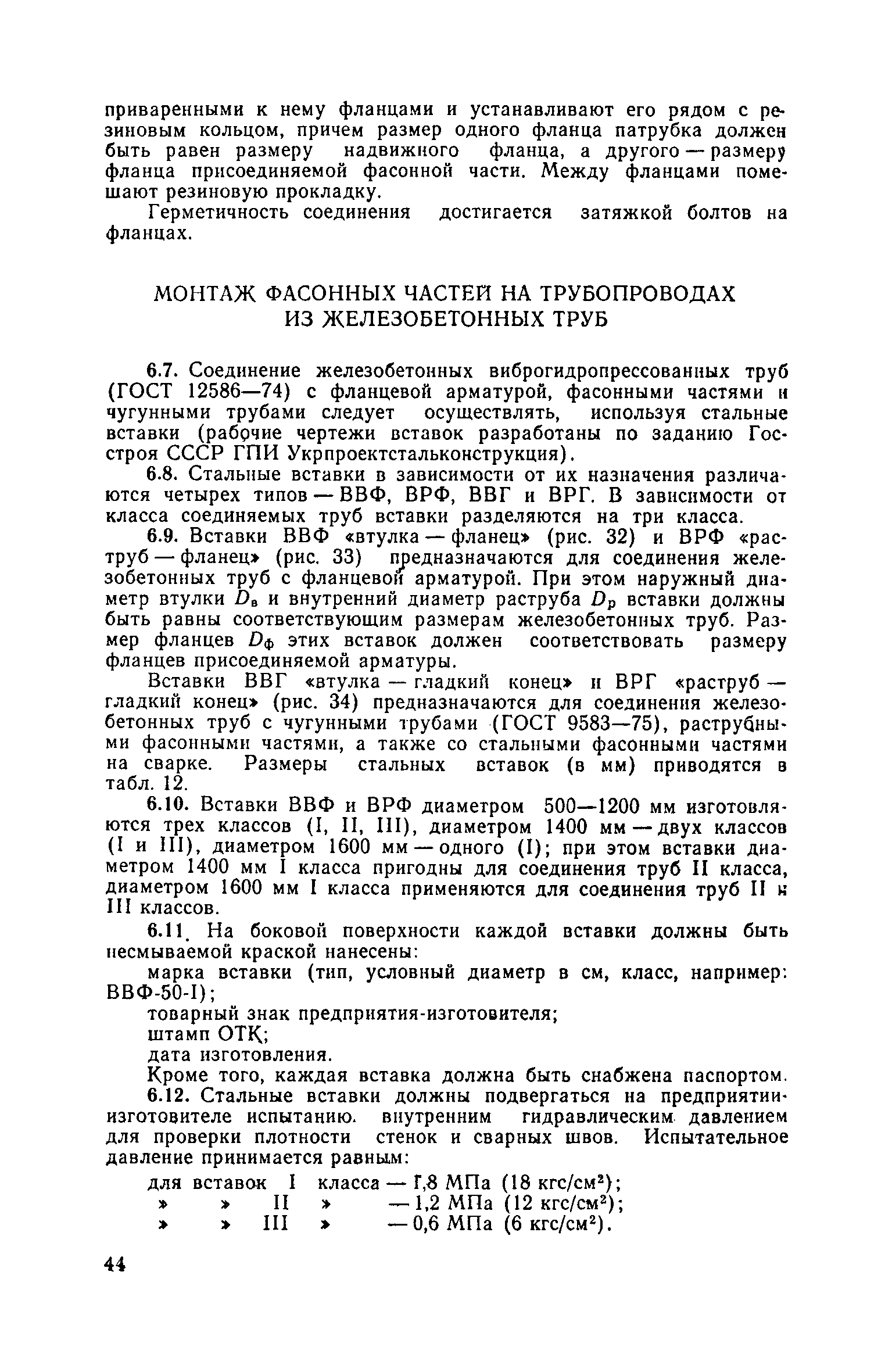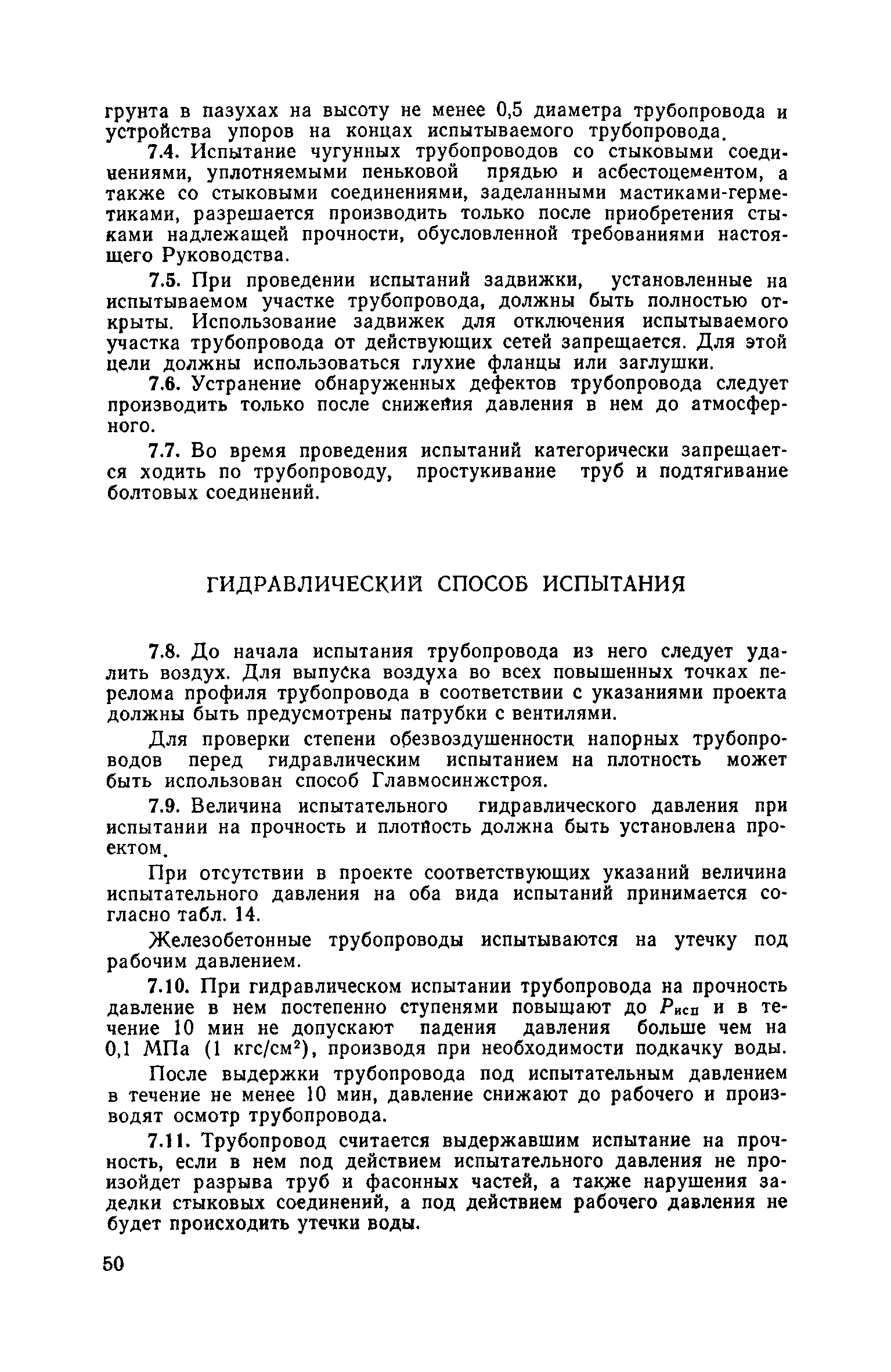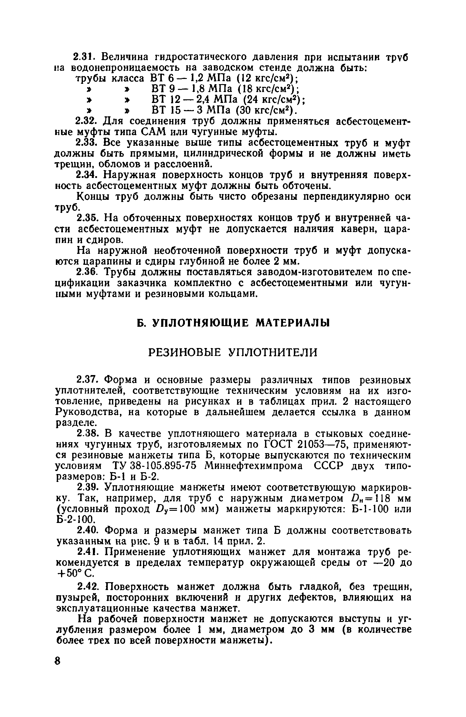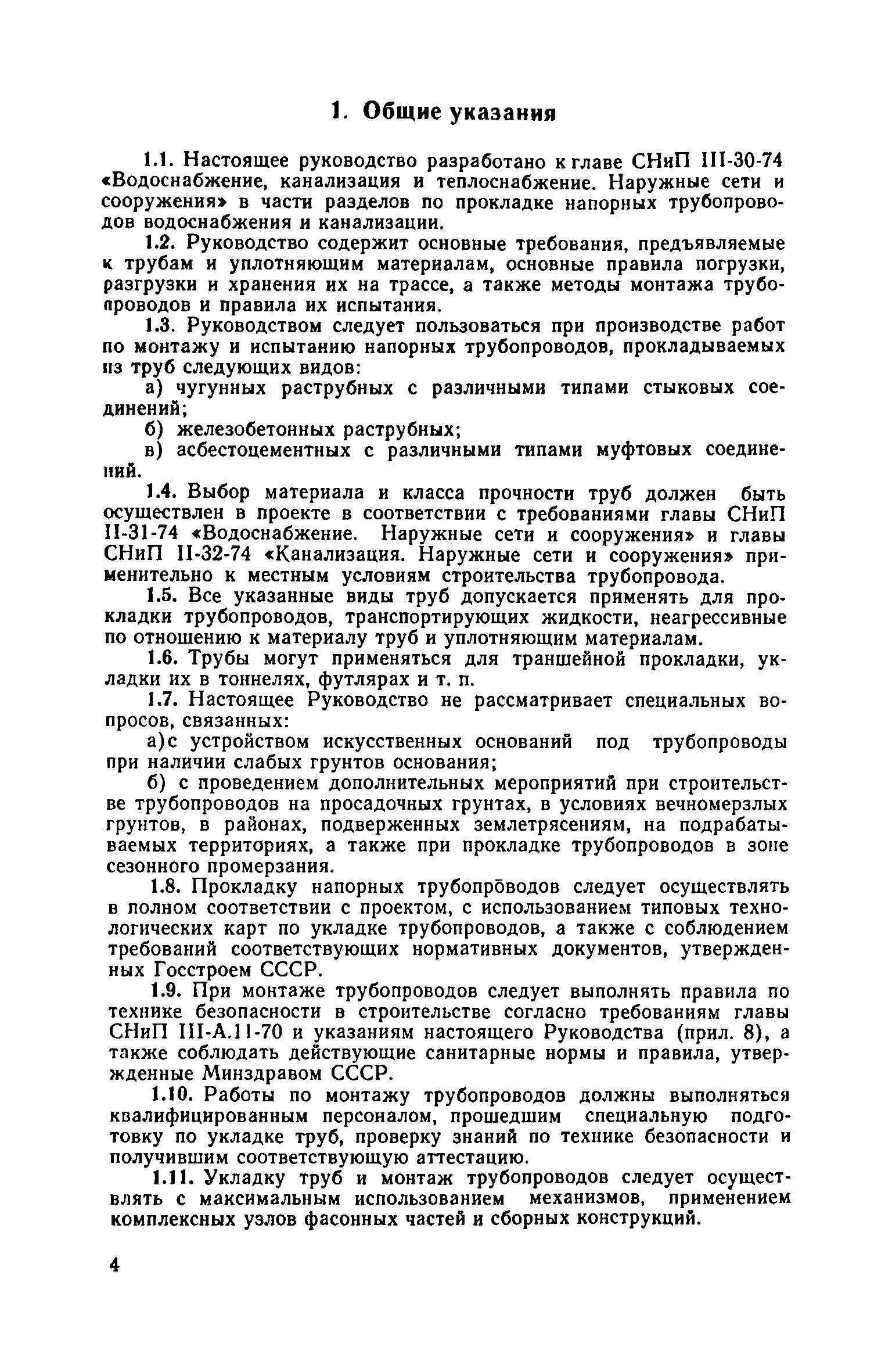 | Оглавление: | Предисловие 1. Общие указания 2. Требования, предъявляемые к трубам, муфтам и уплотняющим материалам А. Трубы и муфты Чугунные напорные трубы Железобетонные напорные трубы Асбестоцементные трубы и муфты Б. Уплотняющие материалы Резиновые уплотнители Пеньковая прядь Полисульфидные мастики-герметики 3. Транспортные. Погрузочно-разгрузочные работы и хранение материалов Трубы, муфты, резиновые уплотнители Герметики 4. Требования к производству земляных работ и подготовке основания под трубы 5. Монтаж трубопроводов Общие требования Монтаж чугунных труб с применением резиновых уплотняющих манжет Заделка стыковых соединений чугунных труб пеньковой прядью Приготовление асбестоцементной смеси асбестоцементного замка Заделка стыковых соединений чугунных труб герметиками Монтаж железобетонных раструбных труб с применением резиновых колец Монтаж асбестоцементных труб, изготовляемых по ГОСТ 539-73 и ТУ 21-24-77-76 Минпромстройматериалов СССР, на муфтах САМ с использованием резиновых колец фигурного сечения Монтаж асбестоцементных труб на чугунных муфтах с использованием резиновых колец круглого и трапециевидного сечения 6. Монтаж фасонных частей Монтаж фасонных частей на чугунных трубопроводах Монтаж фасонных частей на трубопроводах из железобетонных труб Монтаж фасонных частей на трубопроводах из асбестоцементных труб 7. Испытание напорных трубопроводов Общие требования Гидравлический способ испытания Пневматический способ испытания 8. Устранение дефектов трубопроводов Приложение 1. Схема испытательного стенда для предварительного испытания труб перед их укладкой в траншею Приложение 2. Основные данные о форме и размерах труб, муфт и резиновых уплотнителей Приложение 3. Инструмент, применяемый при заделке стыковых соединений труб пеньковой прядью и асбестоцементом Приложение 4. Методика проведения окончательного гидравлического испытания трубопроводов на утечку и примеры испытания Приложение 5. Требования по пневматическому испытанию чугунных, железобетонных и асбестоцементных трубопроводов и порядок проведения испытания Приложение 6. Форма актов о проведении гидравлического и пневматического испытания трубопроводов Приложение 7. Краткие указания по промывке и дезинфекции трубопроводов питьевого назначения Приложение 8. Краткие указания по технике безопасности при выполнении работ по монтажу напорных трубопроводов |