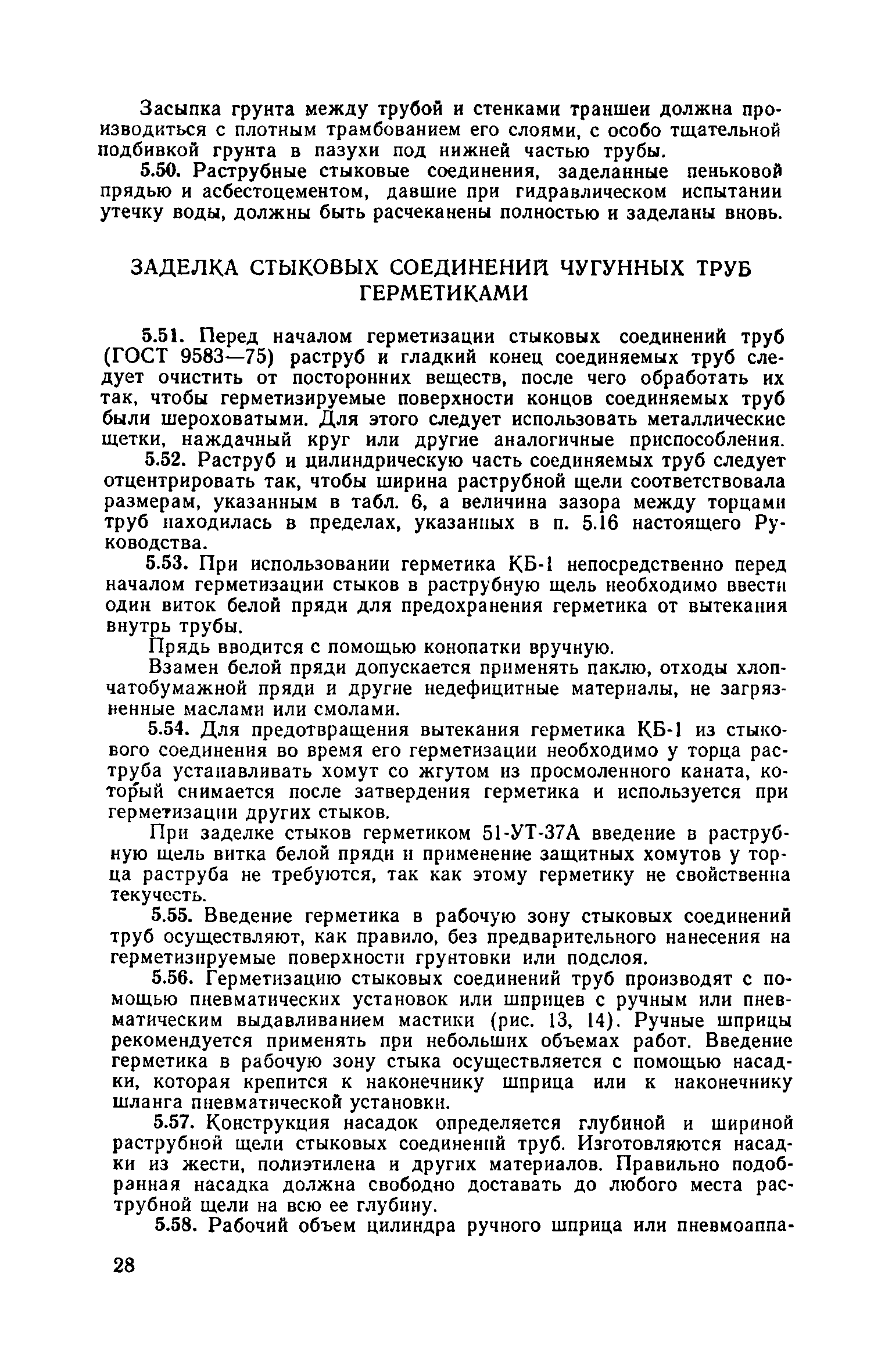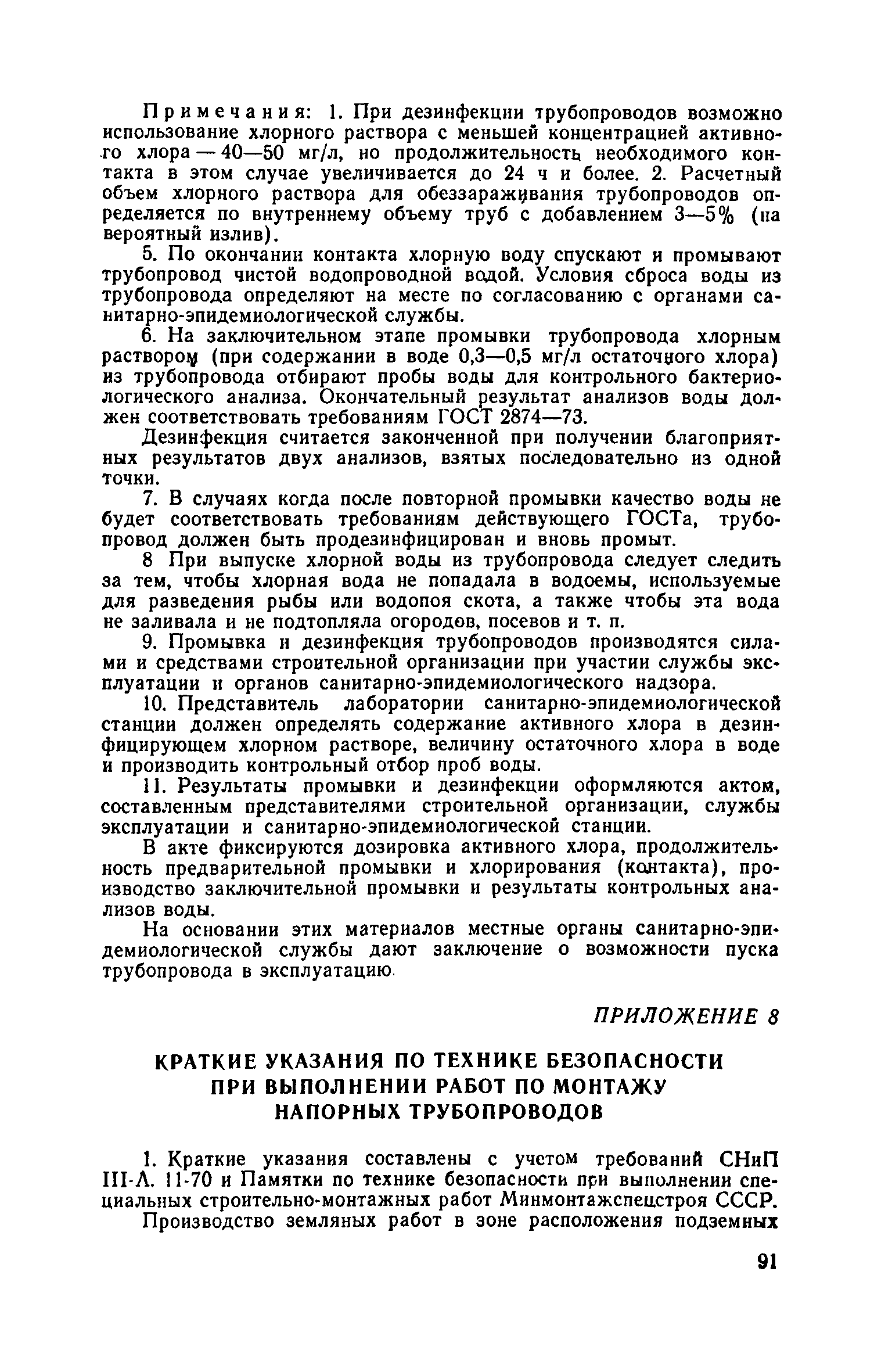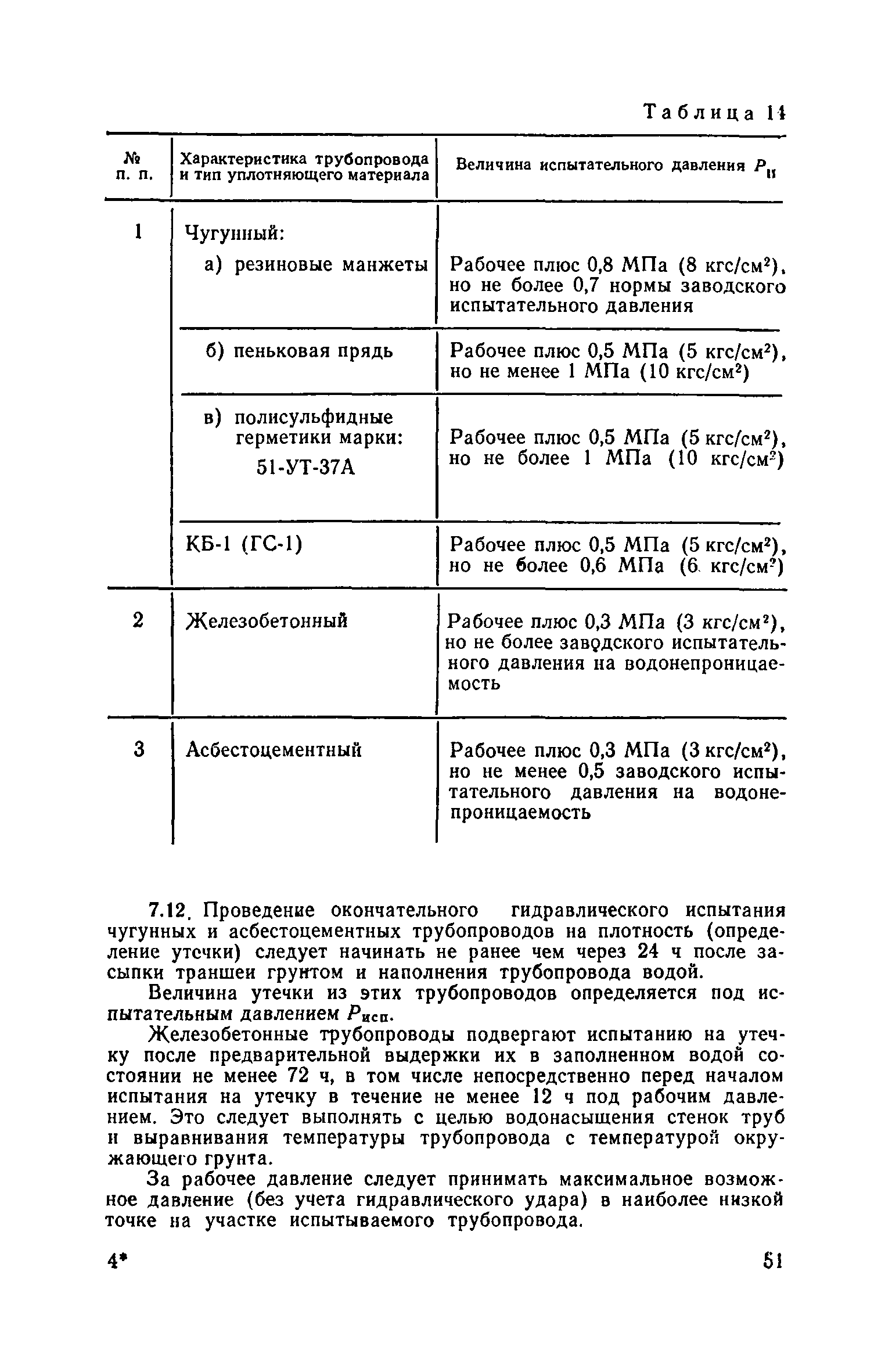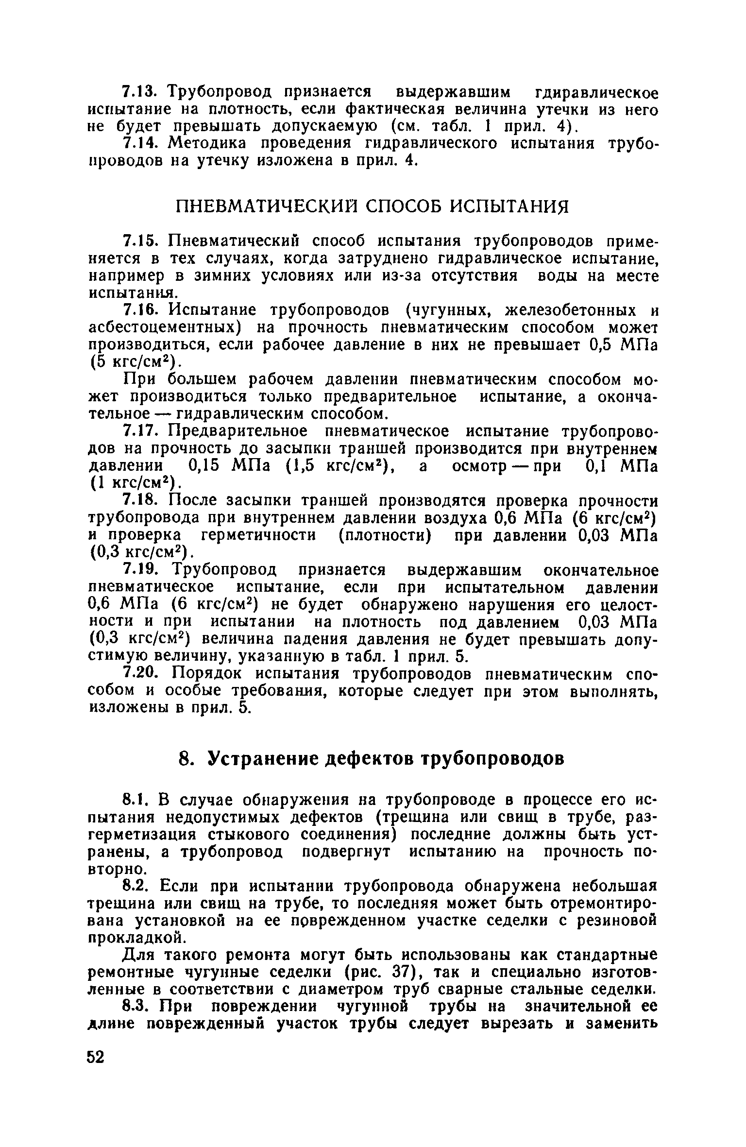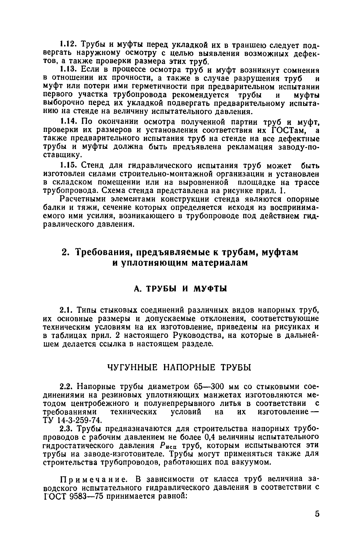 | Оглавление: | Предисловие 1. Общие указания 2. Требования, предъявляемые к трубам, муфтам и уплотняющим материалам А. Трубы и муфты Чугунные напорные трубы Железобетонные напорные трубы Асбестоцементные трубы и муфты Б. Уплотняющие материалы Резиновые уплотнители Пеньковая прядь Полисульфидные мастики-герметики 3. Транспортные. Погрузочно-разгрузочные работы и хранение материалов Трубы, муфты, резиновые уплотнители Герметики 4. Требования к производству земляных работ и подготовке основания под трубы 5. Монтаж трубопроводов Общие требования Монтаж чугунных труб с применением резиновых уплотняющих манжет Заделка стыковых соединений чугунных труб пеньковой прядью Приготовление асбестоцементной смеси асбестоцементного замка Заделка стыковых соединений чугунных труб герметиками Монтаж железобетонных раструбных труб с применением резиновых колец Монтаж асбестоцементных труб, изготовляемых по ГОСТ 539-73 и ТУ 21-24-77-76 Минпромстройматериалов СССР, на муфтах САМ с использованием резиновых колец фигурного сечения Монтаж асбестоцементных труб на чугунных муфтах с использованием резиновых колец круглого и трапециевидного сечения 6. Монтаж фасонных частей Монтаж фасонных частей на чугунных трубопроводах Монтаж фасонных частей на трубопроводах из железобетонных труб Монтаж фасонных частей на трубопроводах из асбестоцементных труб 7. Испытание напорных трубопроводов Общие требования Гидравлический способ испытания Пневматический способ испытания 8. Устранение дефектов трубопроводов Приложение 1. Схема испытательного стенда для предварительного испытания труб перед их укладкой в траншею Приложение 2. Основные данные о форме и размерах труб, муфт и резиновых уплотнителей Приложение 3. Инструмент, применяемый при заделке стыковых соединений труб пеньковой прядью и асбестоцементом Приложение 4. Методика проведения окончательного гидравлического испытания трубопроводов на утечку и примеры испытания Приложение 5. Требования по пневматическому испытанию чугунных, железобетонных и асбестоцементных трубопроводов и порядок проведения испытания Приложение 6. Форма актов о проведении гидравлического и пневматического испытания трубопроводов Приложение 7. Краткие указания по промывке и дезинфекции трубопроводов питьевого назначения Приложение 8. Краткие указания по технике безопасности при выполнении работ по монтажу напорных трубопроводов |