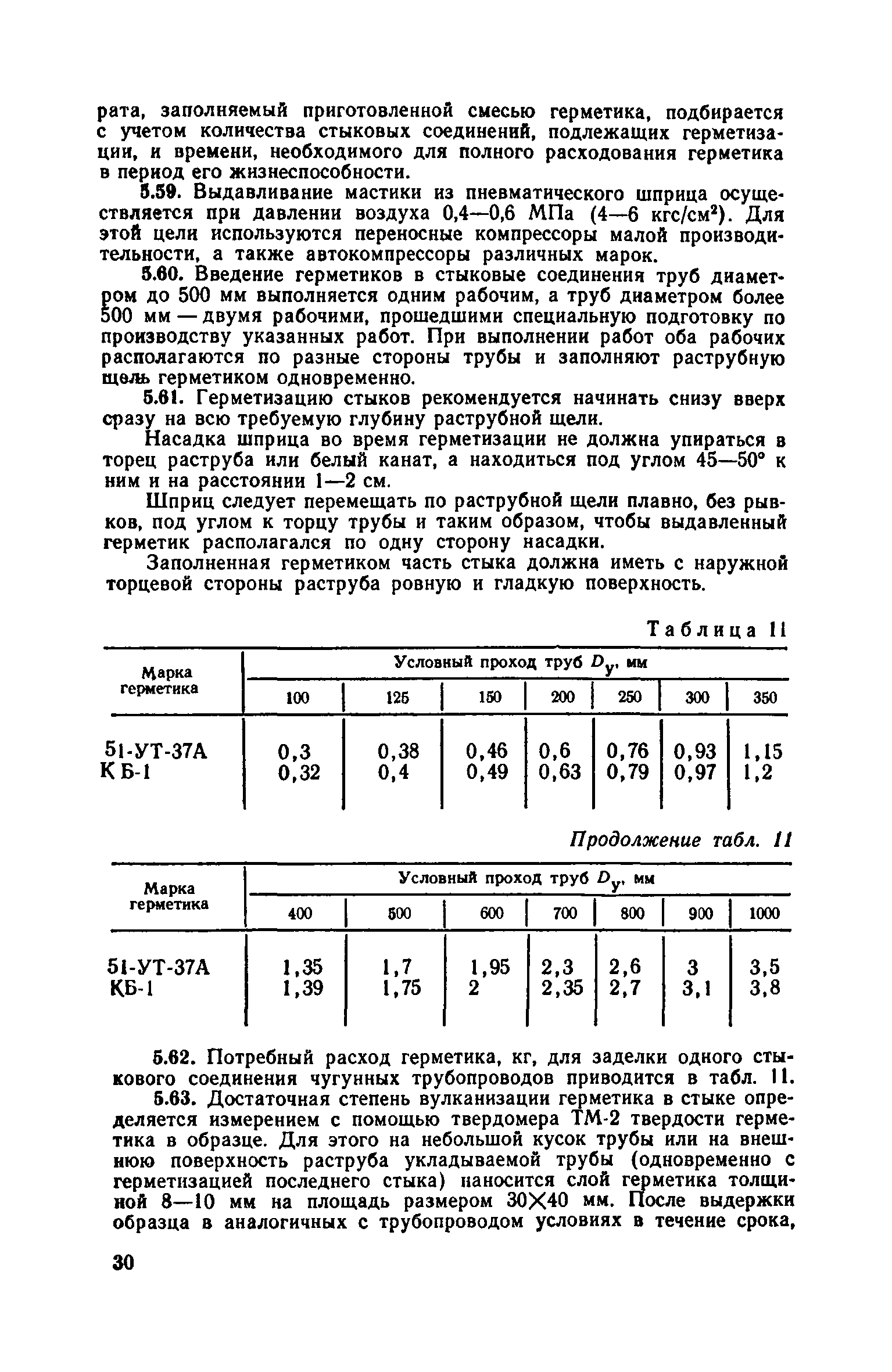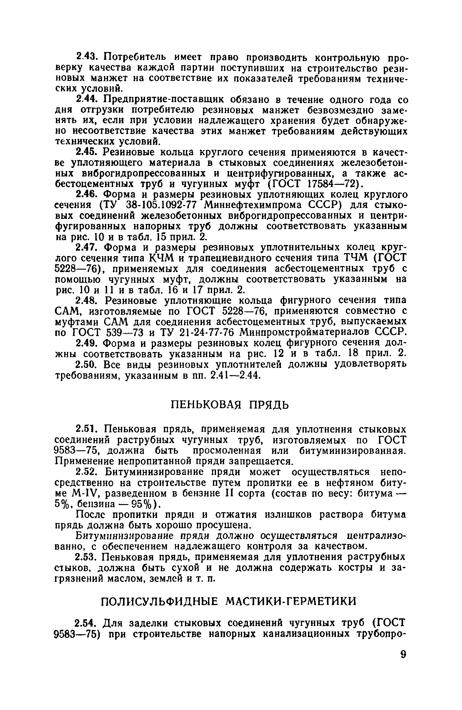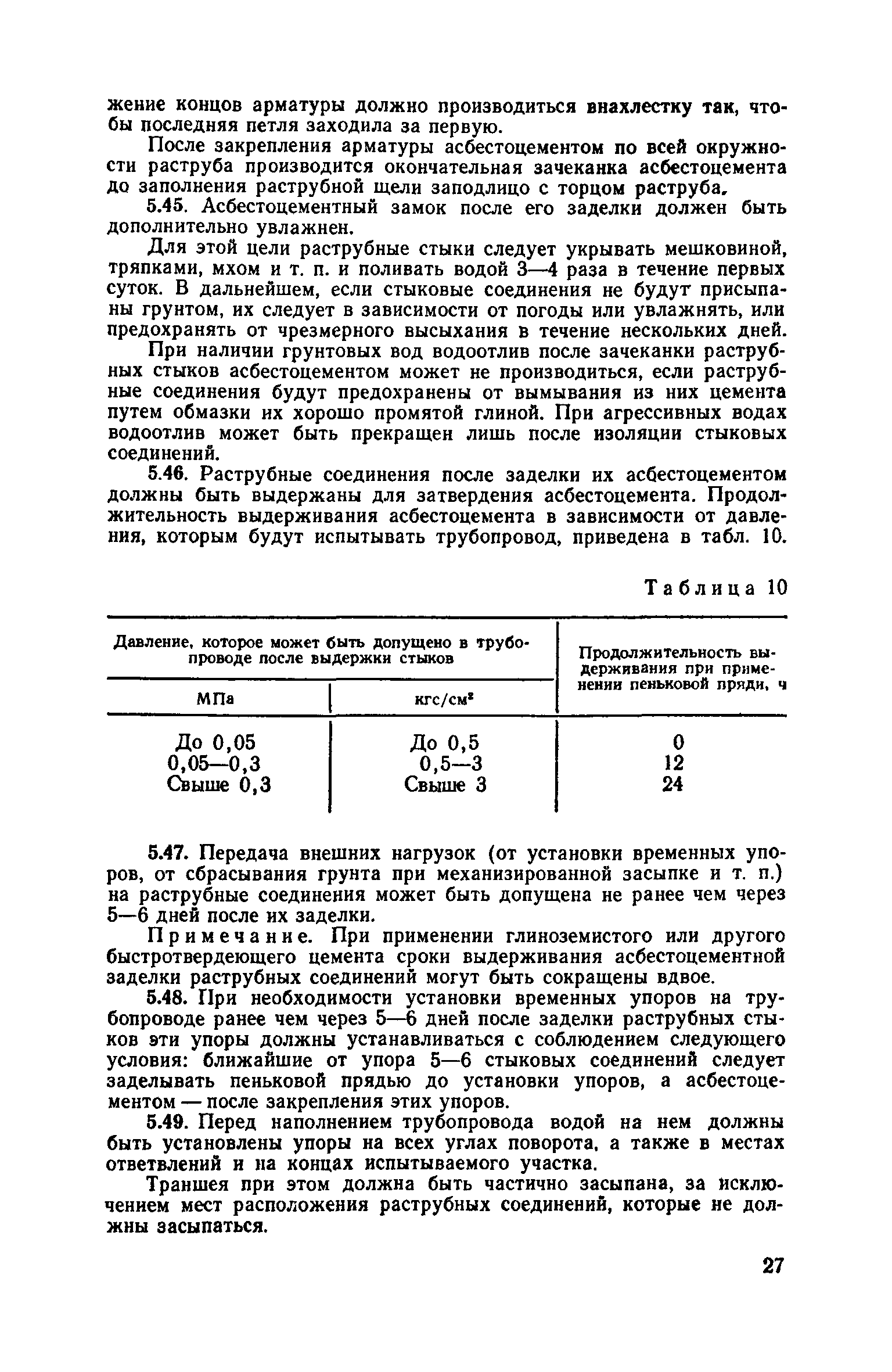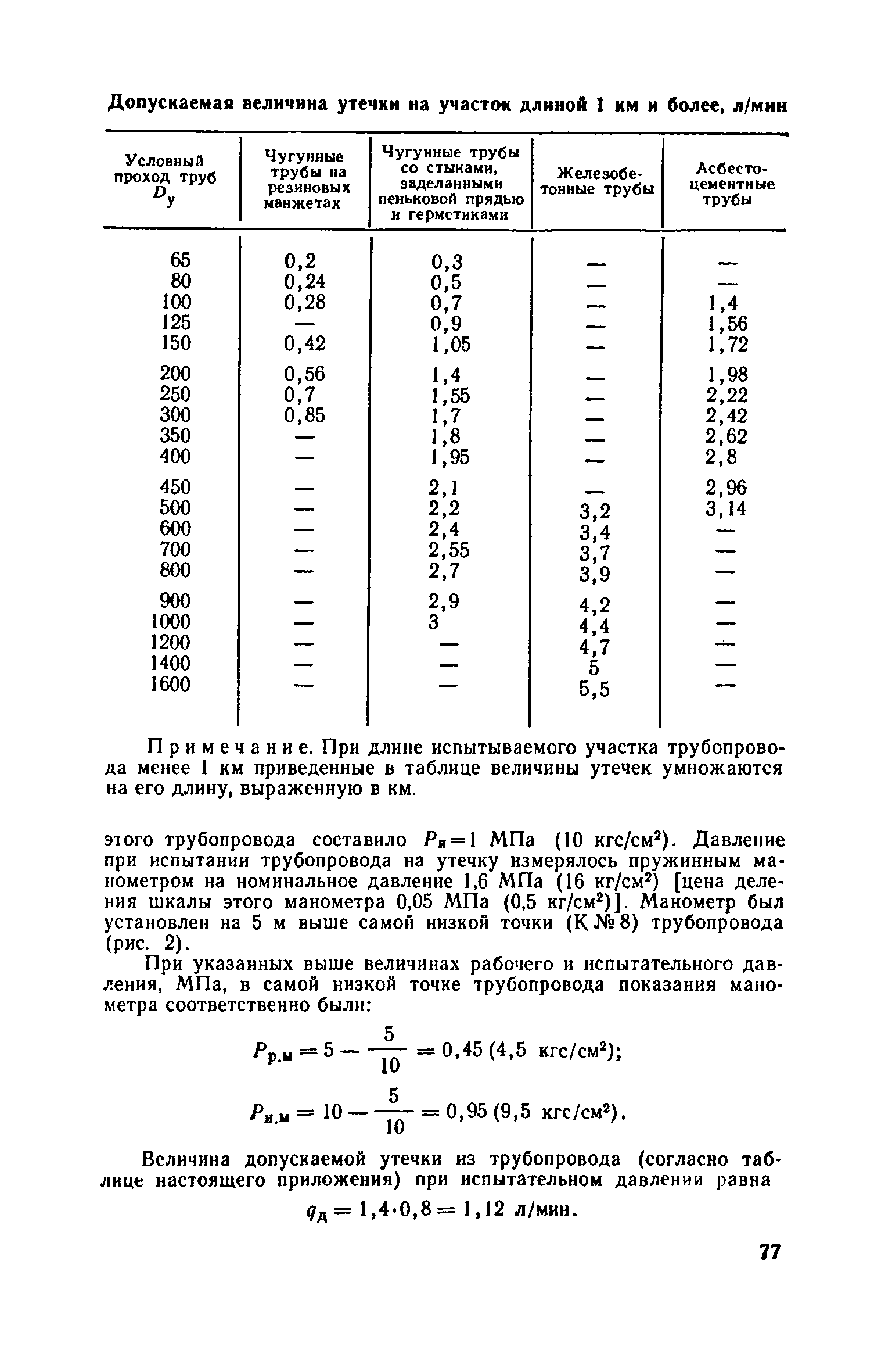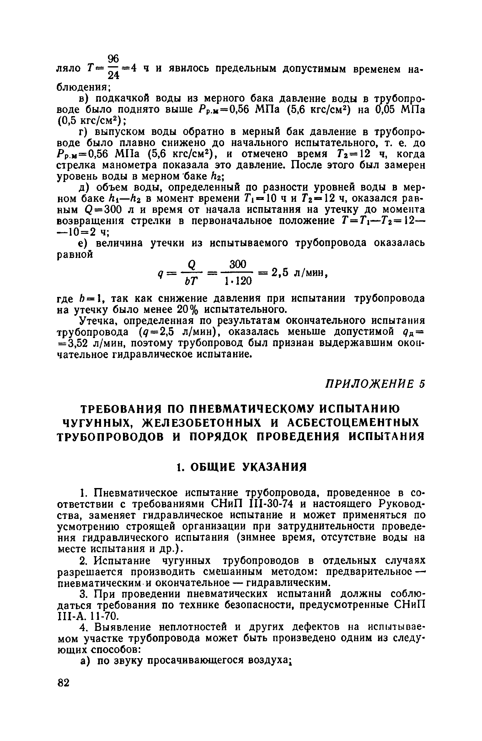 | Оглавление: | Предисловие 1. Общие указания 2. Требования, предъявляемые к трубам, муфтам и уплотняющим материалам А. Трубы и муфты Чугунные напорные трубы Железобетонные напорные трубы Асбестоцементные трубы и муфты Б. Уплотняющие материалы Резиновые уплотнители Пеньковая прядь Полисульфидные мастики-герметики 3. Транспортные. Погрузочно-разгрузочные работы и хранение материалов Трубы, муфты, резиновые уплотнители Герметики 4. Требования к производству земляных работ и подготовке основания под трубы 5. Монтаж трубопроводов Общие требования Монтаж чугунных труб с применением резиновых уплотняющих манжет Заделка стыковых соединений чугунных труб пеньковой прядью Приготовление асбестоцементной смеси асбестоцементного замка Заделка стыковых соединений чугунных труб герметиками Монтаж железобетонных раструбных труб с применением резиновых колец Монтаж асбестоцементных труб, изготовляемых по ГОСТ 539-73 и ТУ 21-24-77-76 Минпромстройматериалов СССР, на муфтах САМ с использованием резиновых колец фигурного сечения Монтаж асбестоцементных труб на чугунных муфтах с использованием резиновых колец круглого и трапециевидного сечения 6. Монтаж фасонных частей Монтаж фасонных частей на чугунных трубопроводах Монтаж фасонных частей на трубопроводах из железобетонных труб Монтаж фасонных частей на трубопроводах из асбестоцементных труб 7. Испытание напорных трубопроводов Общие требования Гидравлический способ испытания Пневматический способ испытания 8. Устранение дефектов трубопроводов Приложение 1. Схема испытательного стенда для предварительного испытания труб перед их укладкой в траншею Приложение 2. Основные данные о форме и размерах труб, муфт и резиновых уплотнителей Приложение 3. Инструмент, применяемый при заделке стыковых соединений труб пеньковой прядью и асбестоцементом Приложение 4. Методика проведения окончательного гидравлического испытания трубопроводов на утечку и примеры испытания Приложение 5. Требования по пневматическому испытанию чугунных, железобетонных и асбестоцементных трубопроводов и порядок проведения испытания Приложение 6. Форма актов о проведении гидравлического и пневматического испытания трубопроводов Приложение 7. Краткие указания по промывке и дезинфекции трубопроводов питьевого назначения Приложение 8. Краткие указания по технике безопасности при выполнении работ по монтажу напорных трубопроводов |