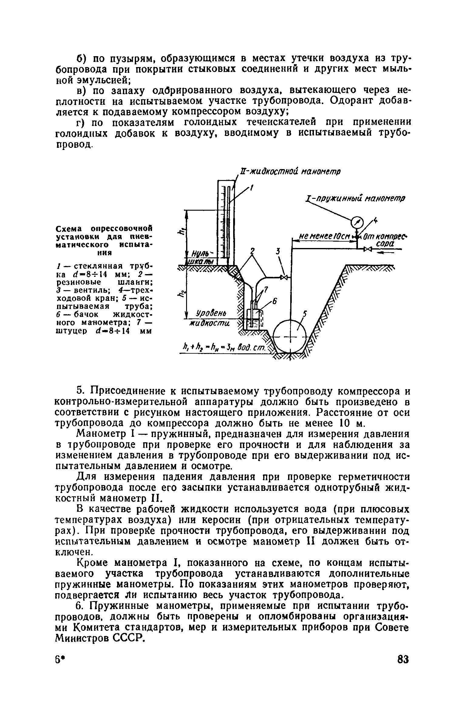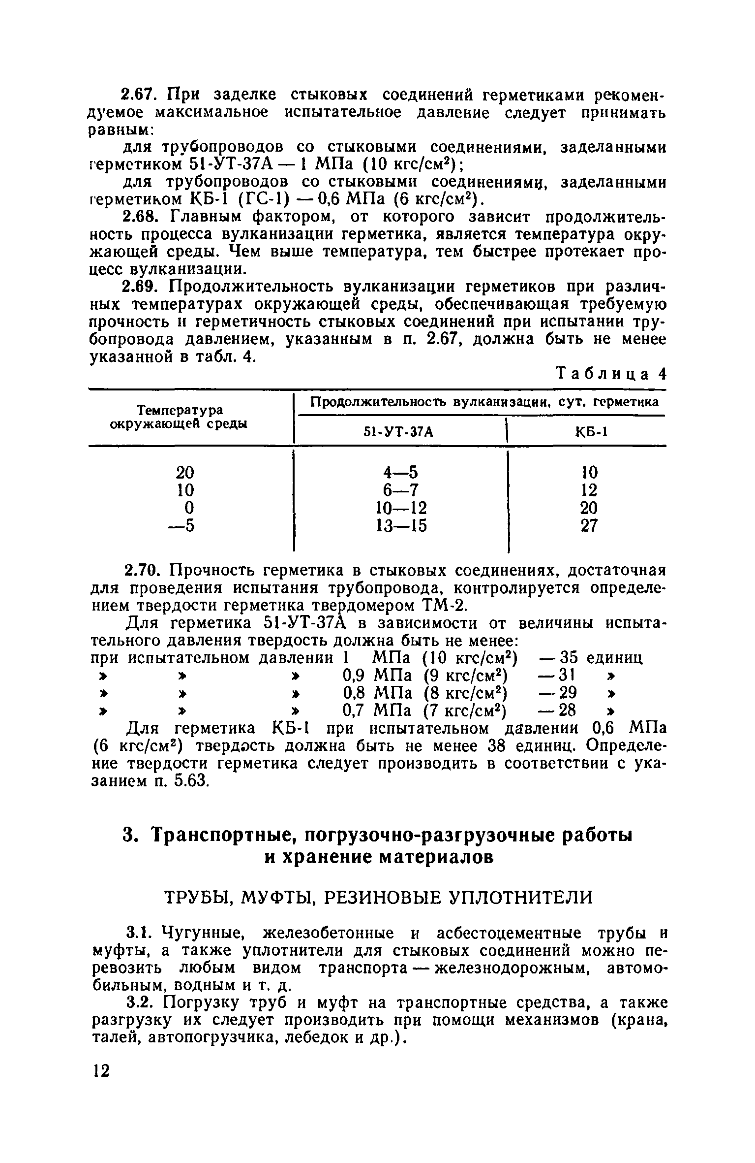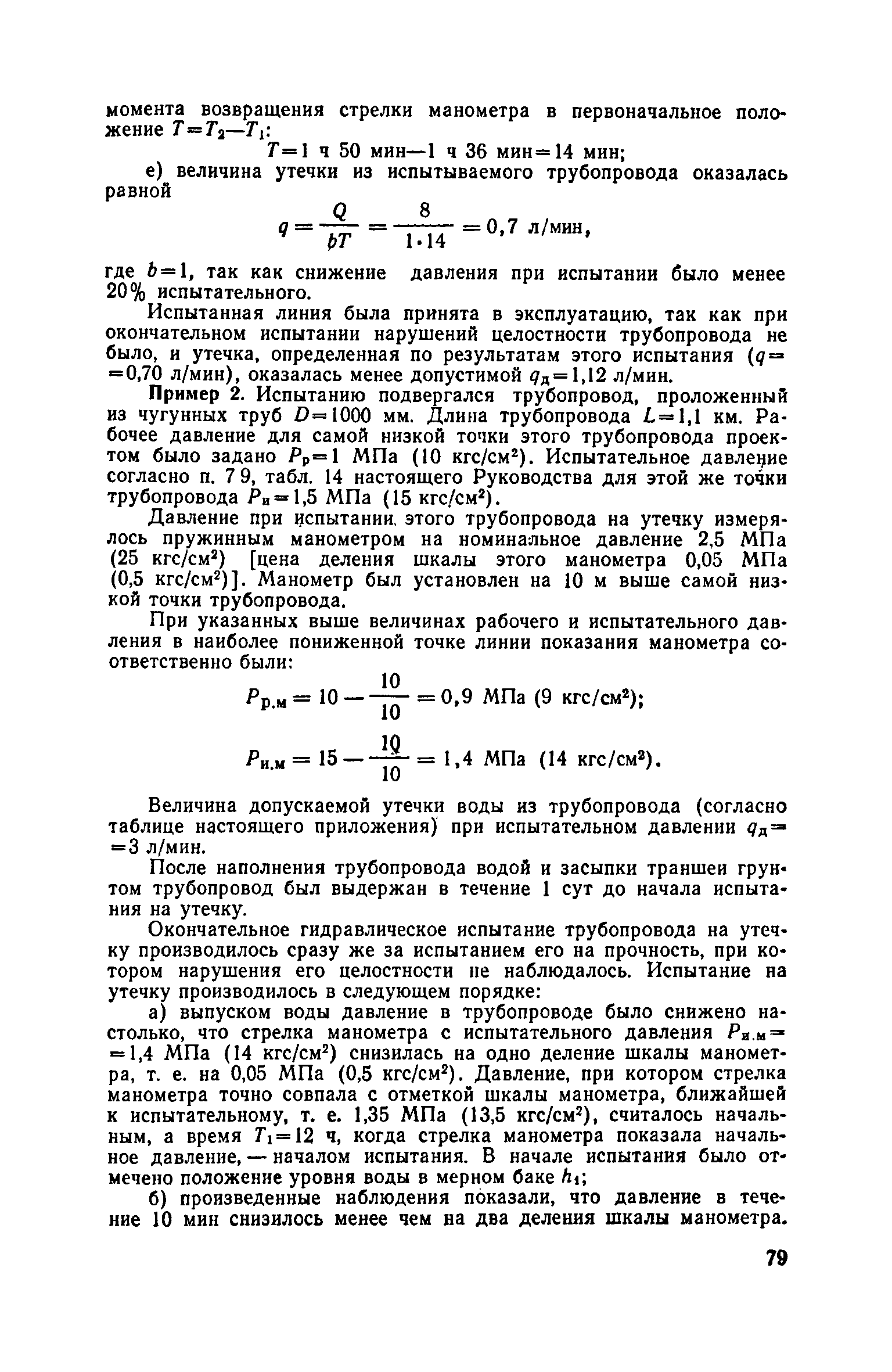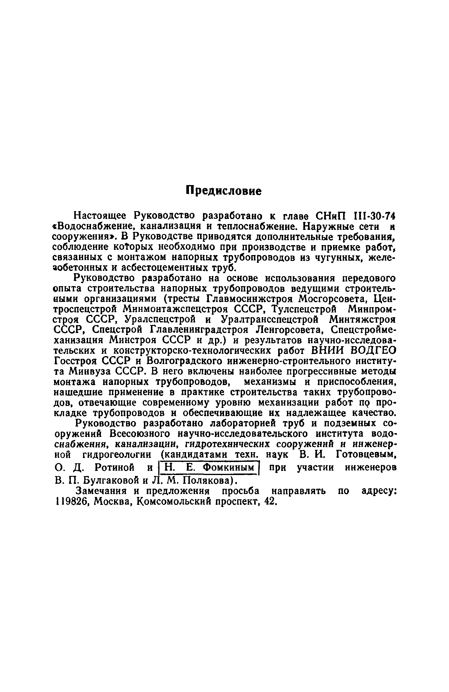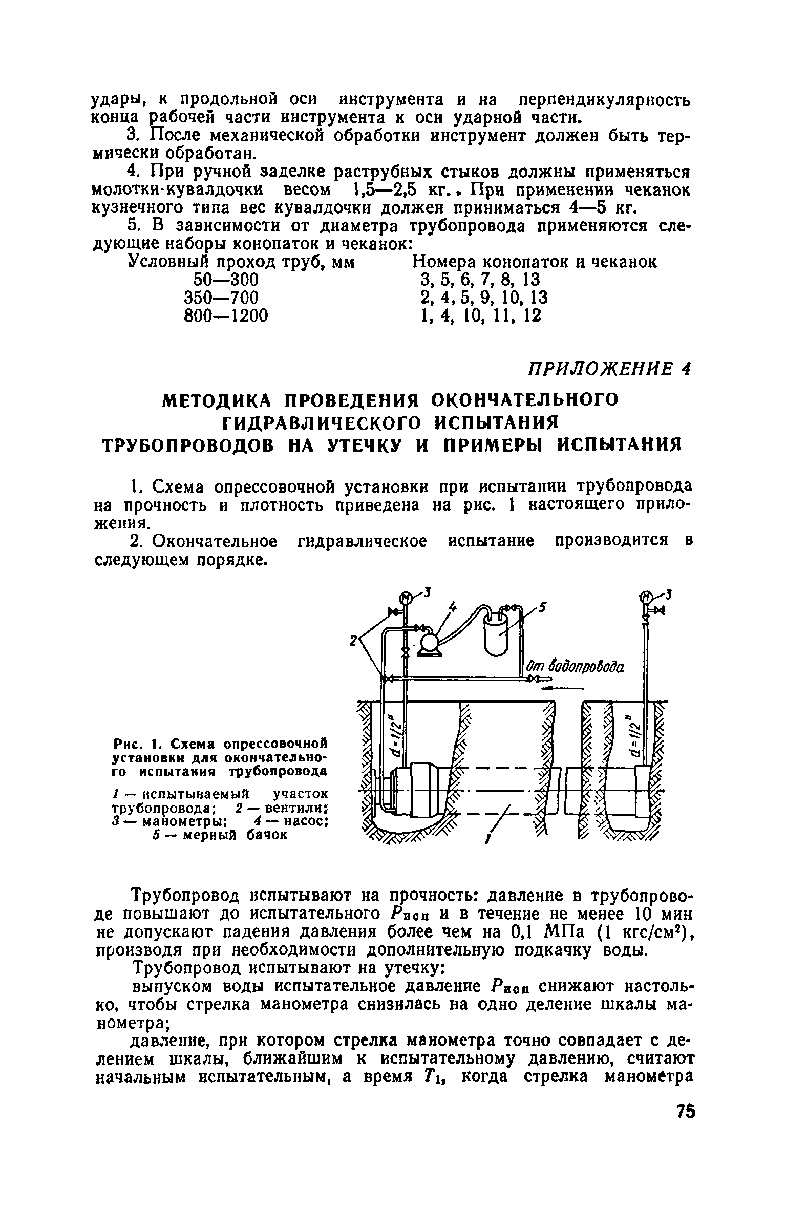 | Оглавление: | Предисловие 1. Общие указания 2. Требования, предъявляемые к трубам, муфтам и уплотняющим материалам А. Трубы и муфты Чугунные напорные трубы Железобетонные напорные трубы Асбестоцементные трубы и муфты Б. Уплотняющие материалы Резиновые уплотнители Пеньковая прядь Полисульфидные мастики-герметики 3. Транспортные. Погрузочно-разгрузочные работы и хранение материалов Трубы, муфты, резиновые уплотнители Герметики 4. Требования к производству земляных работ и подготовке основания под трубы 5. Монтаж трубопроводов Общие требования Монтаж чугунных труб с применением резиновых уплотняющих манжет Заделка стыковых соединений чугунных труб пеньковой прядью Приготовление асбестоцементной смеси асбестоцементного замка Заделка стыковых соединений чугунных труб герметиками Монтаж железобетонных раструбных труб с применением резиновых колец Монтаж асбестоцементных труб, изготовляемых по ГОСТ 539-73 и ТУ 21-24-77-76 Минпромстройматериалов СССР, на муфтах САМ с использованием резиновых колец фигурного сечения Монтаж асбестоцементных труб на чугунных муфтах с использованием резиновых колец круглого и трапециевидного сечения 6. Монтаж фасонных частей Монтаж фасонных частей на чугунных трубопроводах Монтаж фасонных частей на трубопроводах из железобетонных труб Монтаж фасонных частей на трубопроводах из асбестоцементных труб 7. Испытание напорных трубопроводов Общие требования Гидравлический способ испытания Пневматический способ испытания 8. Устранение дефектов трубопроводов Приложение 1. Схема испытательного стенда для предварительного испытания труб перед их укладкой в траншею Приложение 2. Основные данные о форме и размерах труб, муфт и резиновых уплотнителей Приложение 3. Инструмент, применяемый при заделке стыковых соединений труб пеньковой прядью и асбестоцементом Приложение 4. Методика проведения окончательного гидравлического испытания трубопроводов на утечку и примеры испытания Приложение 5. Требования по пневматическому испытанию чугунных, железобетонных и асбестоцементных трубопроводов и порядок проведения испытания Приложение 6. Форма актов о проведении гидравлического и пневматического испытания трубопроводов Приложение 7. Краткие указания по промывке и дезинфекции трубопроводов питьевого назначения Приложение 8. Краткие указания по технике безопасности при выполнении работ по монтажу напорных трубопроводов |