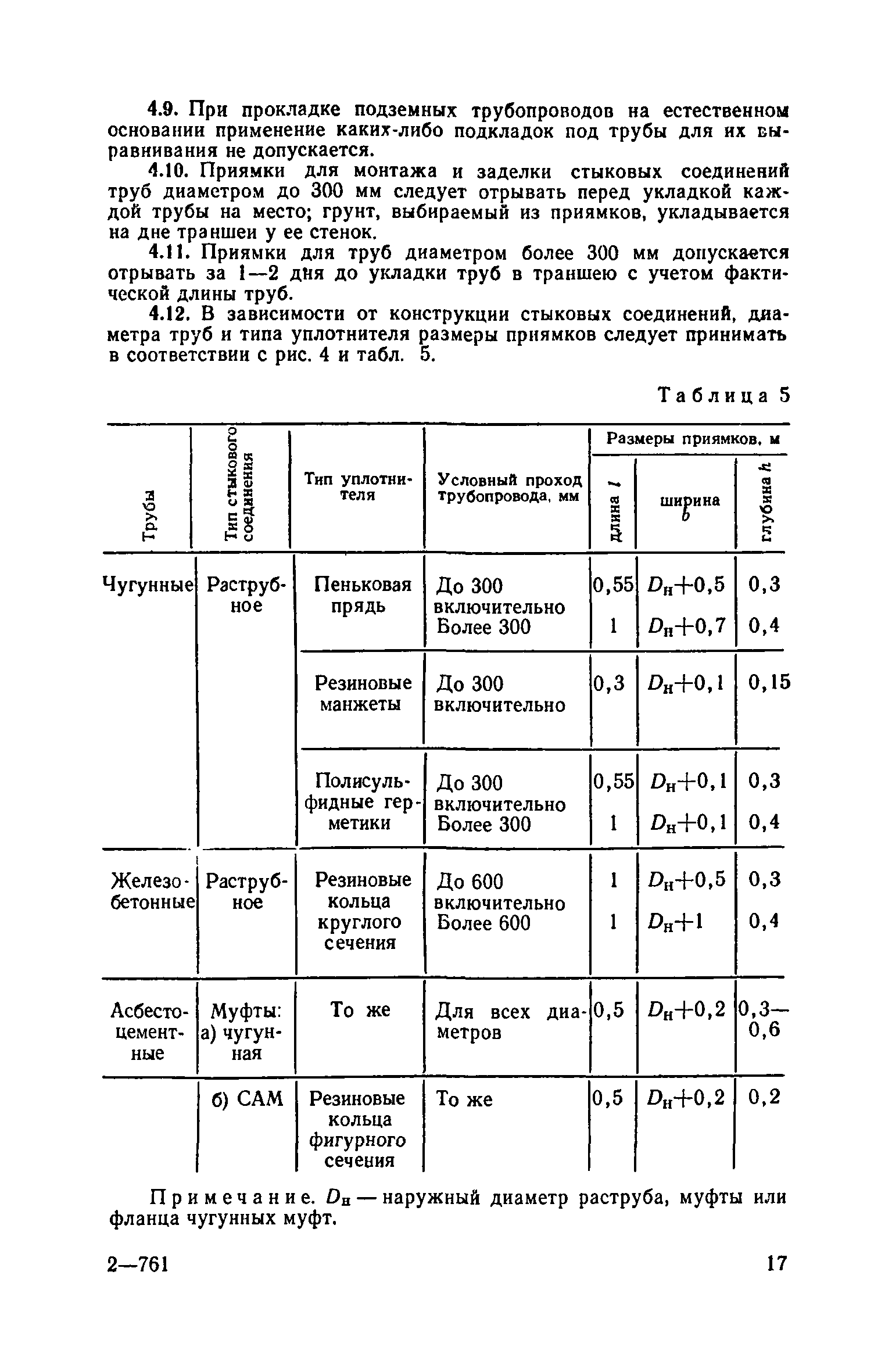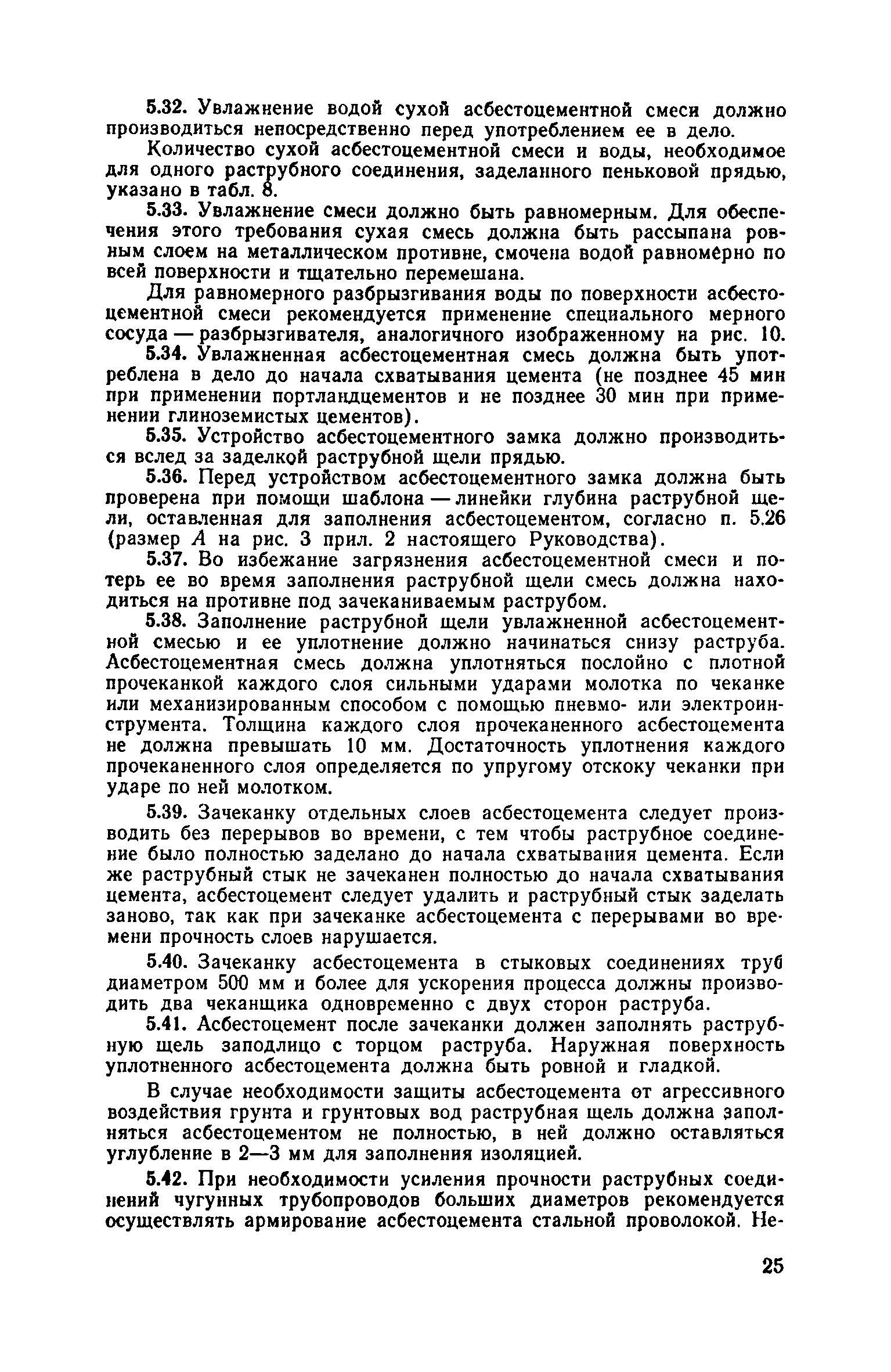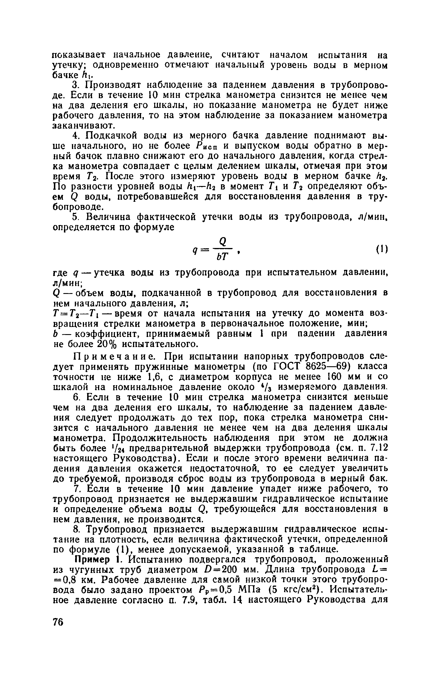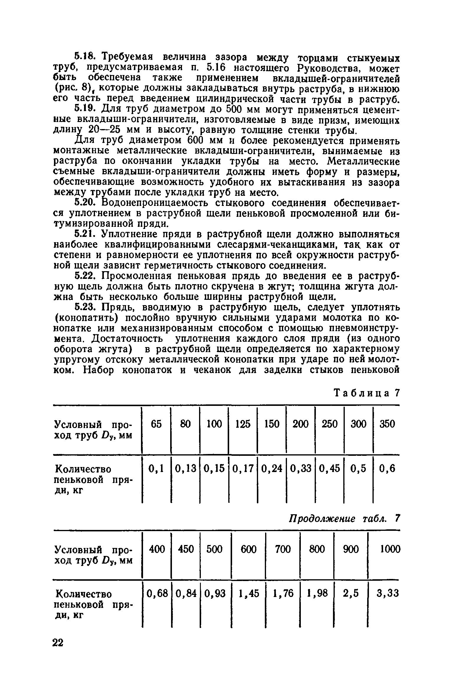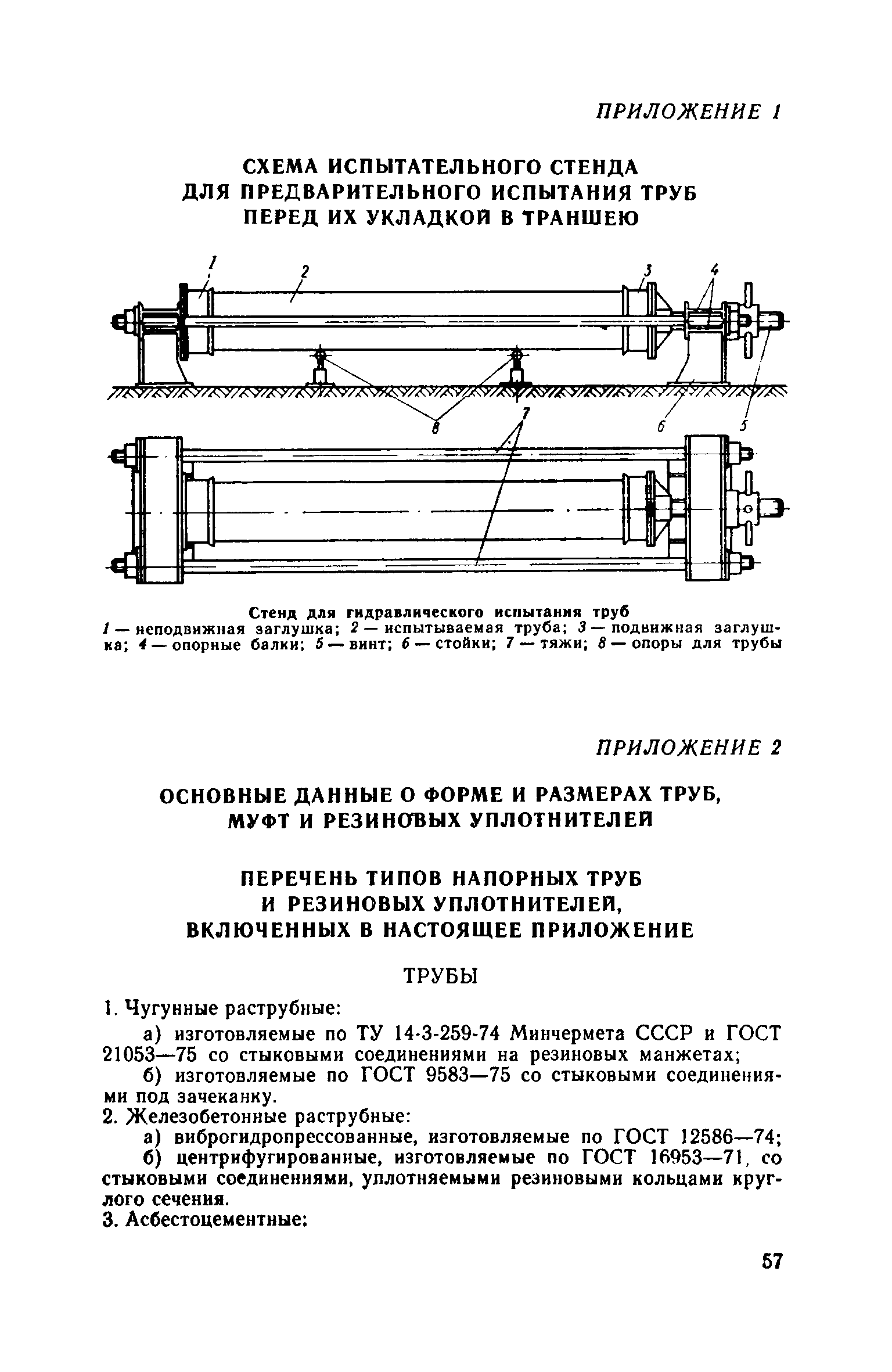 | Оглавление: | Предисловие 1. Общие указания 2. Требования, предъявляемые к трубам, муфтам и уплотняющим материалам А. Трубы и муфты Чугунные напорные трубы Железобетонные напорные трубы Асбестоцементные трубы и муфты Б. Уплотняющие материалы Резиновые уплотнители Пеньковая прядь Полисульфидные мастики-герметики 3. Транспортные. Погрузочно-разгрузочные работы и хранение материалов Трубы, муфты, резиновые уплотнители Герметики 4. Требования к производству земляных работ и подготовке основания под трубы 5. Монтаж трубопроводов Общие требования Монтаж чугунных труб с применением резиновых уплотняющих манжет Заделка стыковых соединений чугунных труб пеньковой прядью Приготовление асбестоцементной смеси асбестоцементного замка Заделка стыковых соединений чугунных труб герметиками Монтаж железобетонных раструбных труб с применением резиновых колец Монтаж асбестоцементных труб, изготовляемых по ГОСТ 539-73 и ТУ 21-24-77-76 Минпромстройматериалов СССР, на муфтах САМ с использованием резиновых колец фигурного сечения Монтаж асбестоцементных труб на чугунных муфтах с использованием резиновых колец круглого и трапециевидного сечения 6. Монтаж фасонных частей Монтаж фасонных частей на чугунных трубопроводах Монтаж фасонных частей на трубопроводах из железобетонных труб Монтаж фасонных частей на трубопроводах из асбестоцементных труб 7. Испытание напорных трубопроводов Общие требования Гидравлический способ испытания Пневматический способ испытания 8. Устранение дефектов трубопроводов Приложение 1. Схема испытательного стенда для предварительного испытания труб перед их укладкой в траншею Приложение 2. Основные данные о форме и размерах труб, муфт и резиновых уплотнителей Приложение 3. Инструмент, применяемый при заделке стыковых соединений труб пеньковой прядью и асбестоцементом Приложение 4. Методика проведения окончательного гидравлического испытания трубопроводов на утечку и примеры испытания Приложение 5. Требования по пневматическому испытанию чугунных, железобетонных и асбестоцементных трубопроводов и порядок проведения испытания Приложение 6. Форма актов о проведении гидравлического и пневматического испытания трубопроводов Приложение 7. Краткие указания по промывке и дезинфекции трубопроводов питьевого назначения Приложение 8. Краткие указания по технике безопасности при выполнении работ по монтажу напорных трубопроводов |