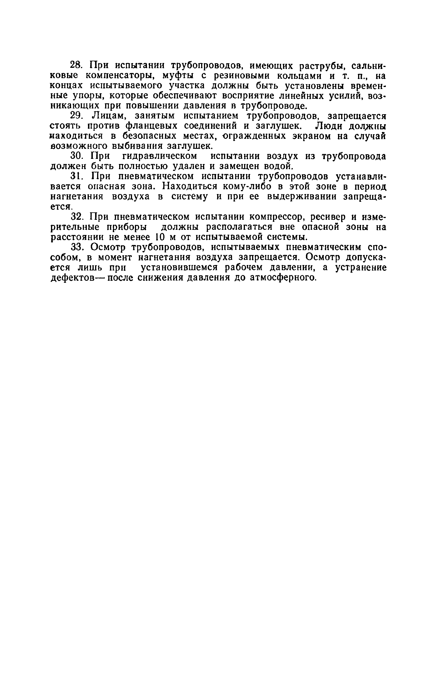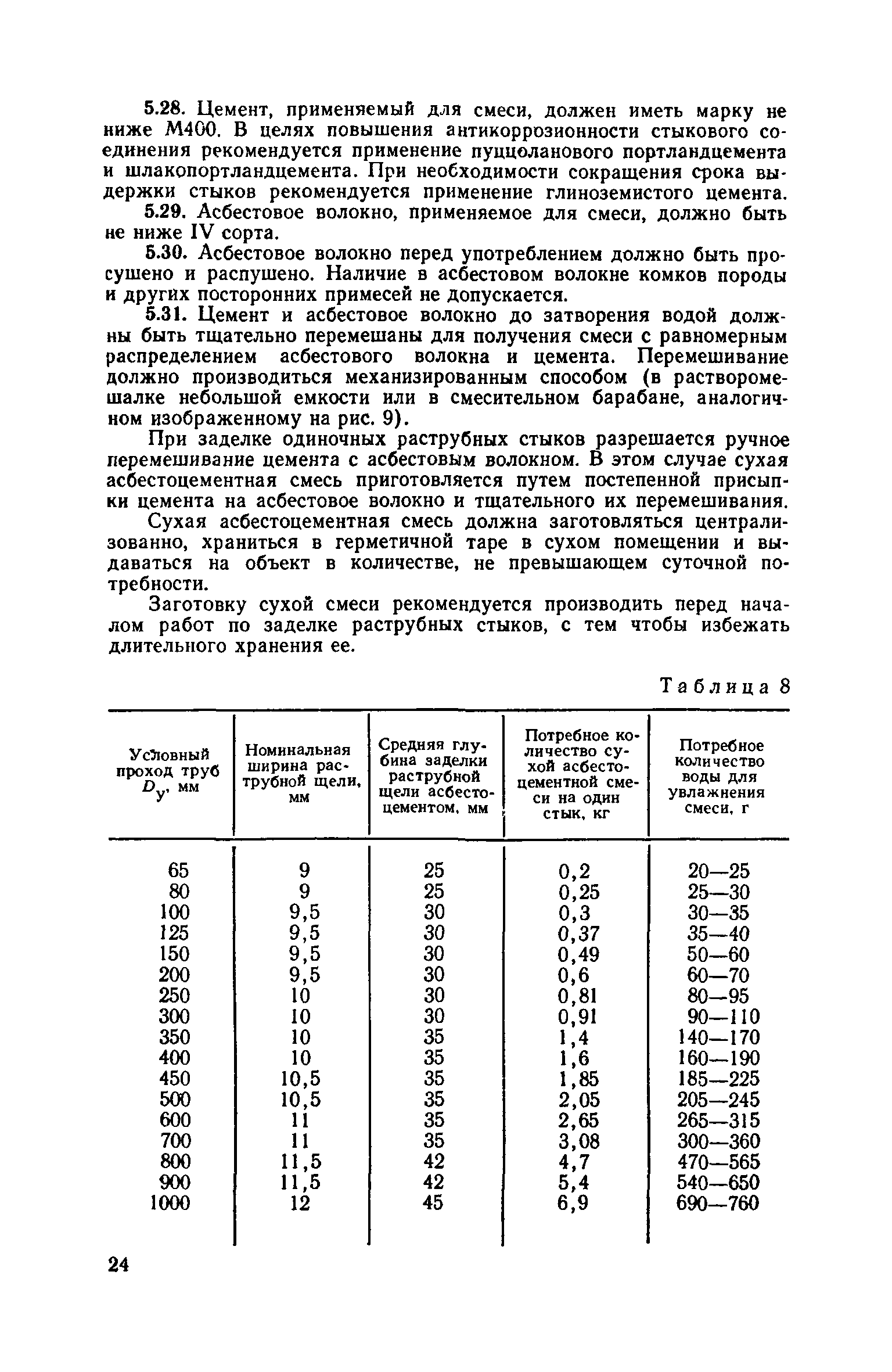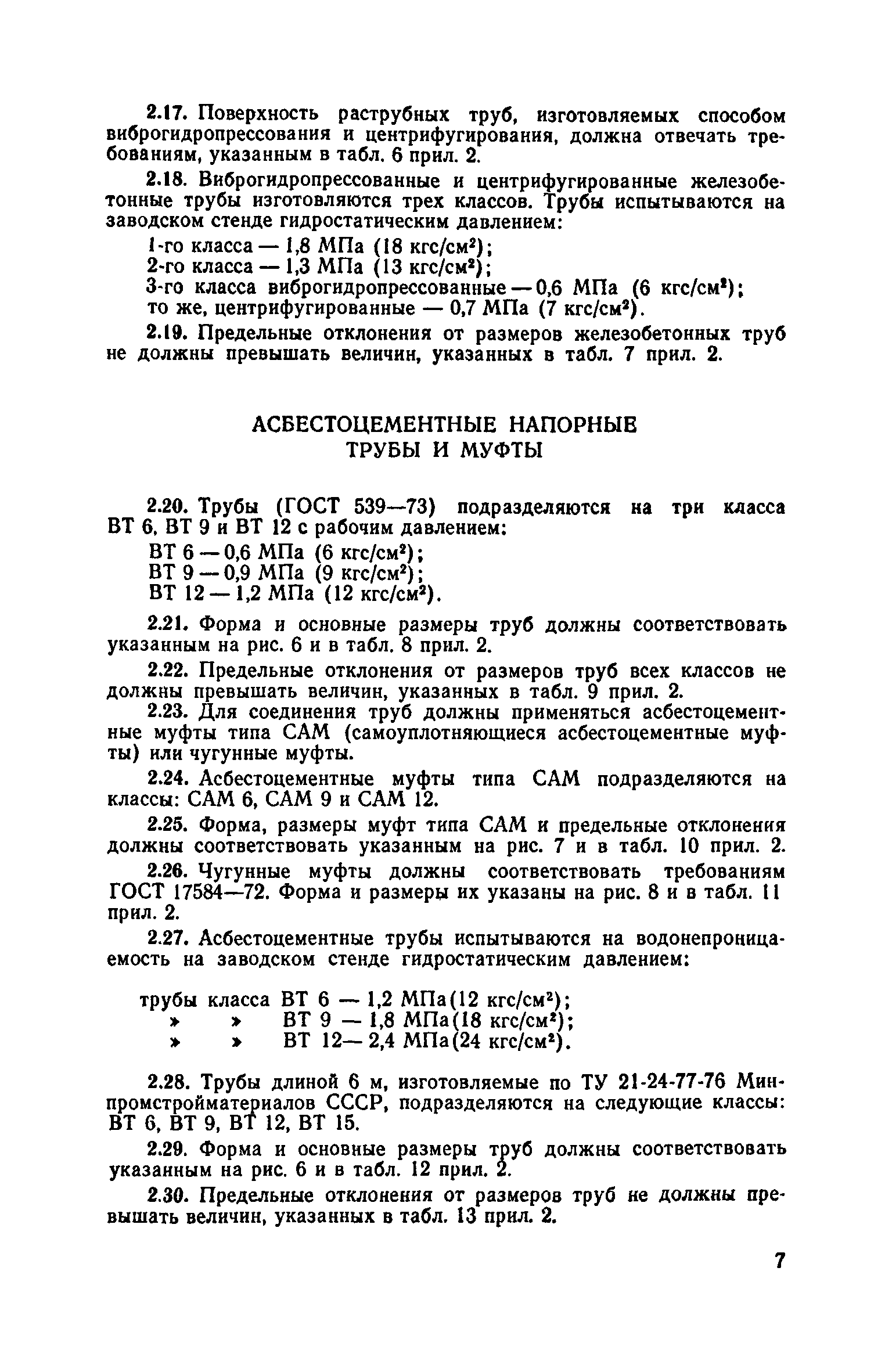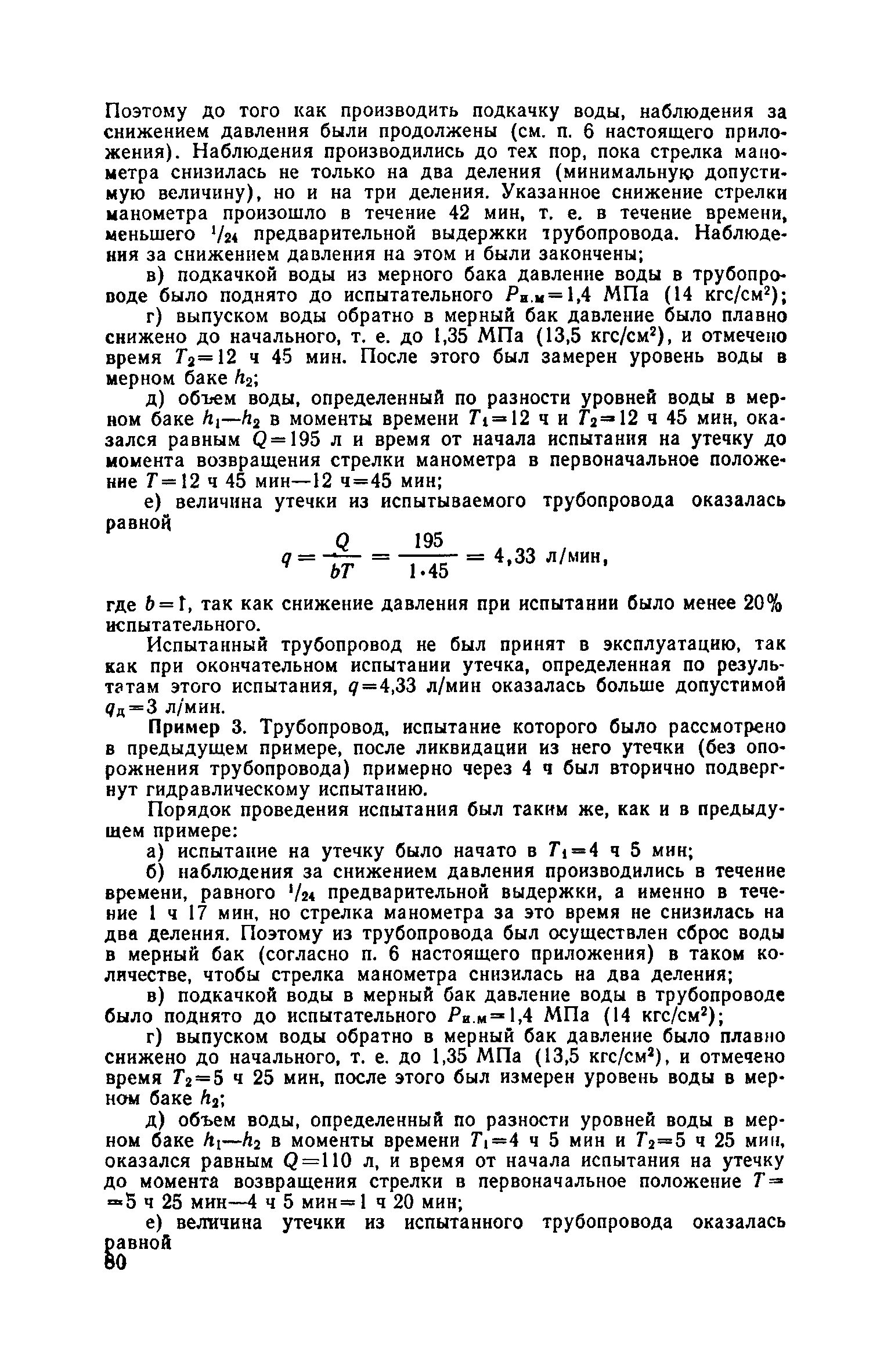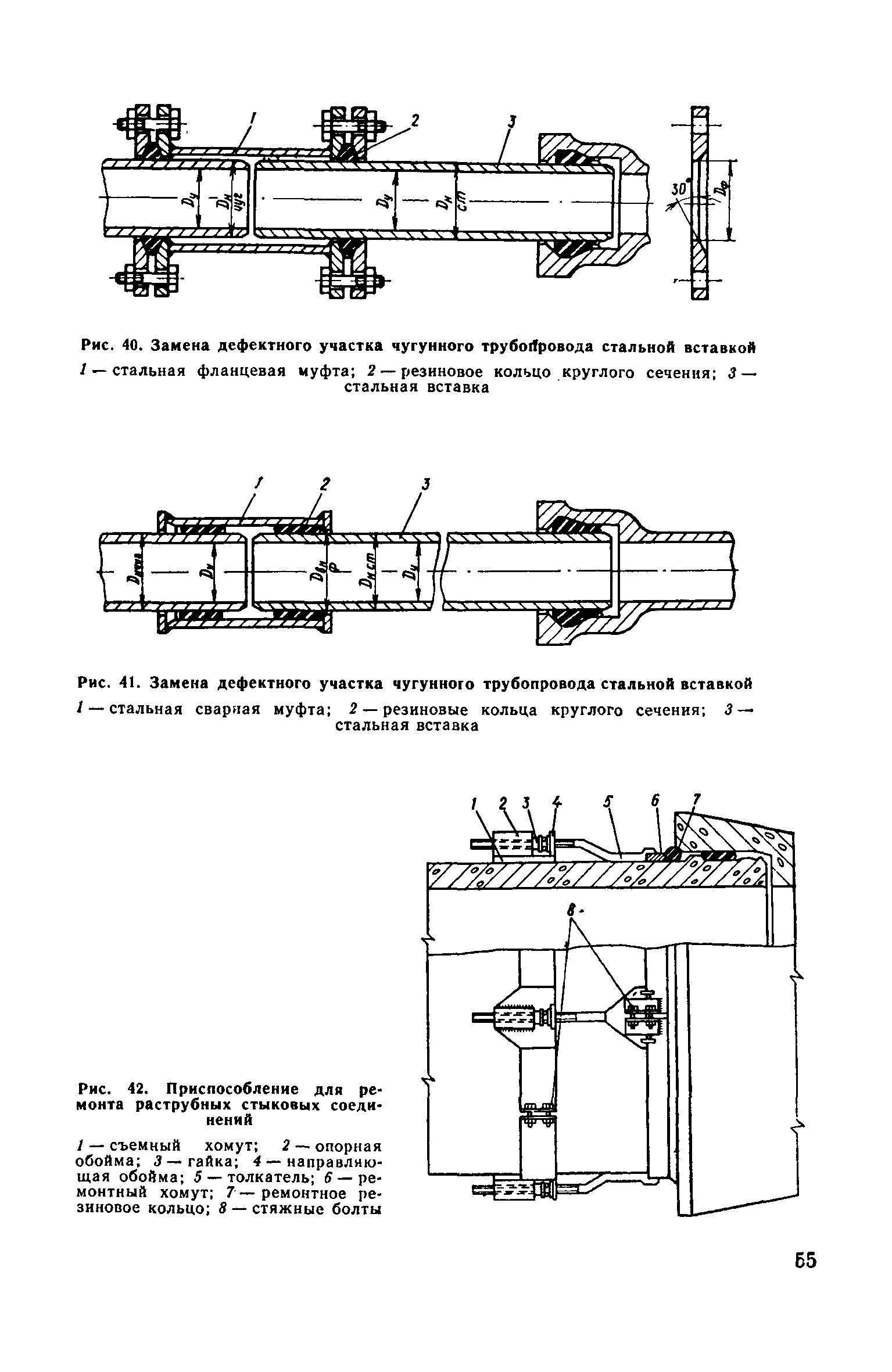 | Оглавление: | Предисловие 1. Общие указания 2. Требования, предъявляемые к трубам, муфтам и уплотняющим материалам А. Трубы и муфты Чугунные напорные трубы Железобетонные напорные трубы Асбестоцементные трубы и муфты Б. Уплотняющие материалы Резиновые уплотнители Пеньковая прядь Полисульфидные мастики-герметики 3. Транспортные. Погрузочно-разгрузочные работы и хранение материалов Трубы, муфты, резиновые уплотнители Герметики 4. Требования к производству земляных работ и подготовке основания под трубы 5. Монтаж трубопроводов Общие требования Монтаж чугунных труб с применением резиновых уплотняющих манжет Заделка стыковых соединений чугунных труб пеньковой прядью Приготовление асбестоцементной смеси асбестоцементного замка Заделка стыковых соединений чугунных труб герметиками Монтаж железобетонных раструбных труб с применением резиновых колец Монтаж асбестоцементных труб, изготовляемых по ГОСТ 539-73 и ТУ 21-24-77-76 Минпромстройматериалов СССР, на муфтах САМ с использованием резиновых колец фигурного сечения Монтаж асбестоцементных труб на чугунных муфтах с использованием резиновых колец круглого и трапециевидного сечения 6. Монтаж фасонных частей Монтаж фасонных частей на чугунных трубопроводах Монтаж фасонных частей на трубопроводах из железобетонных труб Монтаж фасонных частей на трубопроводах из асбестоцементных труб 7. Испытание напорных трубопроводов Общие требования Гидравлический способ испытания Пневматический способ испытания 8. Устранение дефектов трубопроводов Приложение 1. Схема испытательного стенда для предварительного испытания труб перед их укладкой в траншею Приложение 2. Основные данные о форме и размерах труб, муфт и резиновых уплотнителей Приложение 3. Инструмент, применяемый при заделке стыковых соединений труб пеньковой прядью и асбестоцементом Приложение 4. Методика проведения окончательного гидравлического испытания трубопроводов на утечку и примеры испытания Приложение 5. Требования по пневматическому испытанию чугунных, железобетонных и асбестоцементных трубопроводов и порядок проведения испытания Приложение 6. Форма актов о проведении гидравлического и пневматического испытания трубопроводов Приложение 7. Краткие указания по промывке и дезинфекции трубопроводов питьевого назначения Приложение 8. Краткие указания по технике безопасности при выполнении работ по монтажу напорных трубопроводов |