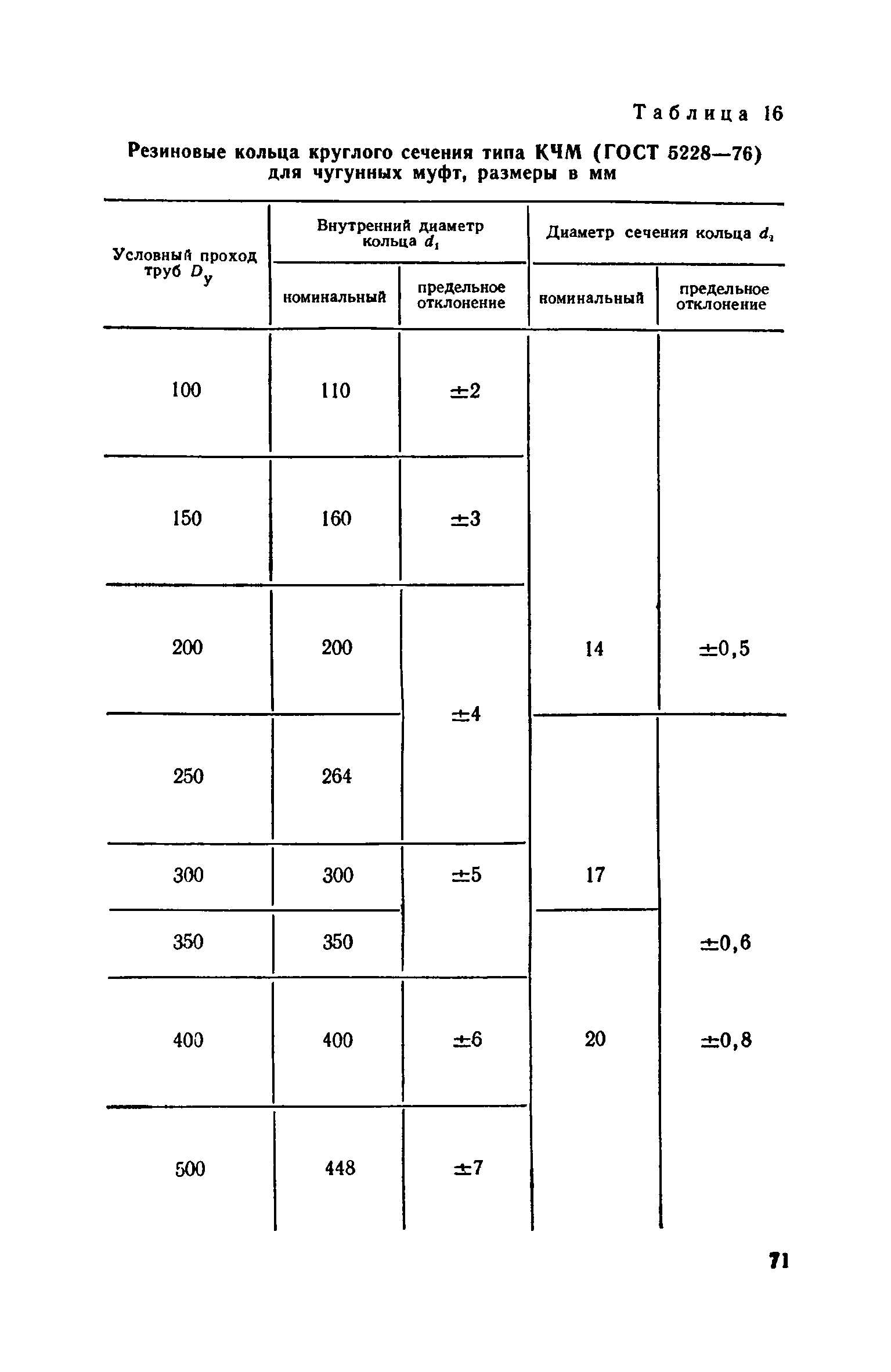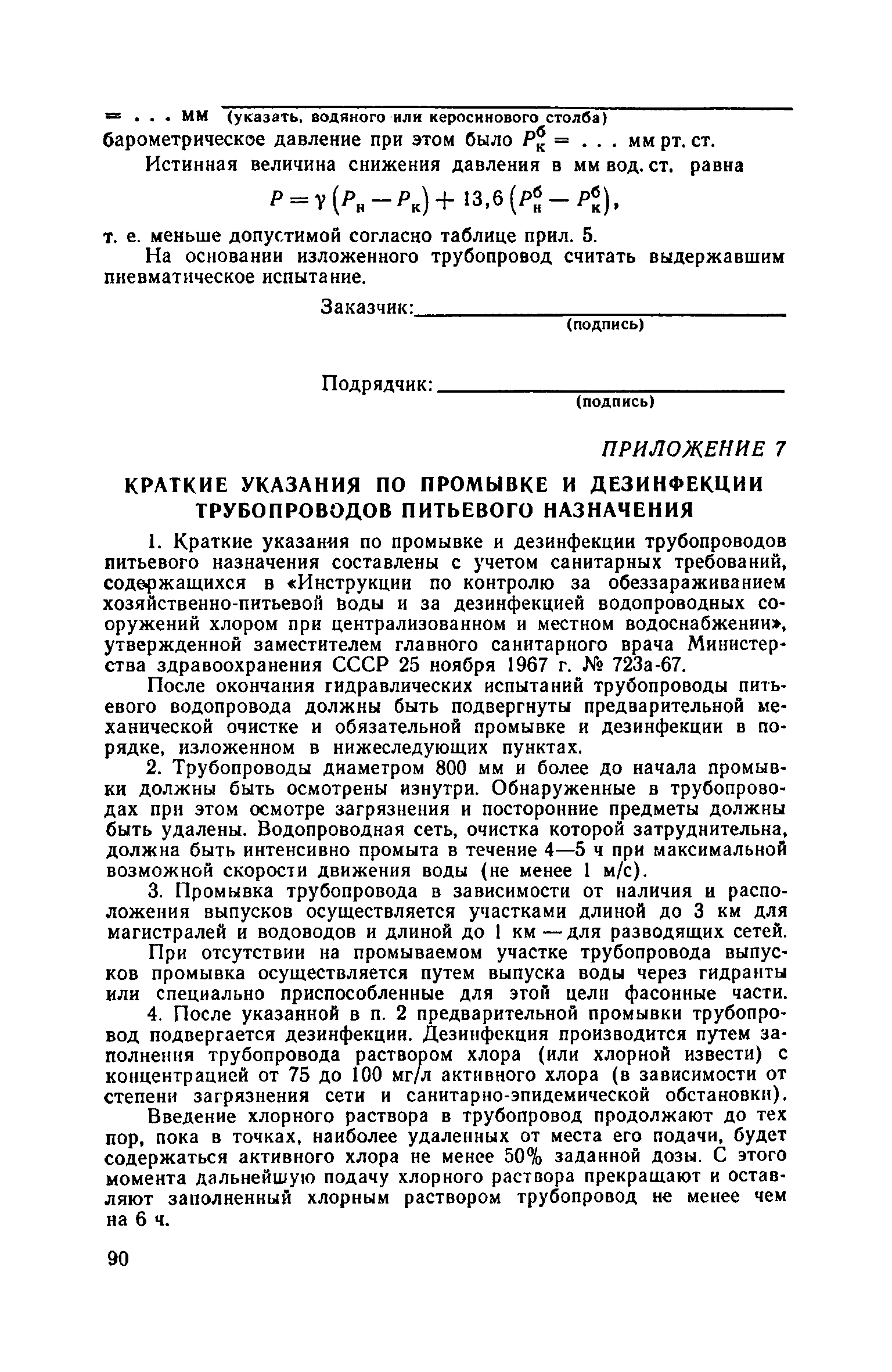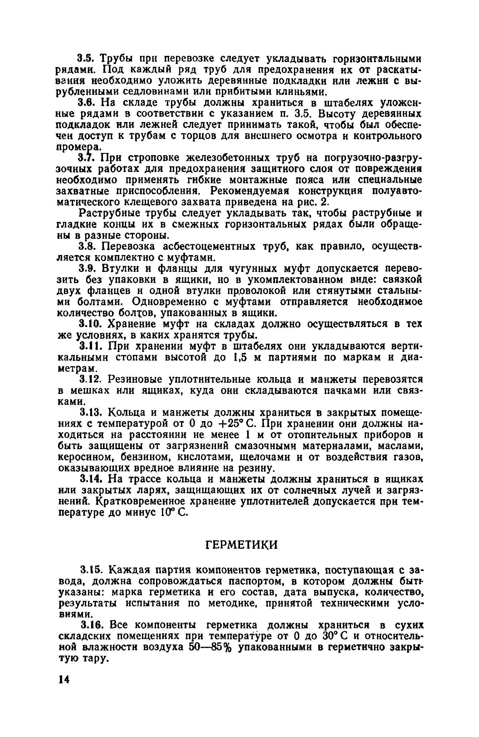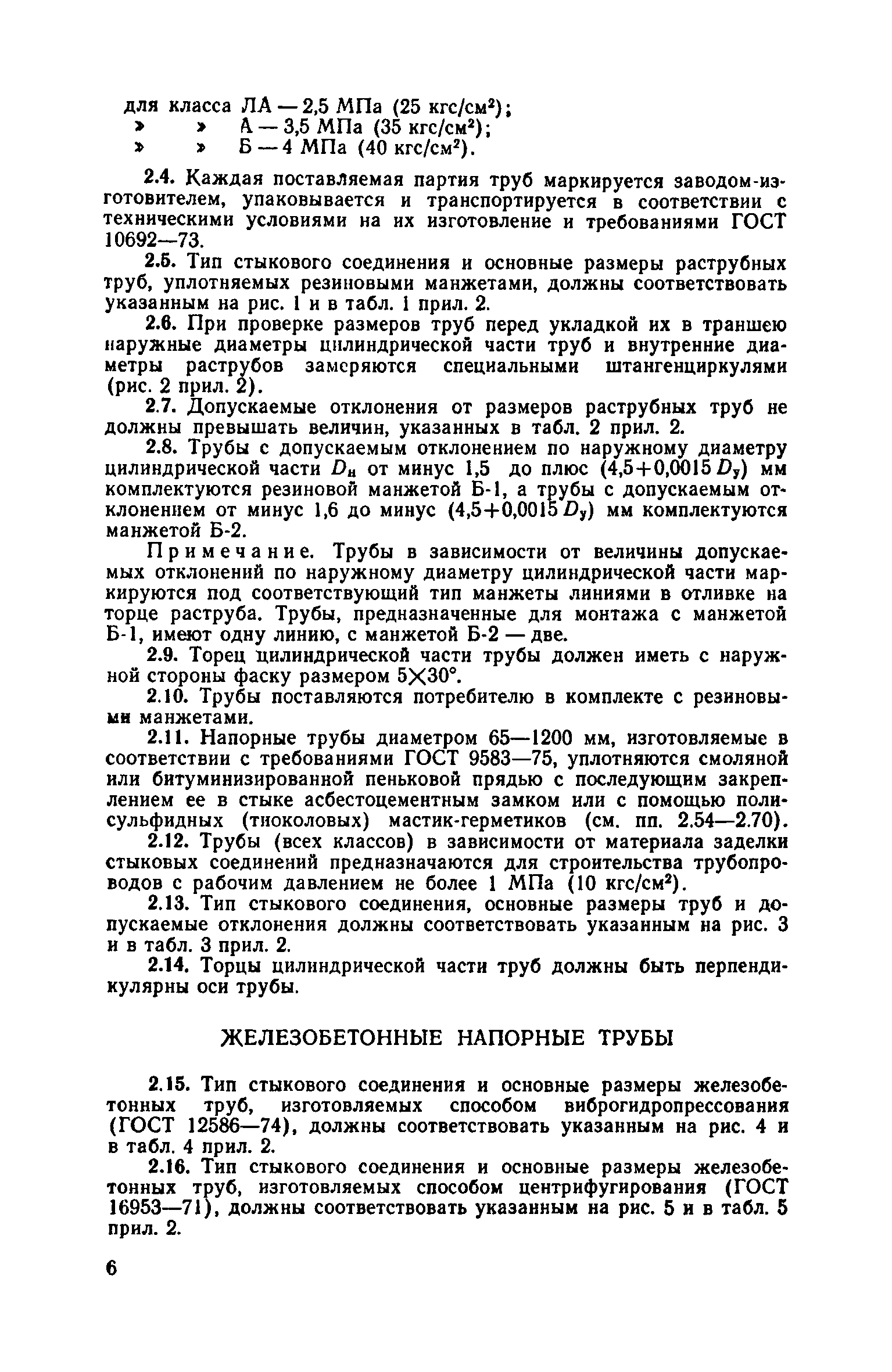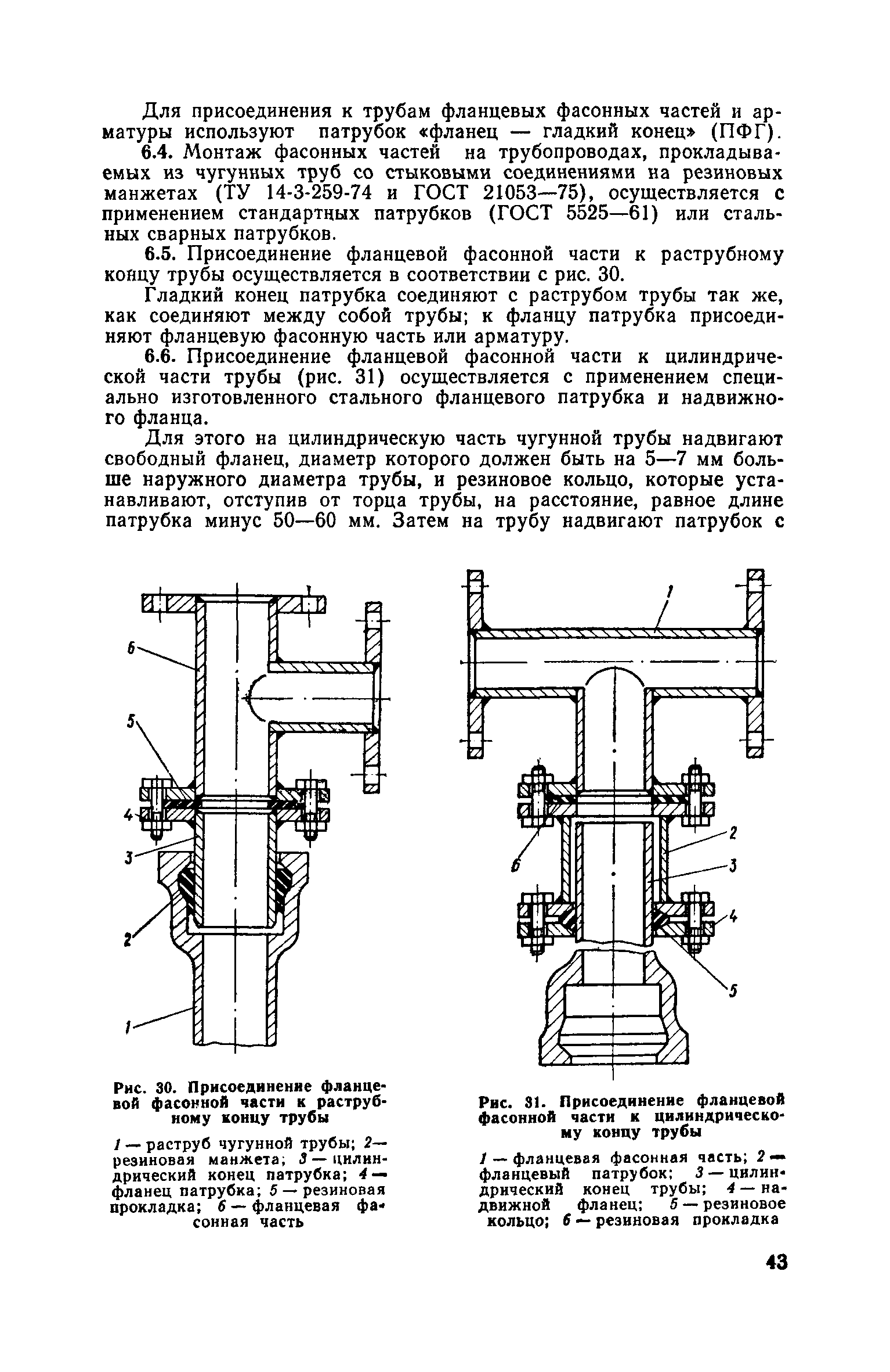 | Оглавление: | Предисловие 1. Общие указания 2. Требования, предъявляемые к трубам, муфтам и уплотняющим материалам А. Трубы и муфты Чугунные напорные трубы Железобетонные напорные трубы Асбестоцементные трубы и муфты Б. Уплотняющие материалы Резиновые уплотнители Пеньковая прядь Полисульфидные мастики-герметики 3. Транспортные. Погрузочно-разгрузочные работы и хранение материалов Трубы, муфты, резиновые уплотнители Герметики 4. Требования к производству земляных работ и подготовке основания под трубы 5. Монтаж трубопроводов Общие требования Монтаж чугунных труб с применением резиновых уплотняющих манжет Заделка стыковых соединений чугунных труб пеньковой прядью Приготовление асбестоцементной смеси асбестоцементного замка Заделка стыковых соединений чугунных труб герметиками Монтаж железобетонных раструбных труб с применением резиновых колец Монтаж асбестоцементных труб, изготовляемых по ГОСТ 539-73 и ТУ 21-24-77-76 Минпромстройматериалов СССР, на муфтах САМ с использованием резиновых колец фигурного сечения Монтаж асбестоцементных труб на чугунных муфтах с использованием резиновых колец круглого и трапециевидного сечения 6. Монтаж фасонных частей Монтаж фасонных частей на чугунных трубопроводах Монтаж фасонных частей на трубопроводах из железобетонных труб Монтаж фасонных частей на трубопроводах из асбестоцементных труб 7. Испытание напорных трубопроводов Общие требования Гидравлический способ испытания Пневматический способ испытания 8. Устранение дефектов трубопроводов Приложение 1. Схема испытательного стенда для предварительного испытания труб перед их укладкой в траншею Приложение 2. Основные данные о форме и размерах труб, муфт и резиновых уплотнителей Приложение 3. Инструмент, применяемый при заделке стыковых соединений труб пеньковой прядью и асбестоцементом Приложение 4. Методика проведения окончательного гидравлического испытания трубопроводов на утечку и примеры испытания Приложение 5. Требования по пневматическому испытанию чугунных, железобетонных и асбестоцементных трубопроводов и порядок проведения испытания Приложение 6. Форма актов о проведении гидравлического и пневматического испытания трубопроводов Приложение 7. Краткие указания по промывке и дезинфекции трубопроводов питьевого назначения Приложение 8. Краткие указания по технике безопасности при выполнении работ по монтажу напорных трубопроводов |