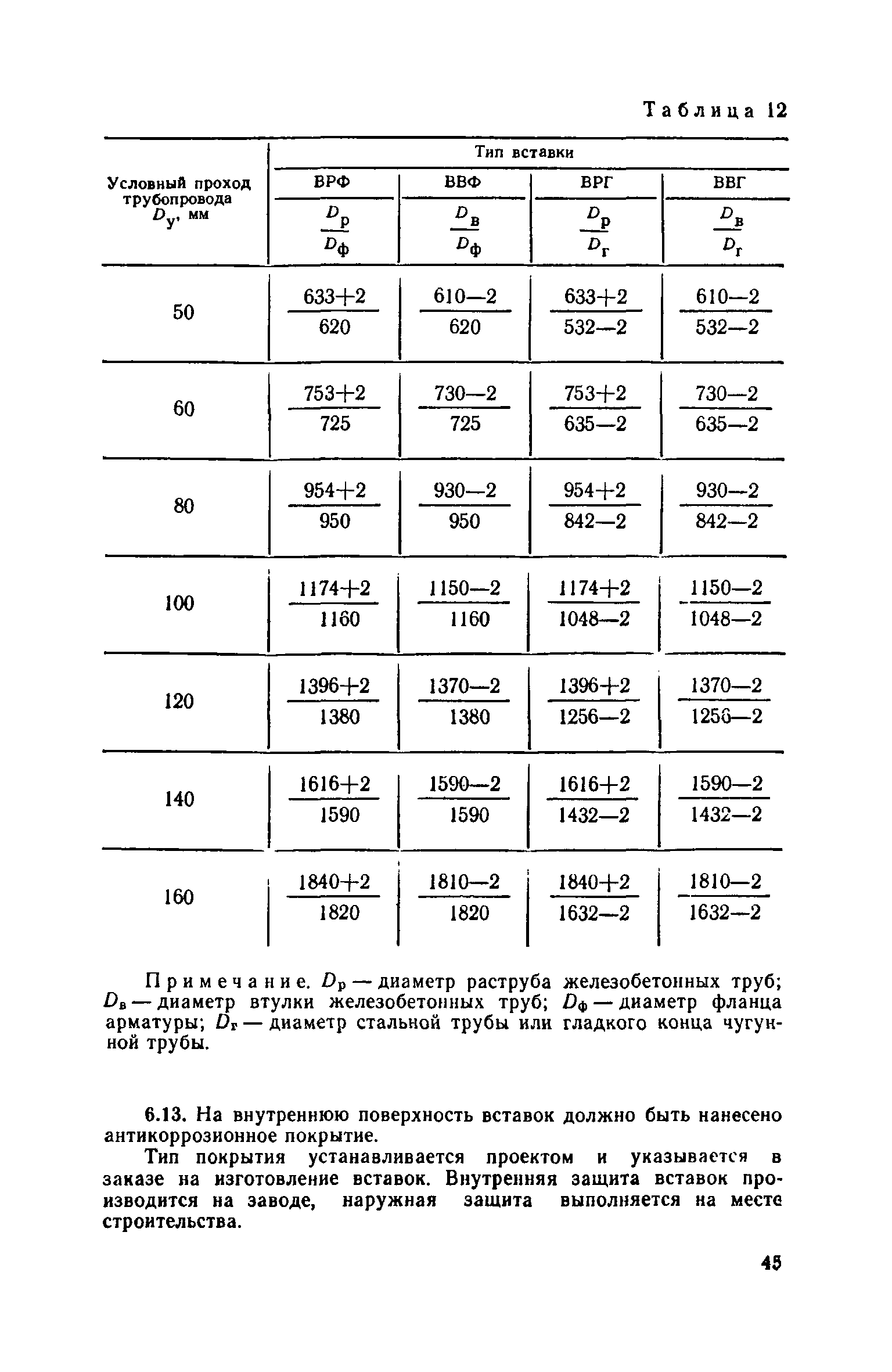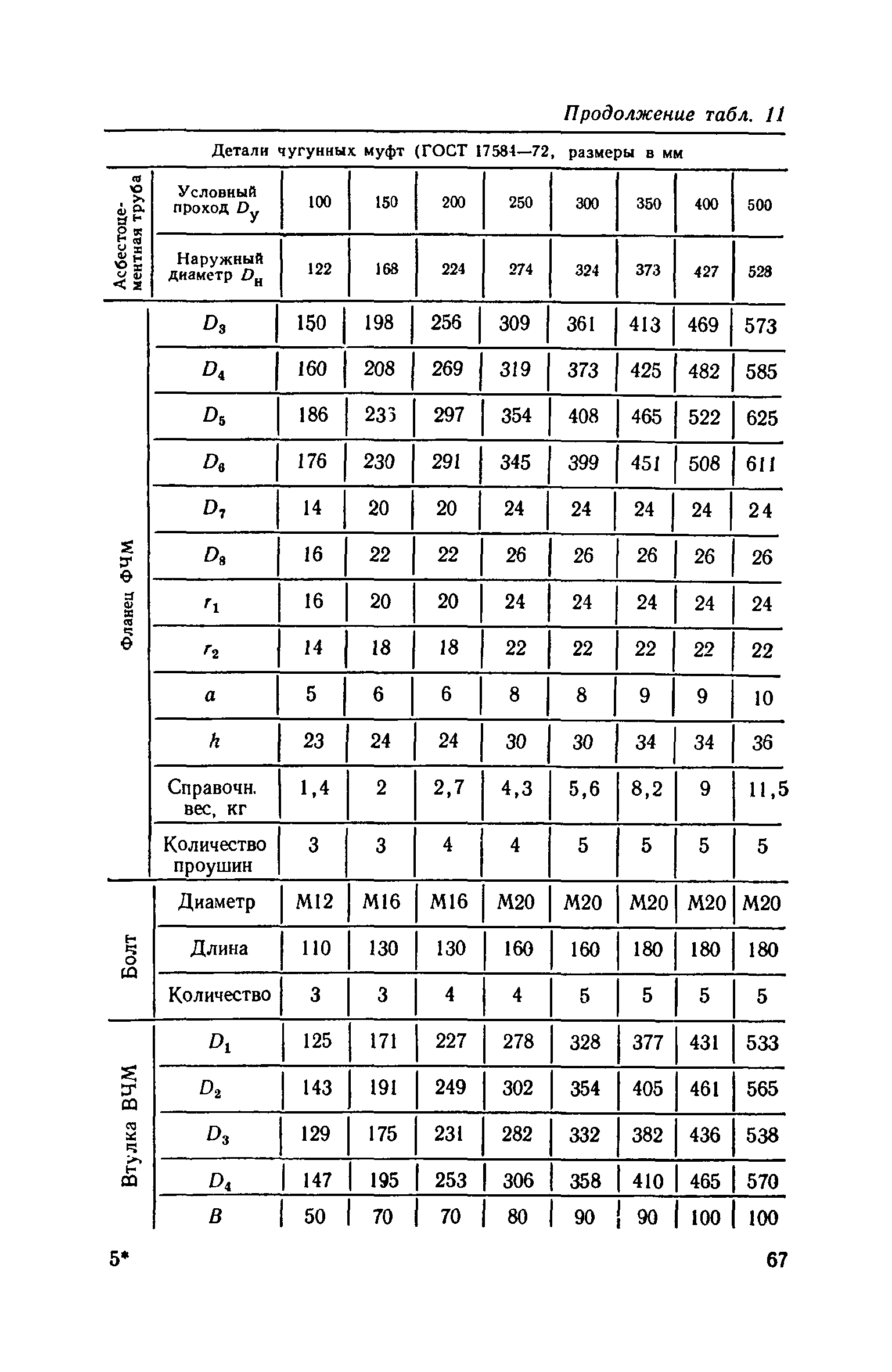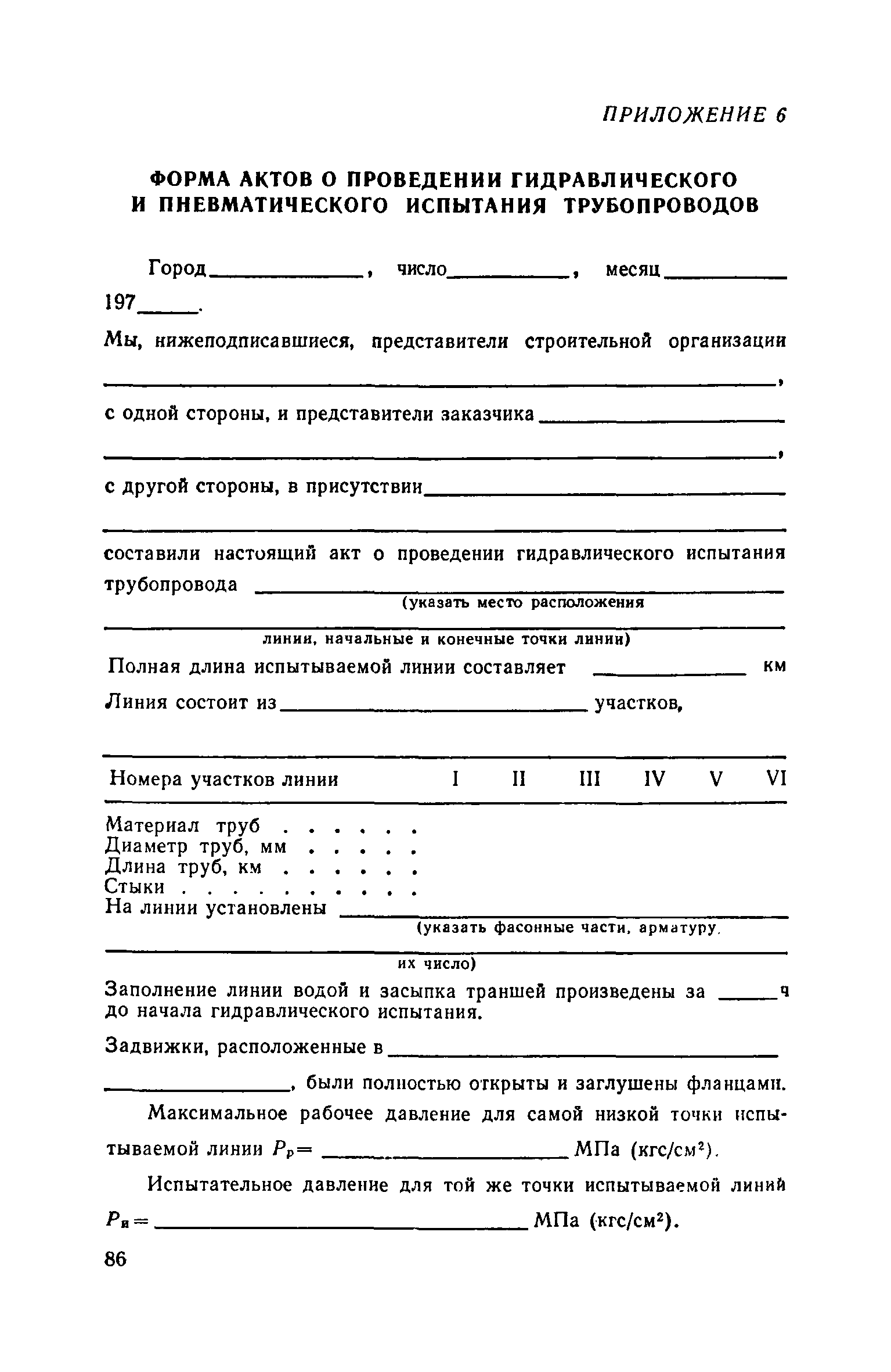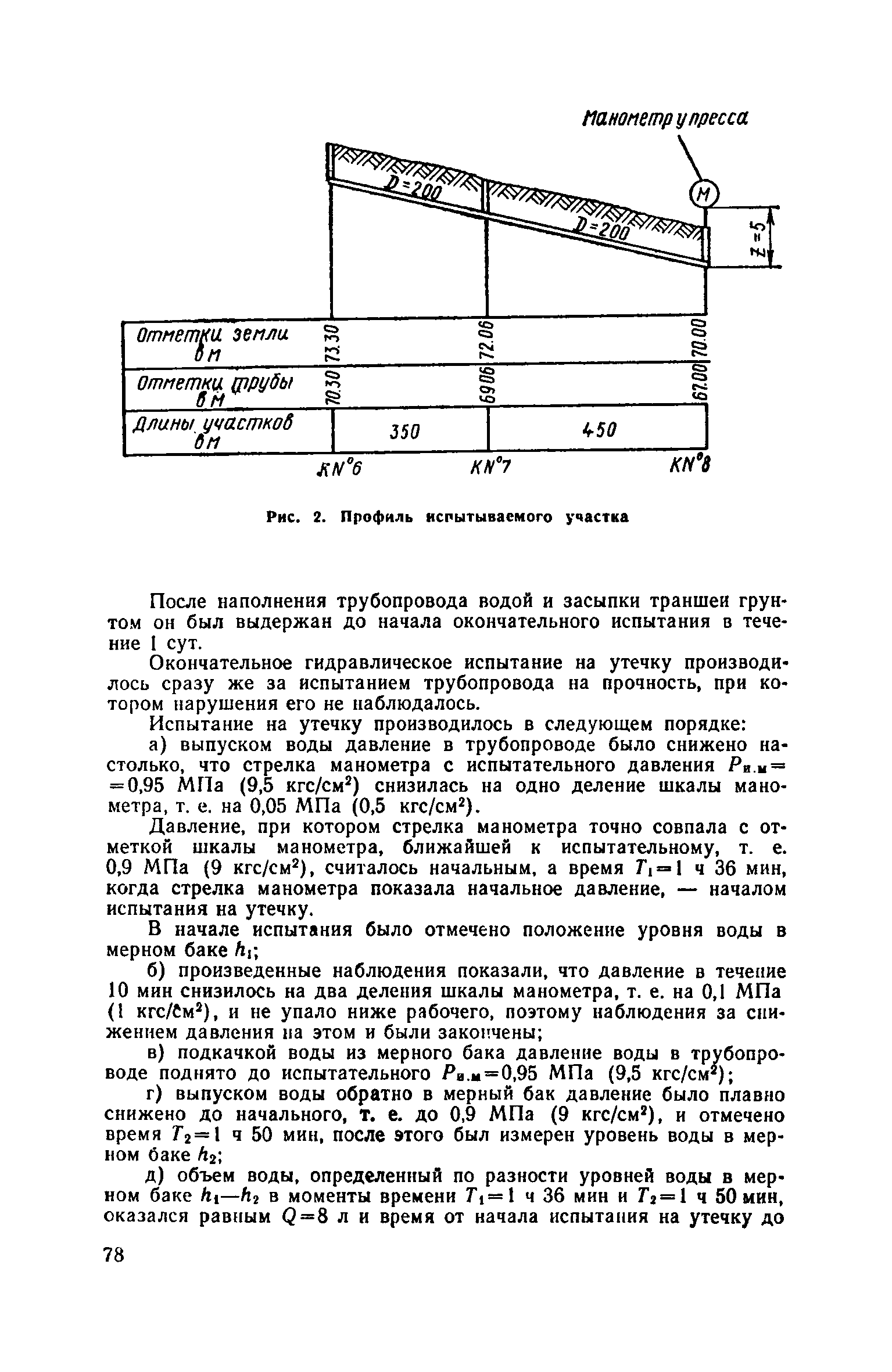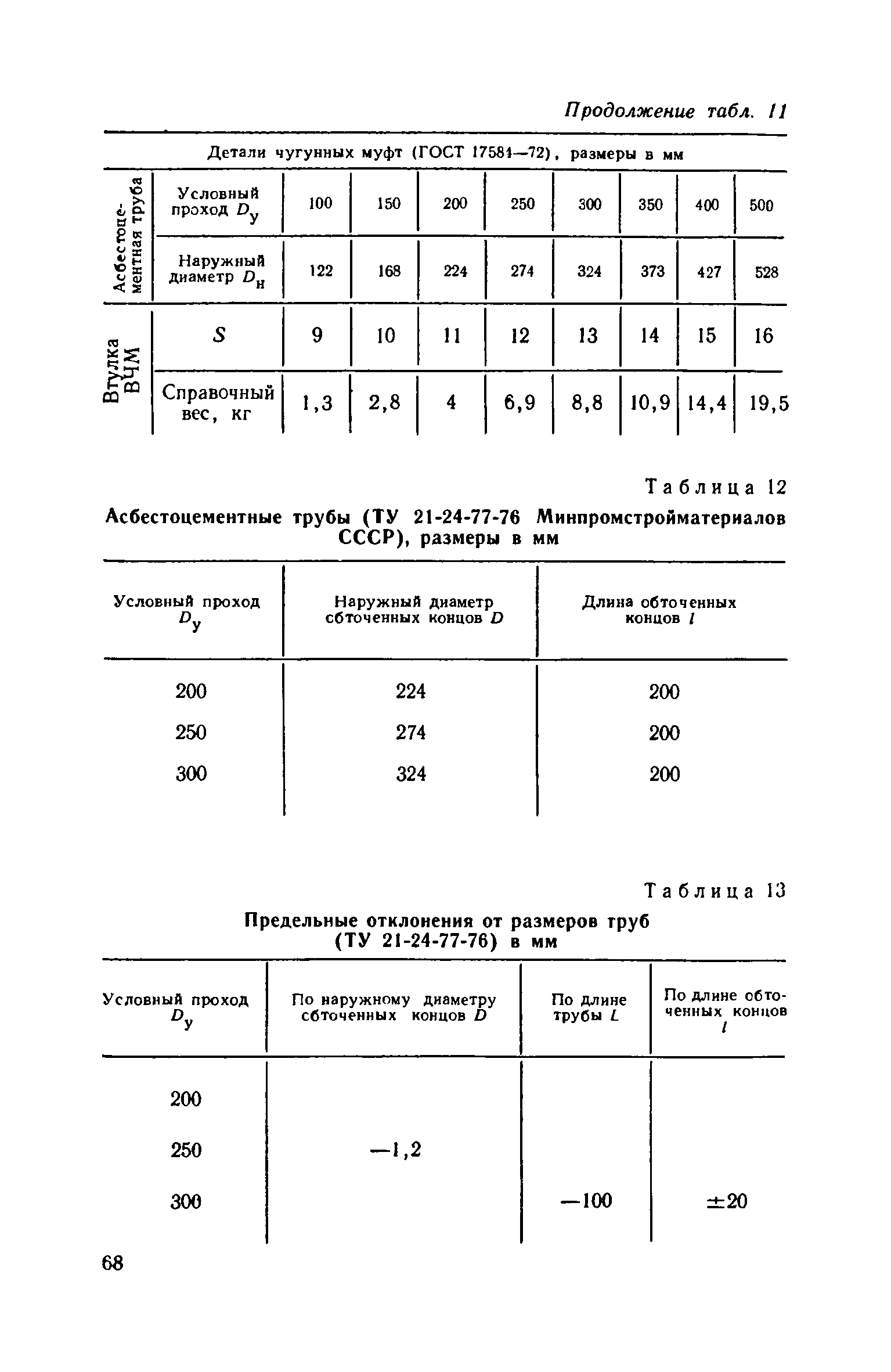 | Оглавление: | Предисловие 1. Общие указания 2. Требования, предъявляемые к трубам, муфтам и уплотняющим материалам А. Трубы и муфты Чугунные напорные трубы Железобетонные напорные трубы Асбестоцементные трубы и муфты Б. Уплотняющие материалы Резиновые уплотнители Пеньковая прядь Полисульфидные мастики-герметики 3. Транспортные. Погрузочно-разгрузочные работы и хранение материалов Трубы, муфты, резиновые уплотнители Герметики 4. Требования к производству земляных работ и подготовке основания под трубы 5. Монтаж трубопроводов Общие требования Монтаж чугунных труб с применением резиновых уплотняющих манжет Заделка стыковых соединений чугунных труб пеньковой прядью Приготовление асбестоцементной смеси асбестоцементного замка Заделка стыковых соединений чугунных труб герметиками Монтаж железобетонных раструбных труб с применением резиновых колец Монтаж асбестоцементных труб, изготовляемых по ГОСТ 539-73 и ТУ 21-24-77-76 Минпромстройматериалов СССР, на муфтах САМ с использованием резиновых колец фигурного сечения Монтаж асбестоцементных труб на чугунных муфтах с использованием резиновых колец круглого и трапециевидного сечения 6. Монтаж фасонных частей Монтаж фасонных частей на чугунных трубопроводах Монтаж фасонных частей на трубопроводах из железобетонных труб Монтаж фасонных частей на трубопроводах из асбестоцементных труб 7. Испытание напорных трубопроводов Общие требования Гидравлический способ испытания Пневматический способ испытания 8. Устранение дефектов трубопроводов Приложение 1. Схема испытательного стенда для предварительного испытания труб перед их укладкой в траншею Приложение 2. Основные данные о форме и размерах труб, муфт и резиновых уплотнителей Приложение 3. Инструмент, применяемый при заделке стыковых соединений труб пеньковой прядью и асбестоцементом Приложение 4. Методика проведения окончательного гидравлического испытания трубопроводов на утечку и примеры испытания Приложение 5. Требования по пневматическому испытанию чугунных, железобетонных и асбестоцементных трубопроводов и порядок проведения испытания Приложение 6. Форма актов о проведении гидравлического и пневматического испытания трубопроводов Приложение 7. Краткие указания по промывке и дезинфекции трубопроводов питьевого назначения Приложение 8. Краткие указания по технике безопасности при выполнении работ по монтажу напорных трубопроводов |