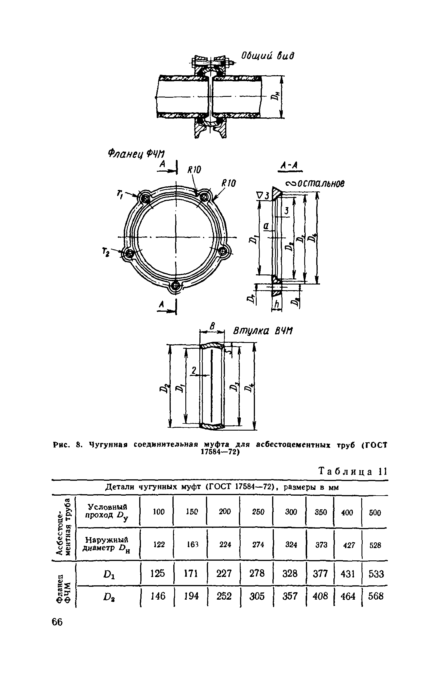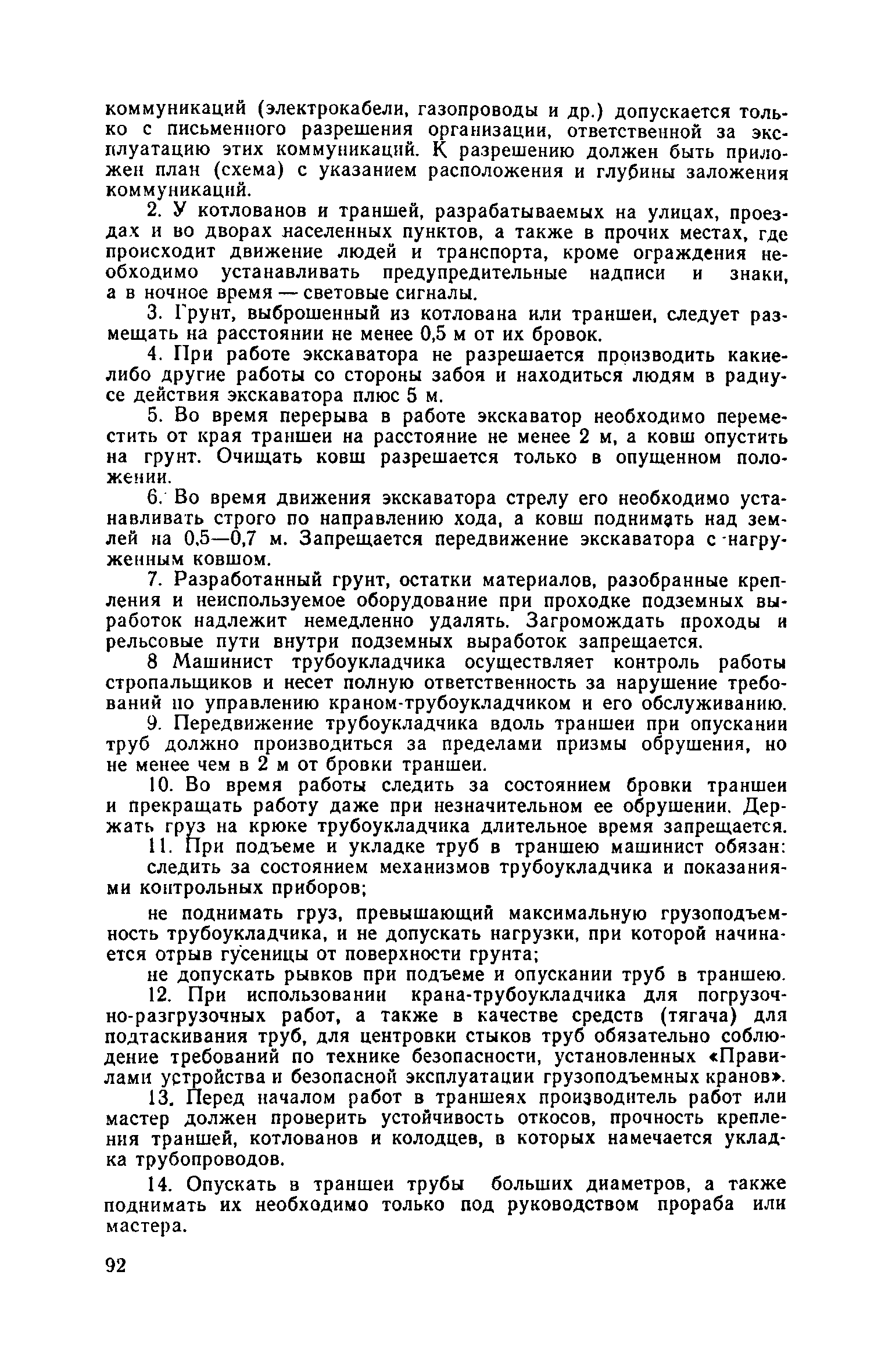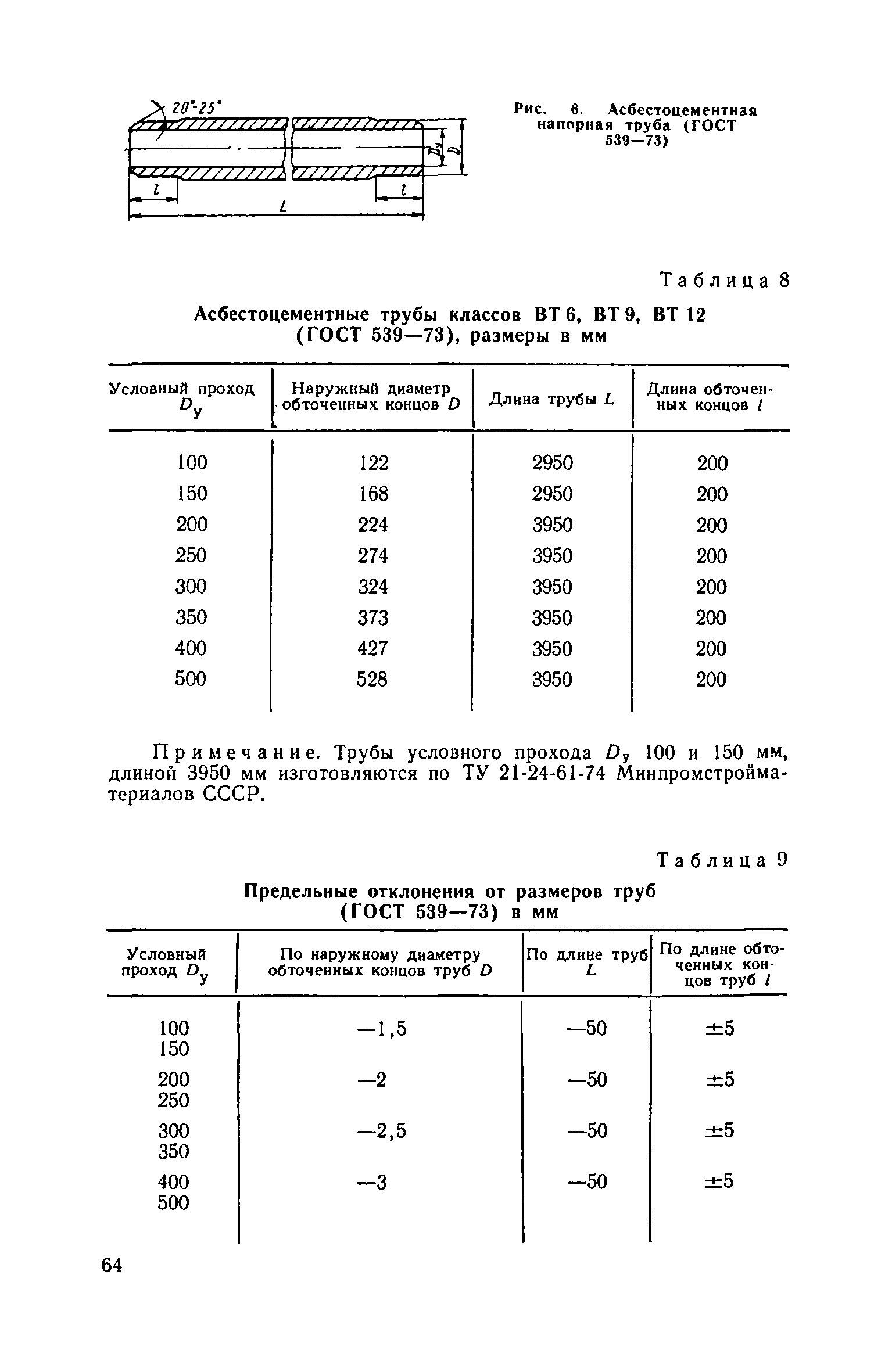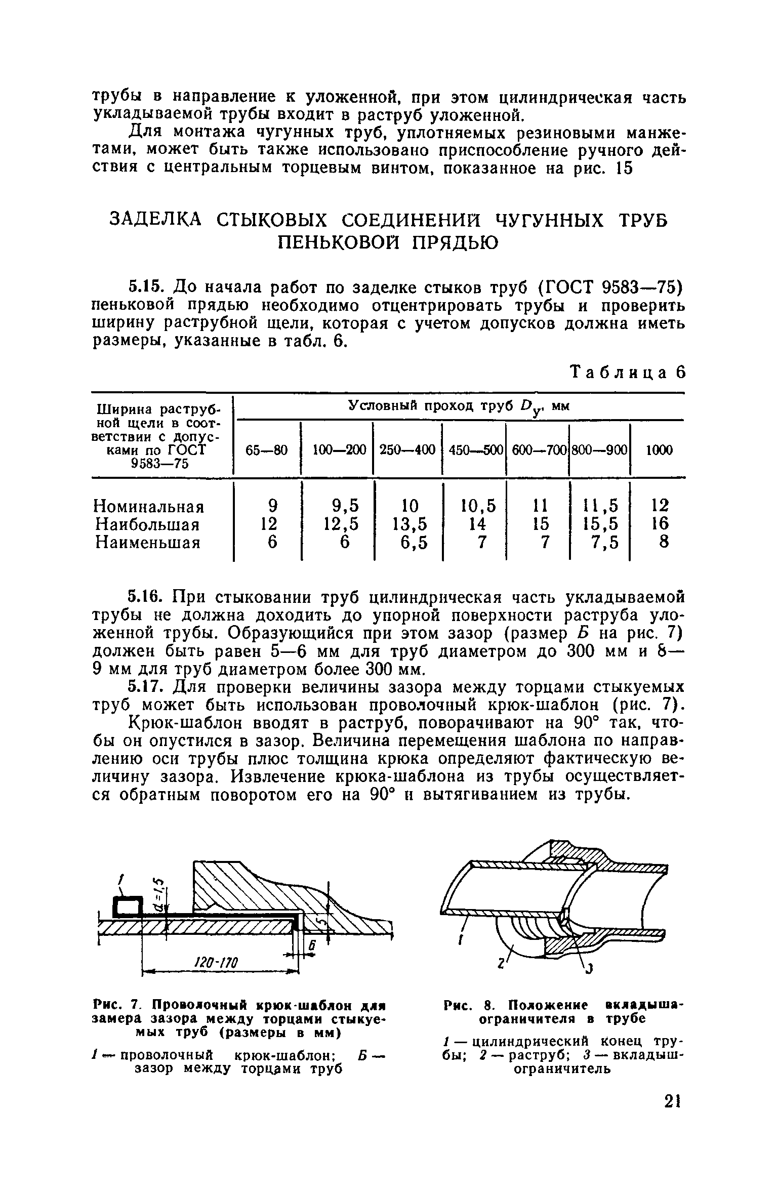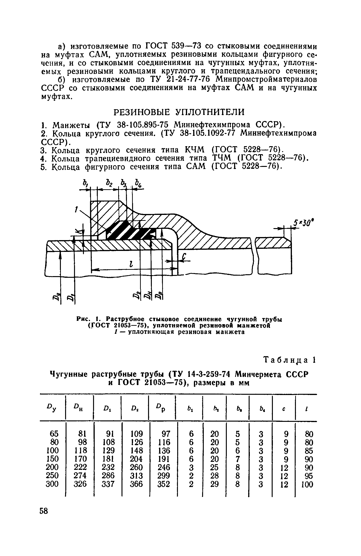 | Оглавление: | Предисловие 1. Общие указания 2. Требования, предъявляемые к трубам, муфтам и уплотняющим материалам А. Трубы и муфты Чугунные напорные трубы Железобетонные напорные трубы Асбестоцементные трубы и муфты Б. Уплотняющие материалы Резиновые уплотнители Пеньковая прядь Полисульфидные мастики-герметики 3. Транспортные. Погрузочно-разгрузочные работы и хранение материалов Трубы, муфты, резиновые уплотнители Герметики 4. Требования к производству земляных работ и подготовке основания под трубы 5. Монтаж трубопроводов Общие требования Монтаж чугунных труб с применением резиновых уплотняющих манжет Заделка стыковых соединений чугунных труб пеньковой прядью Приготовление асбестоцементной смеси асбестоцементного замка Заделка стыковых соединений чугунных труб герметиками Монтаж железобетонных раструбных труб с применением резиновых колец Монтаж асбестоцементных труб, изготовляемых по ГОСТ 539-73 и ТУ 21-24-77-76 Минпромстройматериалов СССР, на муфтах САМ с использованием резиновых колец фигурного сечения Монтаж асбестоцементных труб на чугунных муфтах с использованием резиновых колец круглого и трапециевидного сечения 6. Монтаж фасонных частей Монтаж фасонных частей на чугунных трубопроводах Монтаж фасонных частей на трубопроводах из железобетонных труб Монтаж фасонных частей на трубопроводах из асбестоцементных труб 7. Испытание напорных трубопроводов Общие требования Гидравлический способ испытания Пневматический способ испытания 8. Устранение дефектов трубопроводов Приложение 1. Схема испытательного стенда для предварительного испытания труб перед их укладкой в траншею Приложение 2. Основные данные о форме и размерах труб, муфт и резиновых уплотнителей Приложение 3. Инструмент, применяемый при заделке стыковых соединений труб пеньковой прядью и асбестоцементом Приложение 4. Методика проведения окончательного гидравлического испытания трубопроводов на утечку и примеры испытания Приложение 5. Требования по пневматическому испытанию чугунных, железобетонных и асбестоцементных трубопроводов и порядок проведения испытания Приложение 6. Форма актов о проведении гидравлического и пневматического испытания трубопроводов Приложение 7. Краткие указания по промывке и дезинфекции трубопроводов питьевого назначения Приложение 8. Краткие указания по технике безопасности при выполнении работ по монтажу напорных трубопроводов |