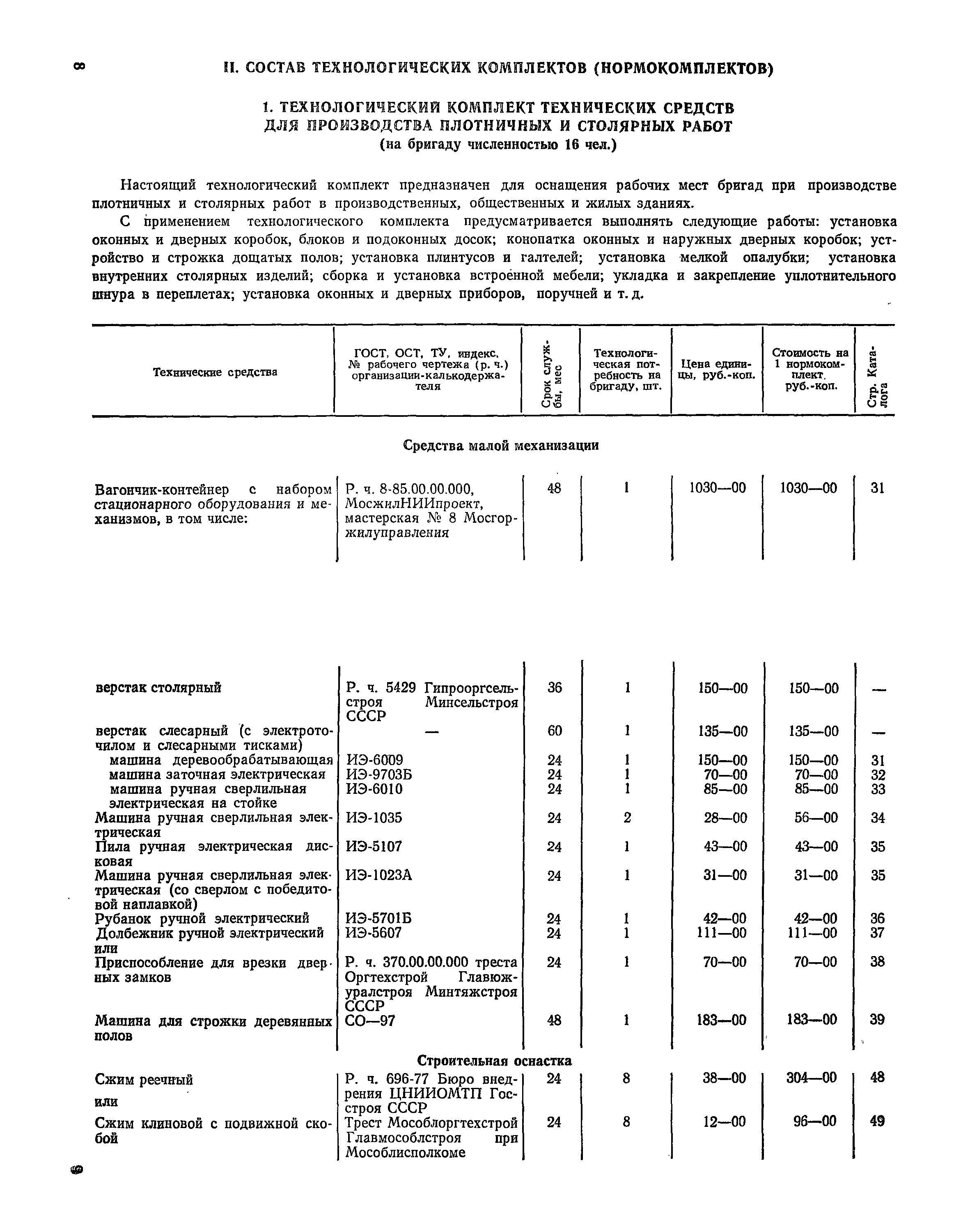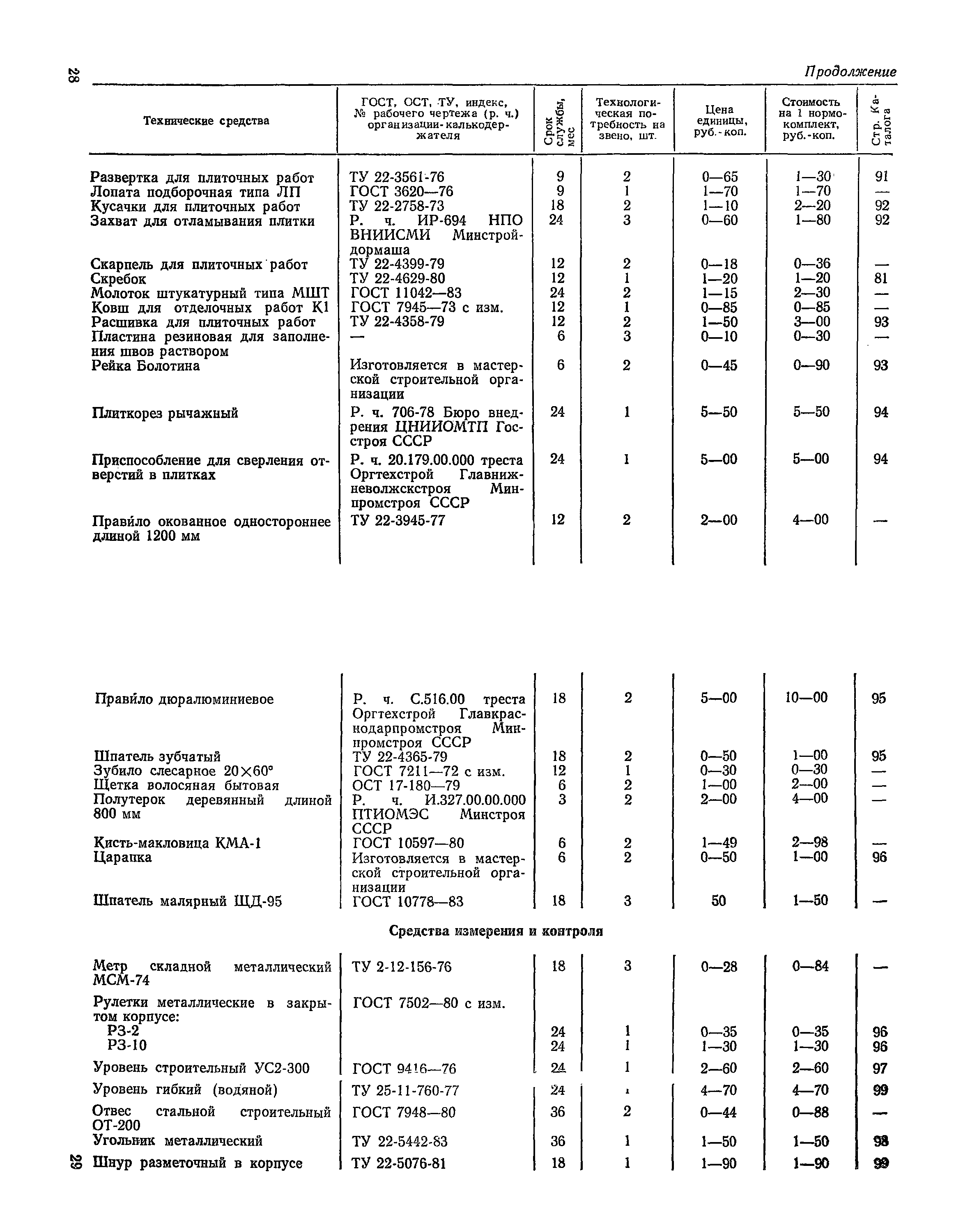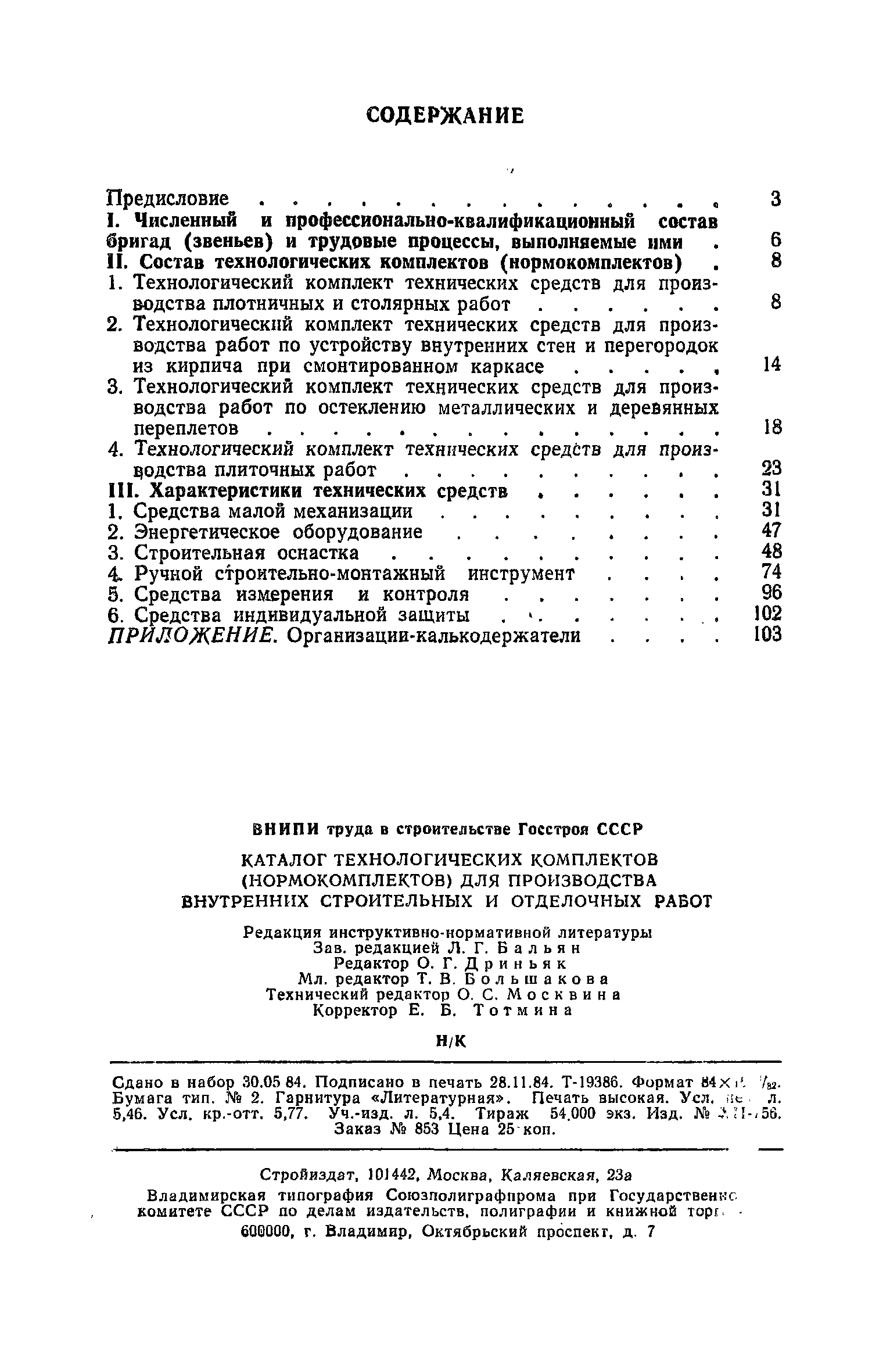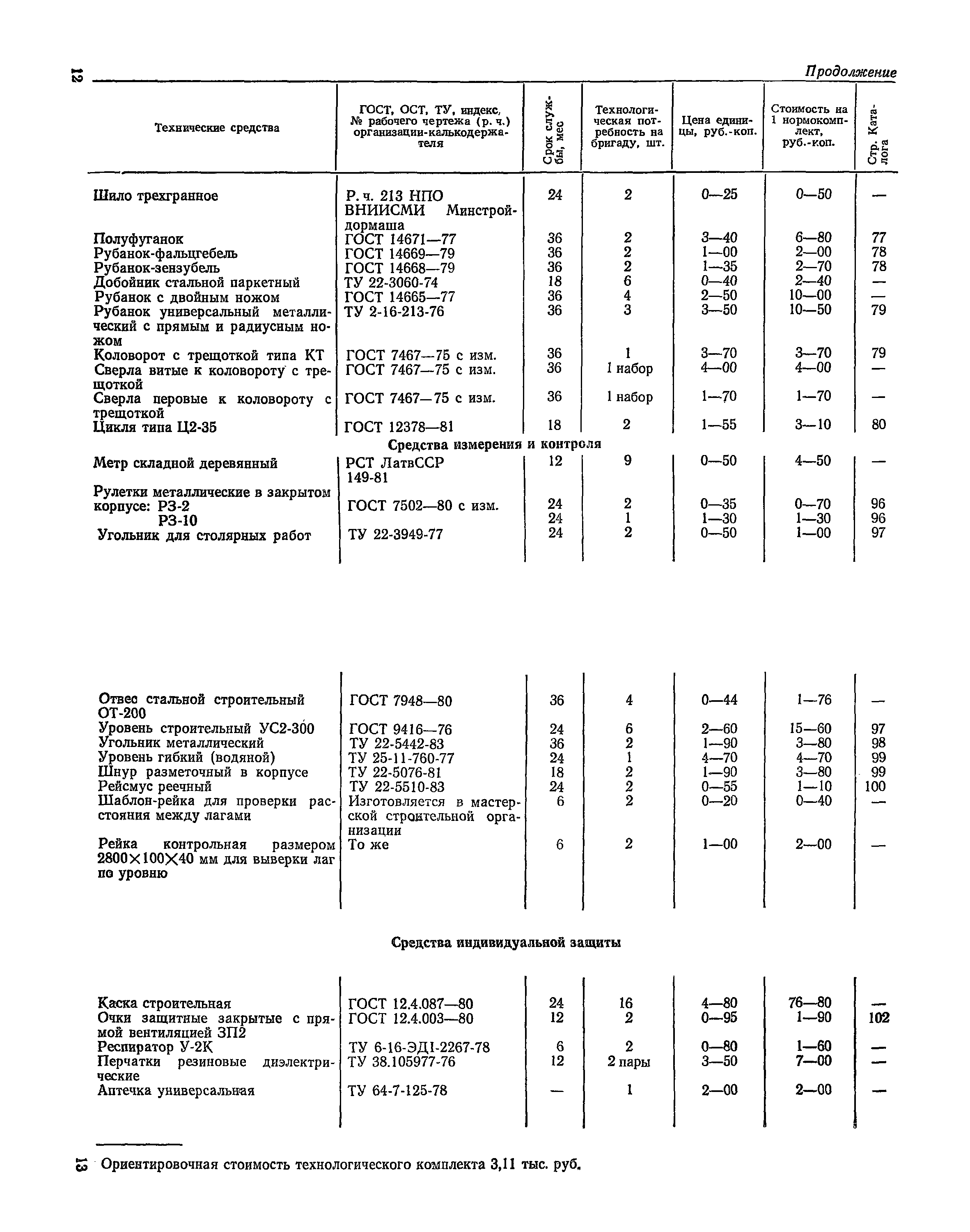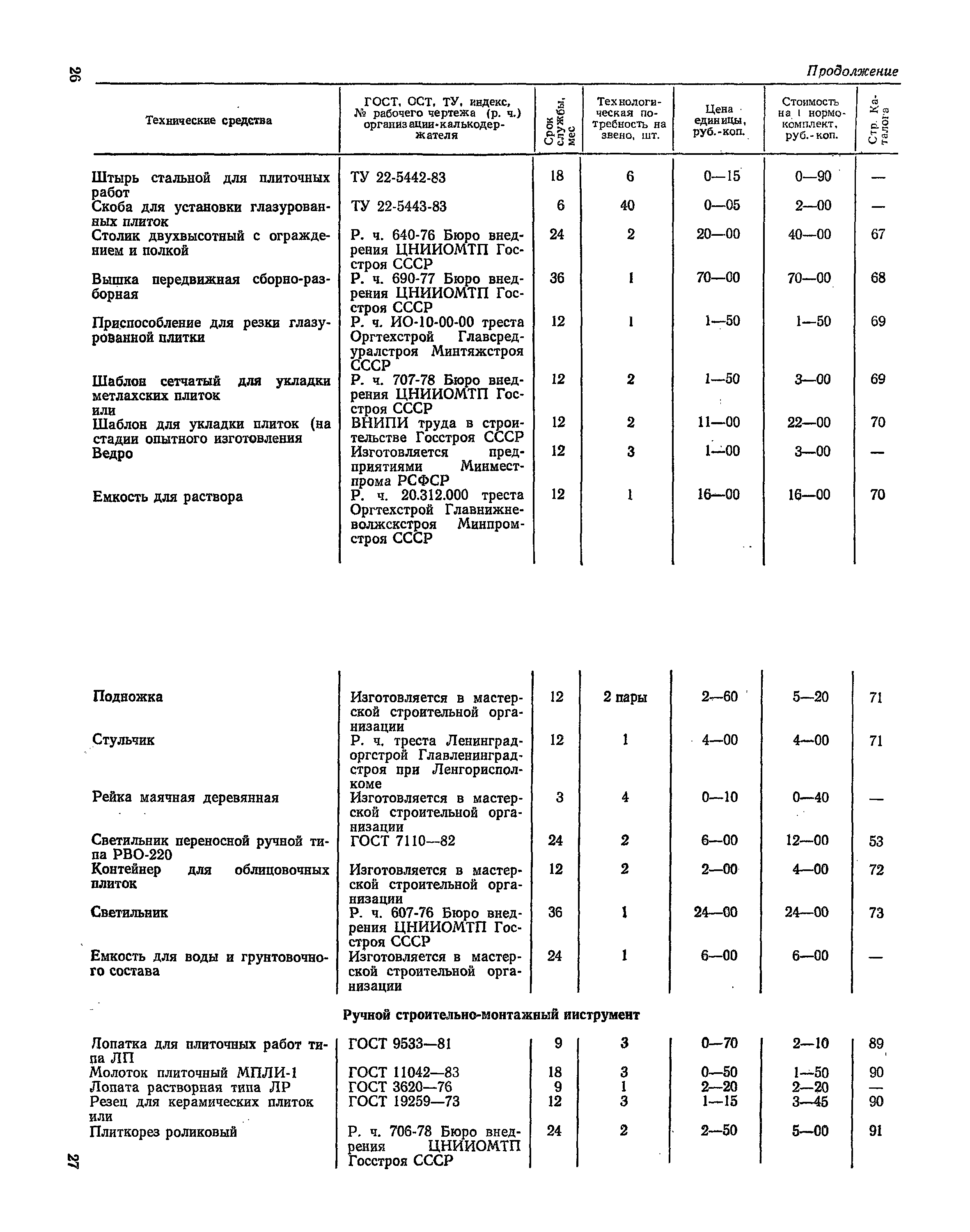 | Оглавление: | Предисловие I. Численный и профессионально-квалификационный состав бригад (звеньев) и трудовые процессы, выполняемые ими II. Состав технологических комплектов (нормокомплектов) 1. Технологический комплект технических средств для производства плотничных и столярных работ 2. Технологический комплект технических средств для производства работ по устройству внутренних стен и перегородок из кирпича при смонтированном каркасе 3. Технологический комплект технических средств для производства работ по остеклению металлических и деревянных переплетов 4. Технологический комплект технических средств для производства плиточных работ III. Характеристики технических средств 1. Средства малой механизации 2. Энергетическое оборудование 3. Строительная оснастка 4. Ручной строительно-монтажный инструмент 5. Средства измерения и контроля 6. Средства индивидуальной защиты Приложение. Организации-калькодержатели |