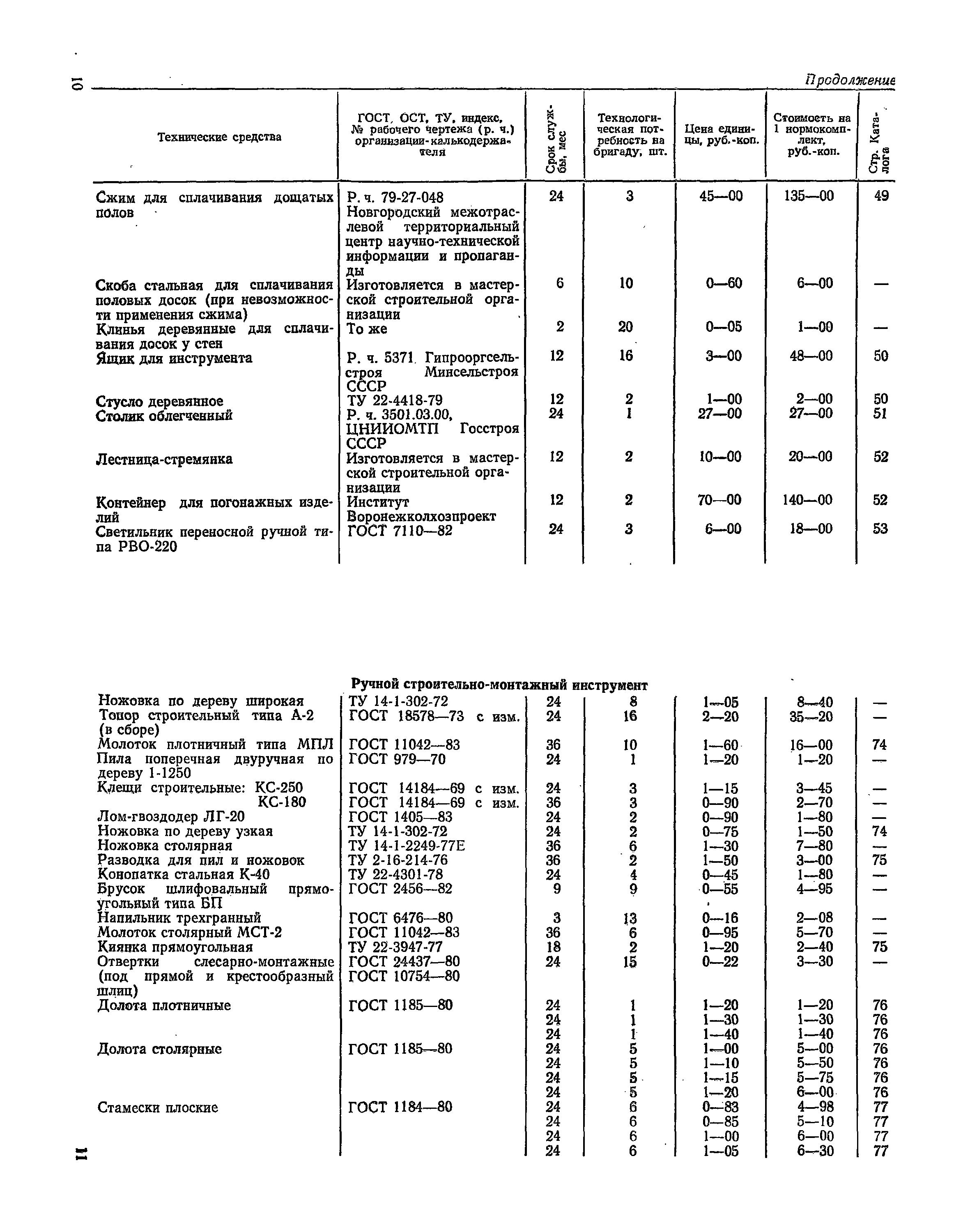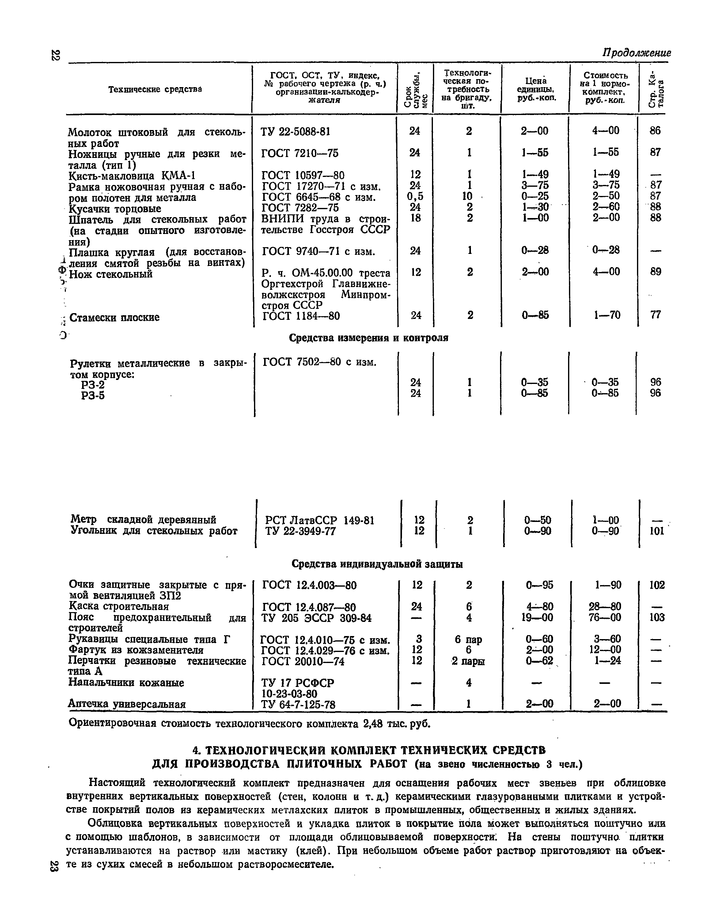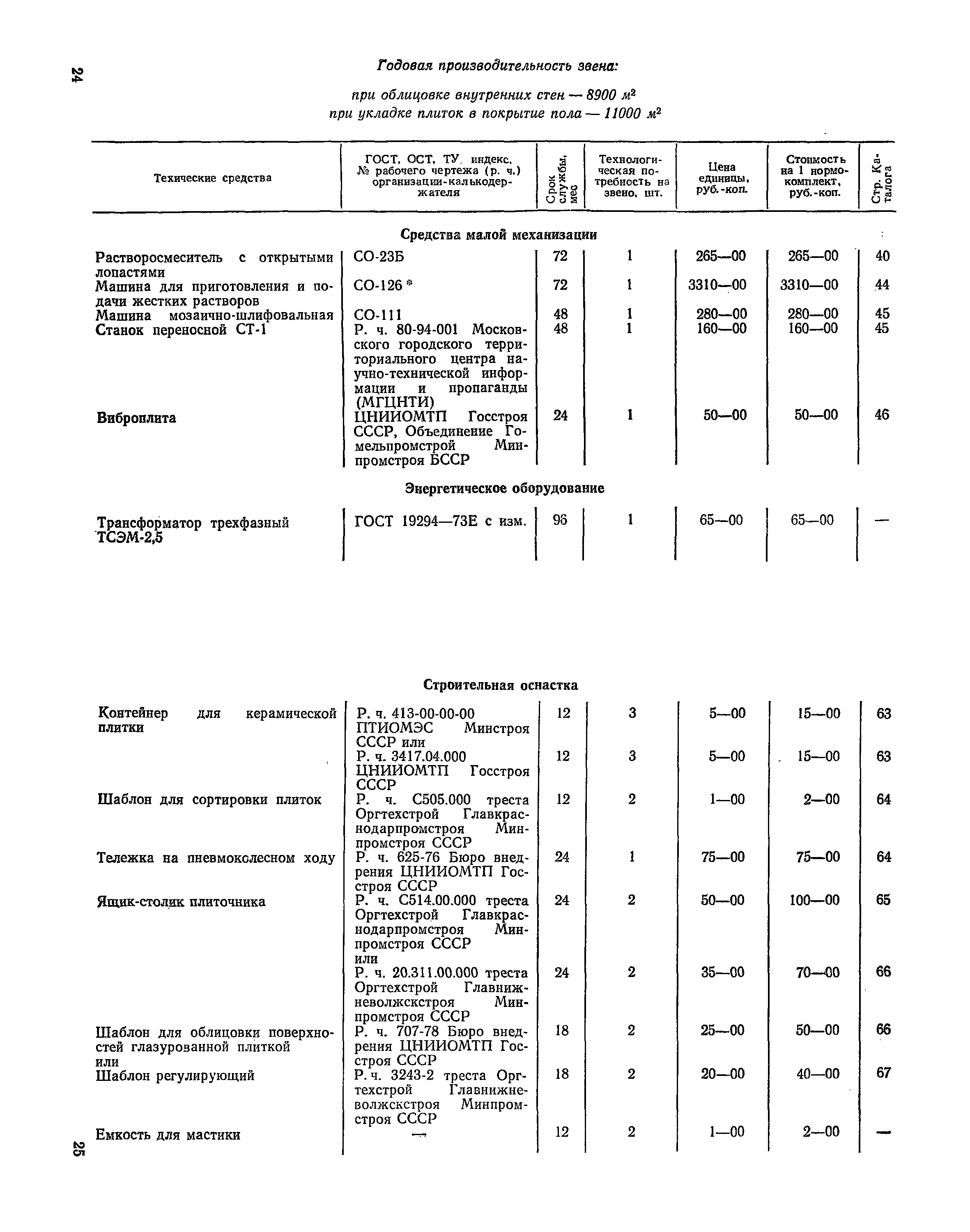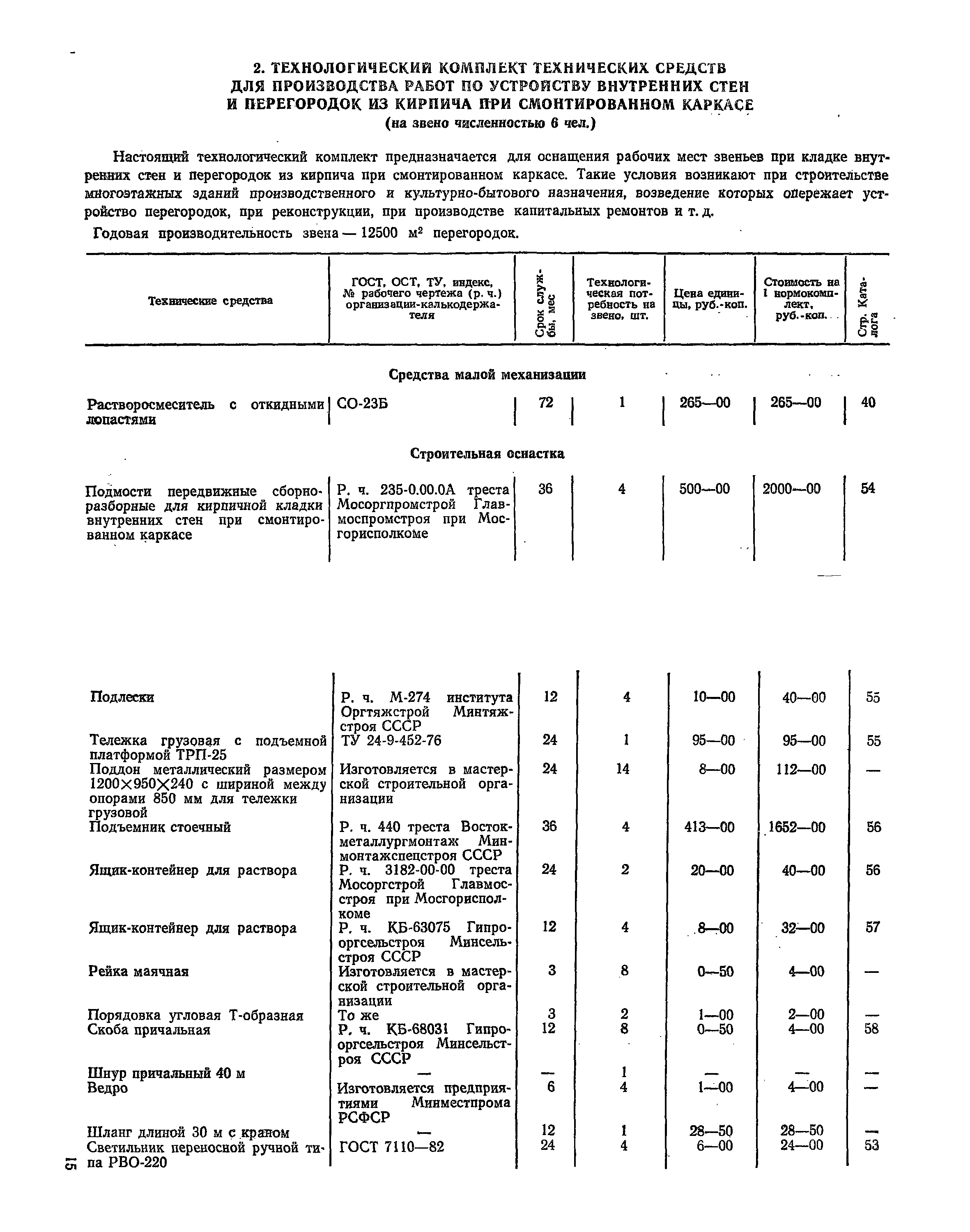 | Оглавление: | Предисловие I. Численный и профессионально-квалификационный состав бригад (звеньев) и трудовые процессы, выполняемые ими II. Состав технологических комплектов (нормокомплектов) 1. Технологический комплект технических средств для производства плотничных и столярных работ 2. Технологический комплект технических средств для производства работ по устройству внутренних стен и перегородок из кирпича при смонтированном каркасе 3. Технологический комплект технических средств для производства работ по остеклению металлических и деревянных переплетов 4. Технологический комплект технических средств для производства плиточных работ III. Характеристики технических средств 1. Средства малой механизации 2. Энергетическое оборудование 3. Строительная оснастка 4. Ручной строительно-монтажный инструмент 5. Средства измерения и контроля 6. Средства индивидуальной защиты Приложение. Организации-калькодержатели |
