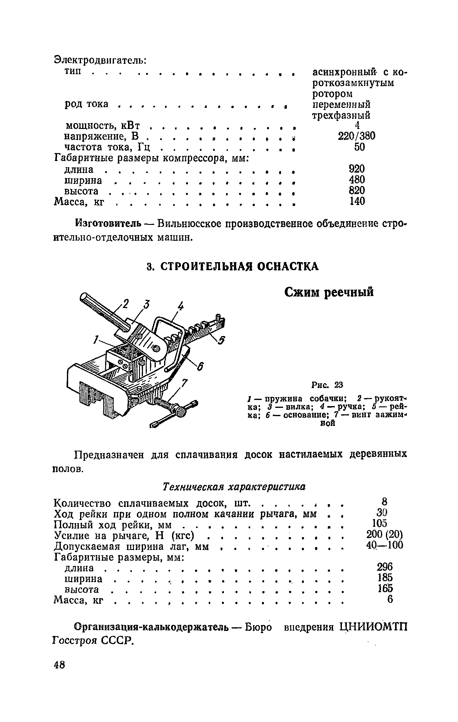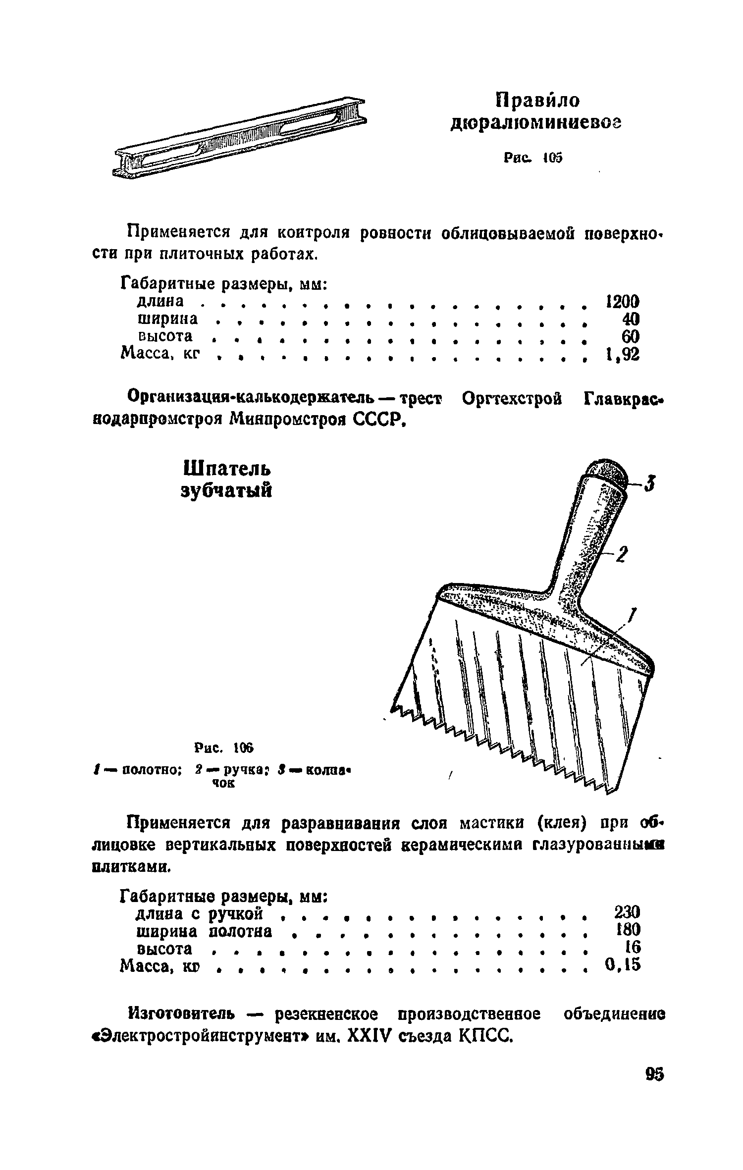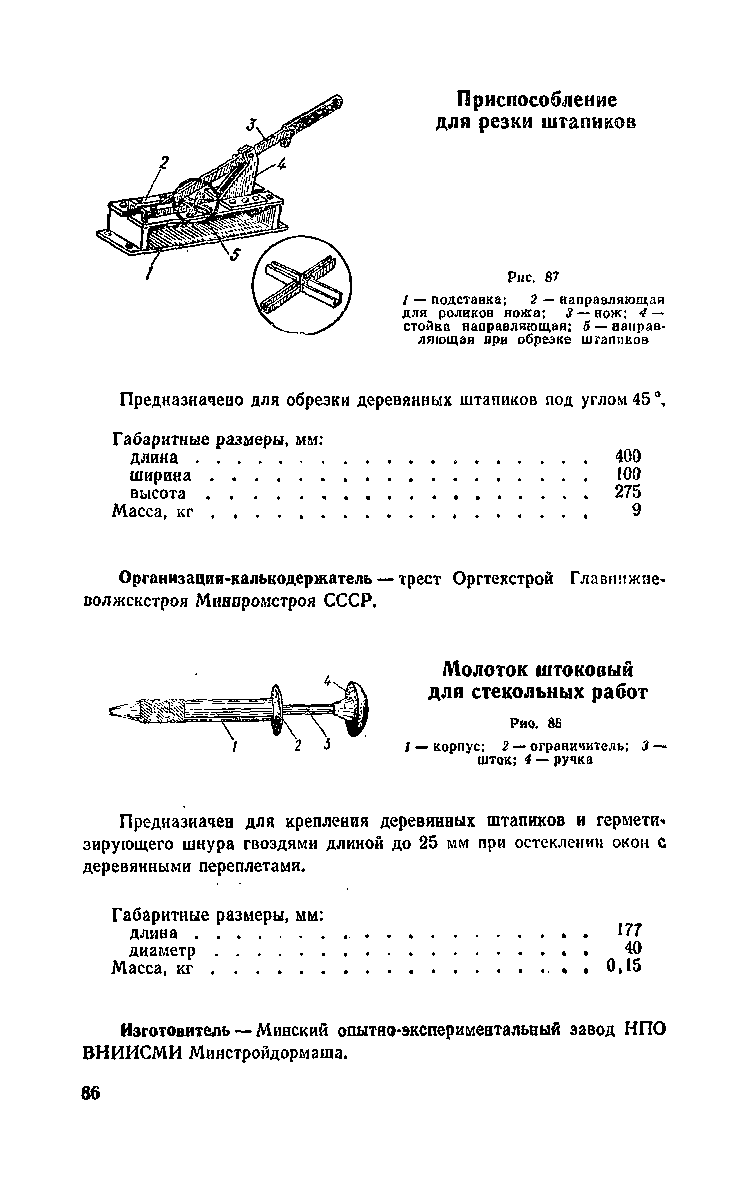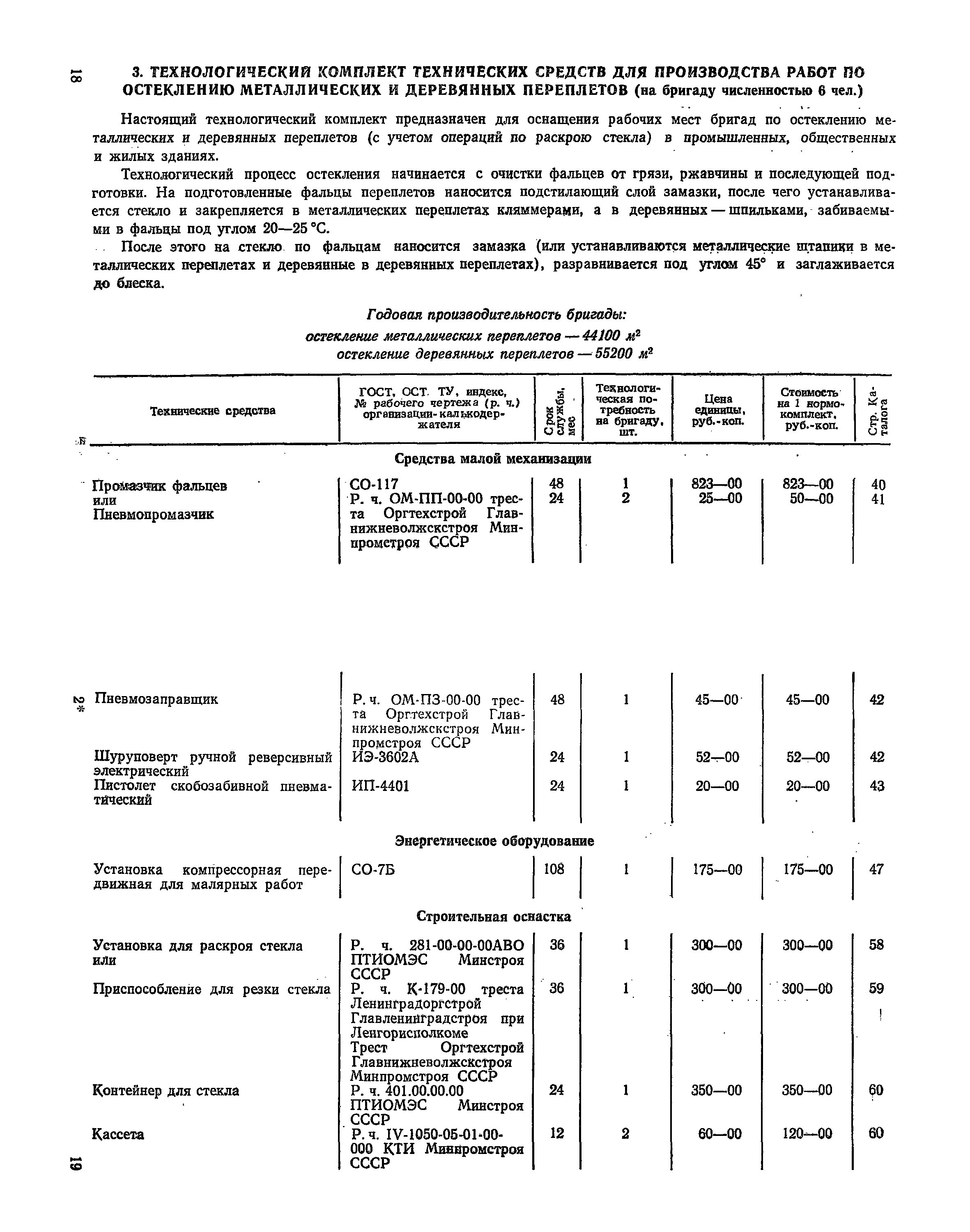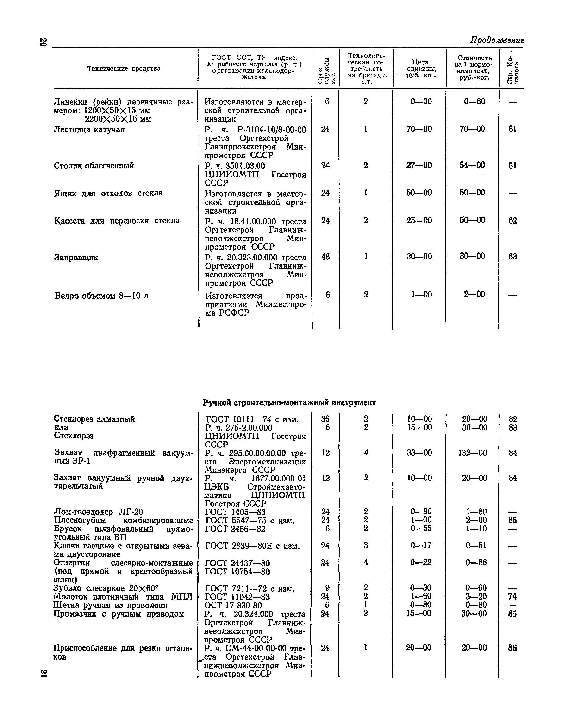 | Оглавление: | Предисловие I. Численный и профессионально-квалификационный состав бригад (звеньев) и трудовые процессы, выполняемые ими II. Состав технологических комплектов (нормокомплектов) 1. Технологический комплект технических средств для производства плотничных и столярных работ 2. Технологический комплект технических средств для производства работ по устройству внутренних стен и перегородок из кирпича при смонтированном каркасе 3. Технологический комплект технических средств для производства работ по остеклению металлических и деревянных переплетов 4. Технологический комплект технических средств для производства плиточных работ III. Характеристики технических средств 1. Средства малой механизации 2. Энергетическое оборудование 3. Строительная оснастка 4. Ручной строительно-монтажный инструмент 5. Средства измерения и контроля 6. Средства индивидуальной защиты Приложение. Организации-калькодержатели |