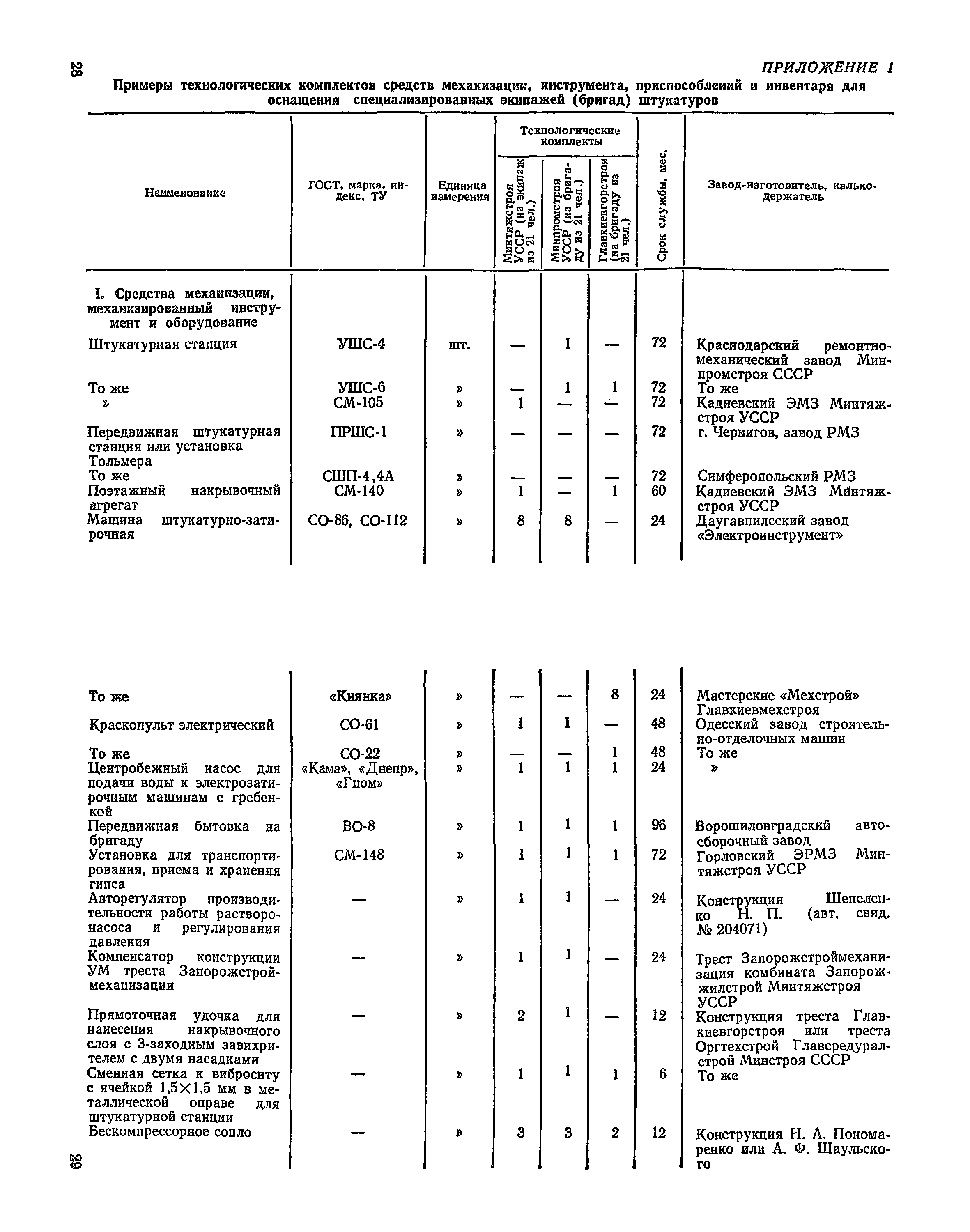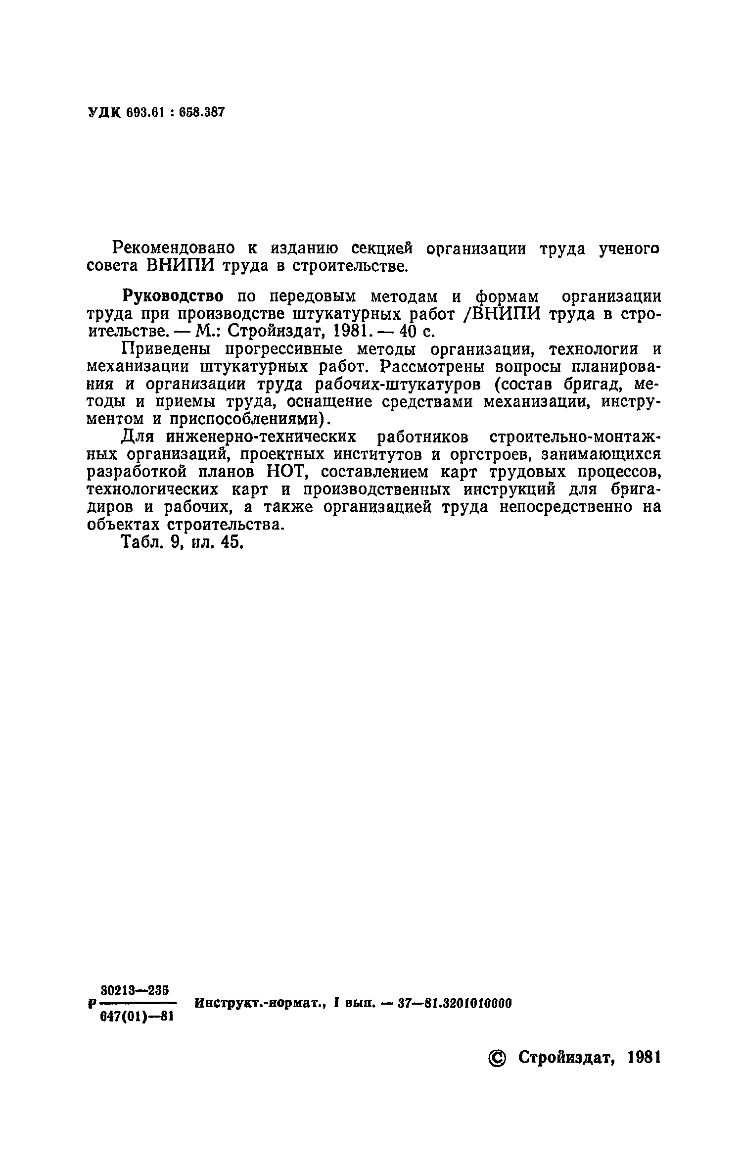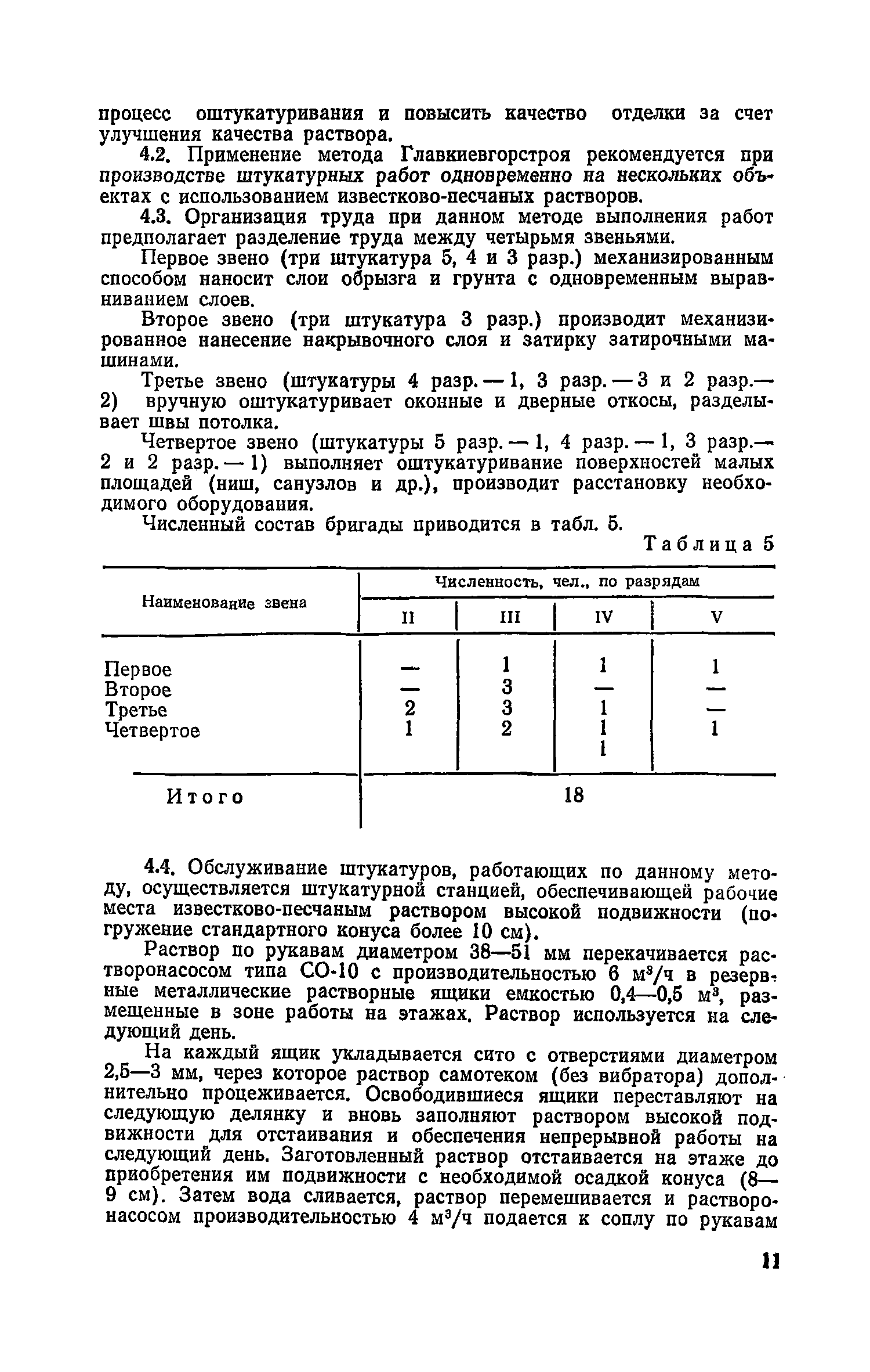 | Оглавление: | Предисловие 1. Общие положения 2. Организация труда при выполнении работ по методу комбината Харьковжилстрой 3. Организация труда при выполнении работ по методу комбината Днепрометаллургстрой 4. Организация труда при работе по методу Главкиевгорстроя 5. Средства механизации Приложение №1. Примеры технологических комплектов средств механизации, инструмента, приспособлений и инвентаря для оснащения специализированных экипажей (бригад) штукатуров Приложение №2. Годовой (квартальный) график работ штукатурного экипажа Приложение №3. Показатели плана-задания штукатурного экипажа, объемы работ и потребность в материалах на объект Приложение №4. Табель учета фактически отработанного времени |