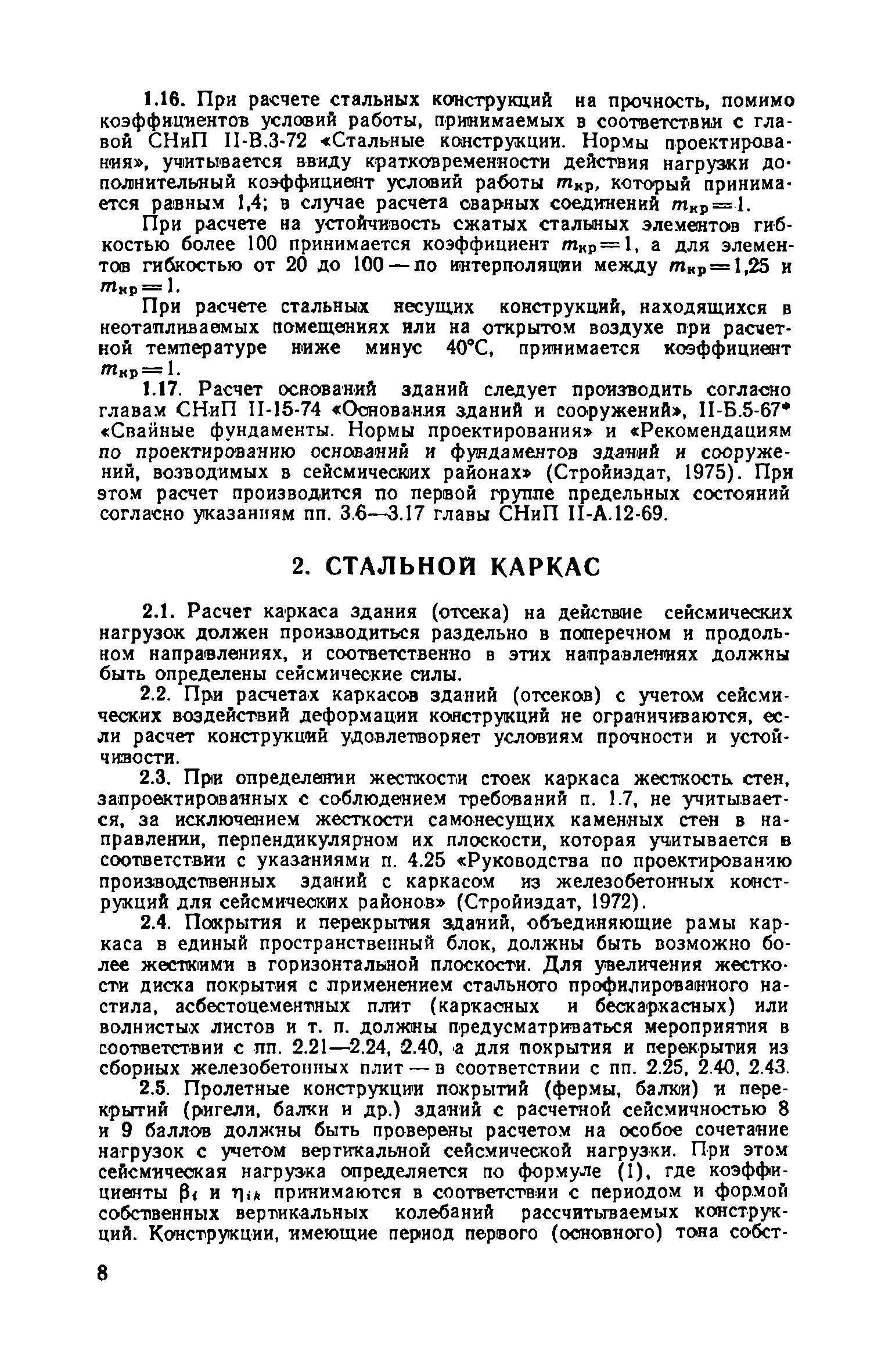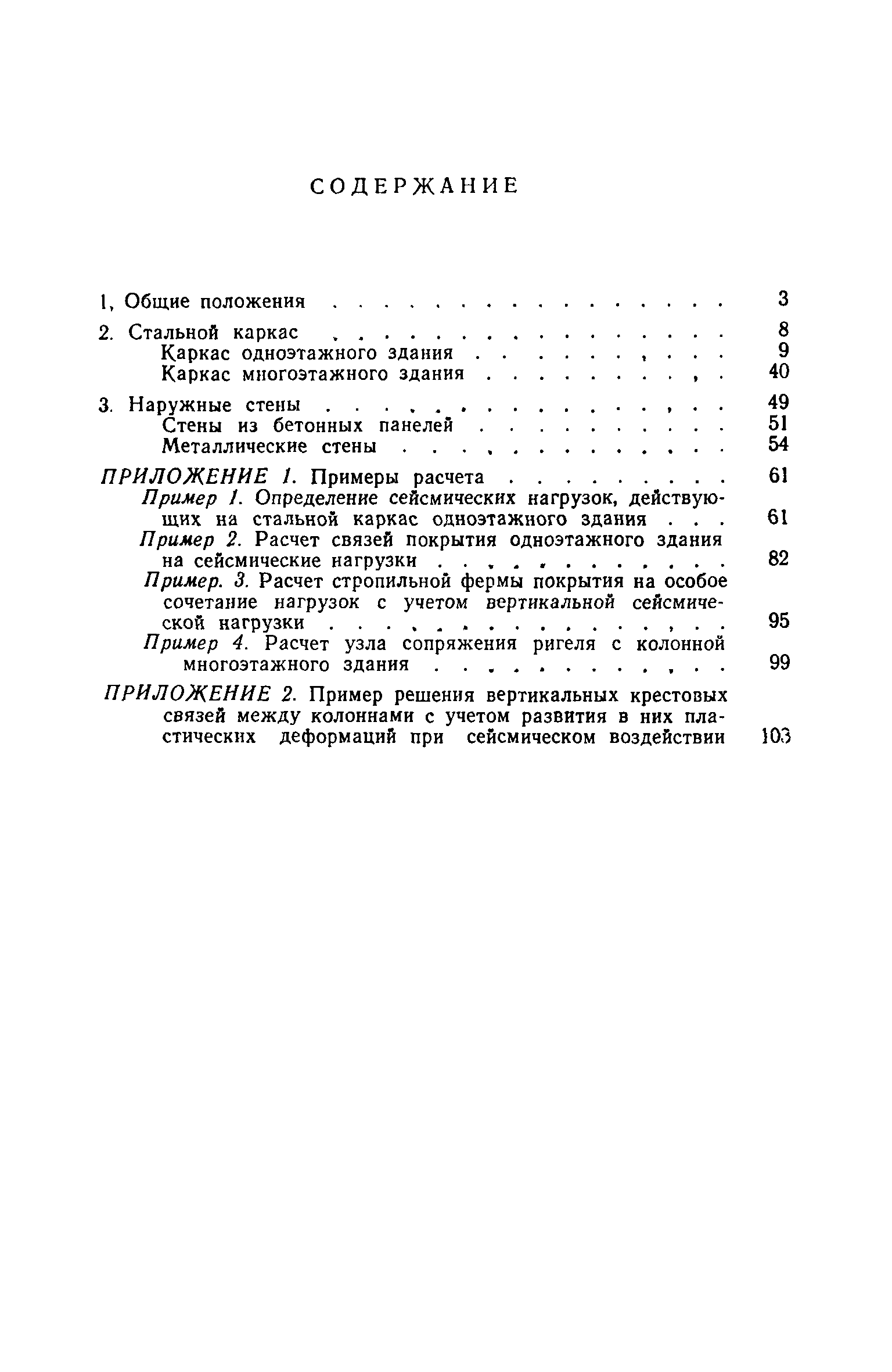 | Оглавление: | 1. Общие положения 2. Стальной каркас Каркас одноэтажного здания Каркас многоэтажного здания 3. Наружные стены Стены из бетонных панелей Металлические стены Приложение 1. Примеры расчета Пример 1. Определение сейсмических нагрузок, действующих на стальной каркас одноэтажного здания Пример 2. Расчет связей покрытия одноэтажного здания на сейсмические нагрузки Пример 3. Расчет стропильной фермы покрытия на особое сочетание нагрузок с учетом вертикальной сейсмической нагрузки Пример 4. Расчет узла сопряжения ригеля с колонной многоэтажного здания Приложение 2. Пример расчета вертикальных крестовых связей между колоннами с учетом развития в них пластических деформаций при сейсмическом воздействии |