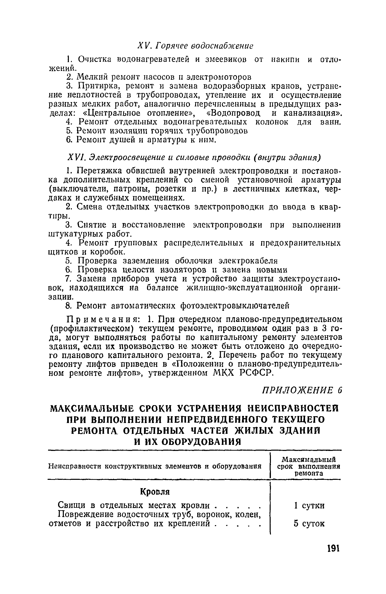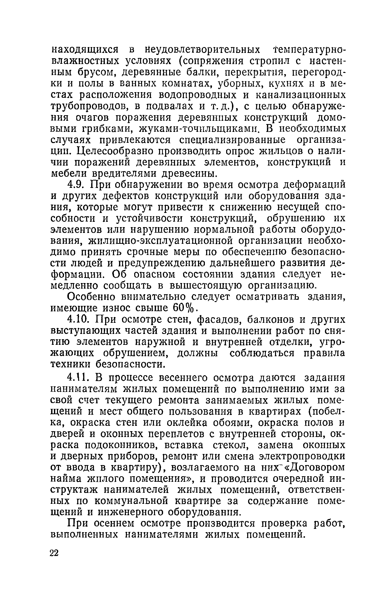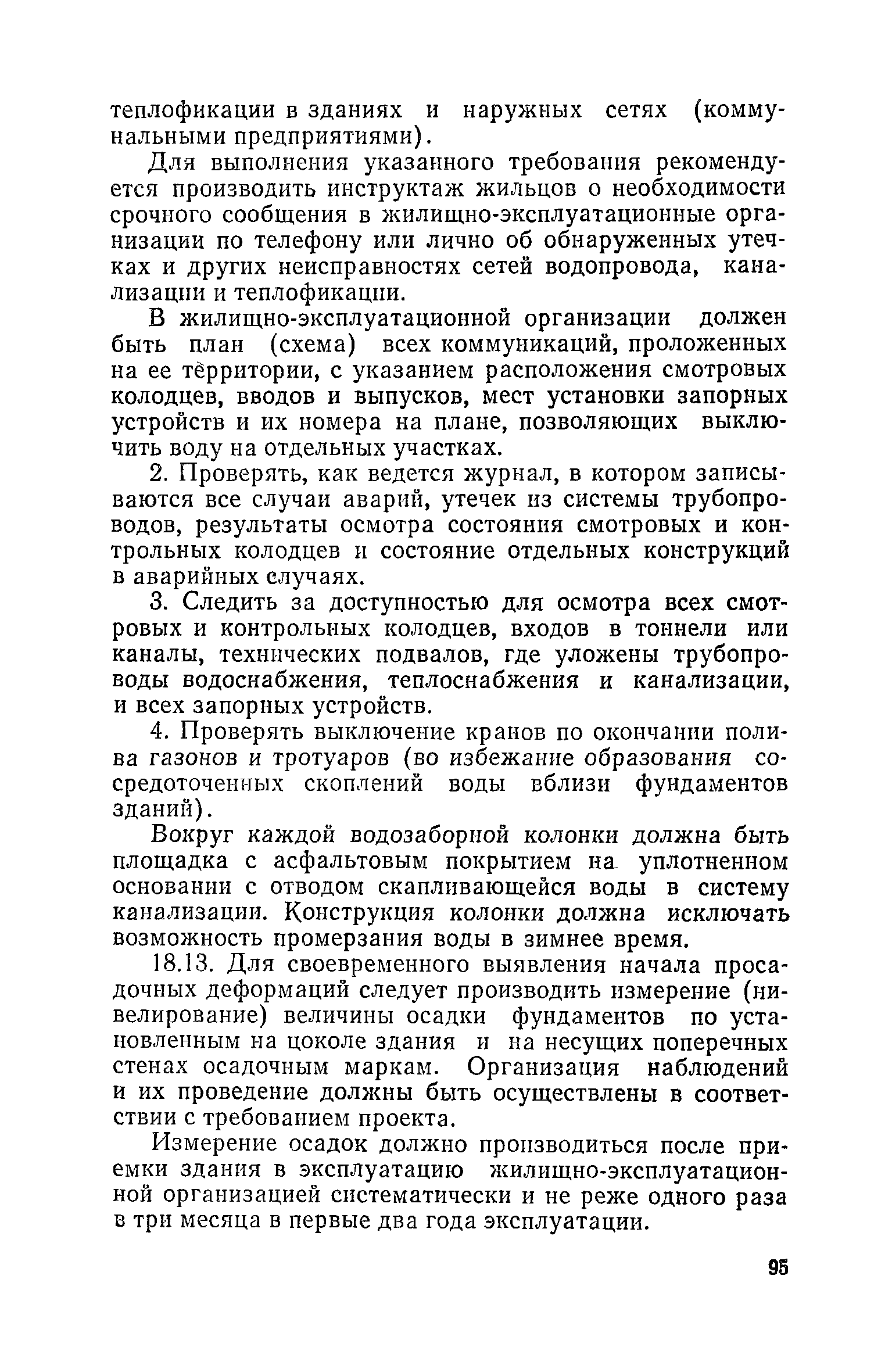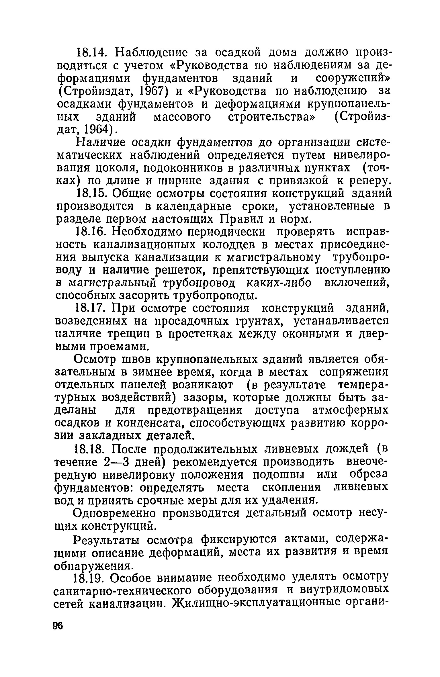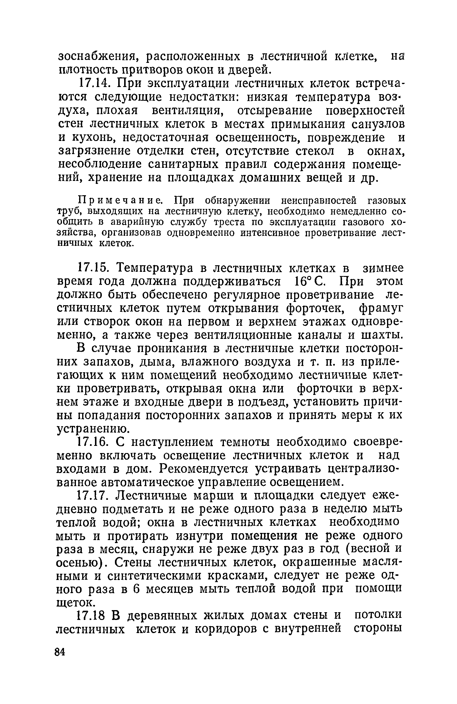 Правила и нормы технической эксплуатации жилищного фонда| Статус: | заменен | | Название рус.: | Правила и нормы технической эксплуатации жилищного фонда | | Дата добавления в базу: | 01.09.2013 | | Дата актуализации: | 01.01.2021 | | Область применения: | В документе приведены основные положения по технической эксплуатации жилищного фонда, содержанию помещений, инженерного оборудования, территорий домовладений, а также указания по переустройству и благоустройству домой старой застройки. | | Оглавление: | Введение Раздел первый. Основные положения Глава 1. Общие положения Глава 2. Управление жилищным хозяйством Глава 3. Порядок приемки жилищного хозяйства Приемка в эксплуатацию вновь выстроенных домов Приемка в эксплуатацию капитально отремонтированных жилых домов Приемка жилищного хозяйства при смене руководства Передача ведомственного жилищного фонда исполкомам местных Советов и инженерных сетей коммунальным предприятиям Глава 4. Система осмотра жилых домов Глава 5. Организация ремонта жилищного фонда и работ по его благоустройству Классификация работ по ремонту жилищного фонда Перечень работ по повышению благоустройства жилых домов, которые могут выполняться за счет средств, выделяемых на капитальный ремонт жилищного фонда Планирование и организация текущего ремонта Планирование и организация капитального ремонта и повышение уровня благоустройства жилых домов Раздел второй. Правила эксплуатации строительных конструкций и помещений Глава 6. Придомовая территория, фундаменты и стены подвальных помещений Придомовая территория Фундаменты и стены подвальных помещений Глава 7. Стены Каменные и крупнопанельные стены Деревянные стены Глава 8. Фасады Отделка фасадов Балконы, козырьки, лоджии и эркеры Глава 9. Перекрытия Железобетонные перекрытия (сборные и монолитные) Деревянные перекрытия (по деревянным и металлическим балкам) Сводчатые перекрытия Глава 10. Полы Деревянные полы Полы из линолеумов и синтетических материалов Ксилолитовые полы Полы керамические, мозаичные и цементные Глава 11. Перегородки Перегородки из неорганических материалов Деревянные перегородки Глава 12. Крыши Чердачные крыши Бесчердачные (совмещенные) крыши Водоотводящие устройства Очистка кровель от снега Глава 13. Окна, двери и световые фонари Окна и двери Световые фонари Глава 14. Лестницы Каменные и железобетонные лестницы Деревянные лестницы Глава 15. Печи Комнатные печи и кухонные очаги на твердом топливе Комнатные печи и кухонные очаги на газовом топливе Глава 16. Специальные мероприятия по технической эксплуатации жилого дома Защита деревянных конструкций от разрушений домовыми грибками и дереворазрушающими насекомыми Устранение сырости в эксплуатируемых зданиях Устранение шумов в жилых домах Противопожарная профилактика Подготовка жилых домов к зиме Глава 17. Эксплуатация жилых и вспомогательных помещений жилого дома Квартиры Лестничные клетки Чердачные помещения Подвалы и технические подполья Глава 18. Техническая эксплуатация жилых зданий в особых условиях Общие положения Районы просадочных грунтов Районы подрабатываемых территорий Сейсмические районы (сейсмичность более 6 баллов) Районы вечной мерзлоты Раздел третий. Правила эксплуатации инженерного оборудования в жилом доме Глава 19. Центральное отопление Глава 20. Горячее водосн